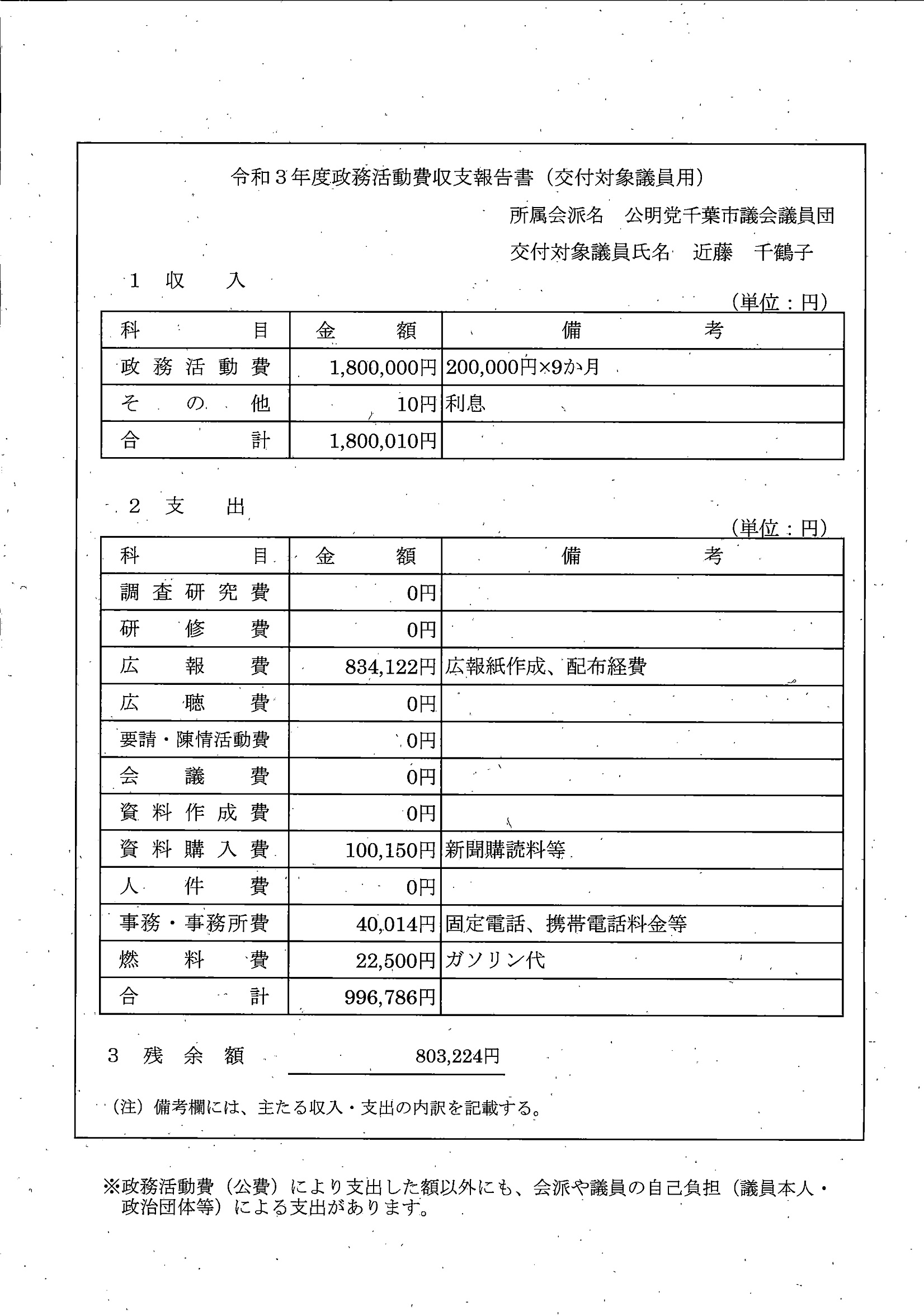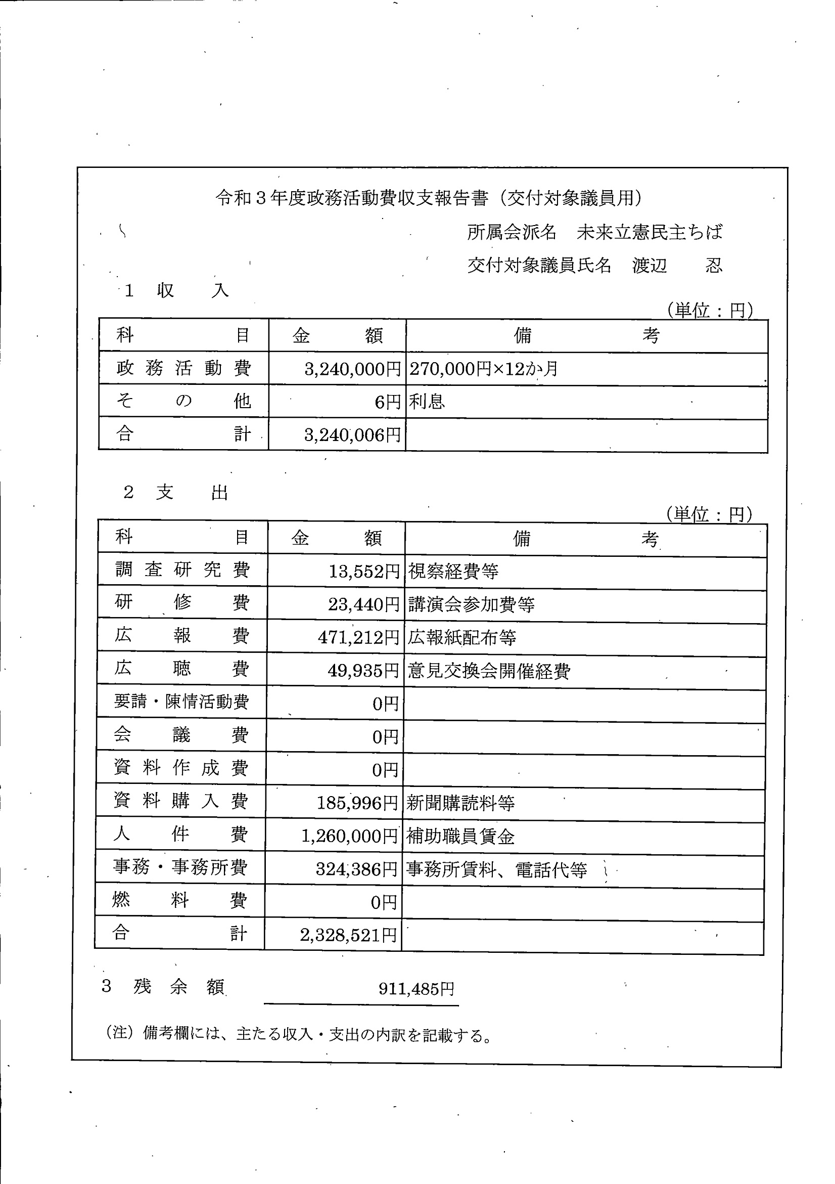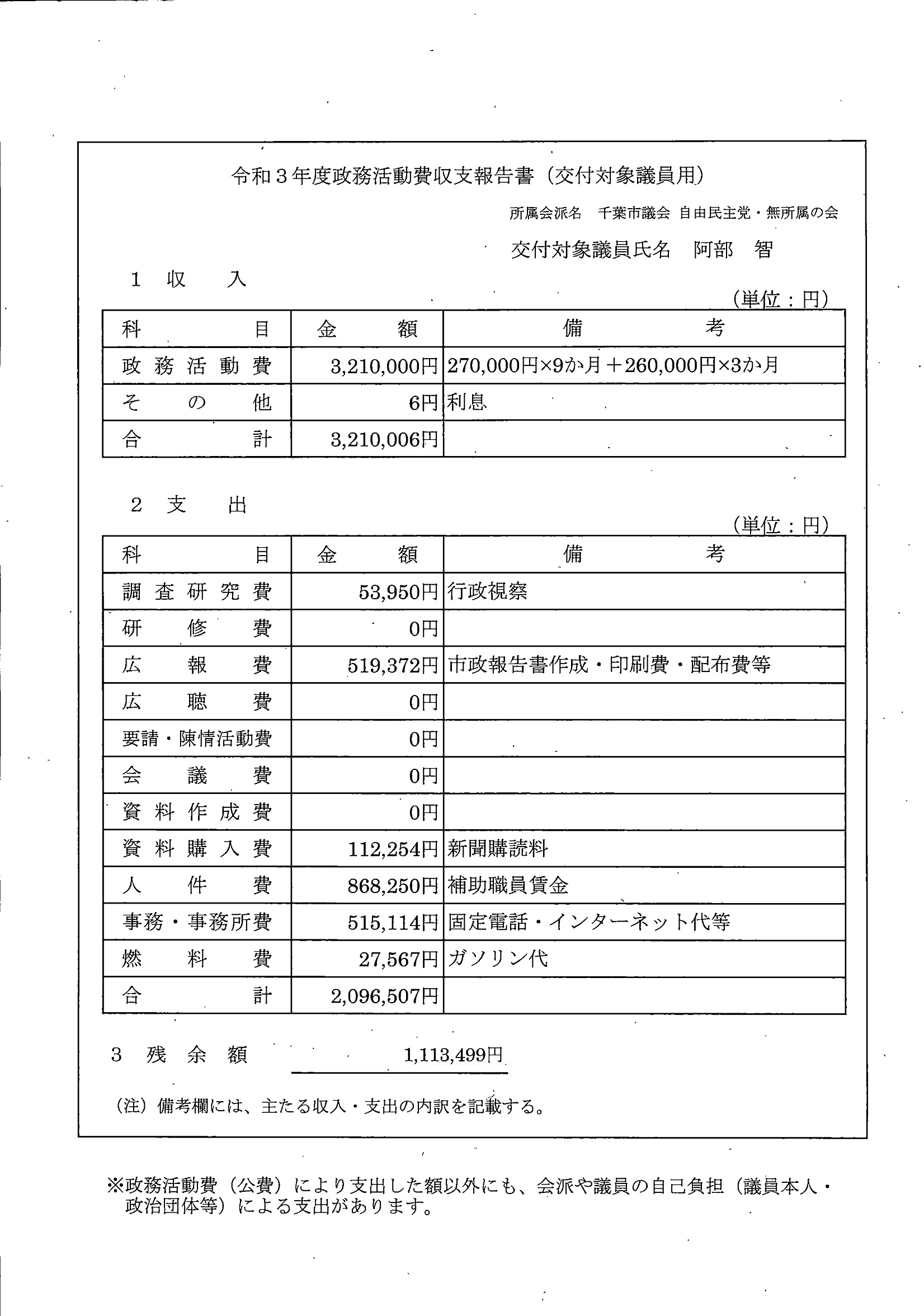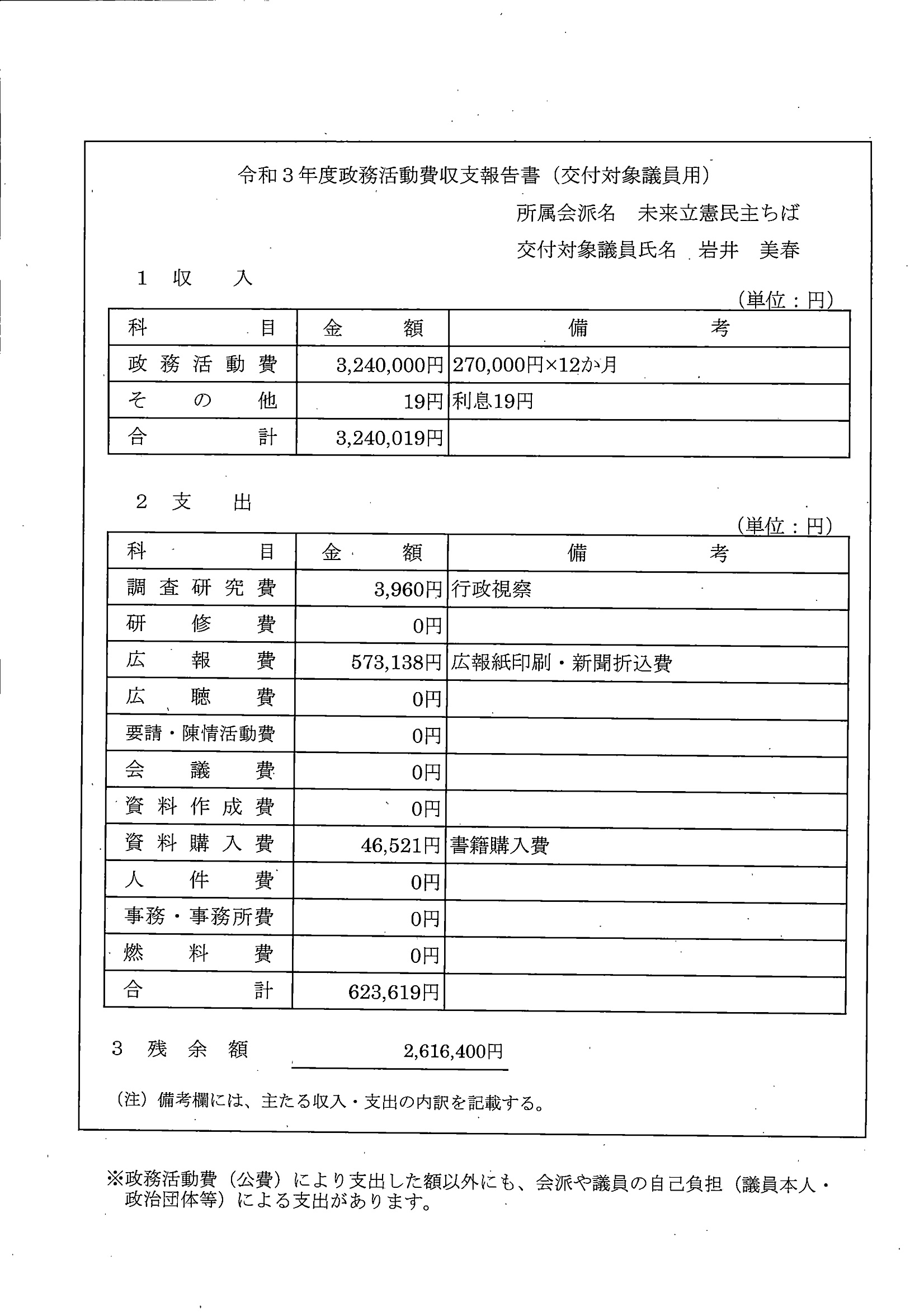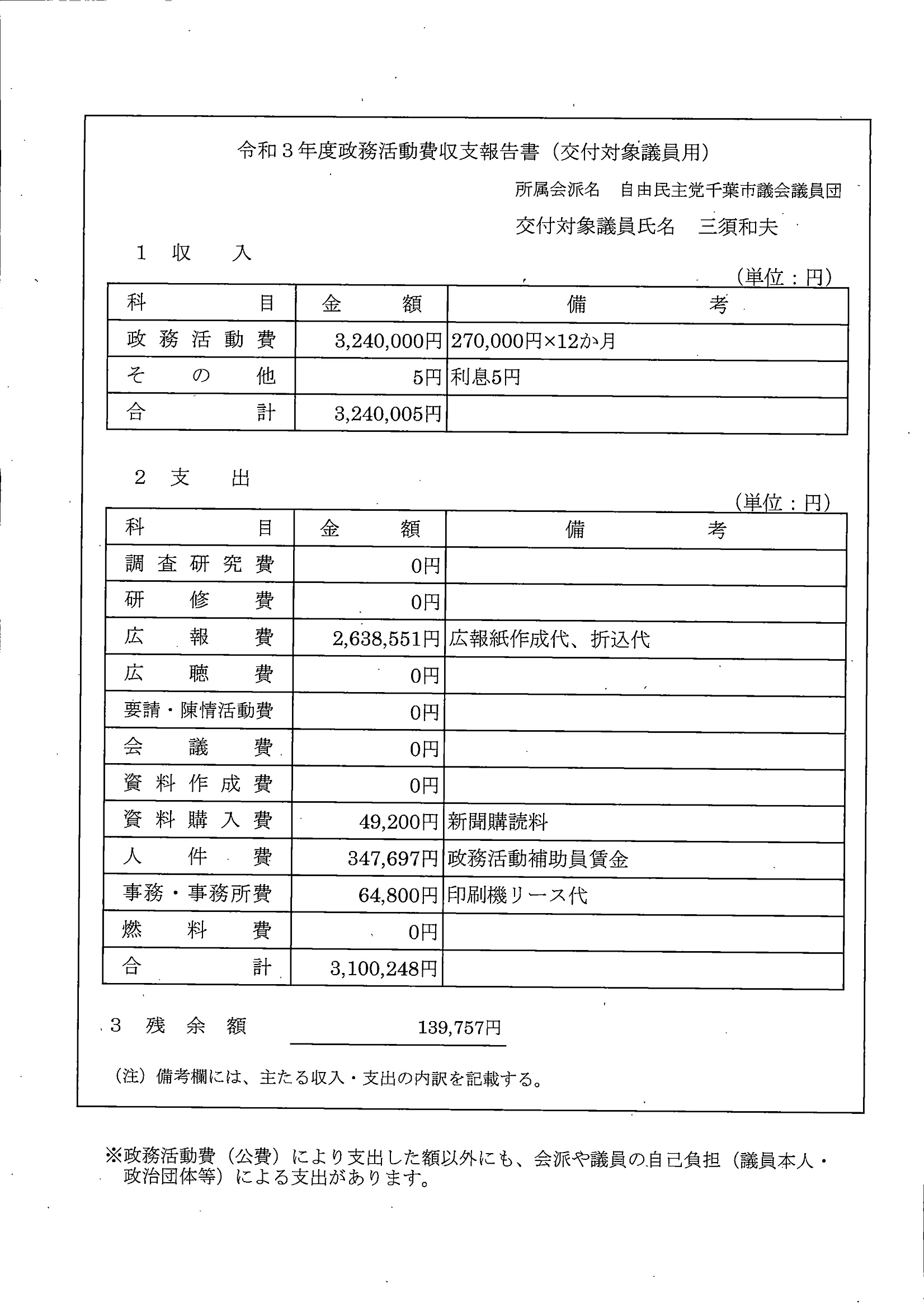 千葉市議会トップページ > 広報・情報公開 > 政務活動費 > 令和3年度交付分(政務活動費収支報告書)