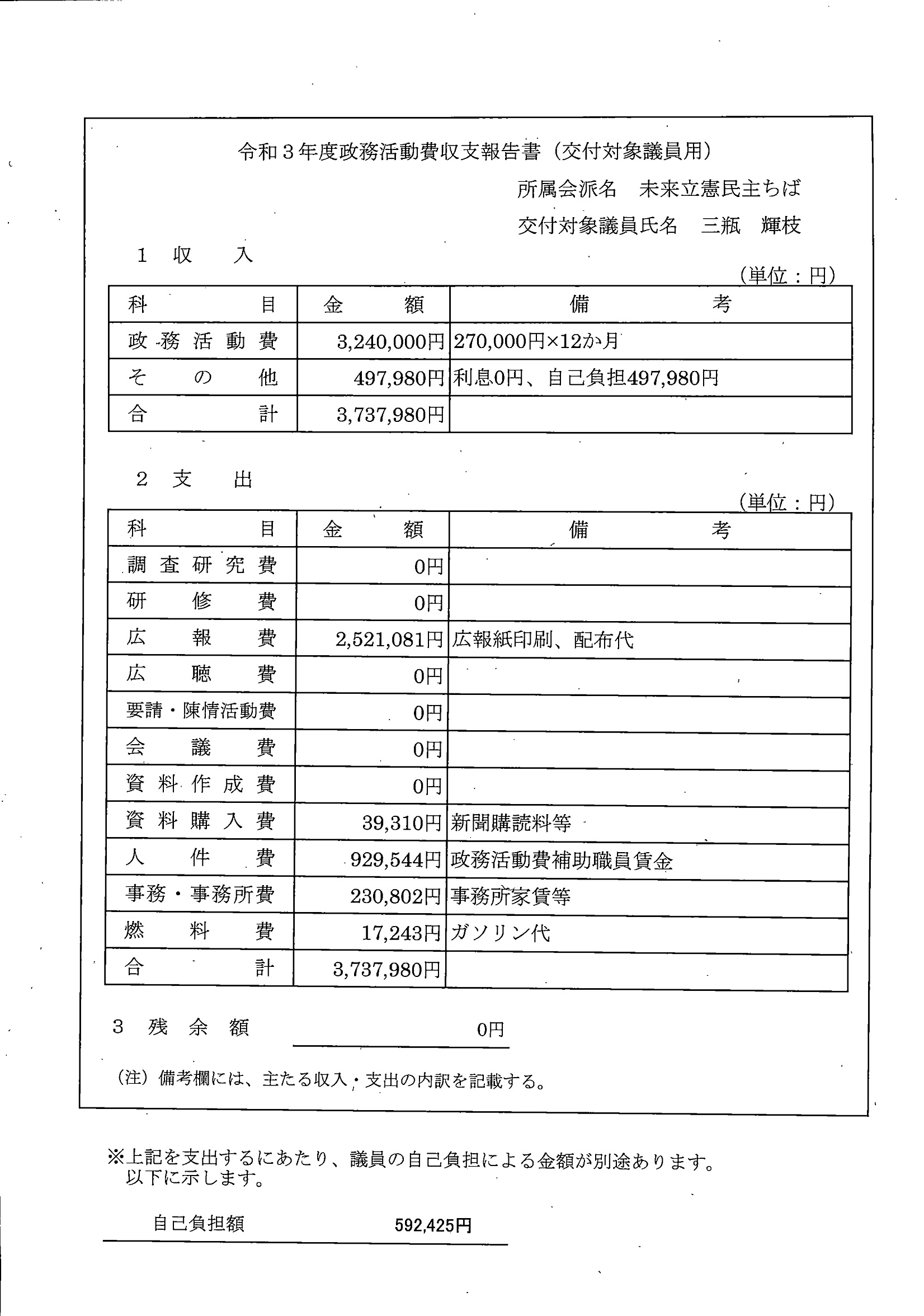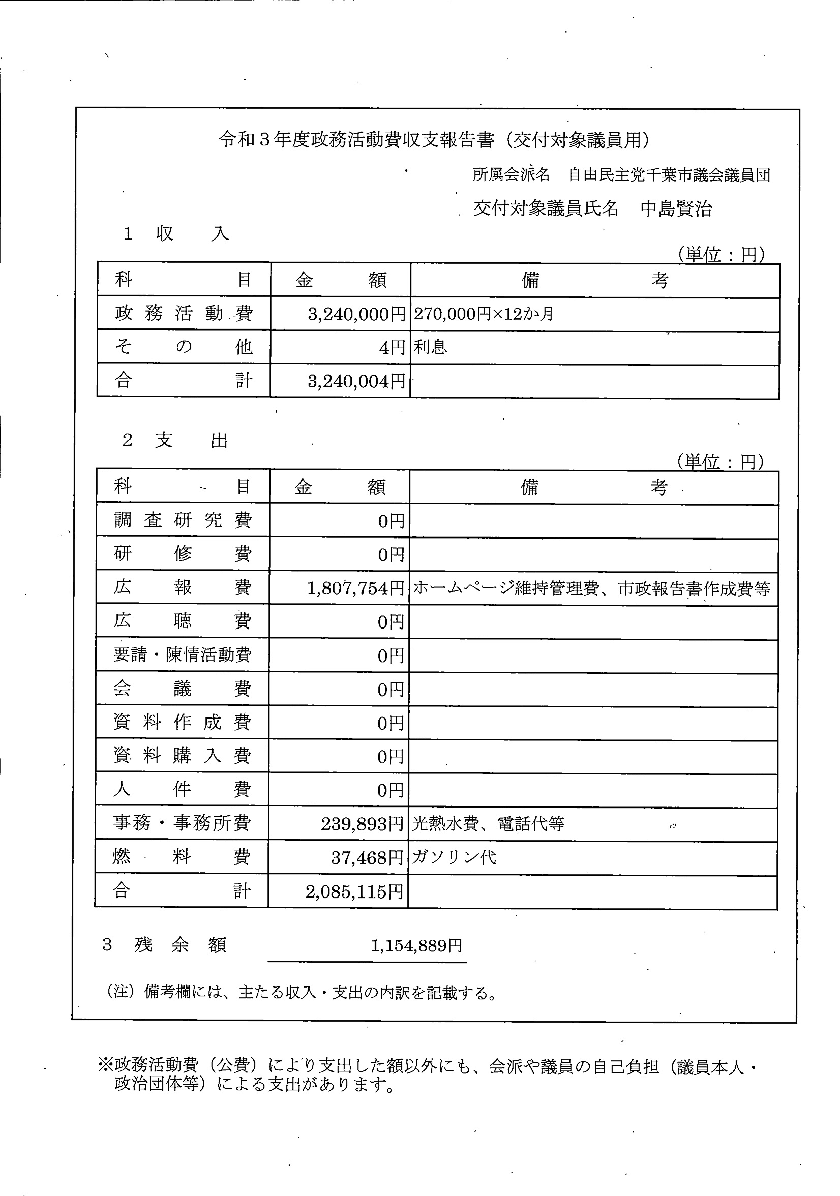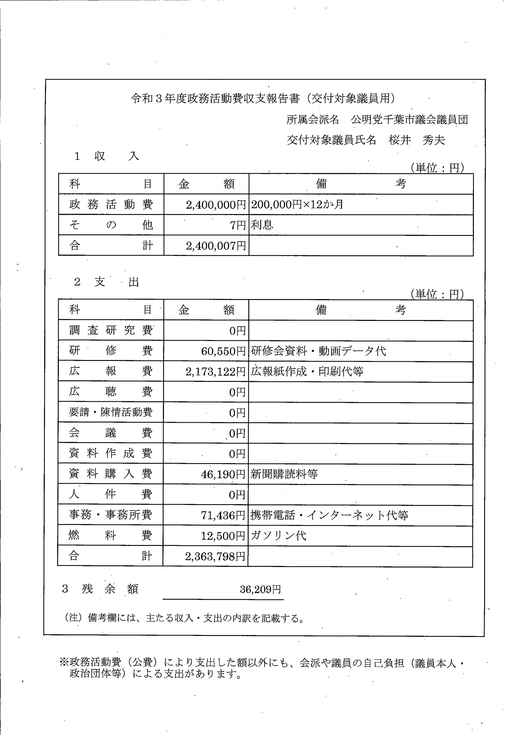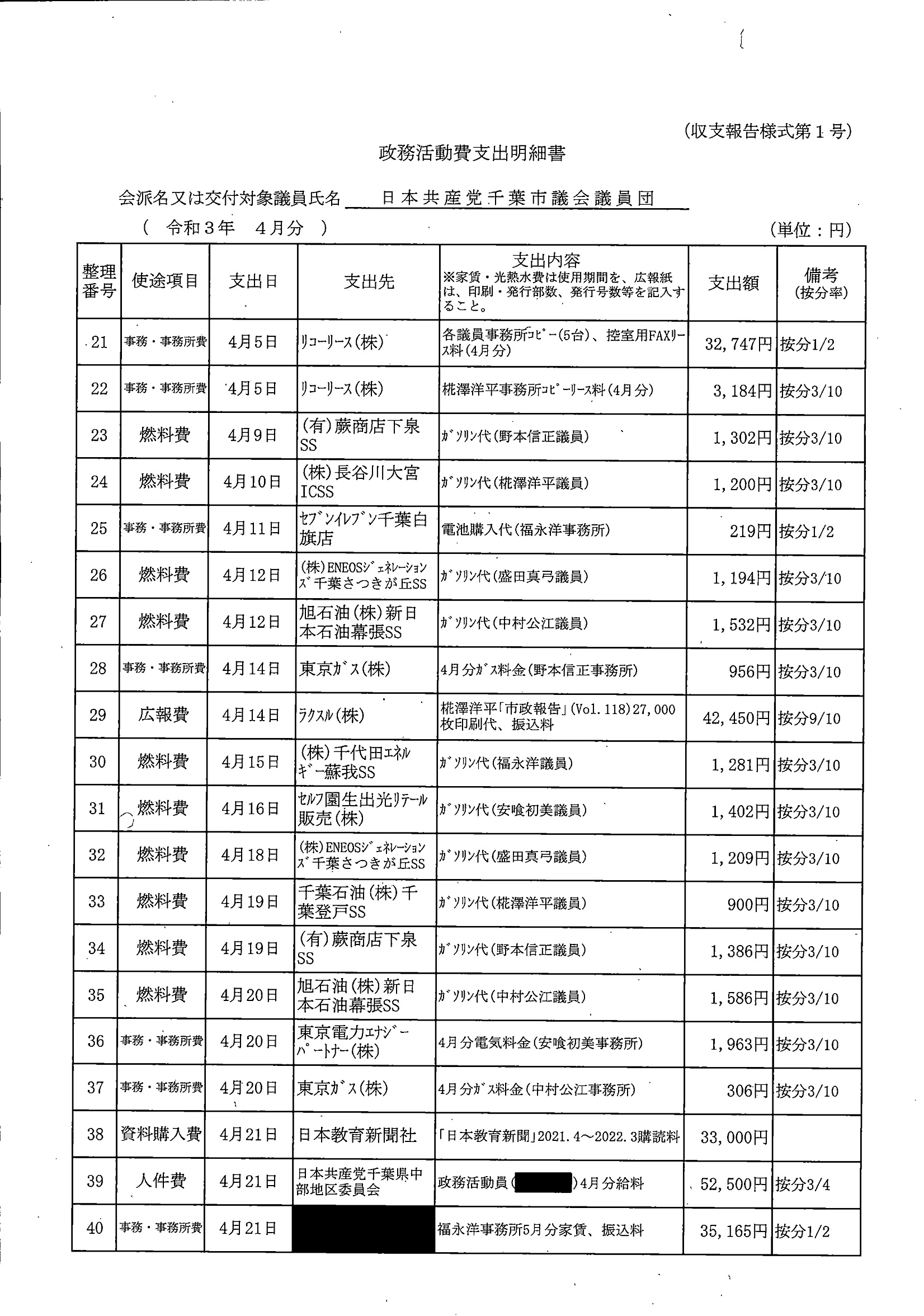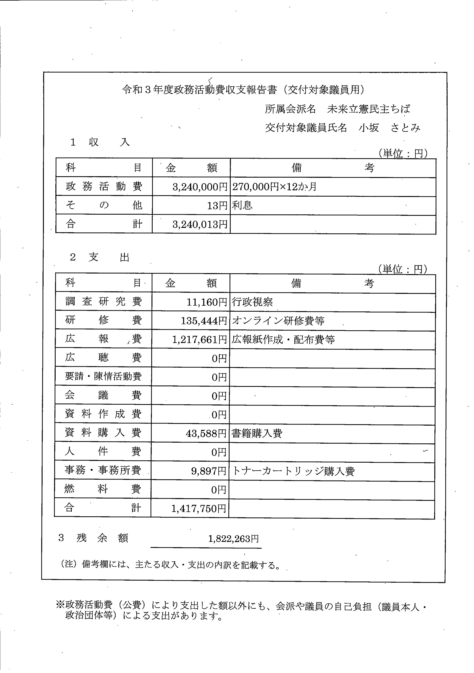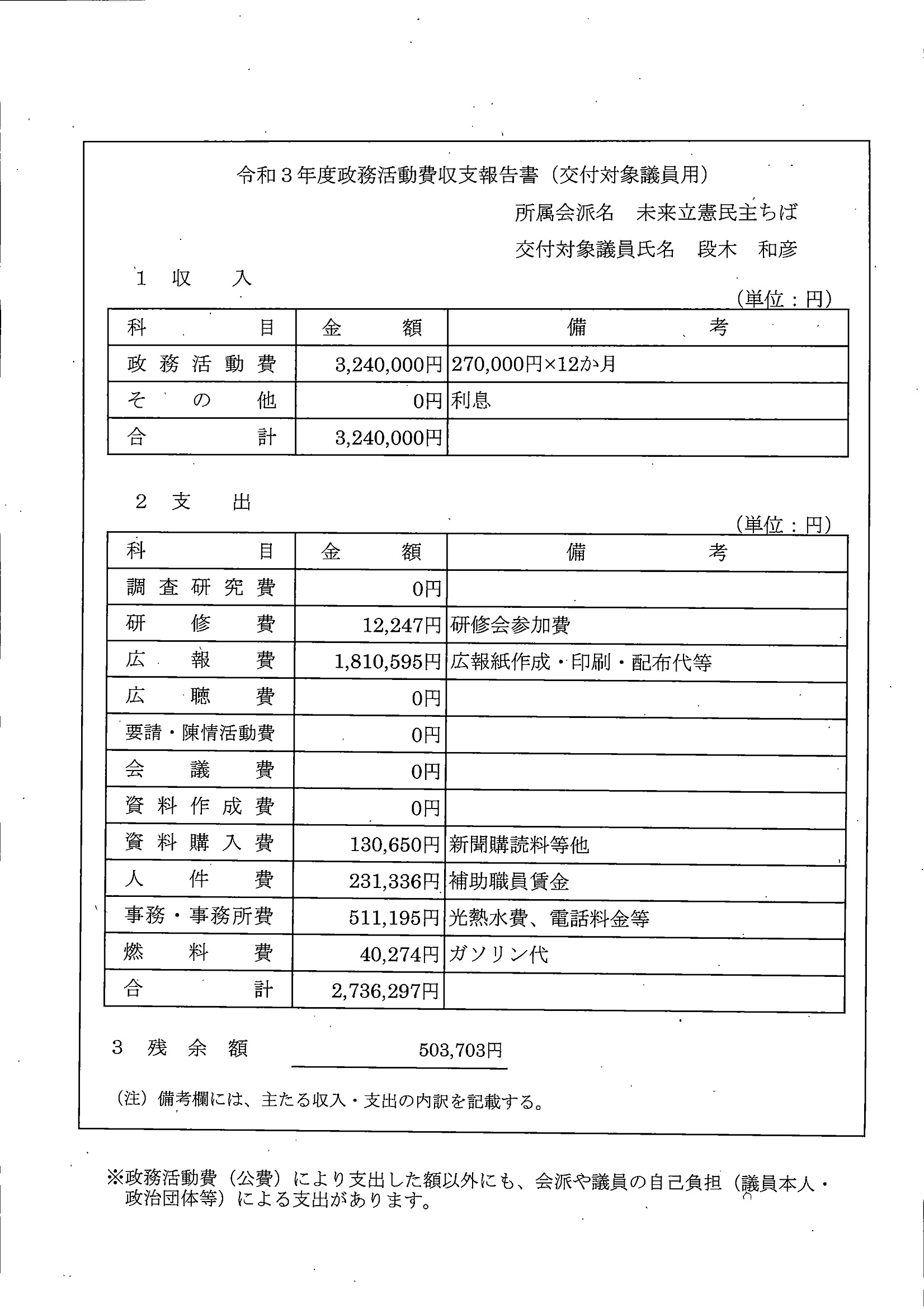 千葉市議会トップページ > 広報・情報公開 > 政務活動費 > 令和3年度交付分(政務活動費収支報告書)