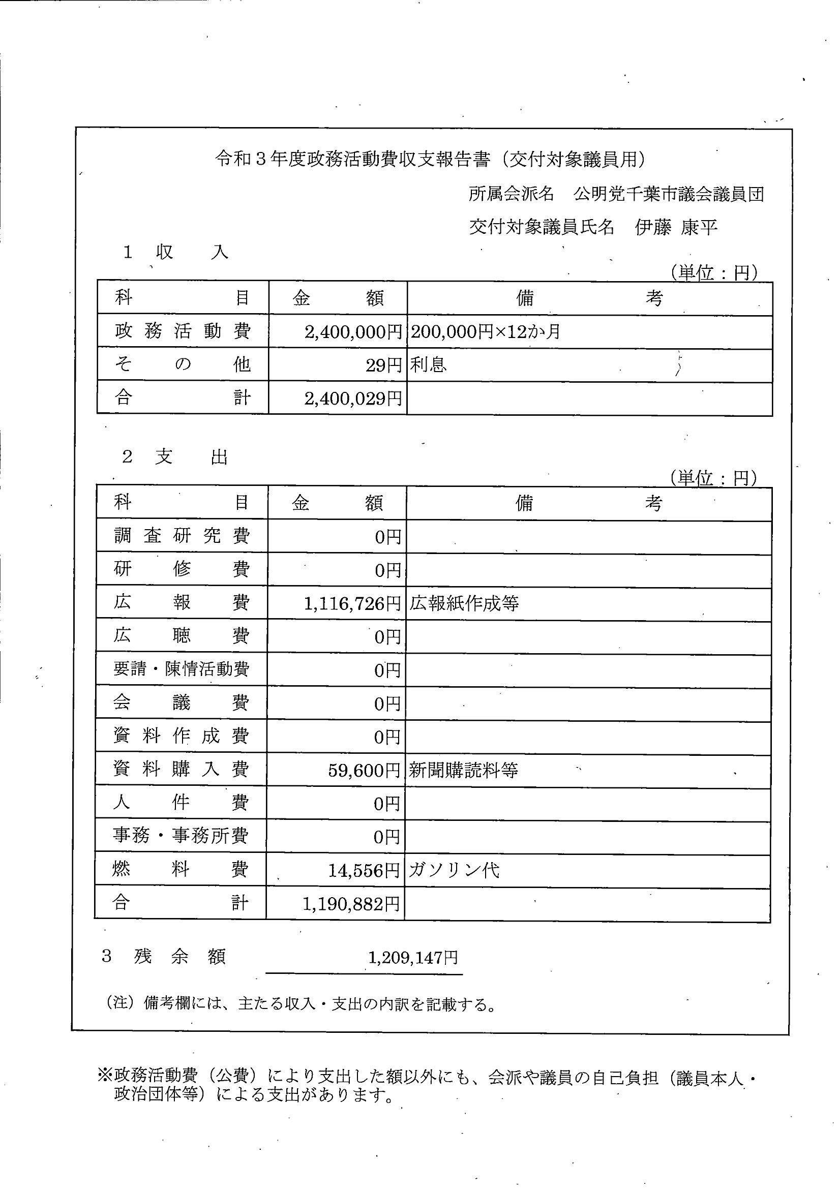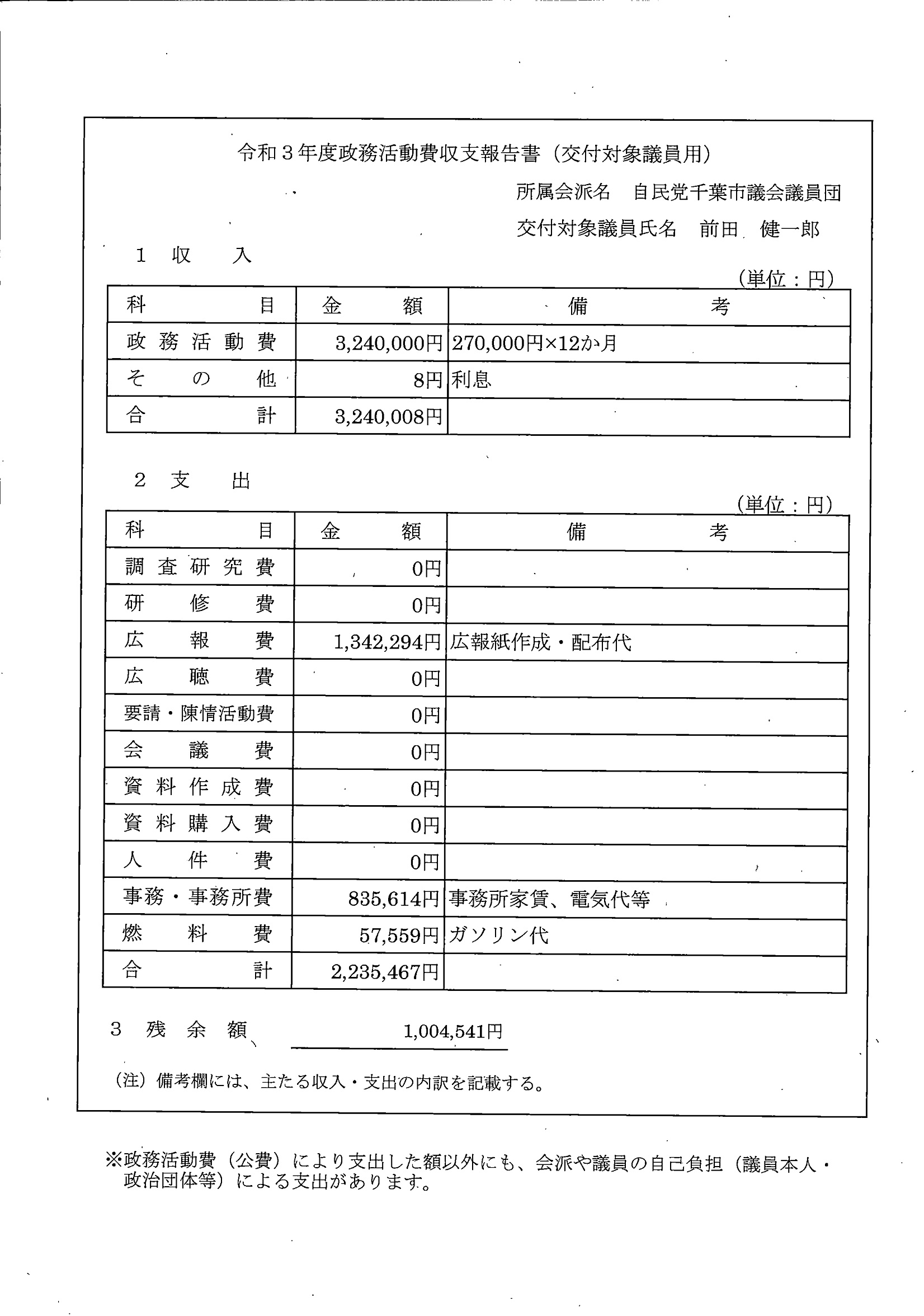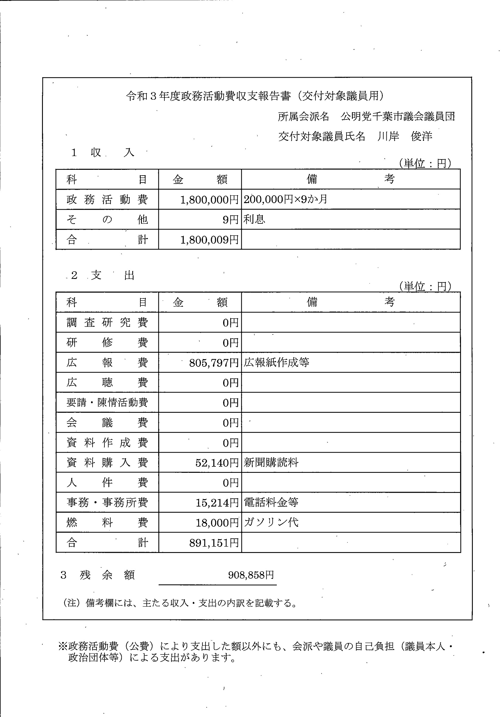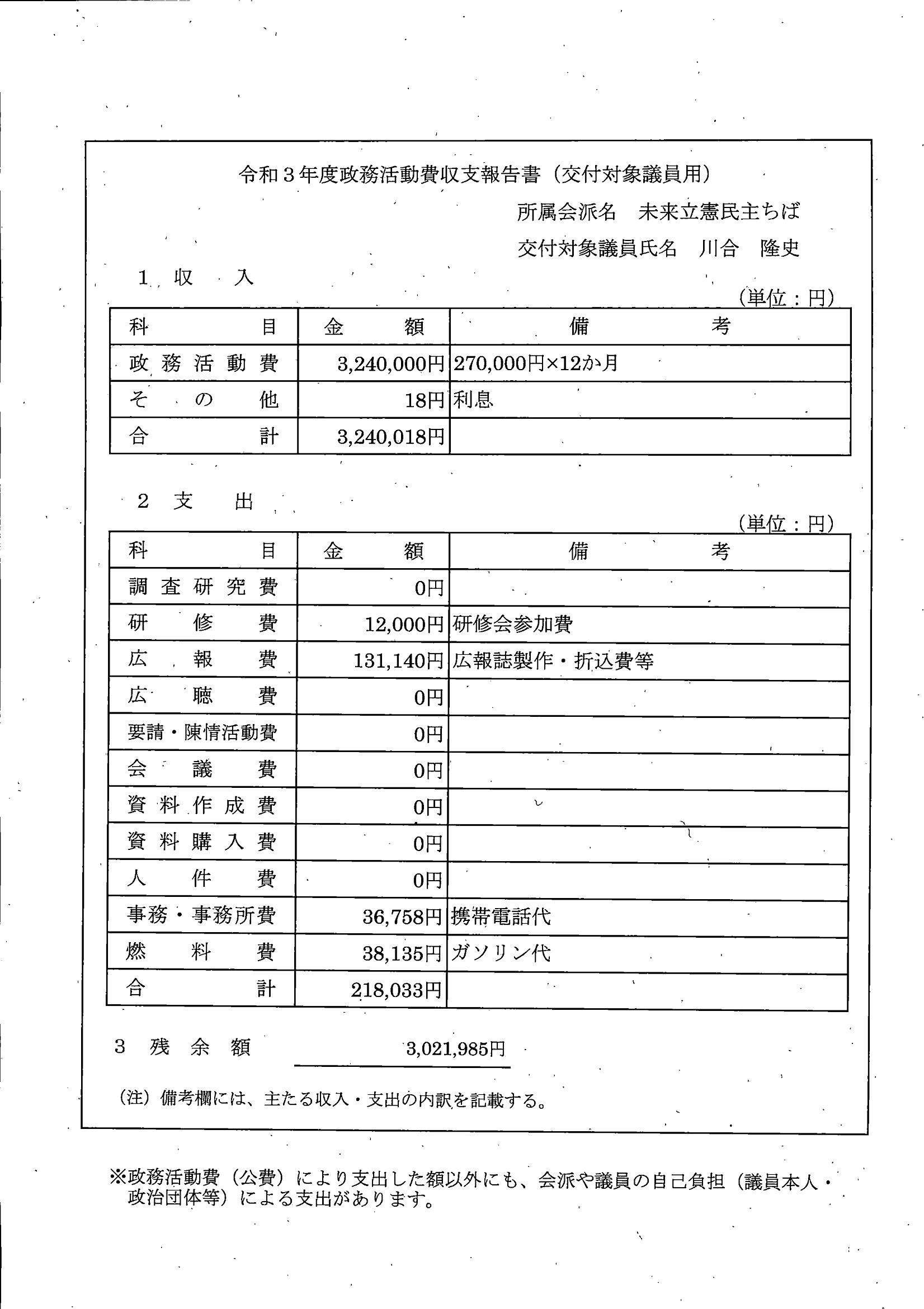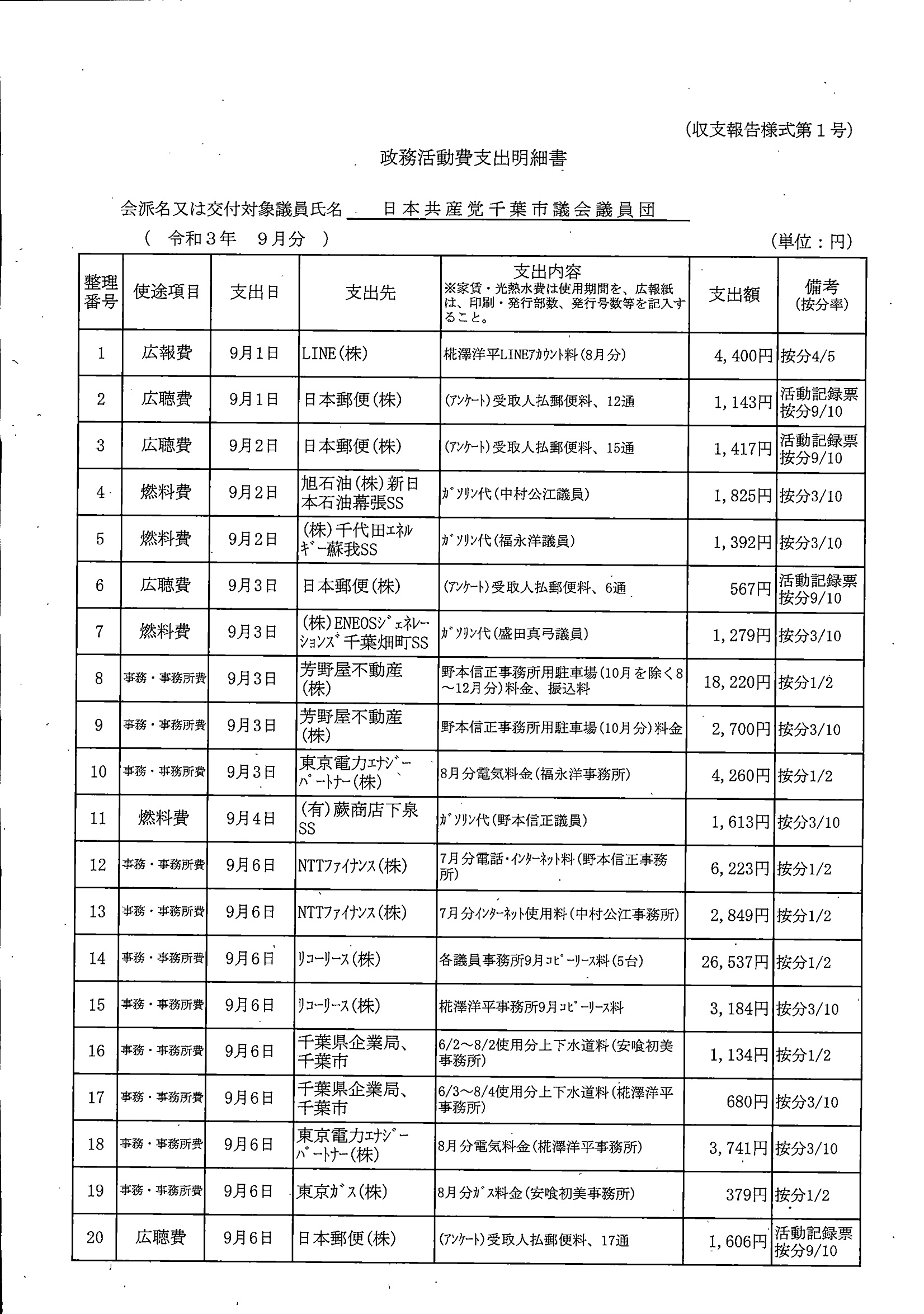 千葉市議会トップページ > 広報・情報公開 > 政務活動費 > 令和3年度交付分(政務活動費収支報告書)