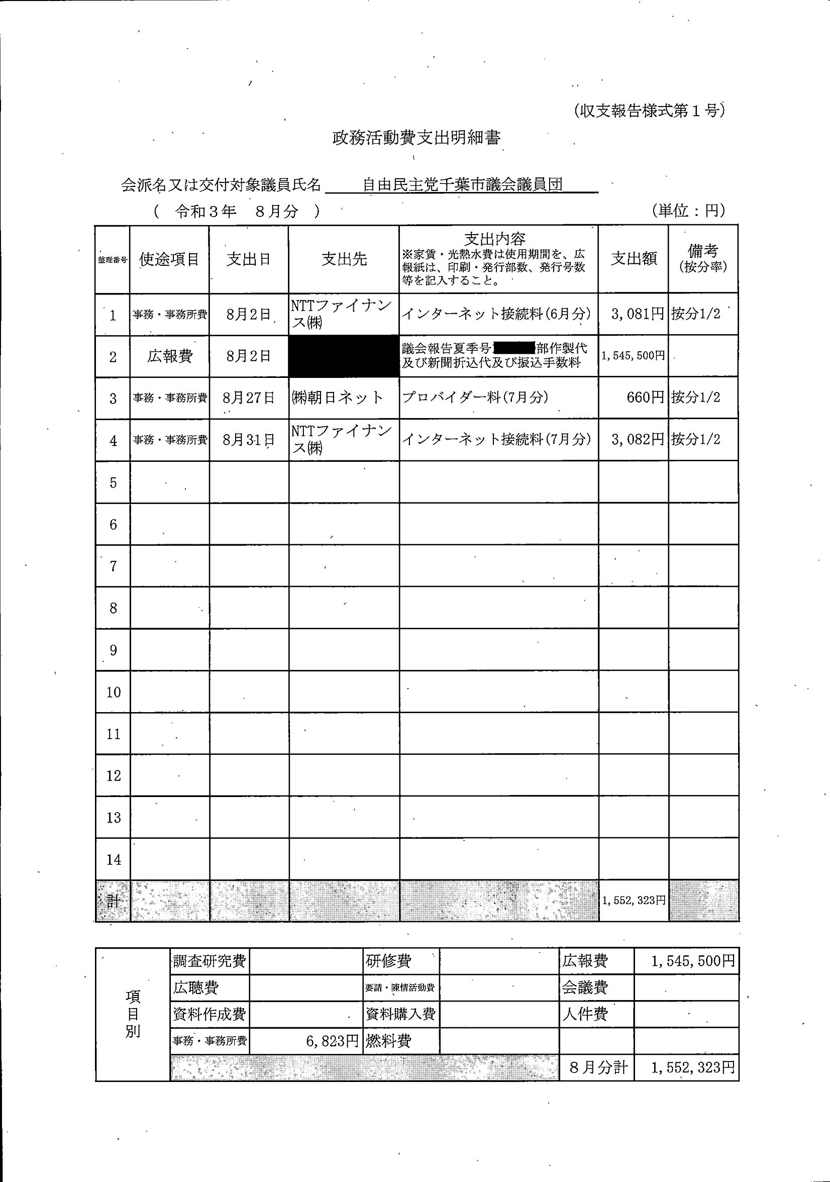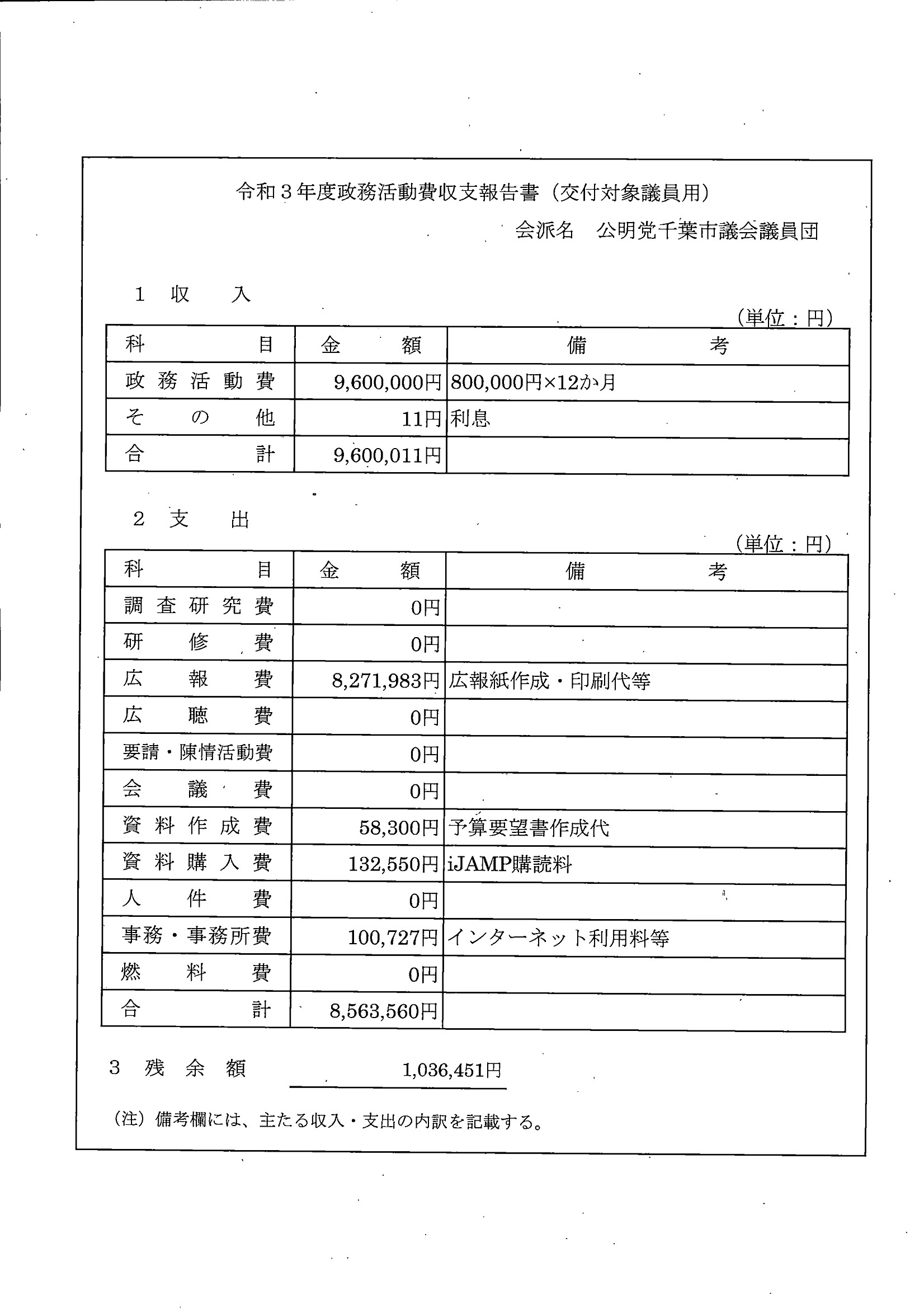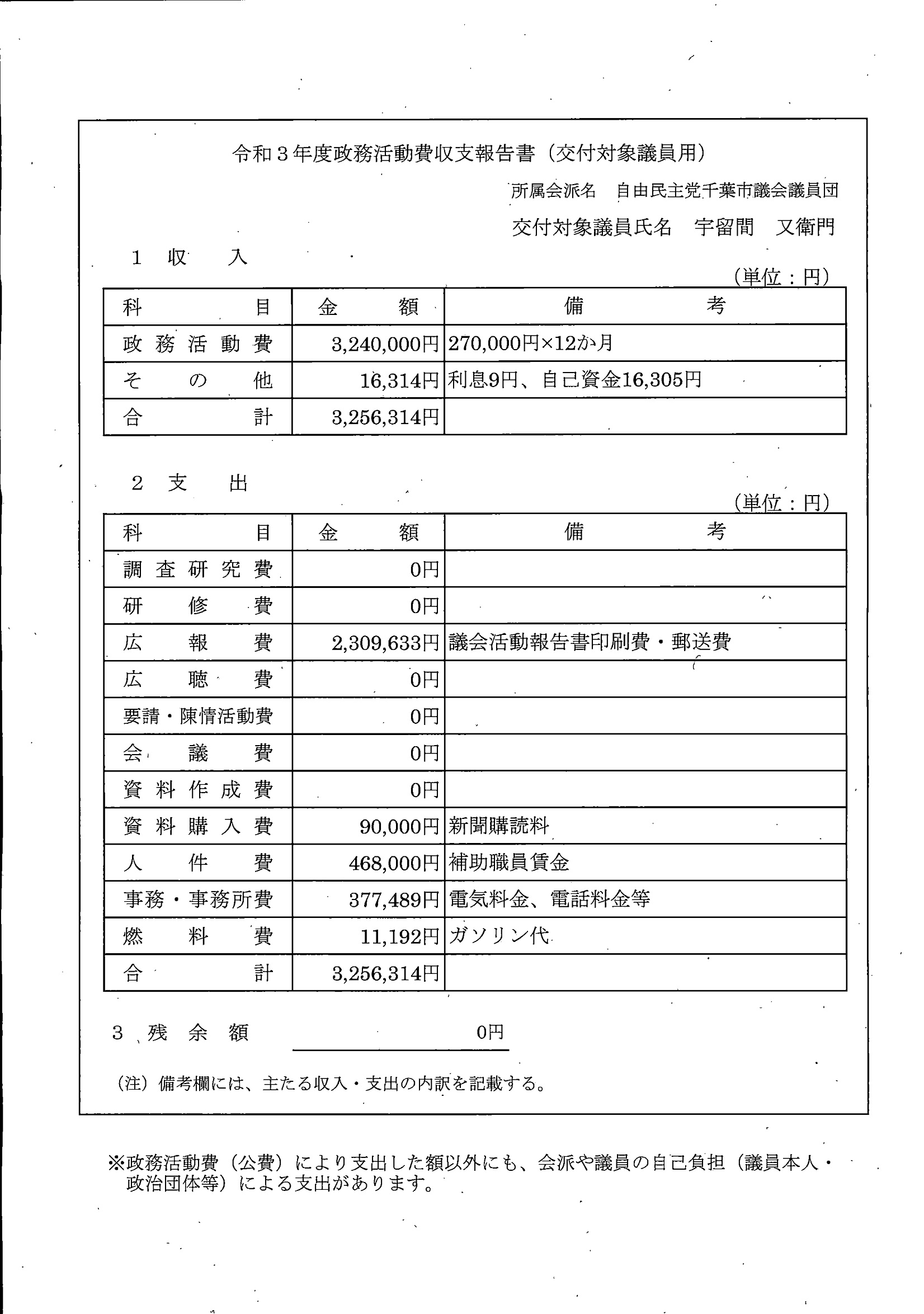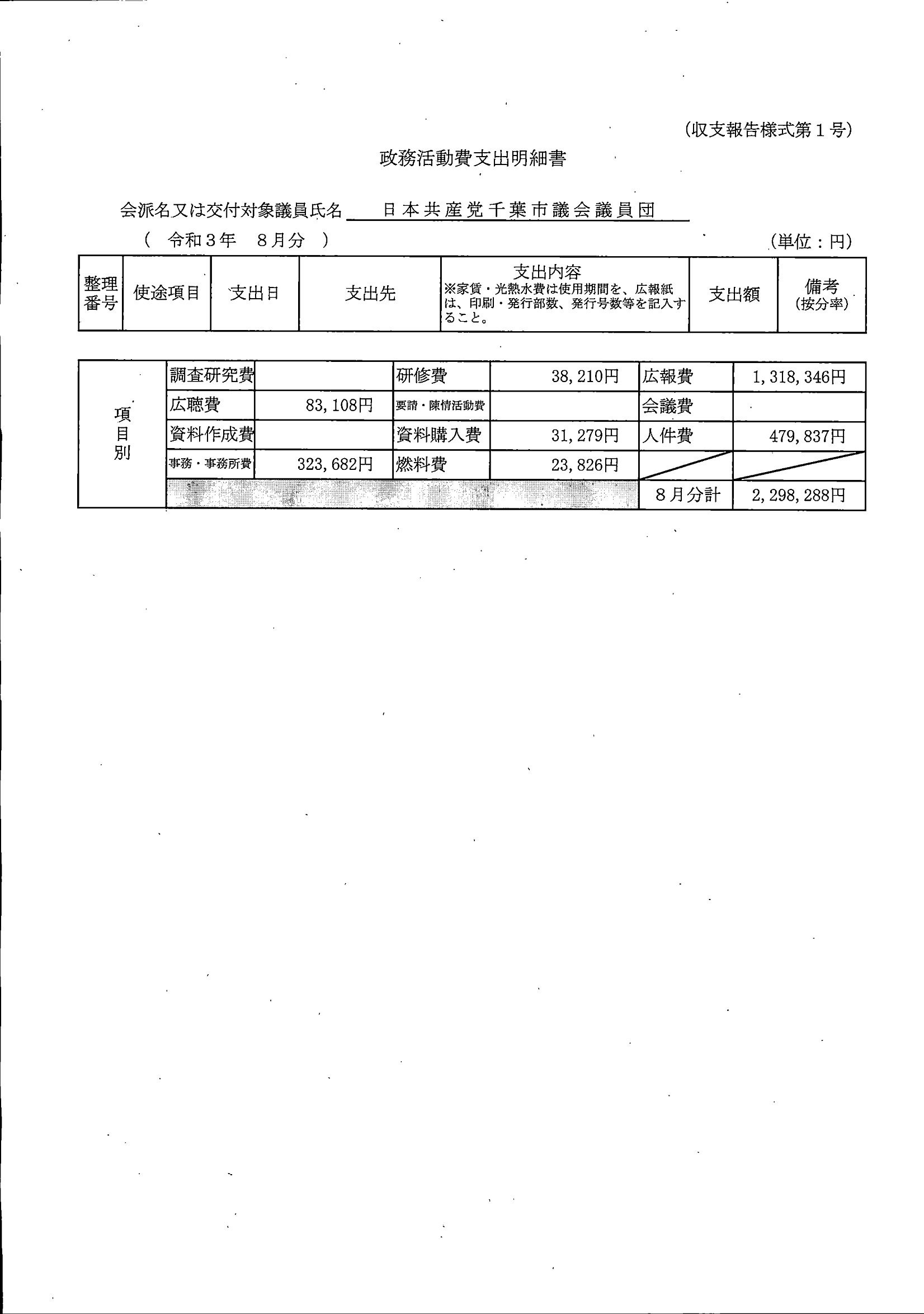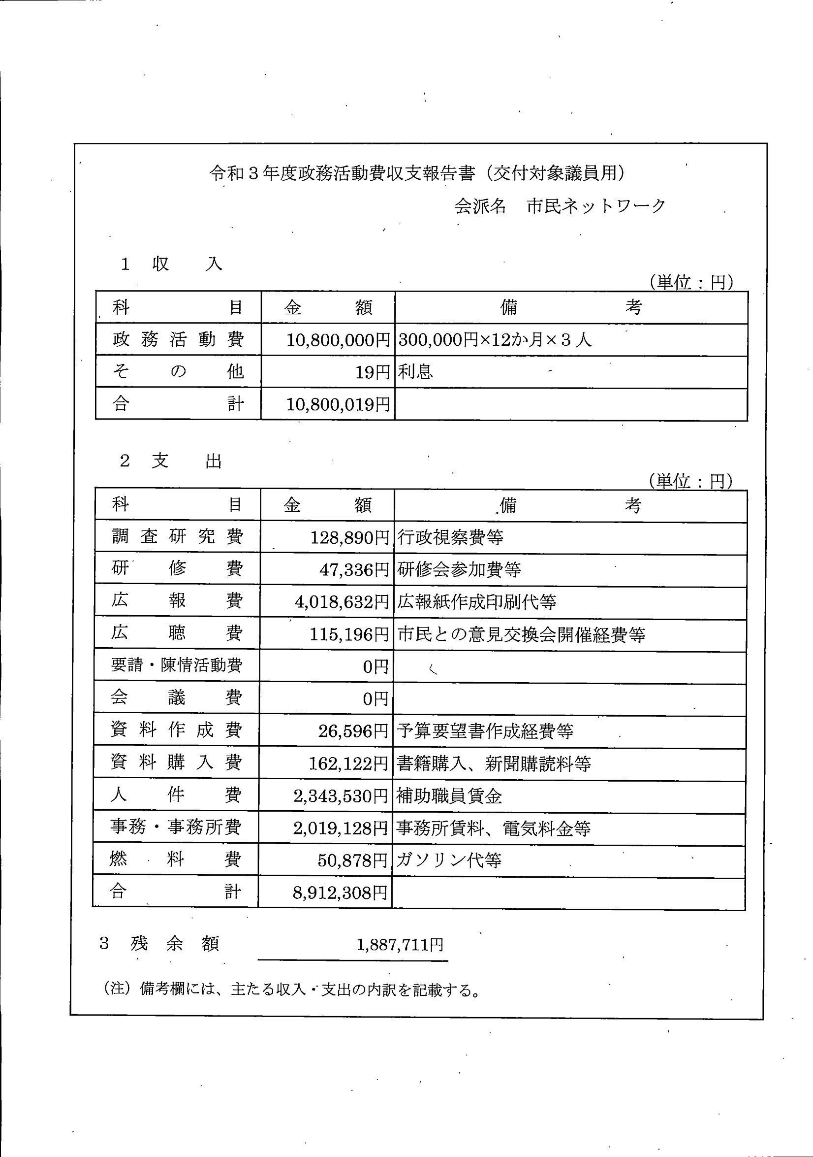 千葉市議会トップページ > 広報・情報公開 > 政務活動費 > 令和3年度交付分(政務活動費収支報告書)