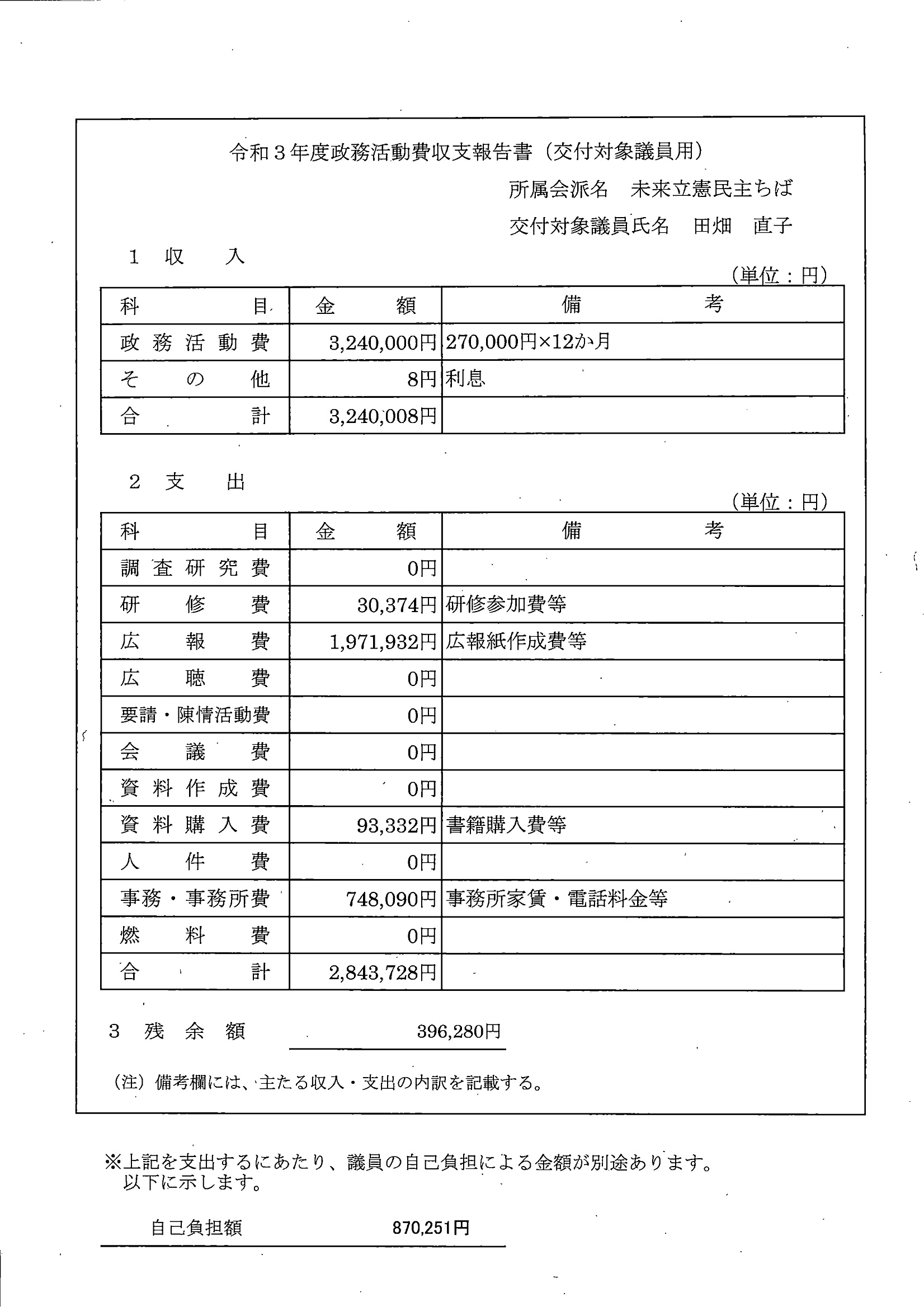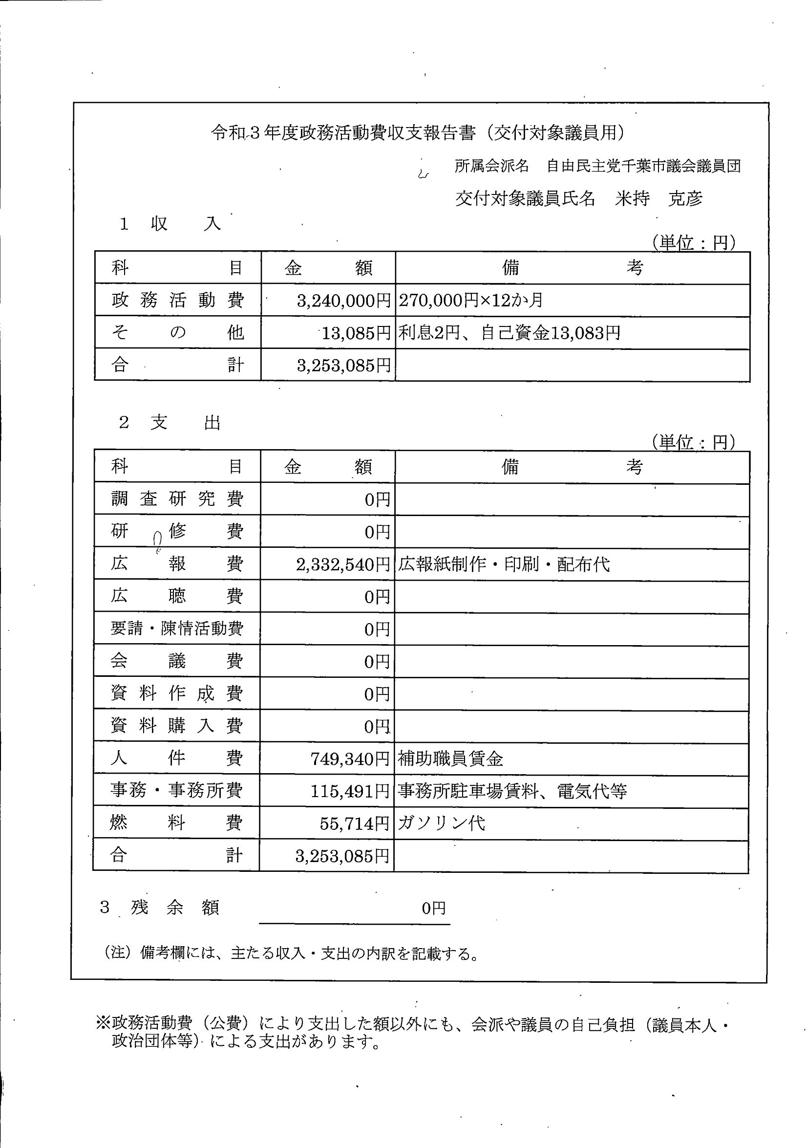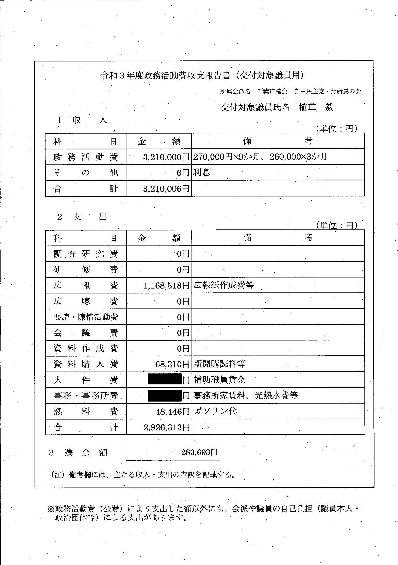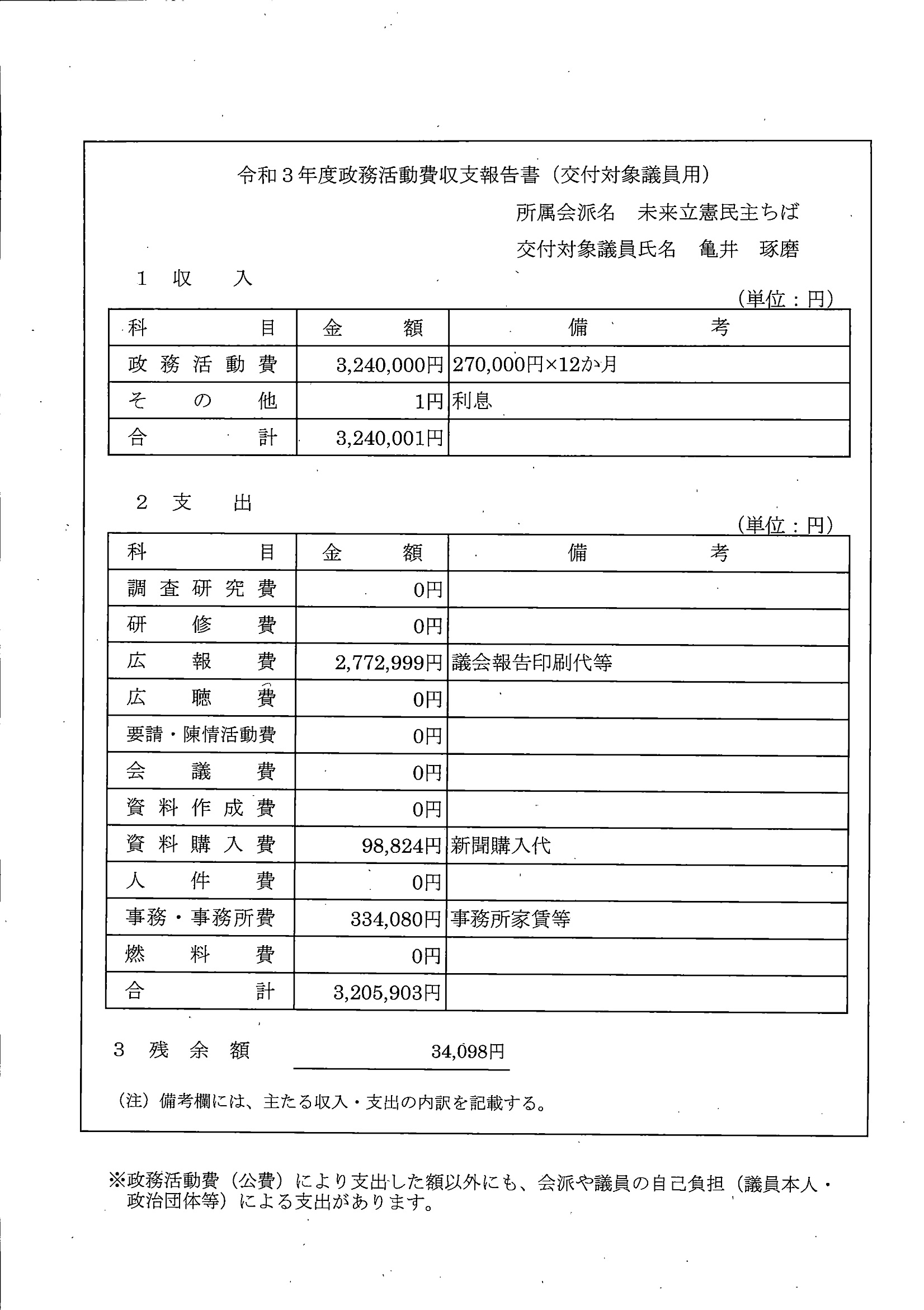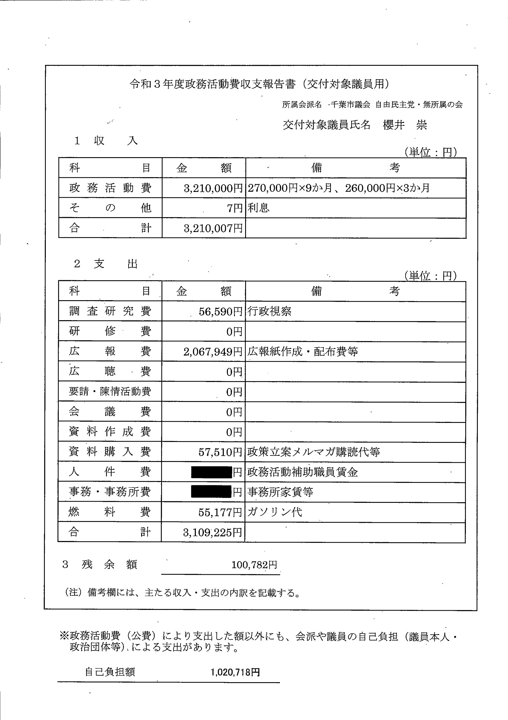 千葉市議会トップページ > 広報・情報公開 > 政務活動費 > 令和3年度交付分(政務活動費収支報告書)