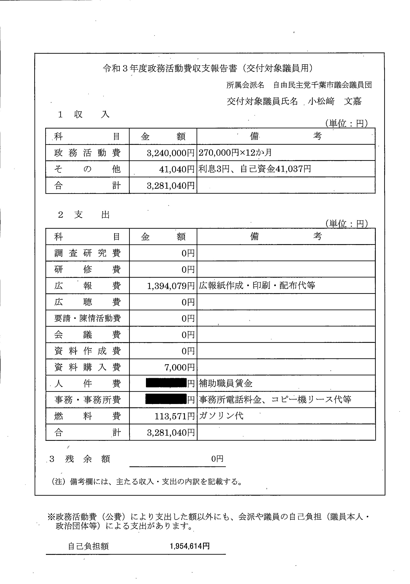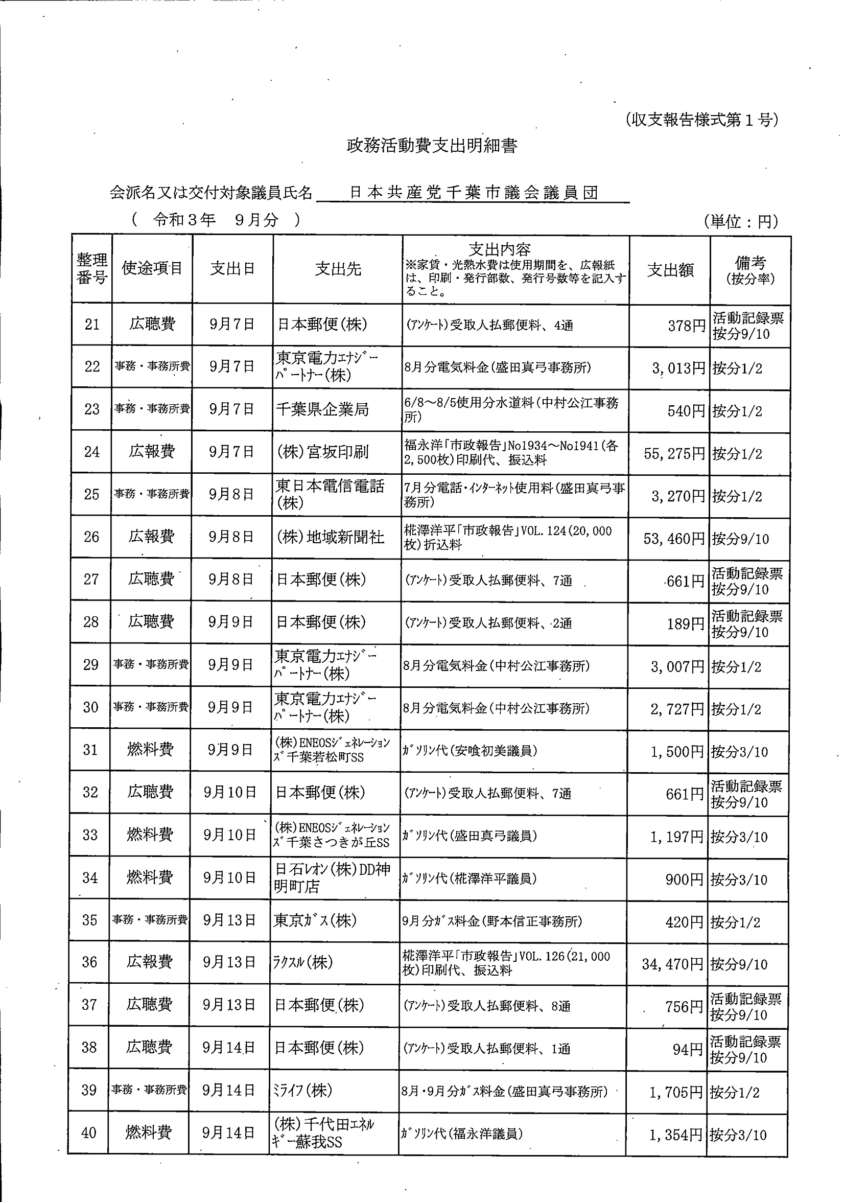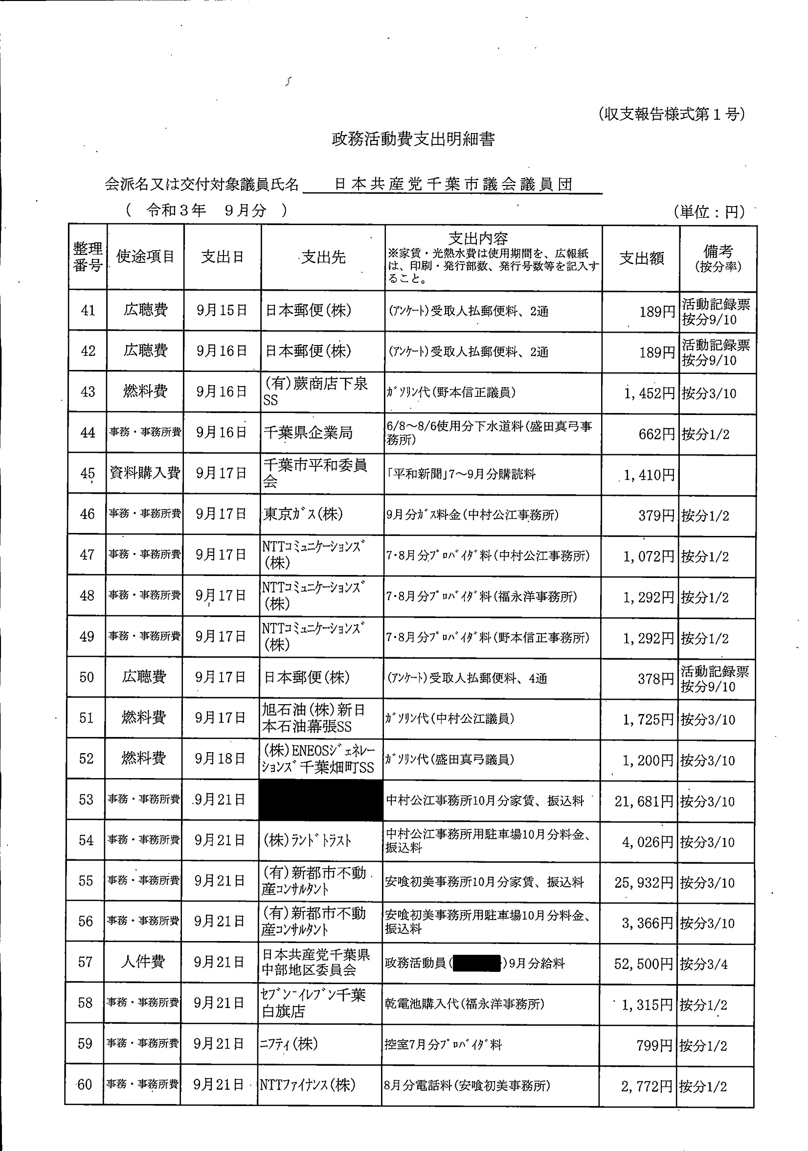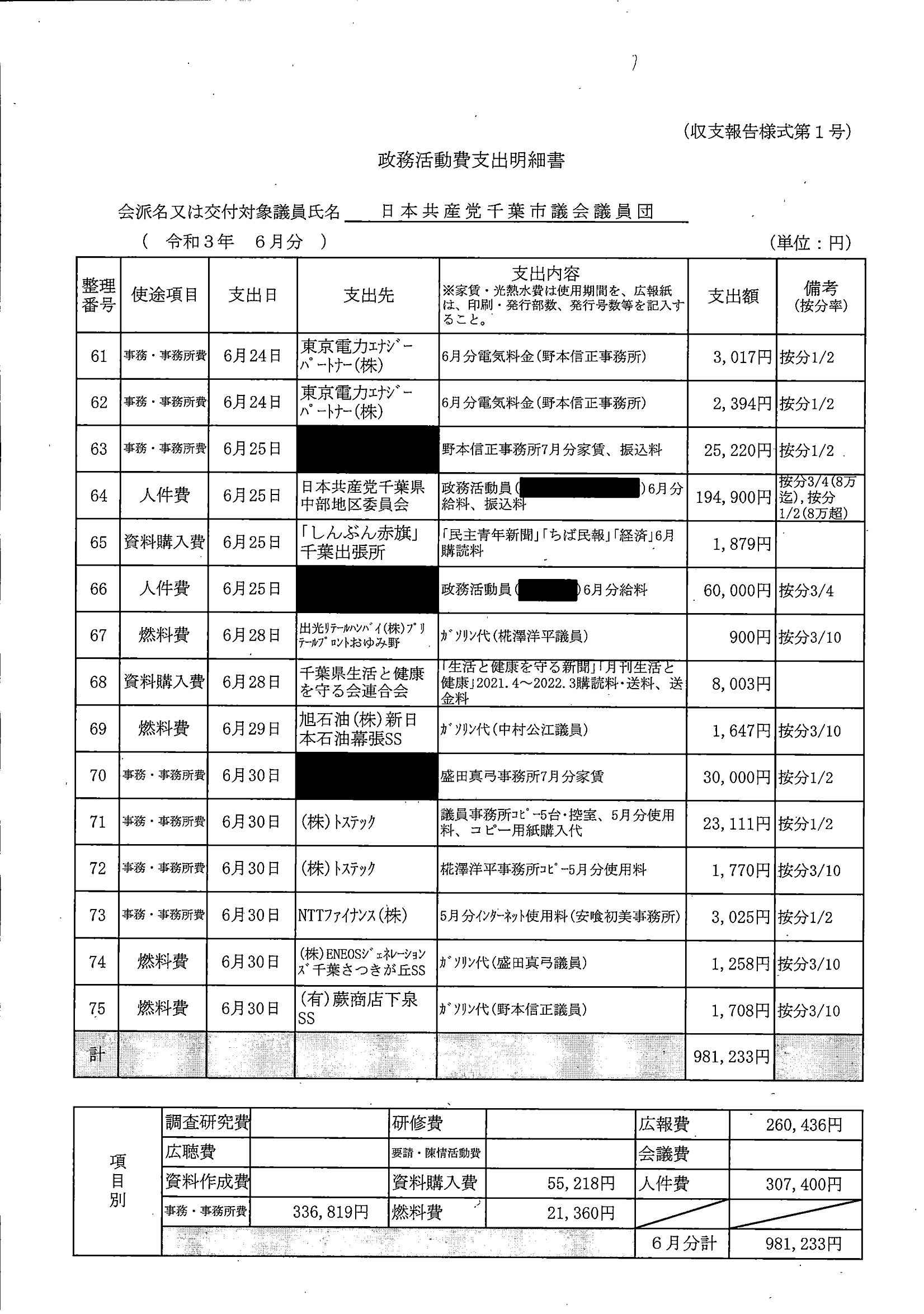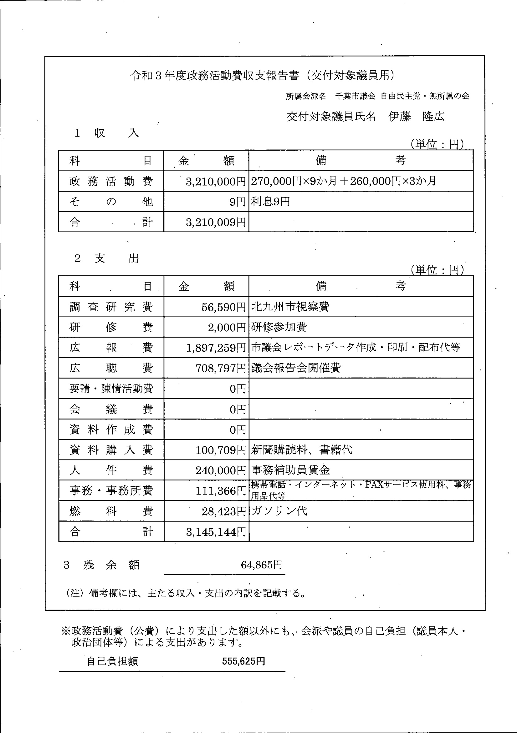 千葉市議会トップページ > 広報・情報公開 > 政務活動費 > 令和3年度交付分(政務活動費収支報告書)