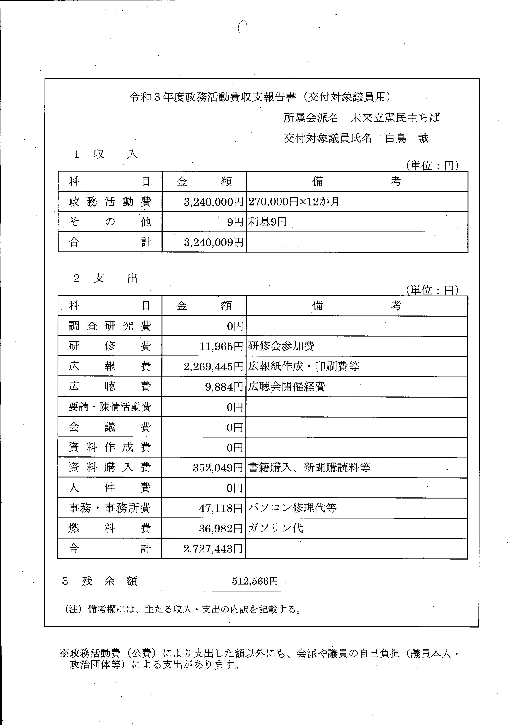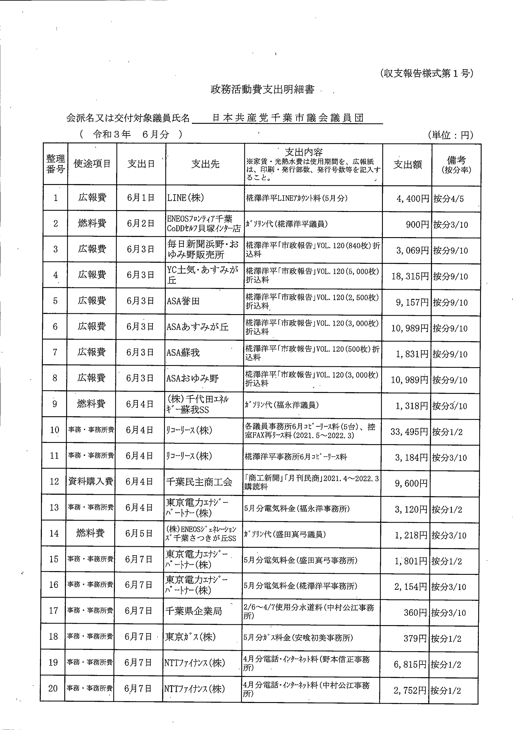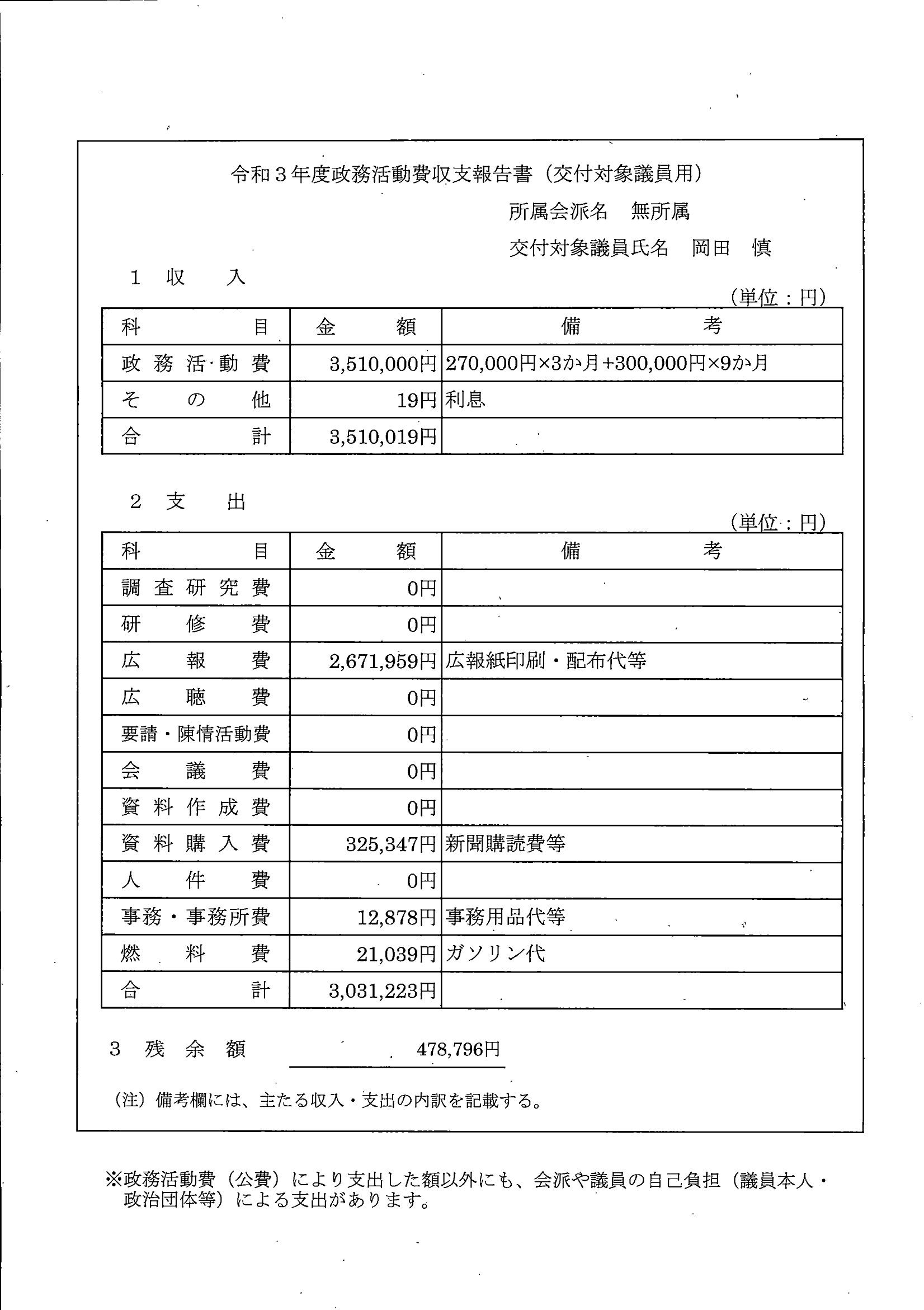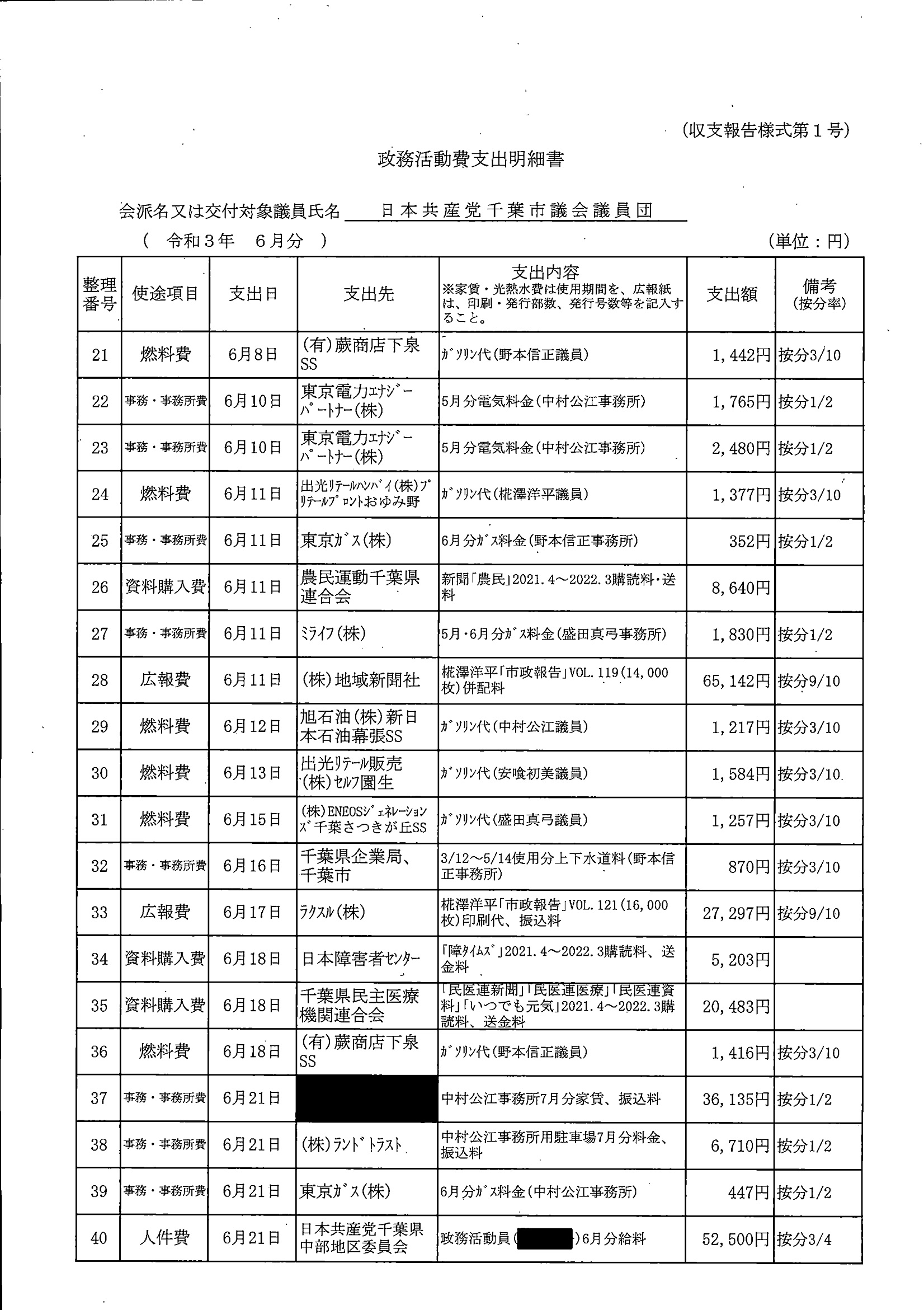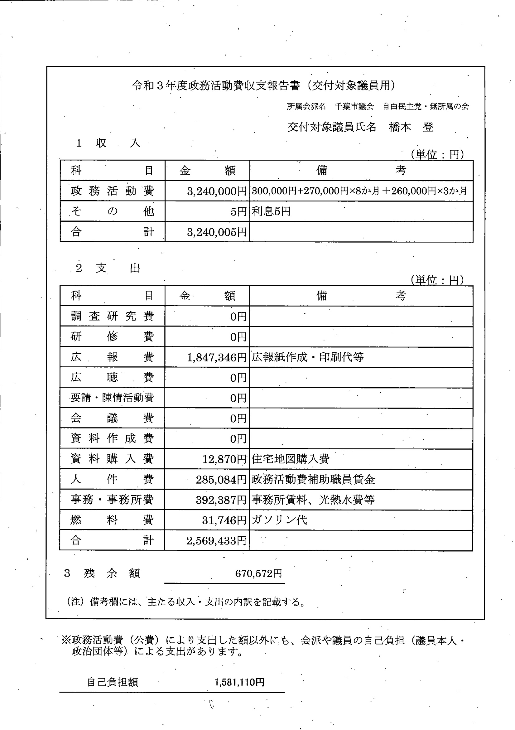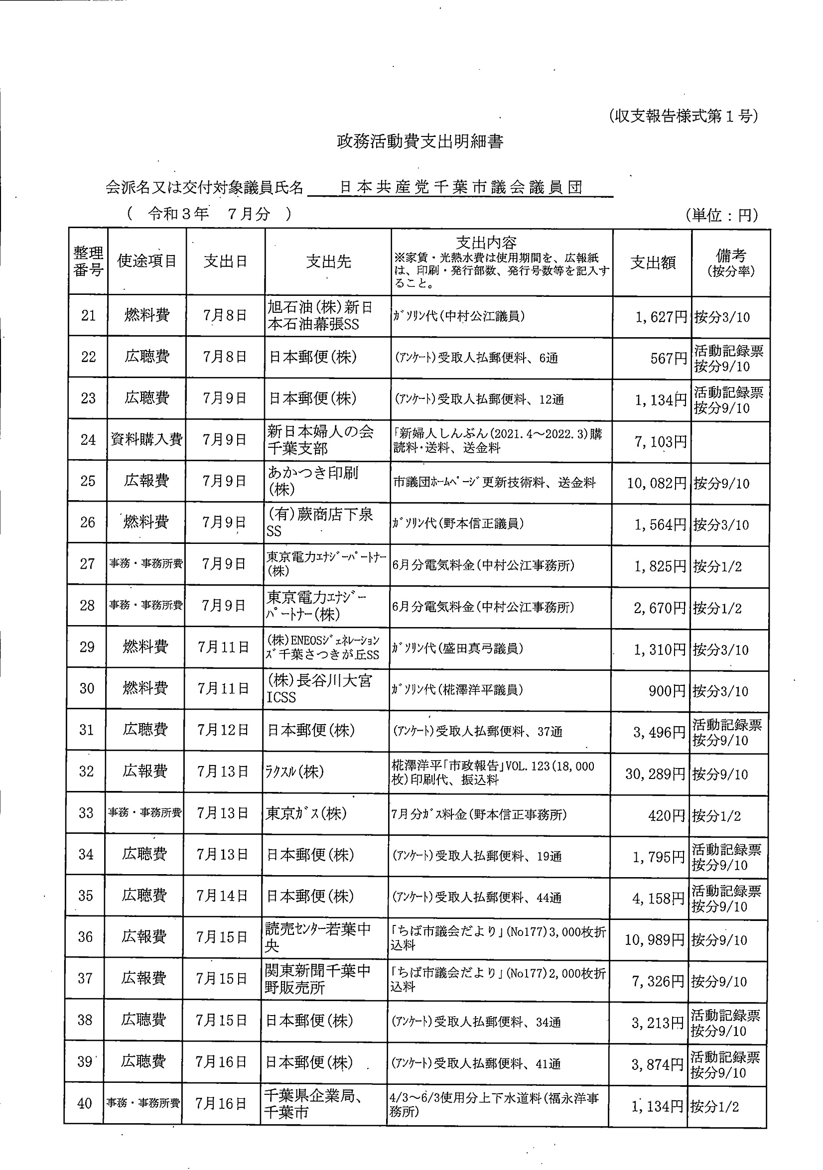 千葉市議会トップページ > 広報・情報公開 > 政務活動費 > 令和3年度交付分(政務活動費収支報告書)