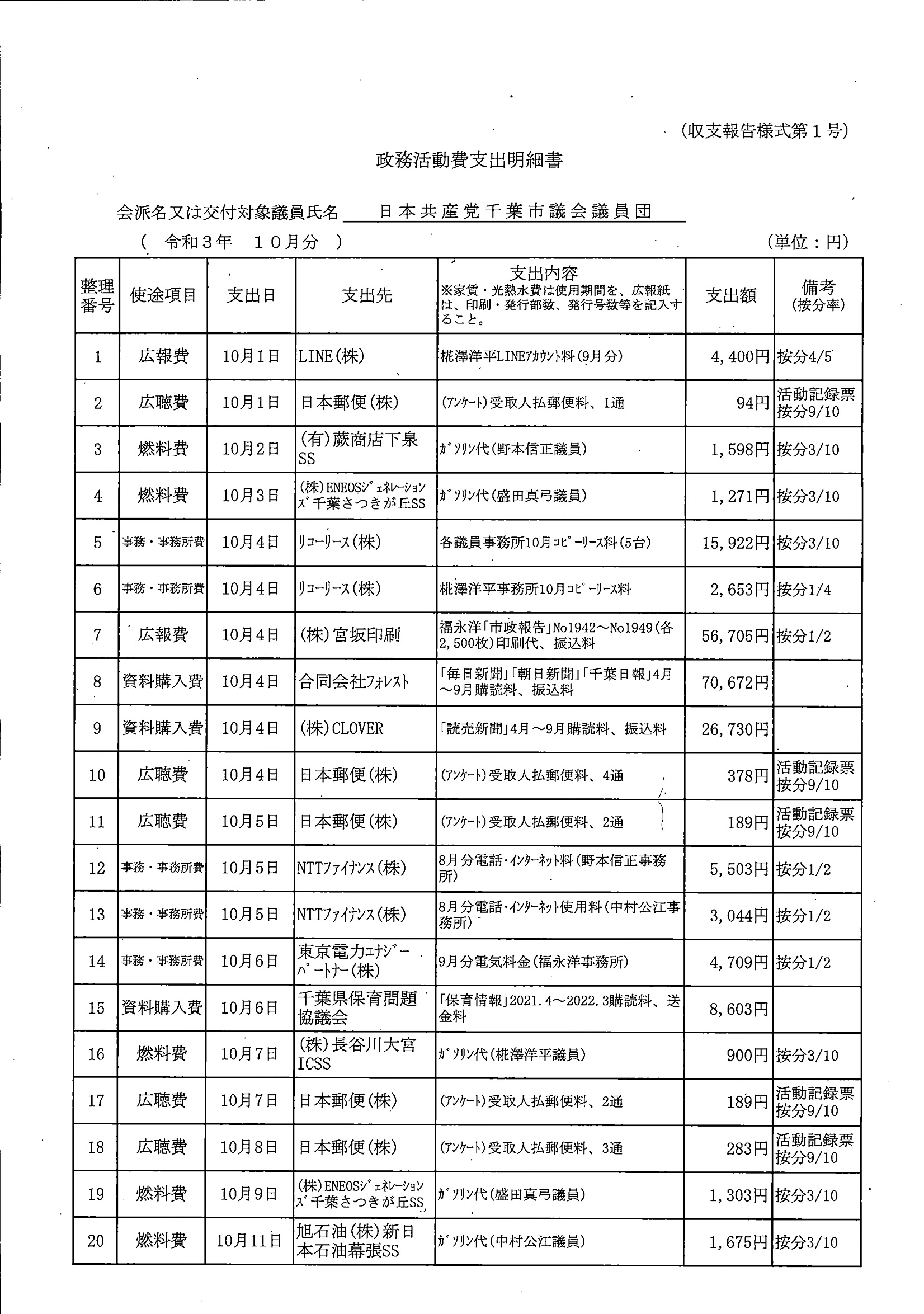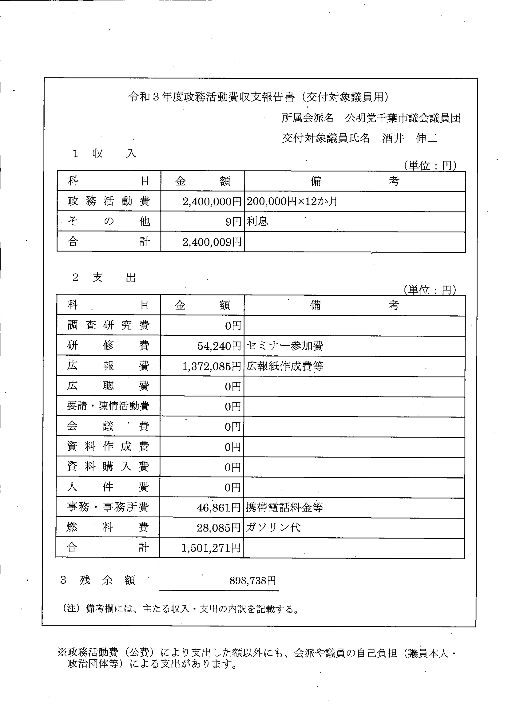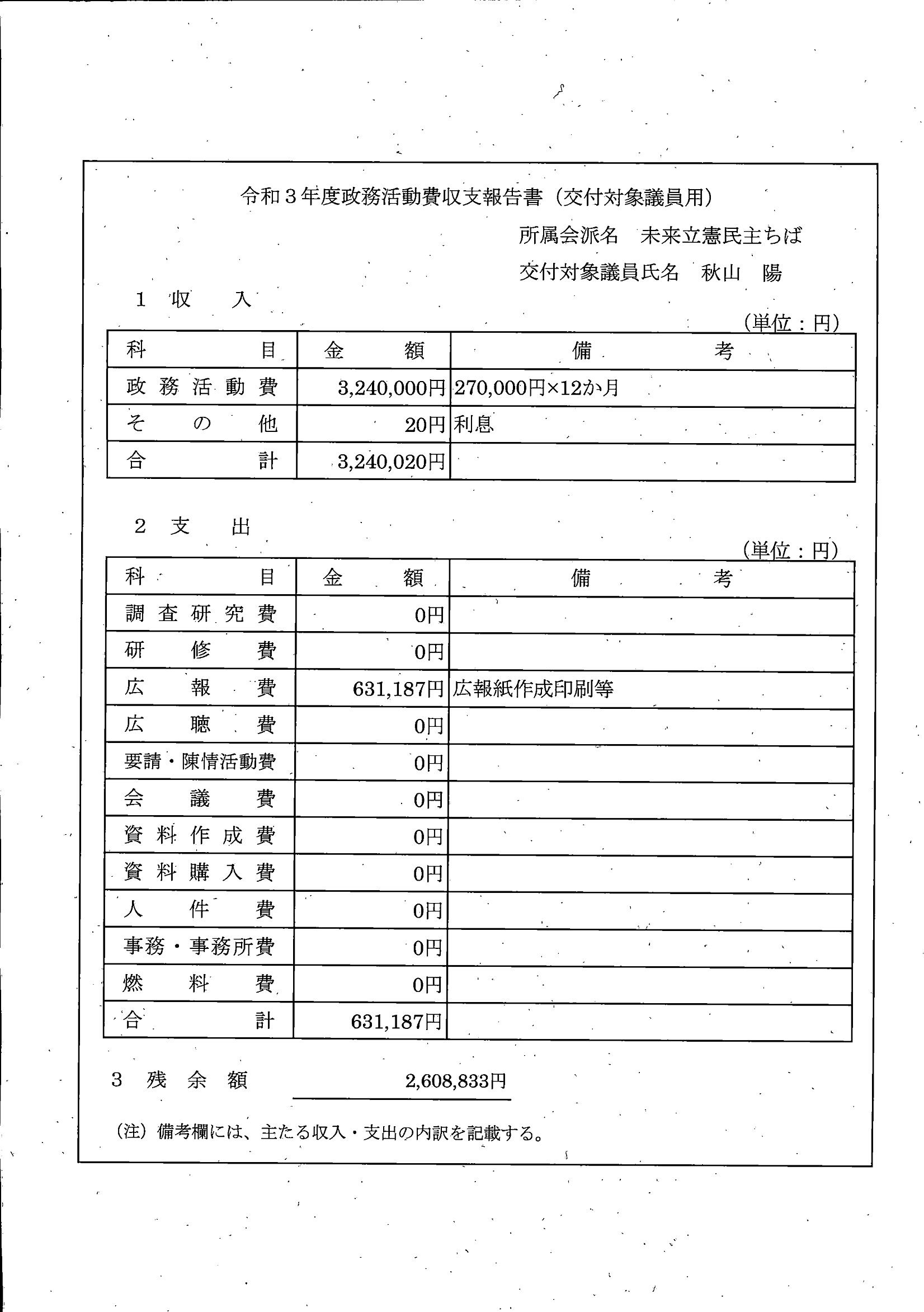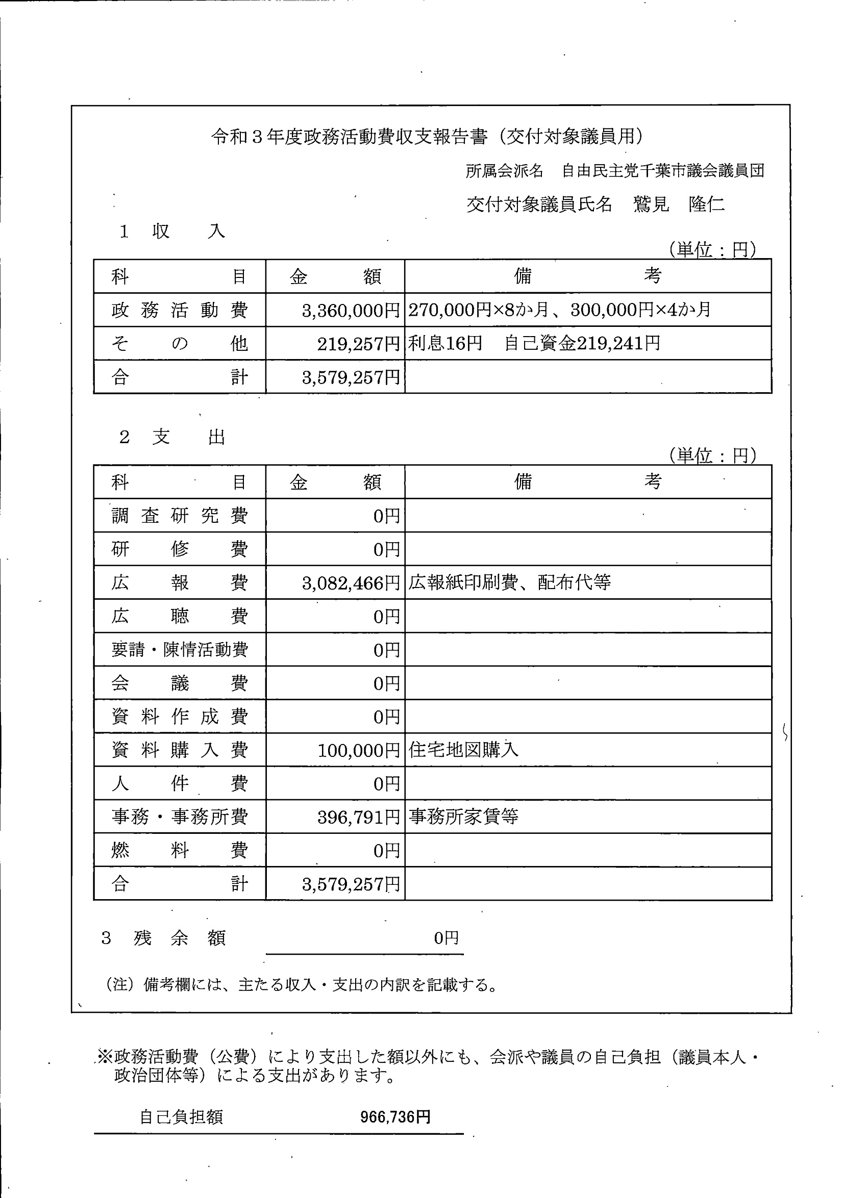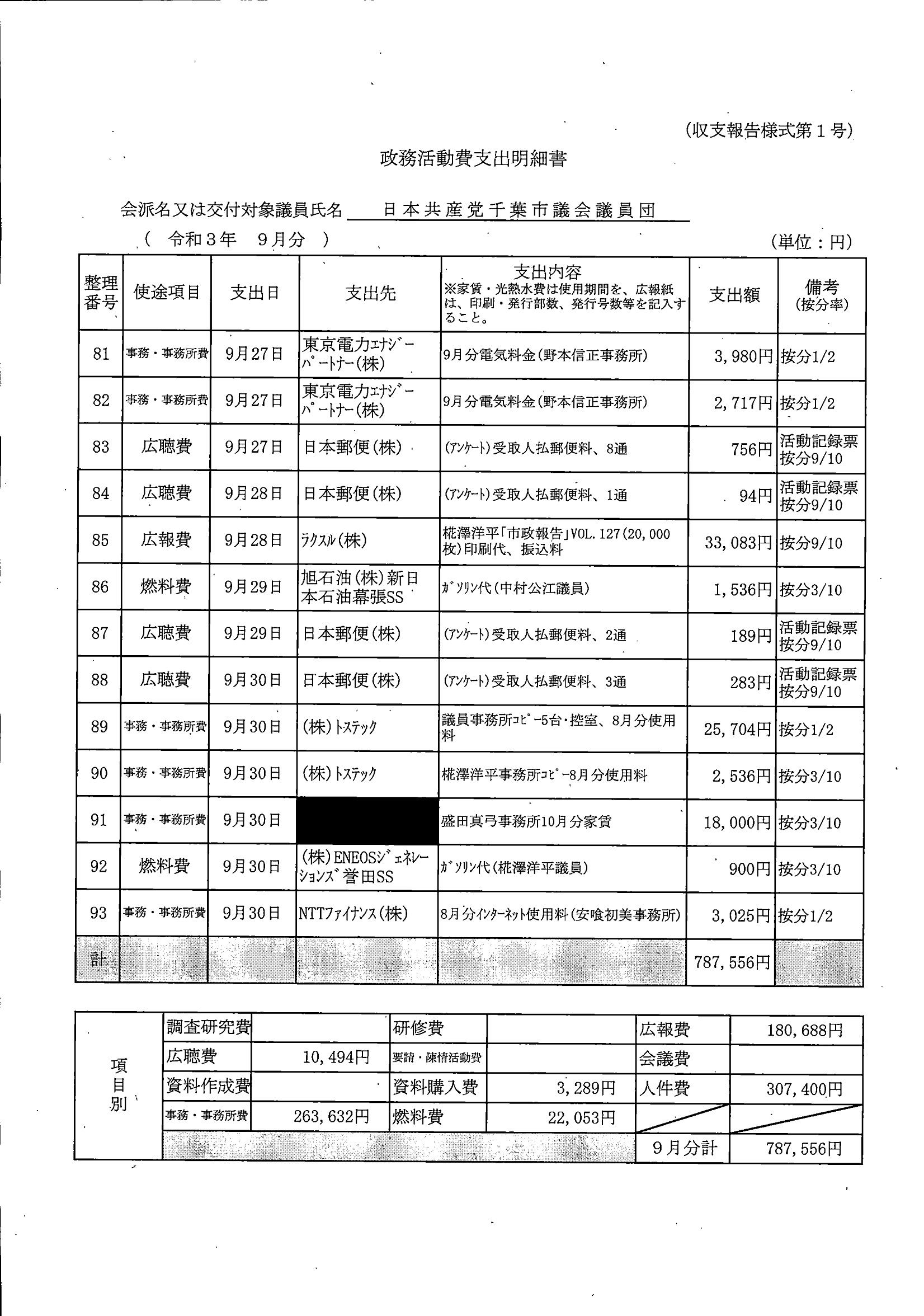 千葉市議会トップページ > 広報・情報公開 > 政務活動費 > 令和3年度交付分(政務活動費収支報告書)