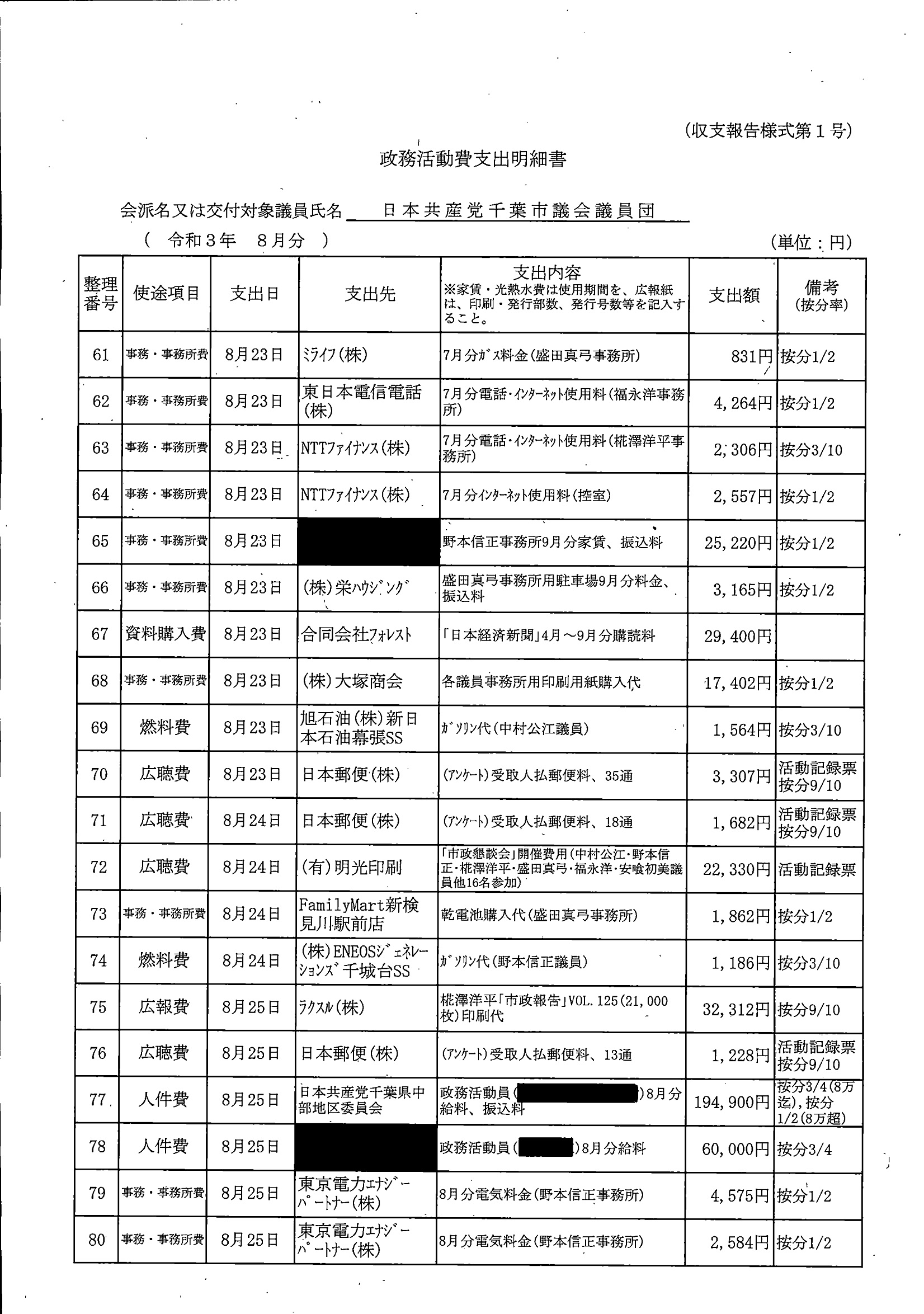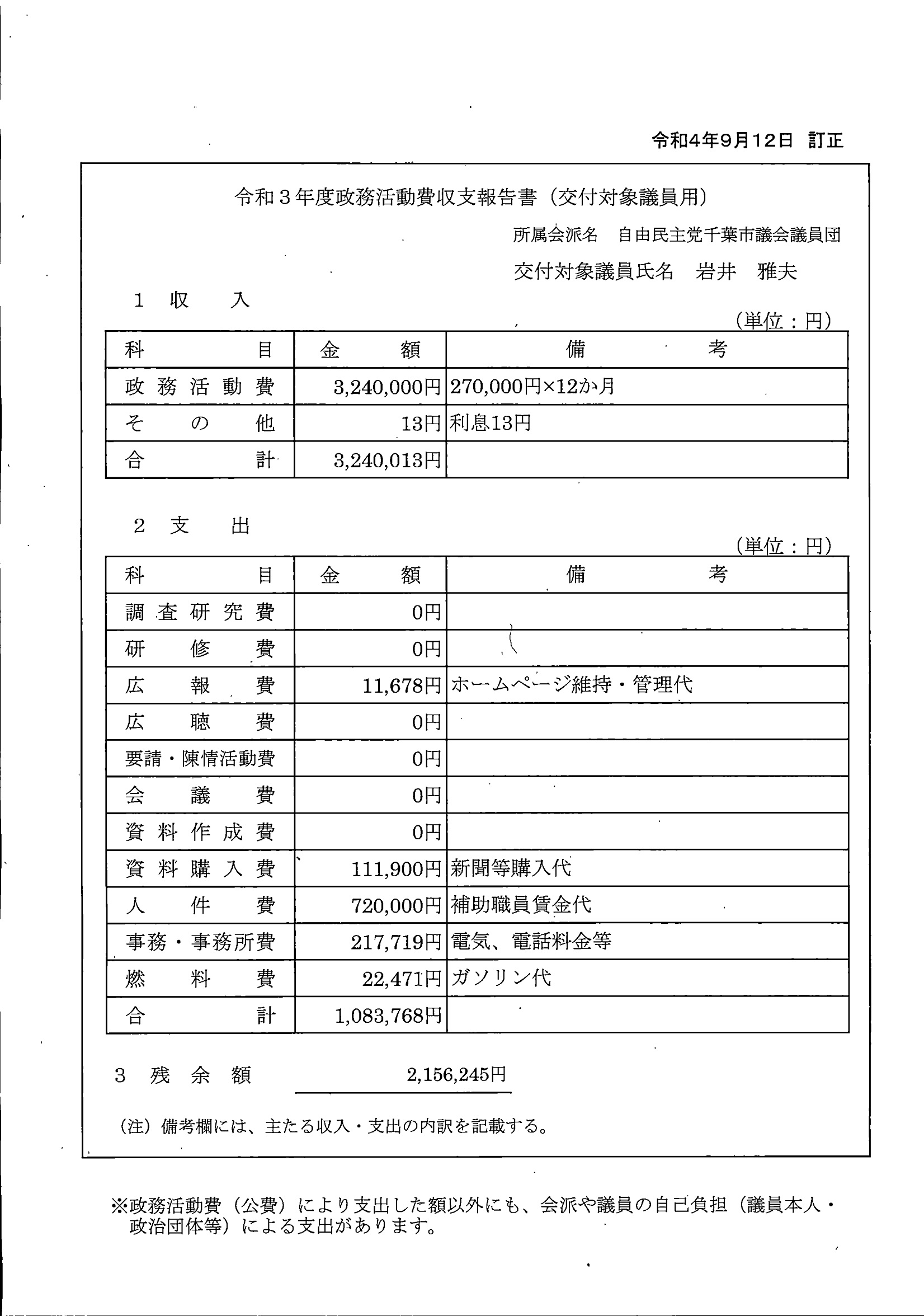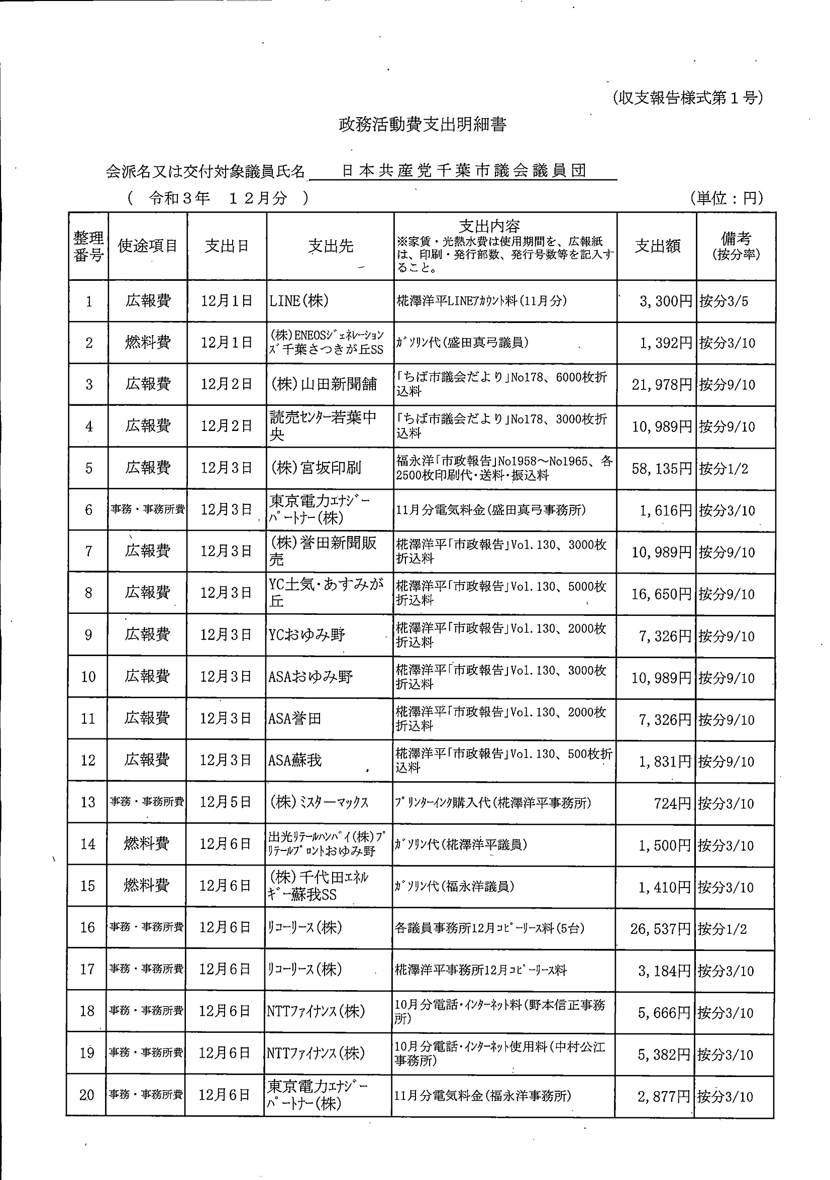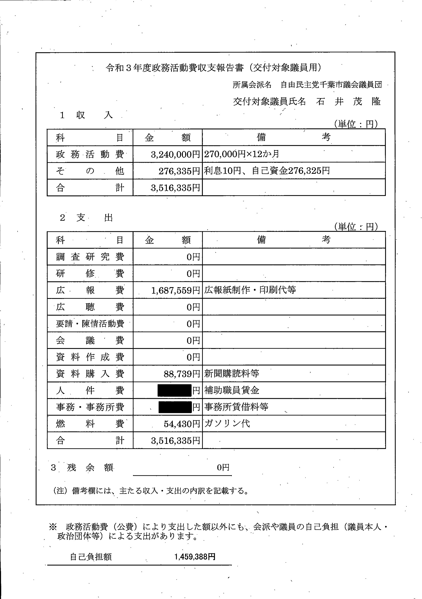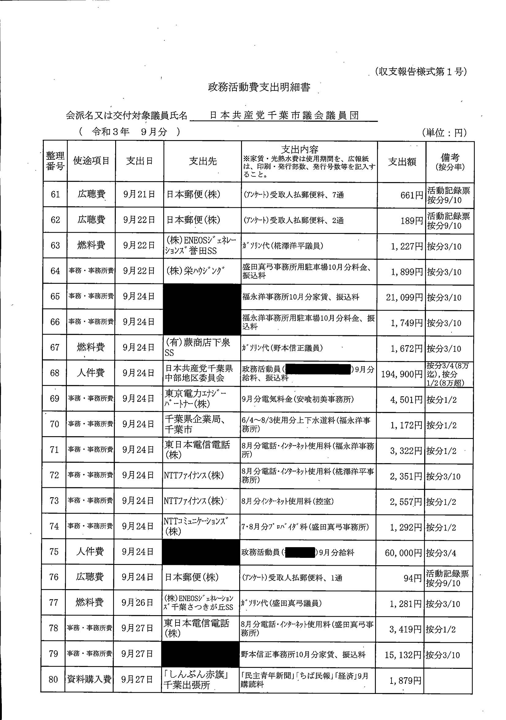 千葉市議会トップページ > 広報・情報公開 > 政務活動費 > 令和3年度交付分(政務活動費収支報告書)