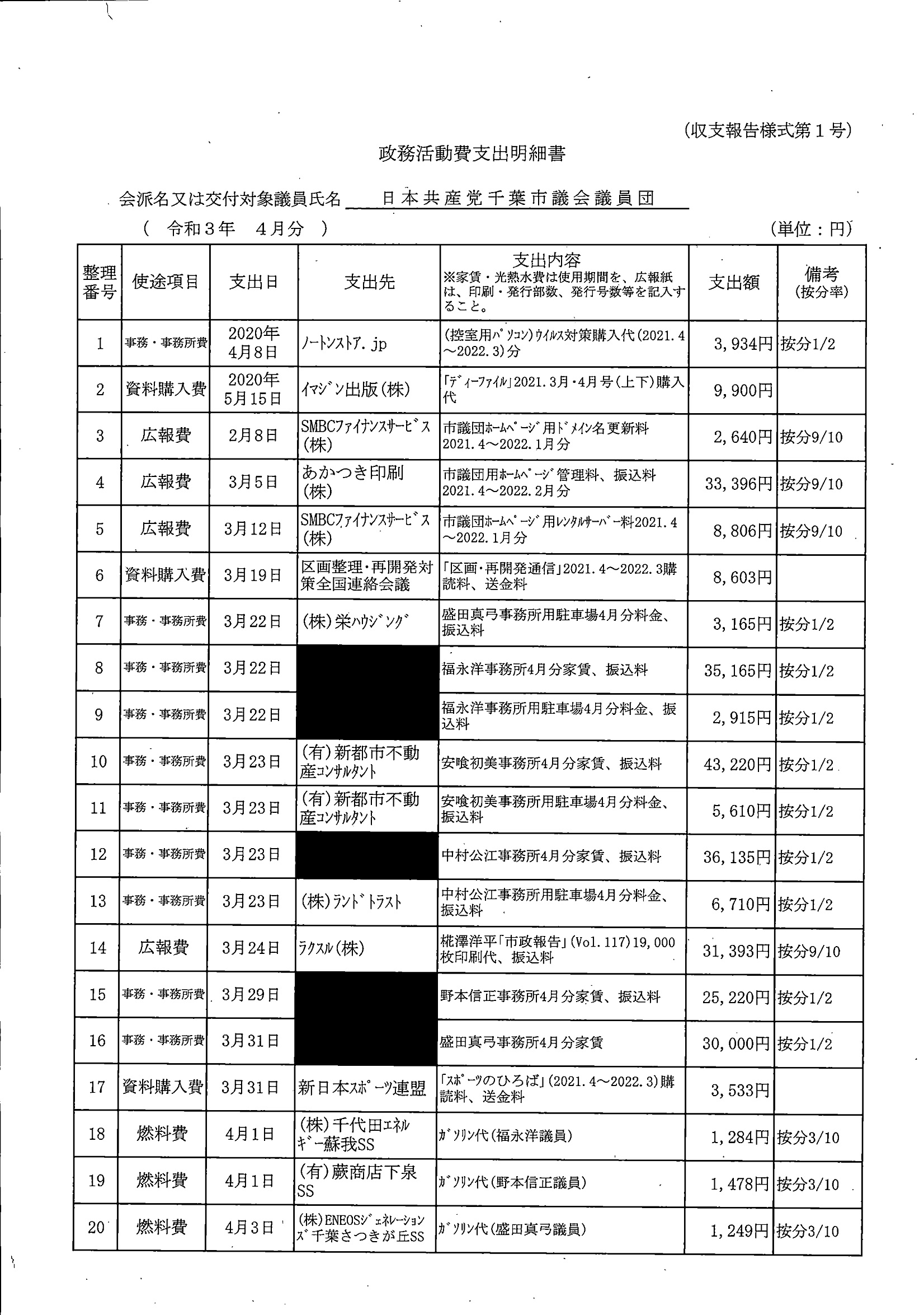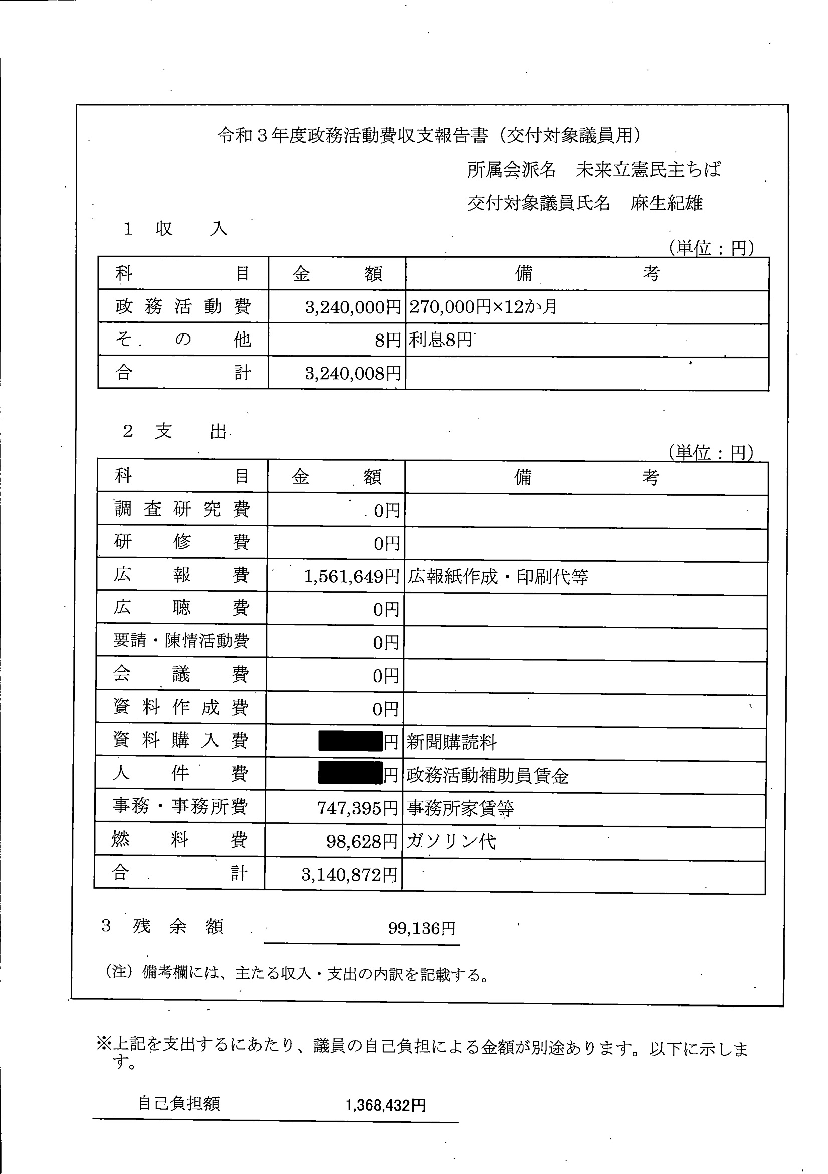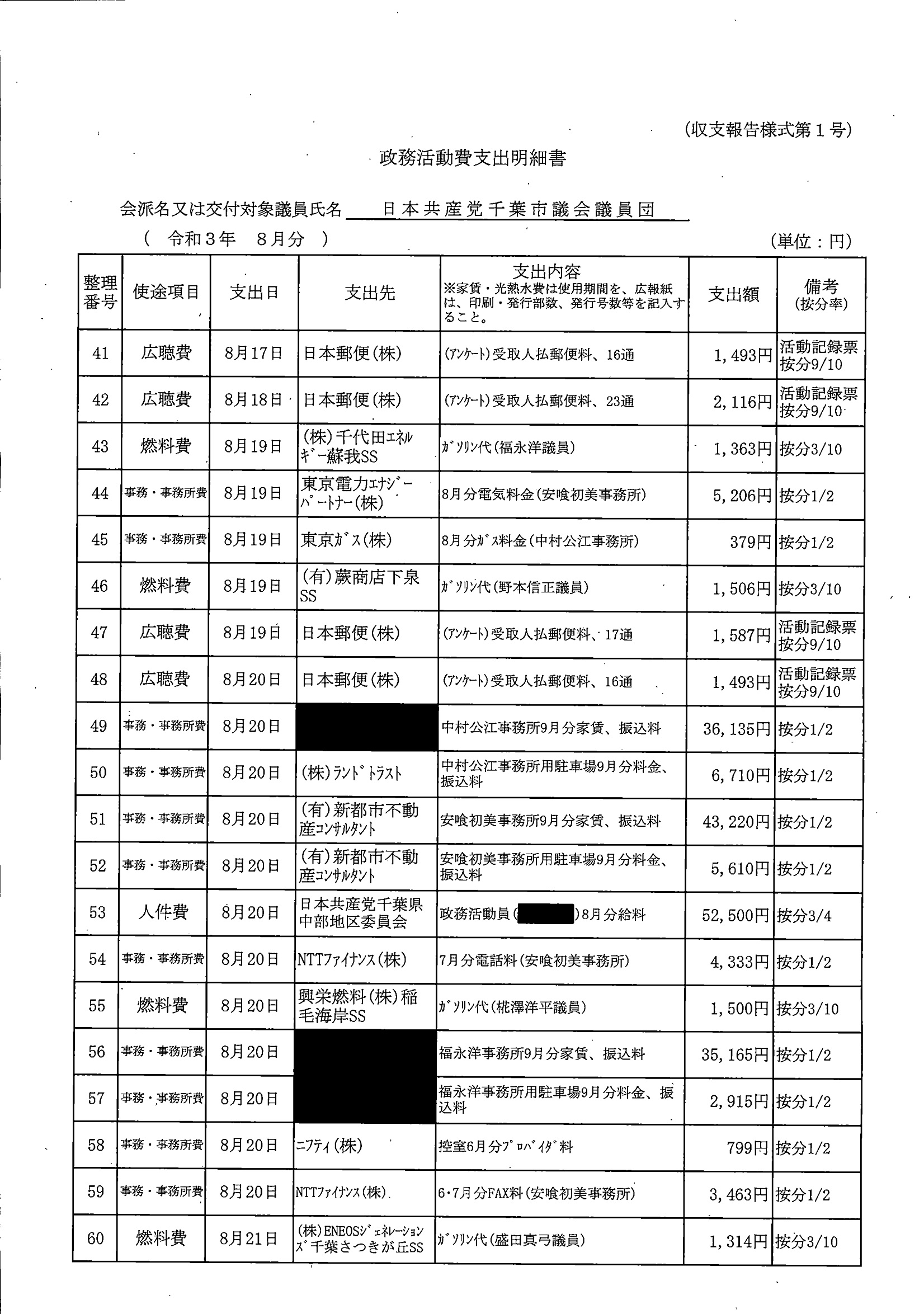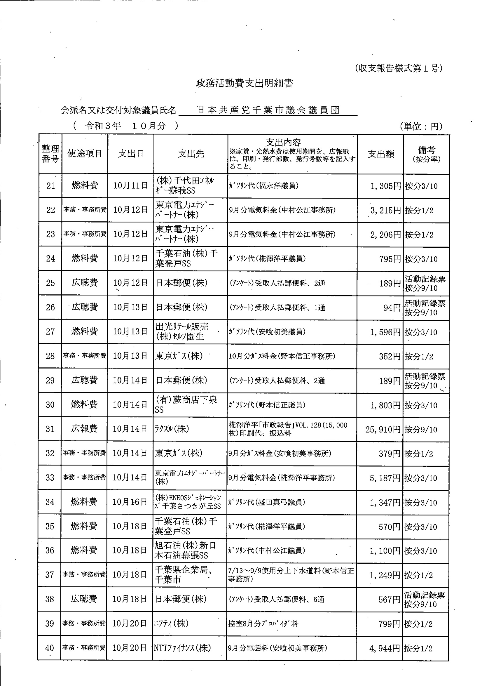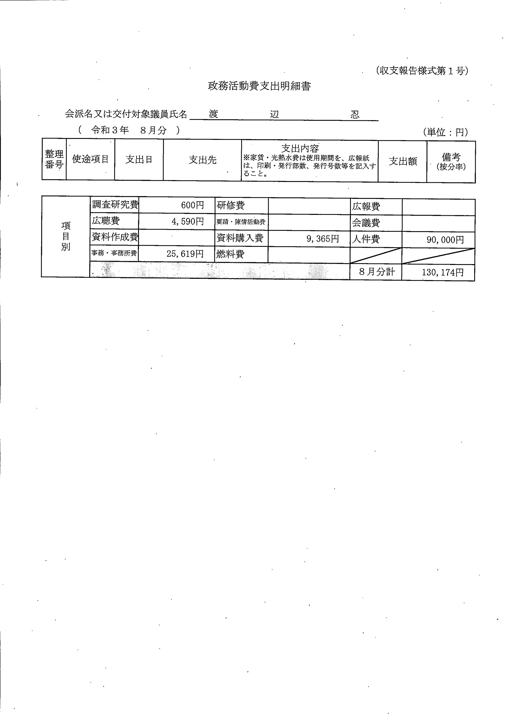 千葉市議会トップページ > 広報・情報公開 > 政務活動費 > 令和3年度交付分(政務活動費収支報告書)