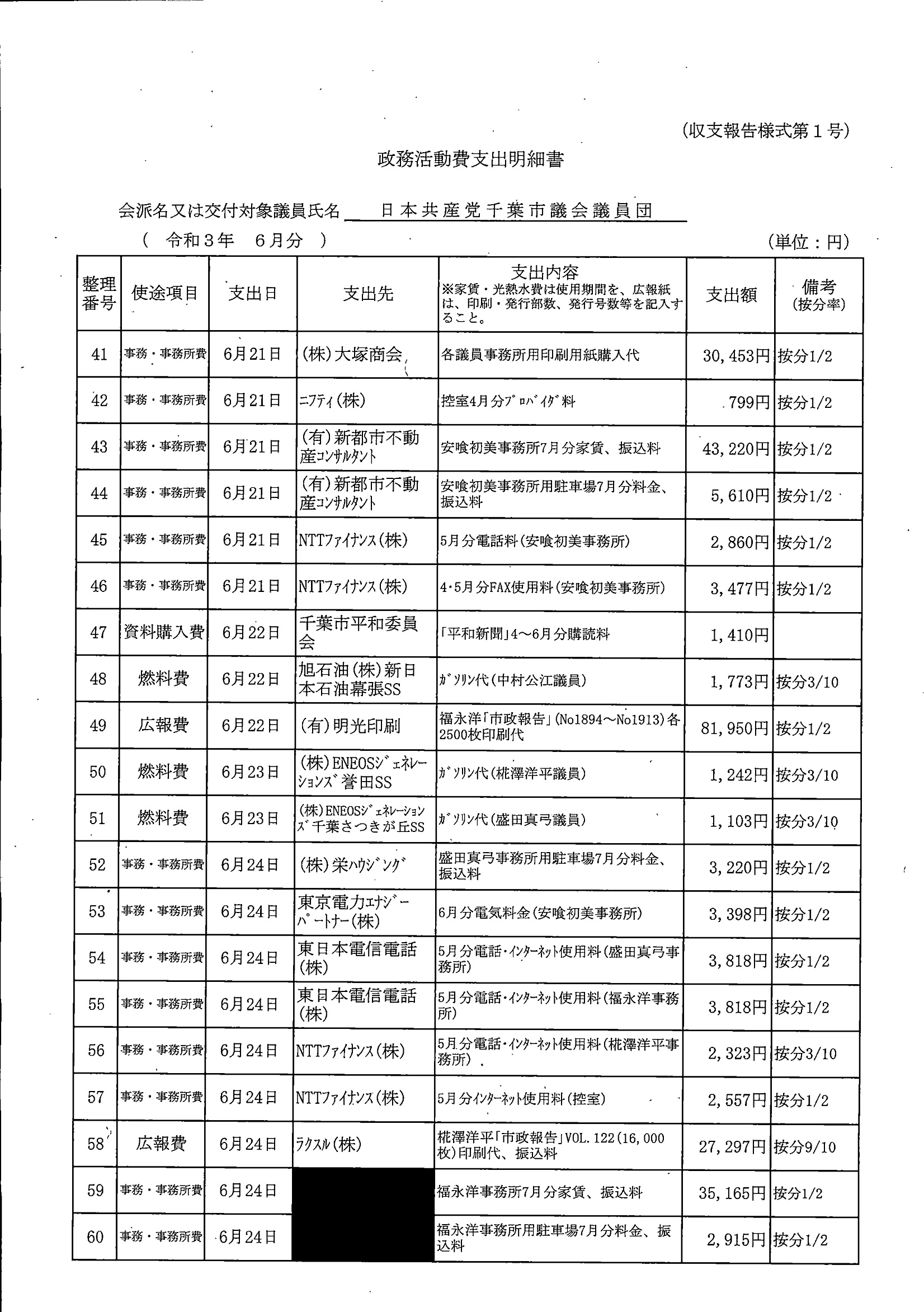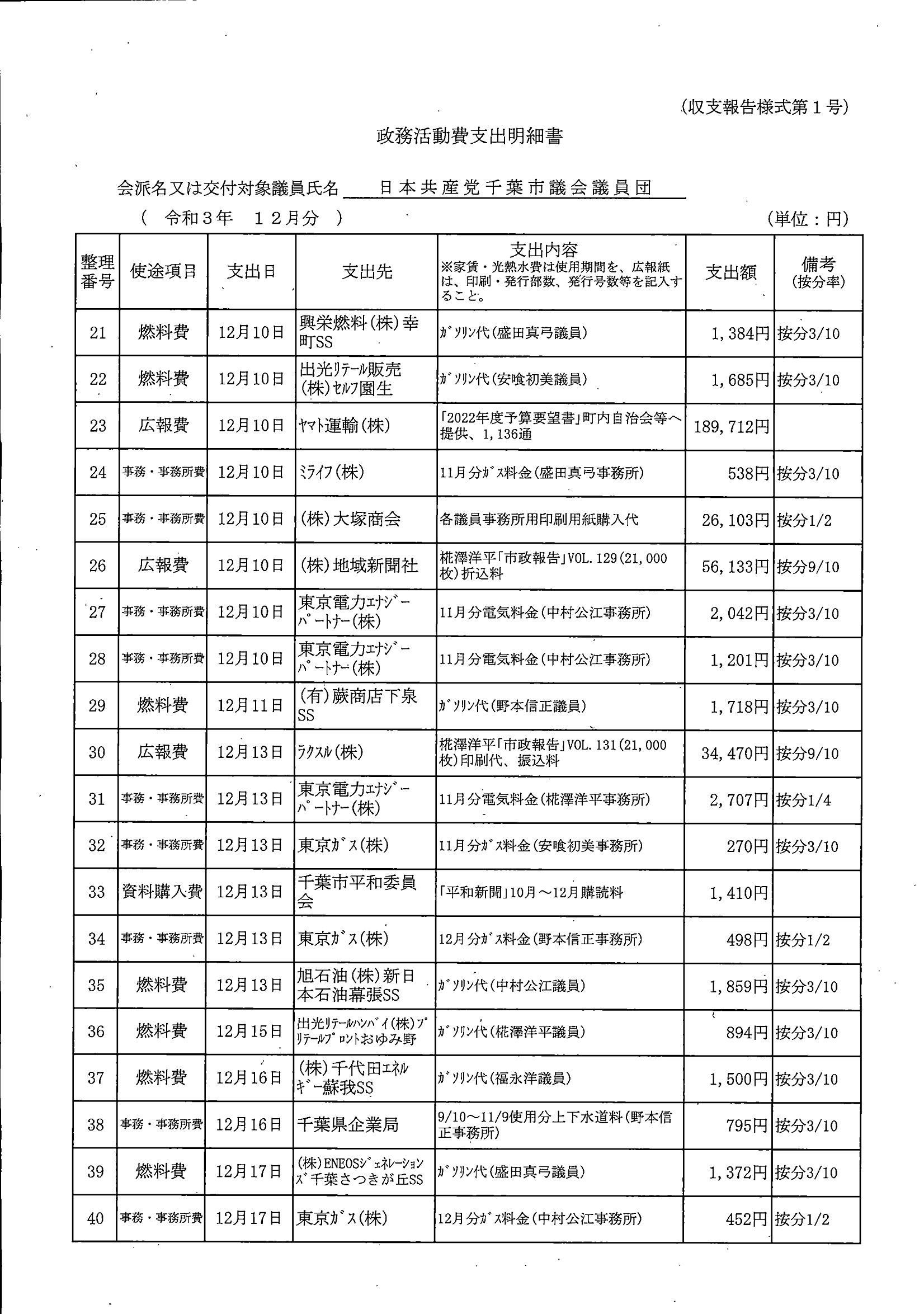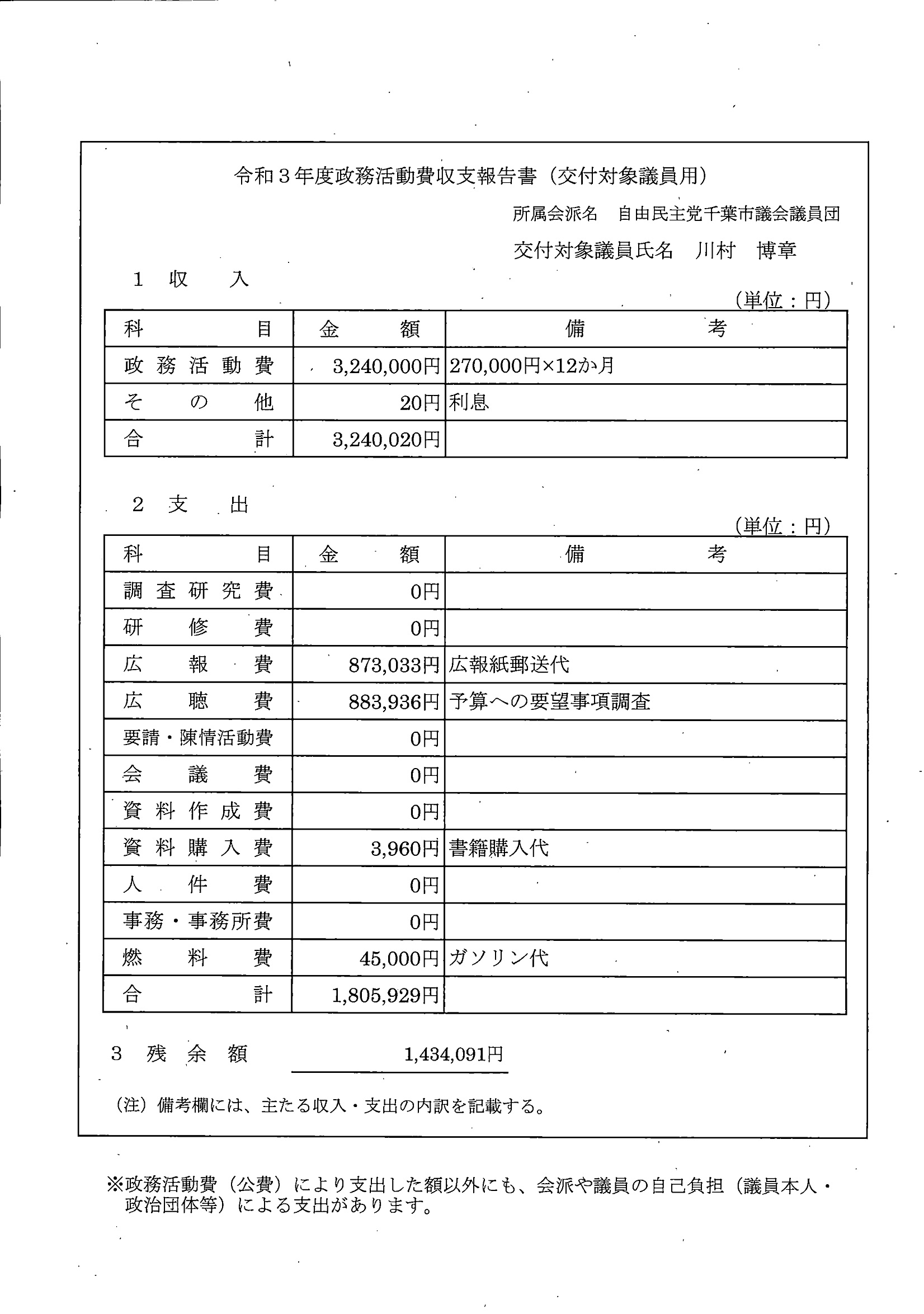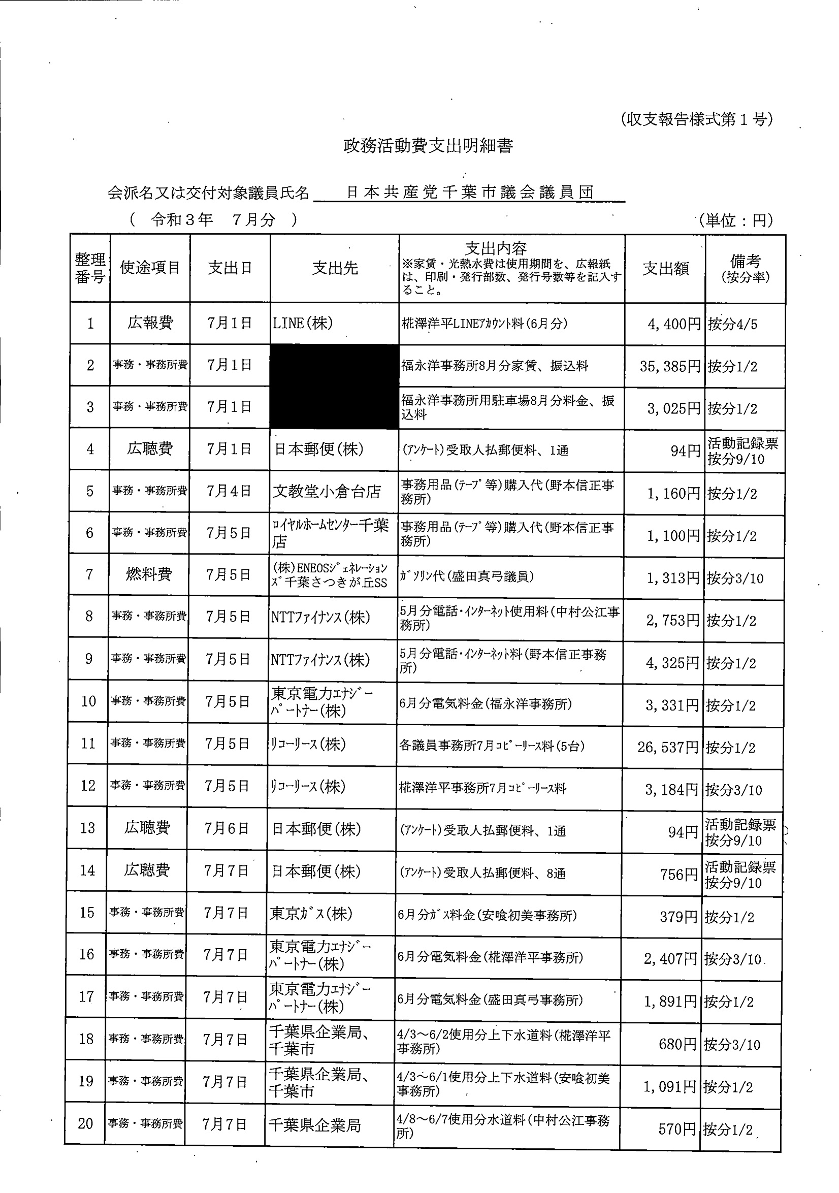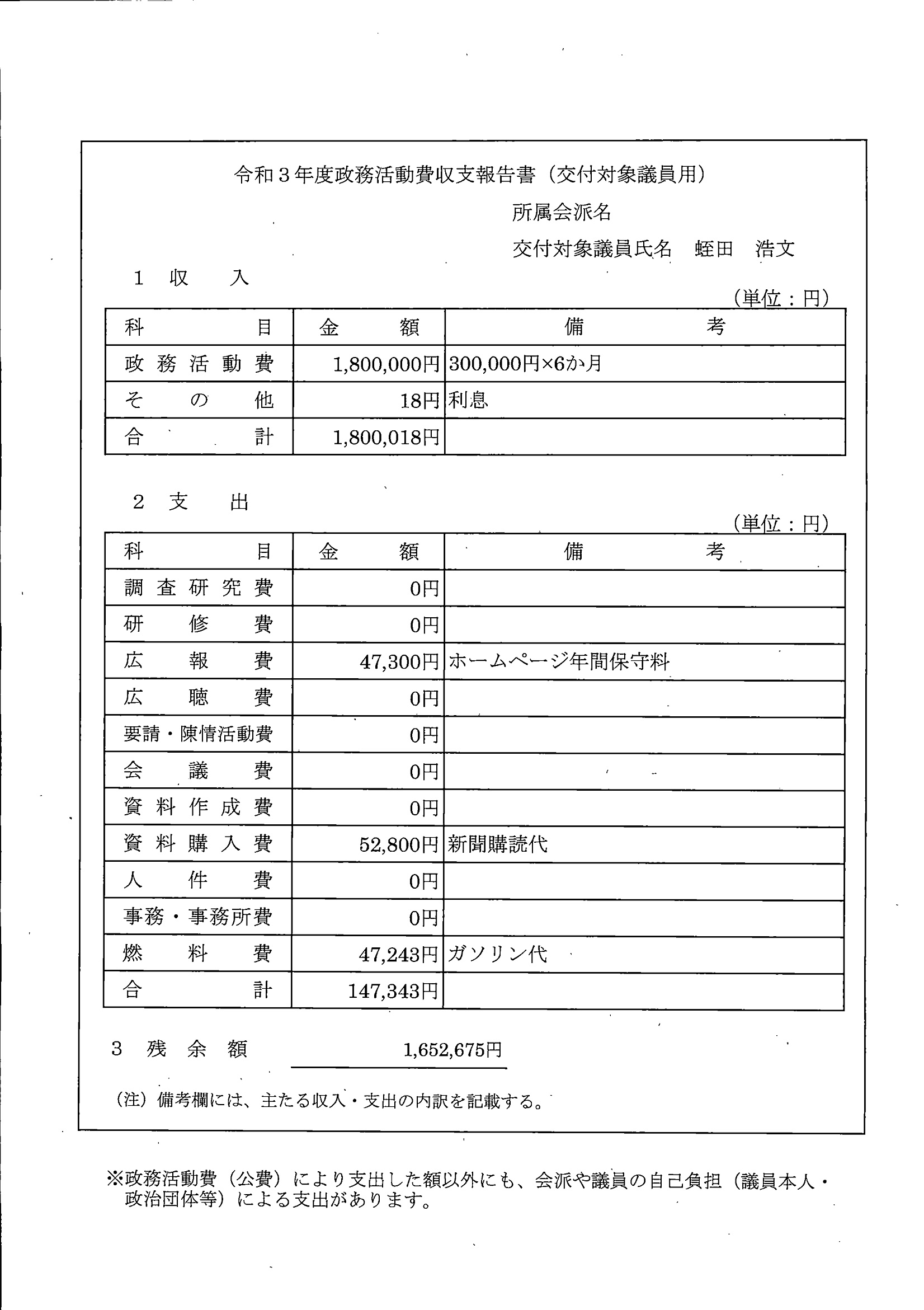 千葉市議会トップページ > 広報・情報公開 > 政務活動費 > 令和3年度交付分(政務活動費収支報告書)