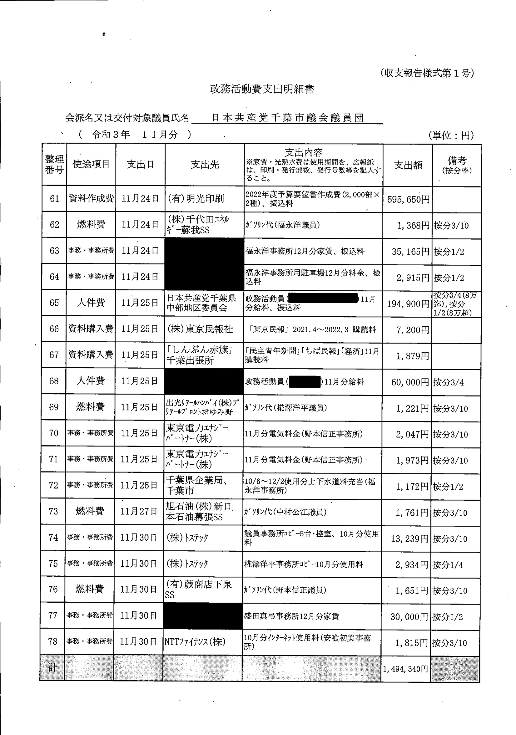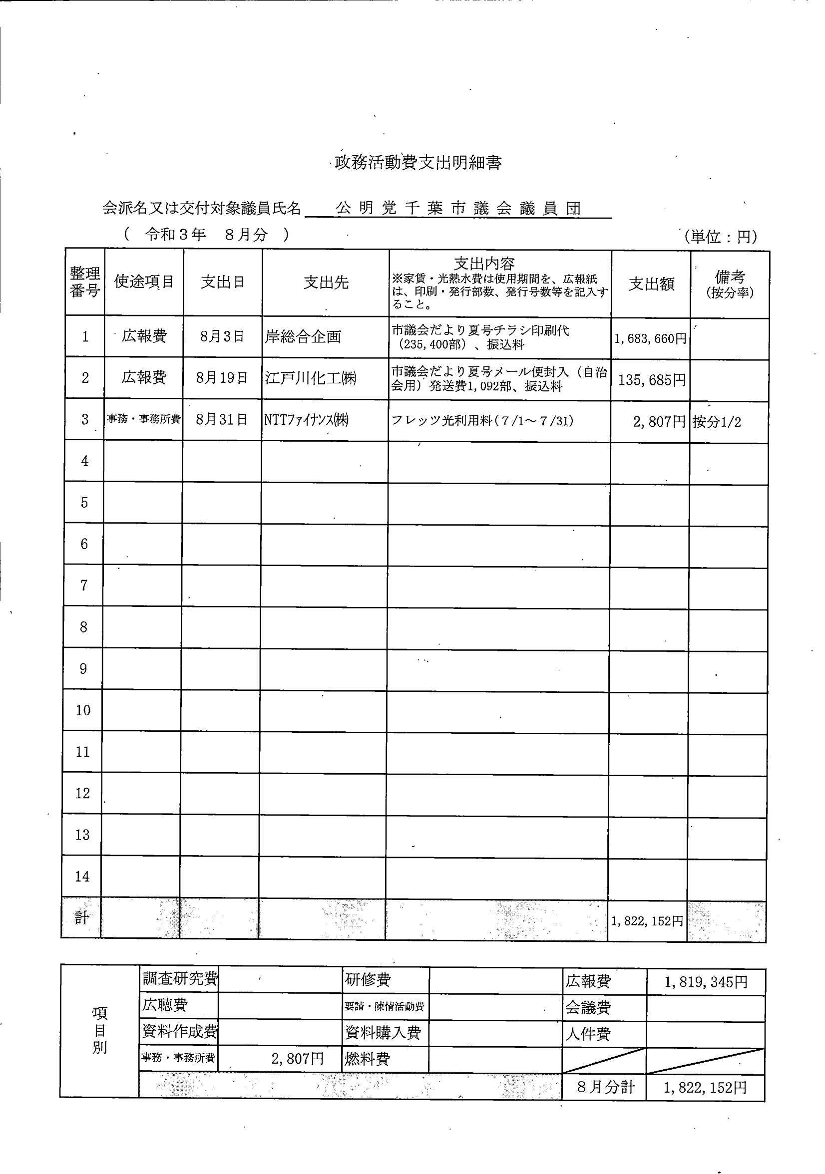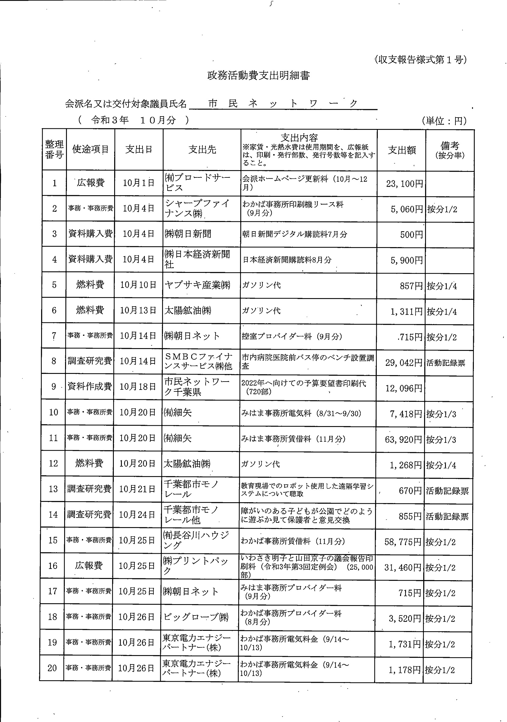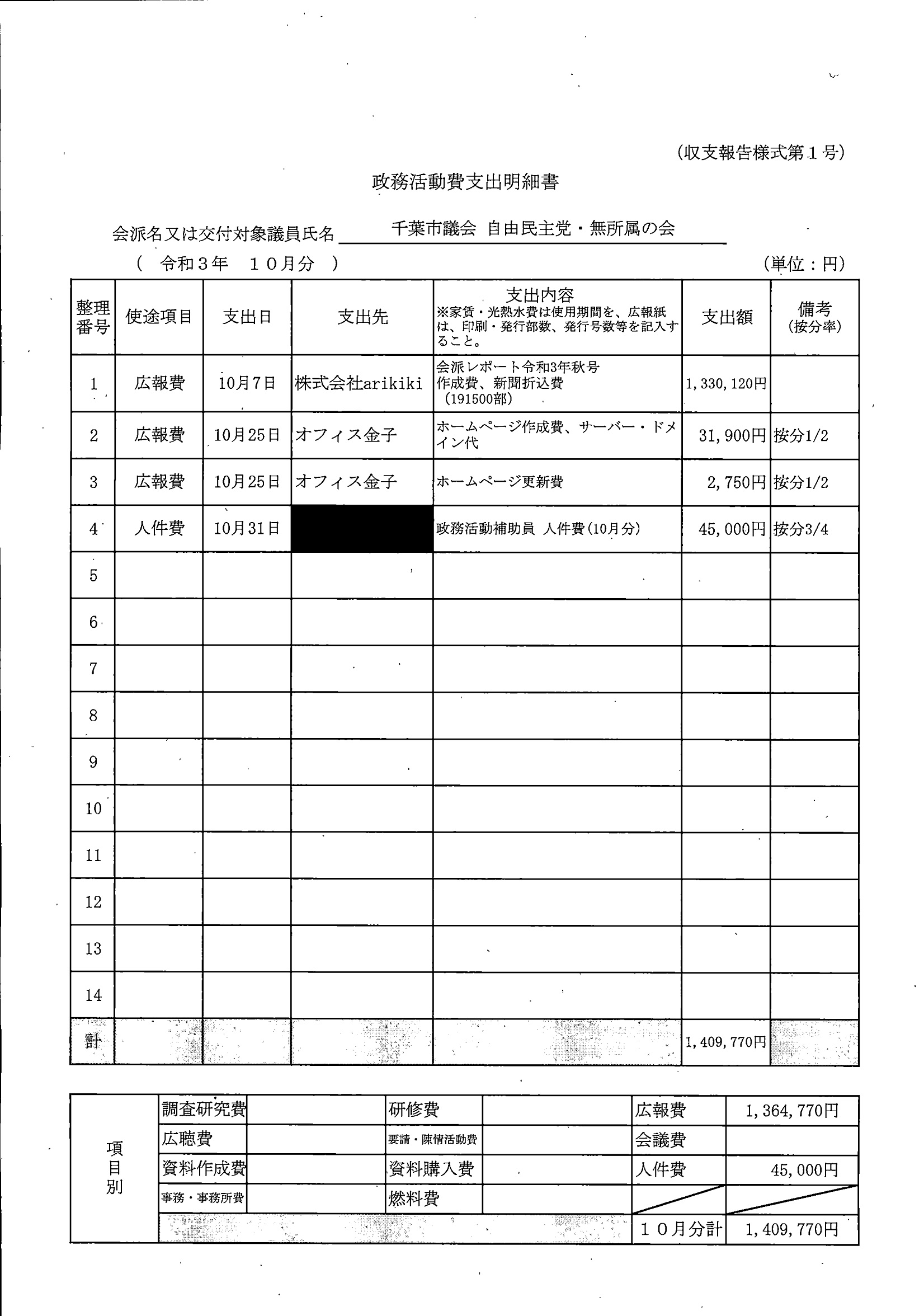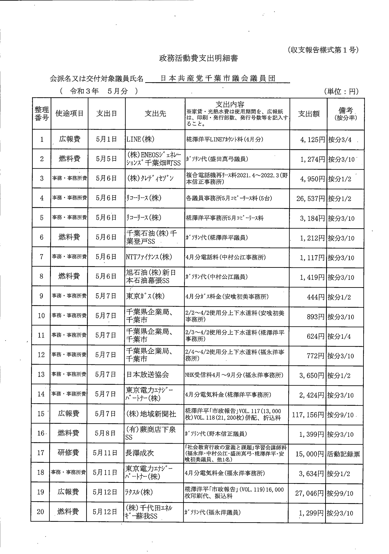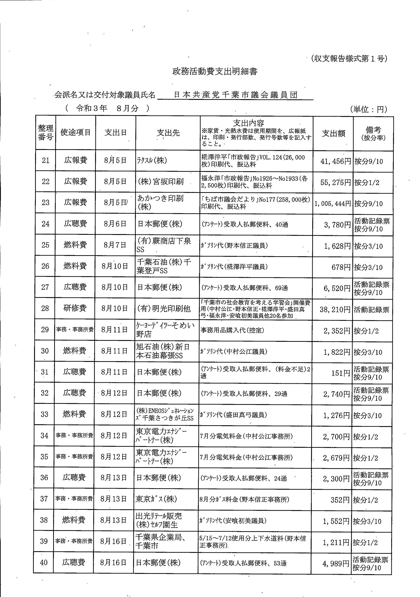 千葉市議会トップページ > 広報・情報公開 > 政務活動費 > 令和3年度交付分(政務活動費収支報告書)