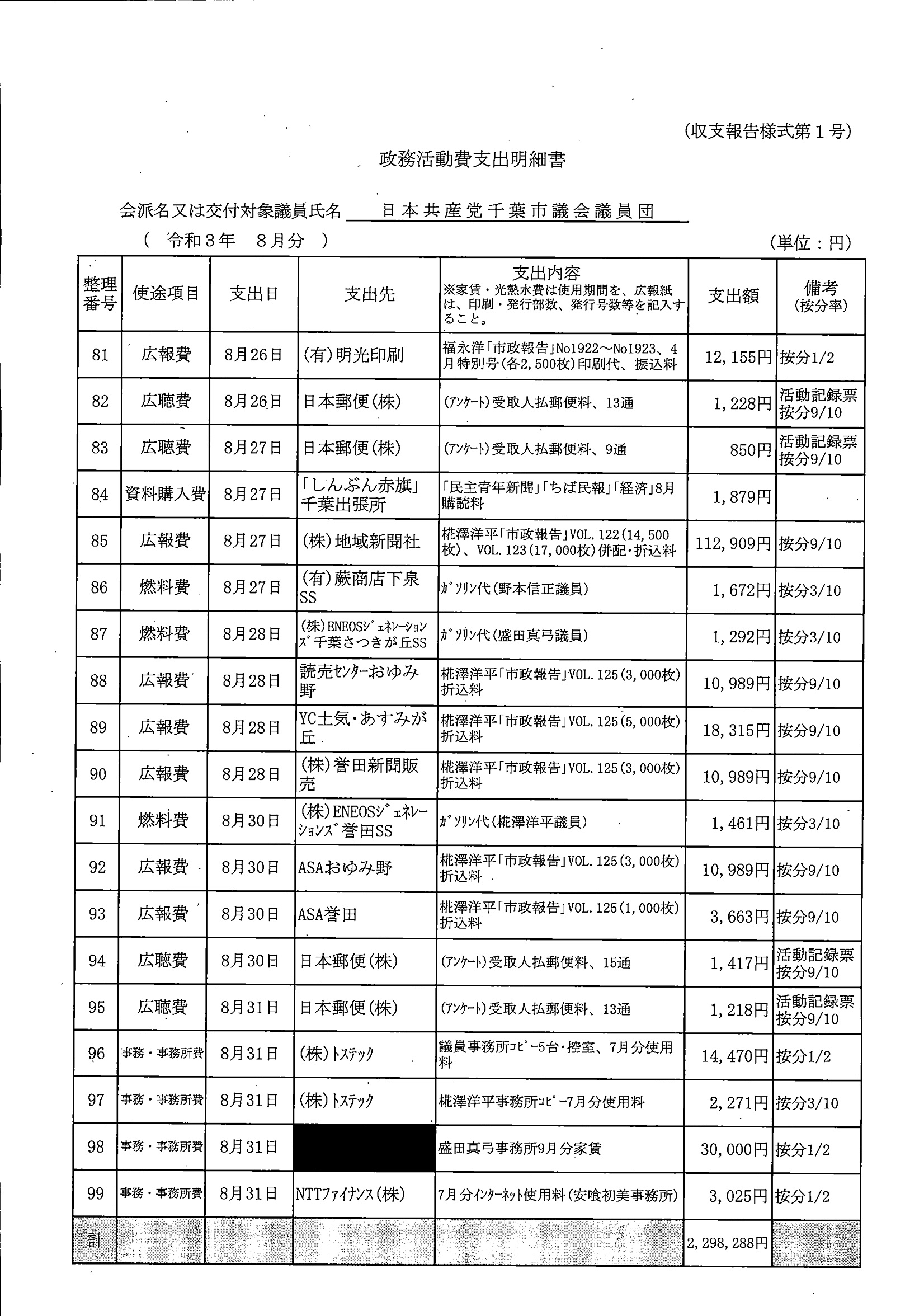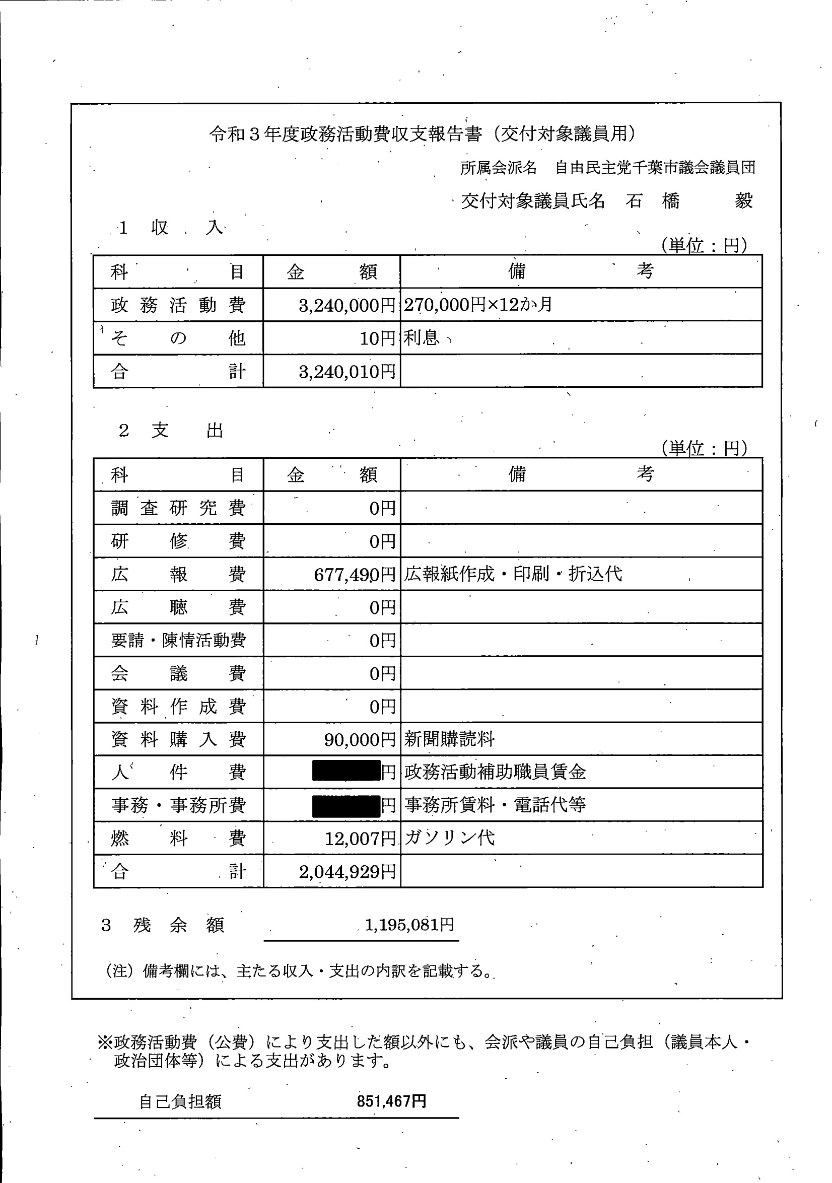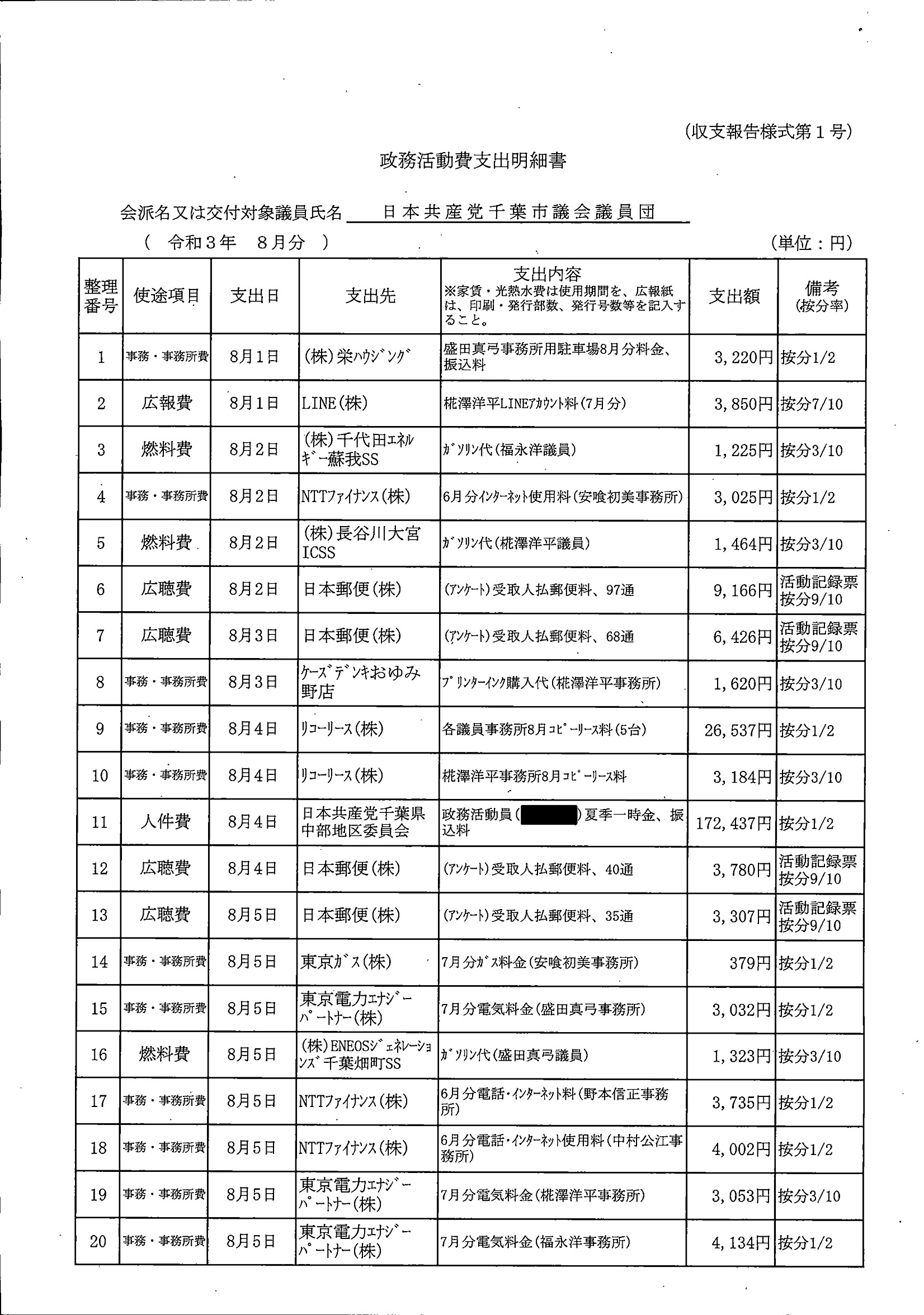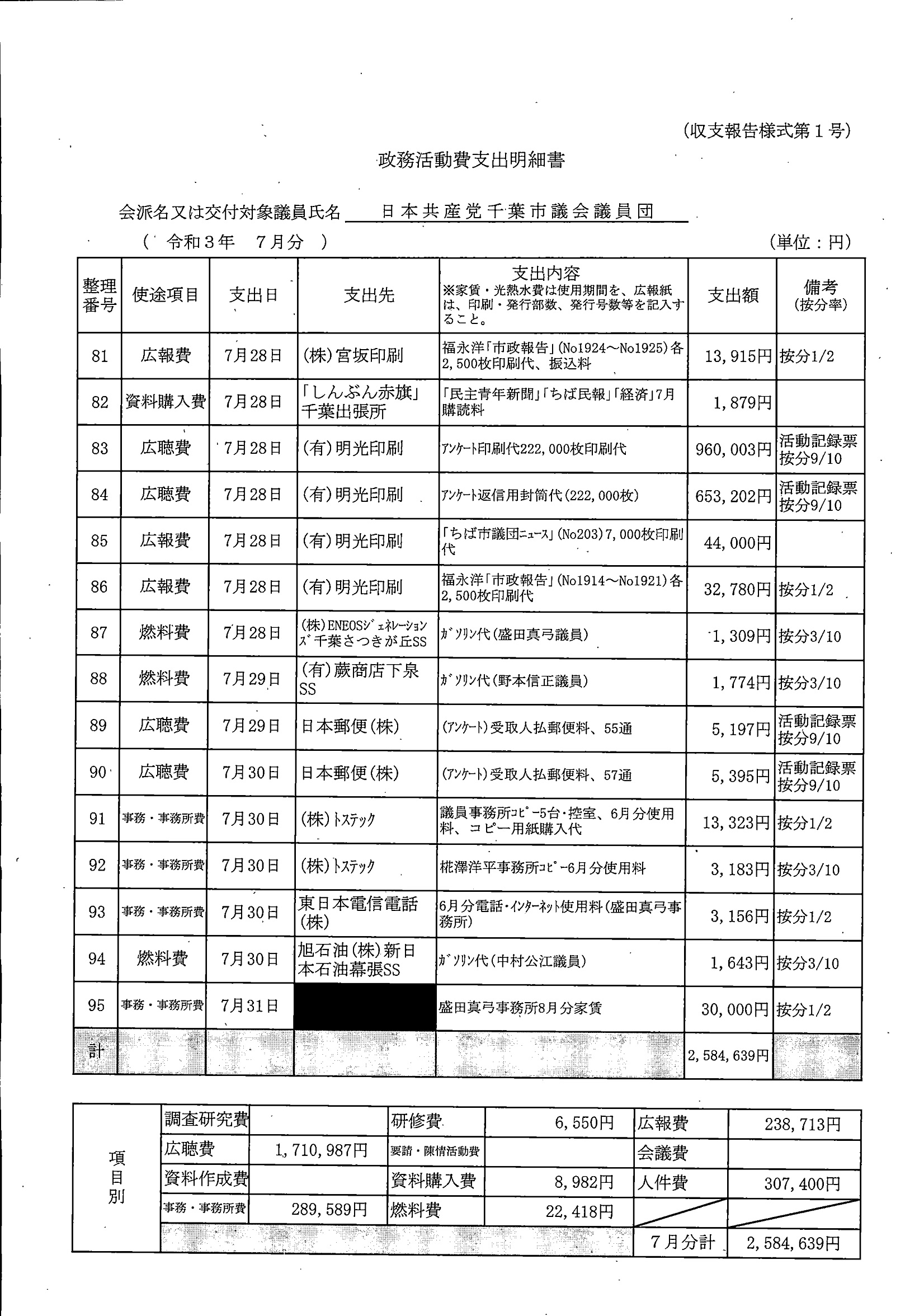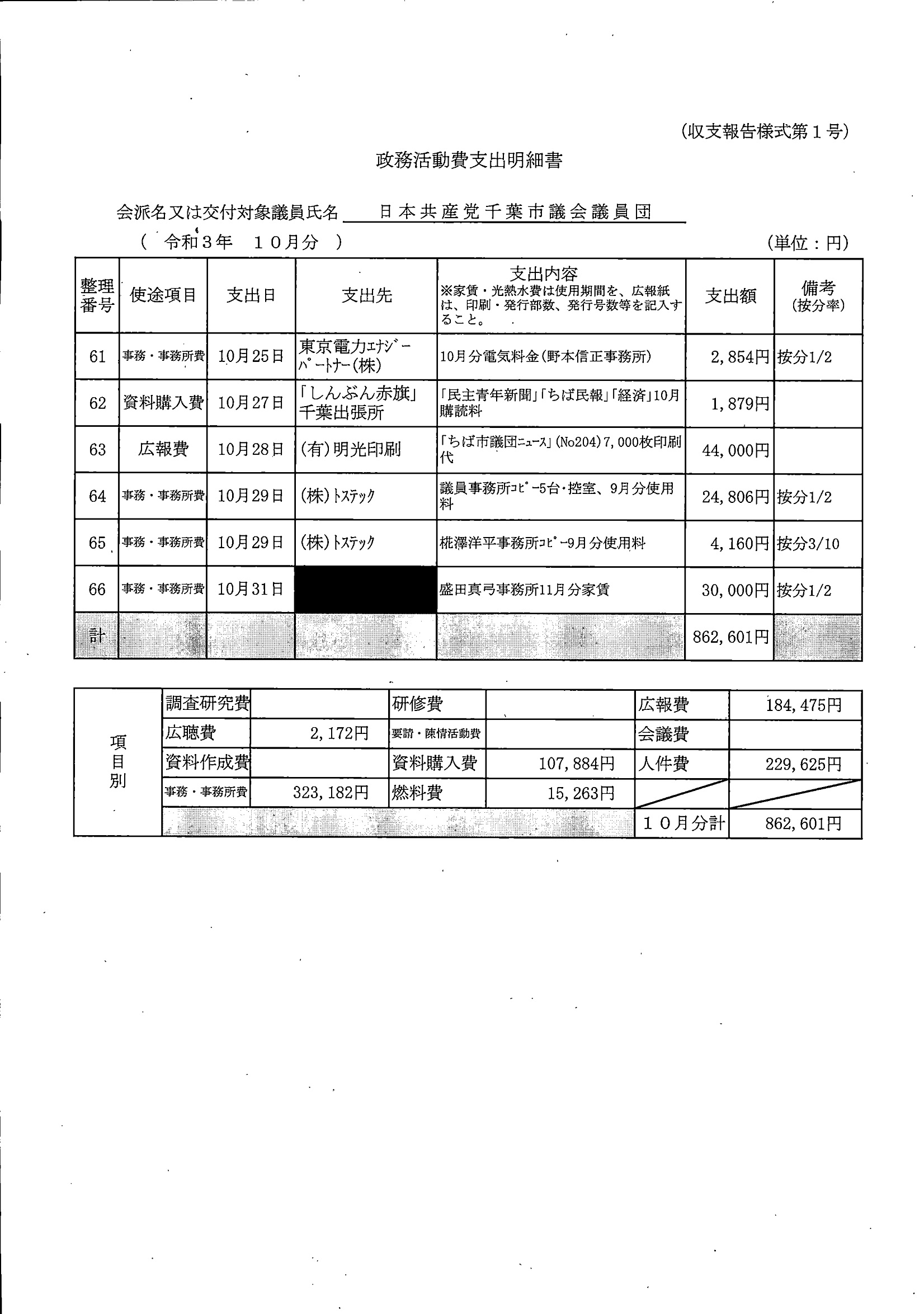 千葉市議会トップページ > 広報・情報公開 > 政務活動費 > 令和3年度交付分(政務活動費収支報告書)