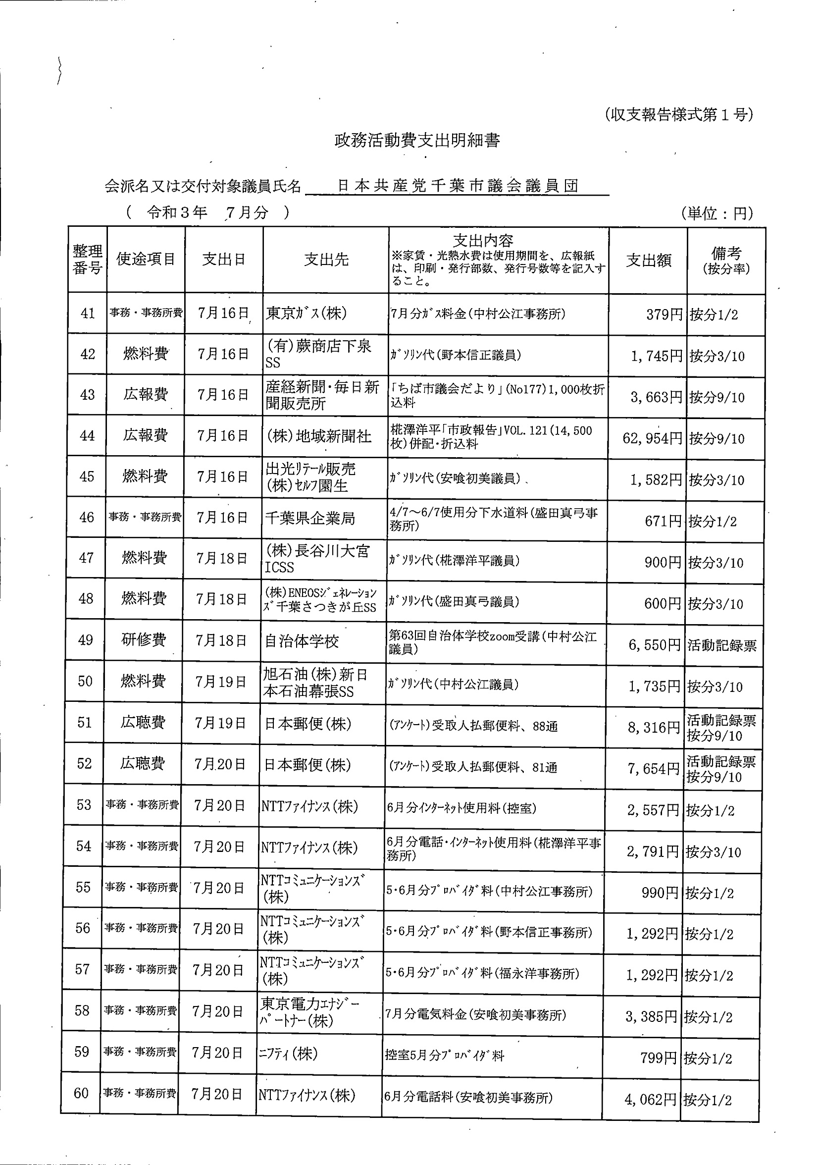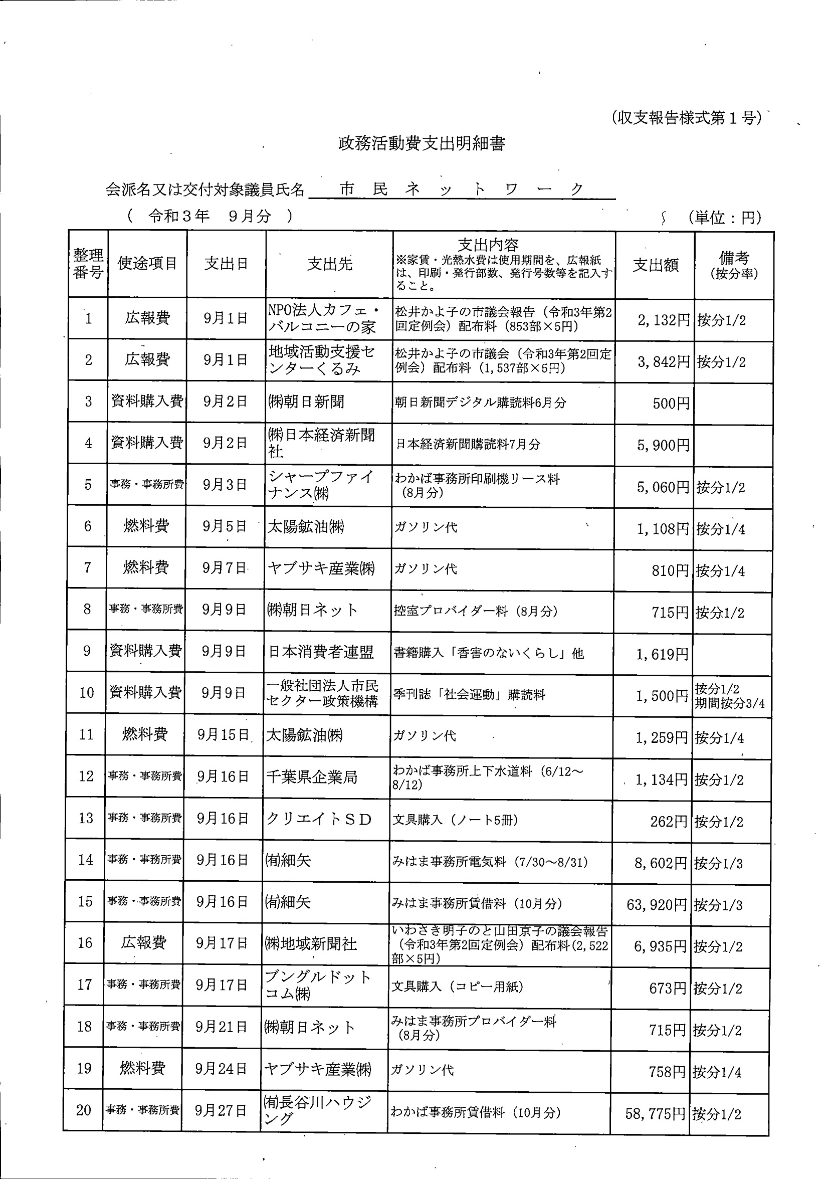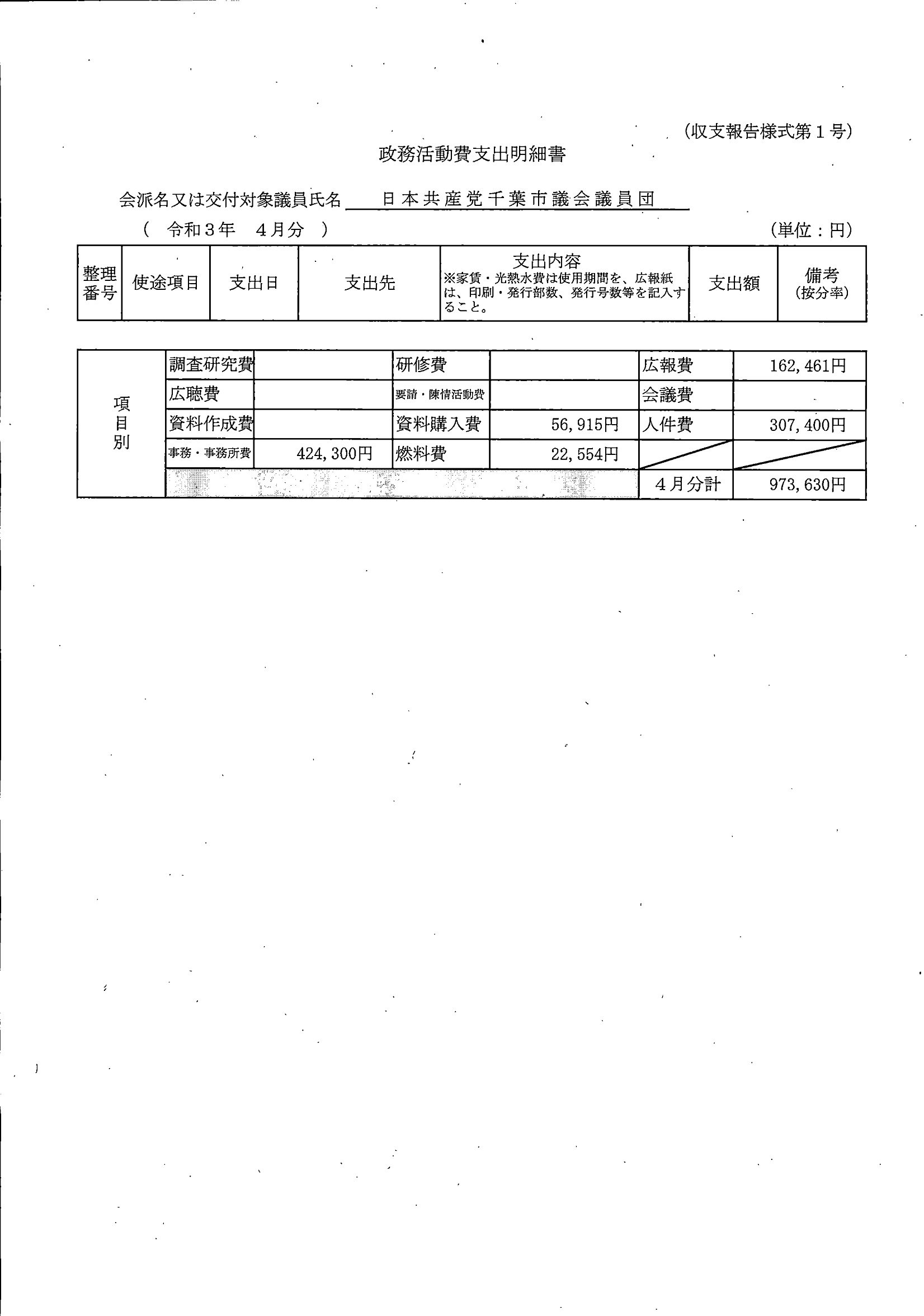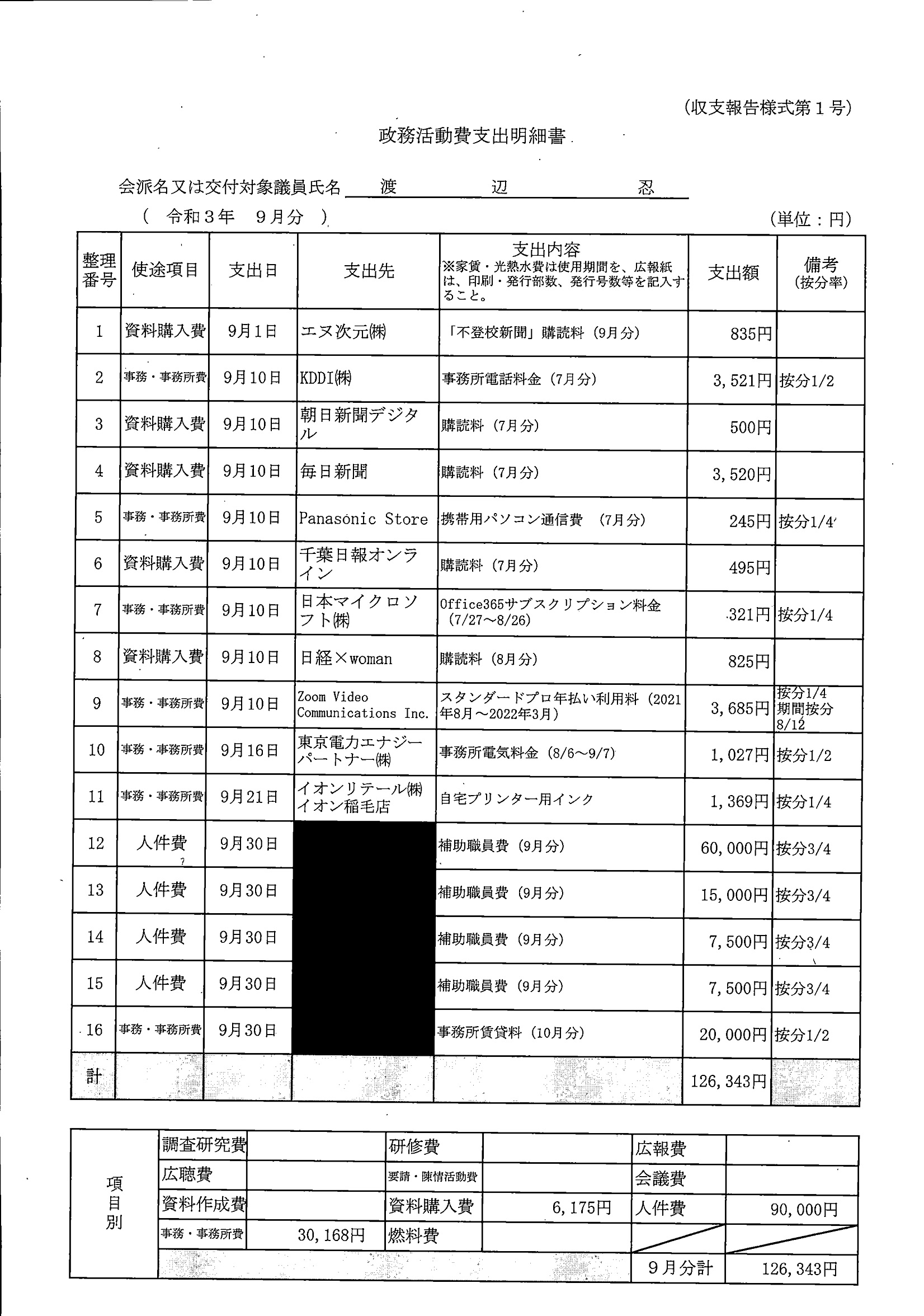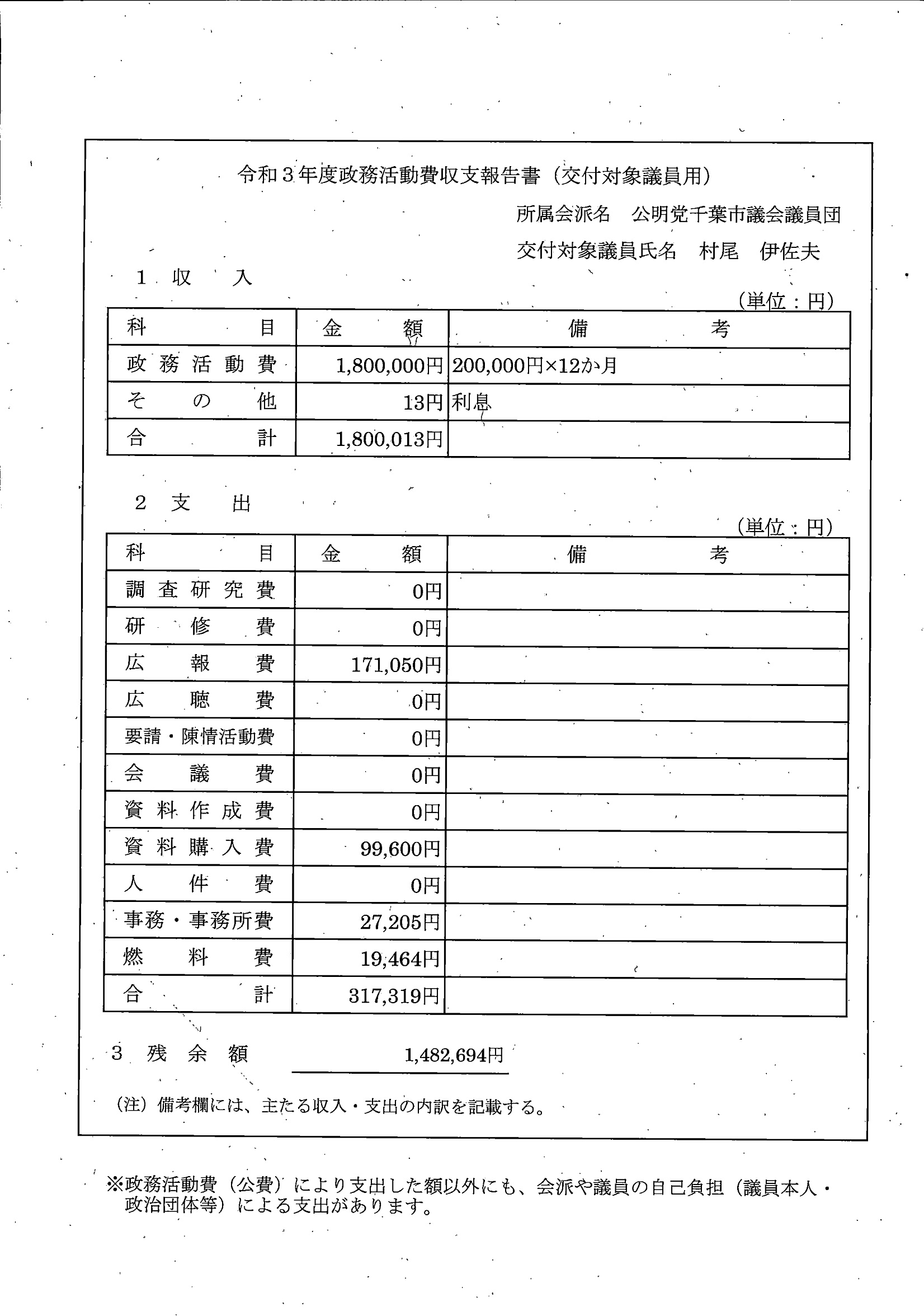 千葉市議会トップページ > 広報・情報公開 > 政務活動費 > 令和3年度交付分(政務活動費収支報告書)