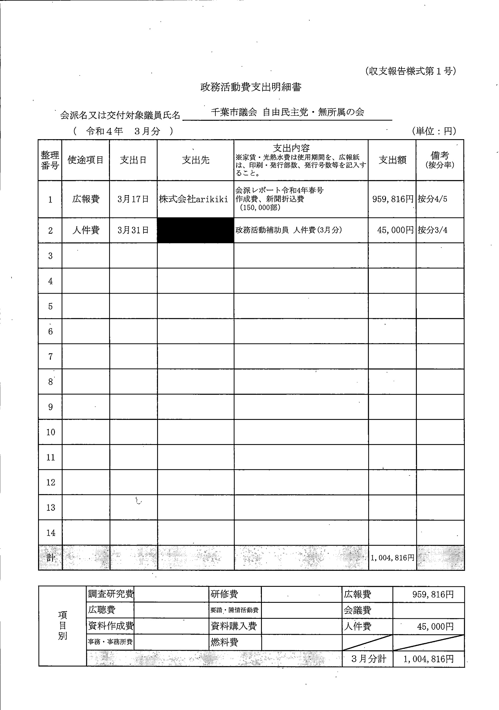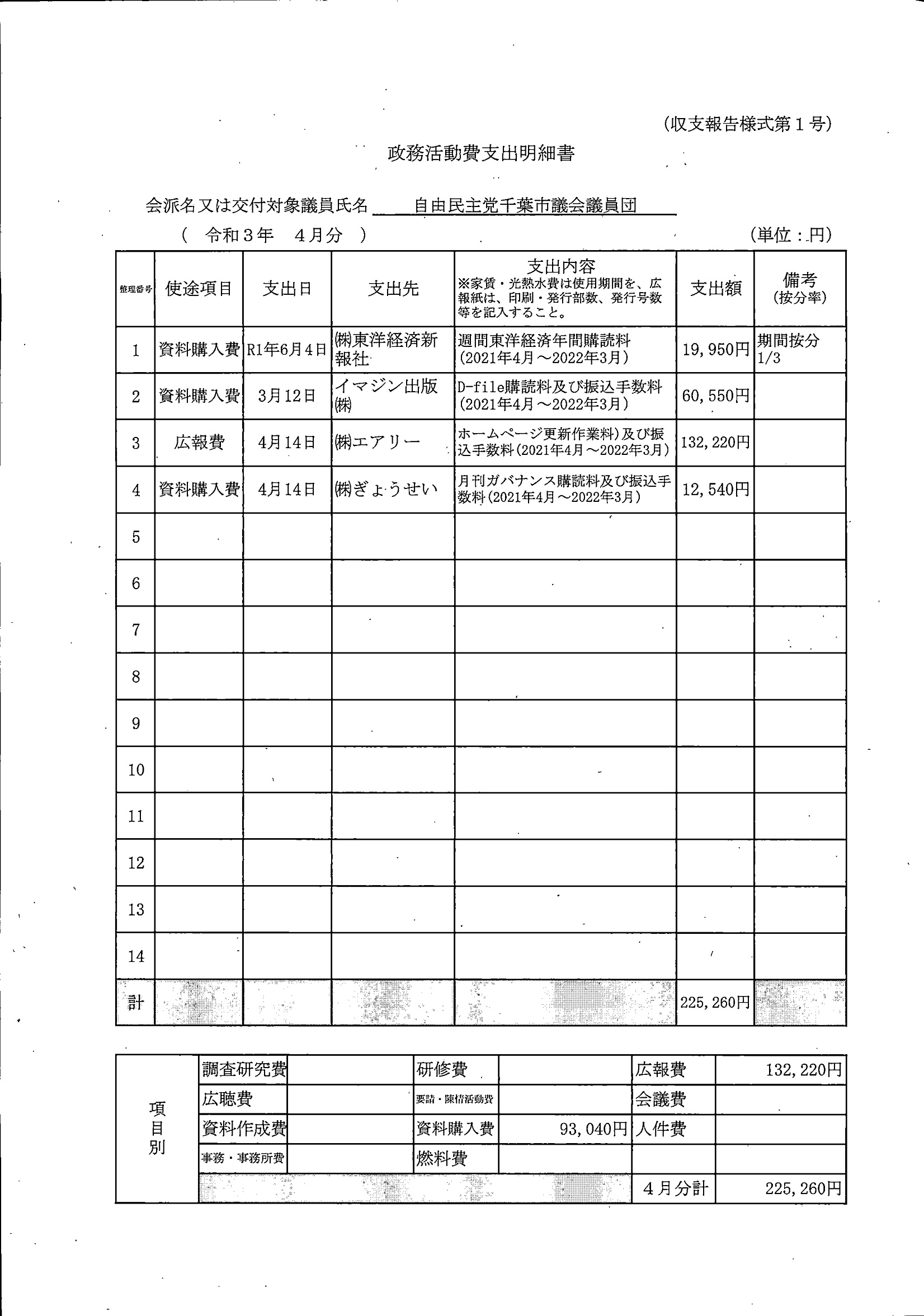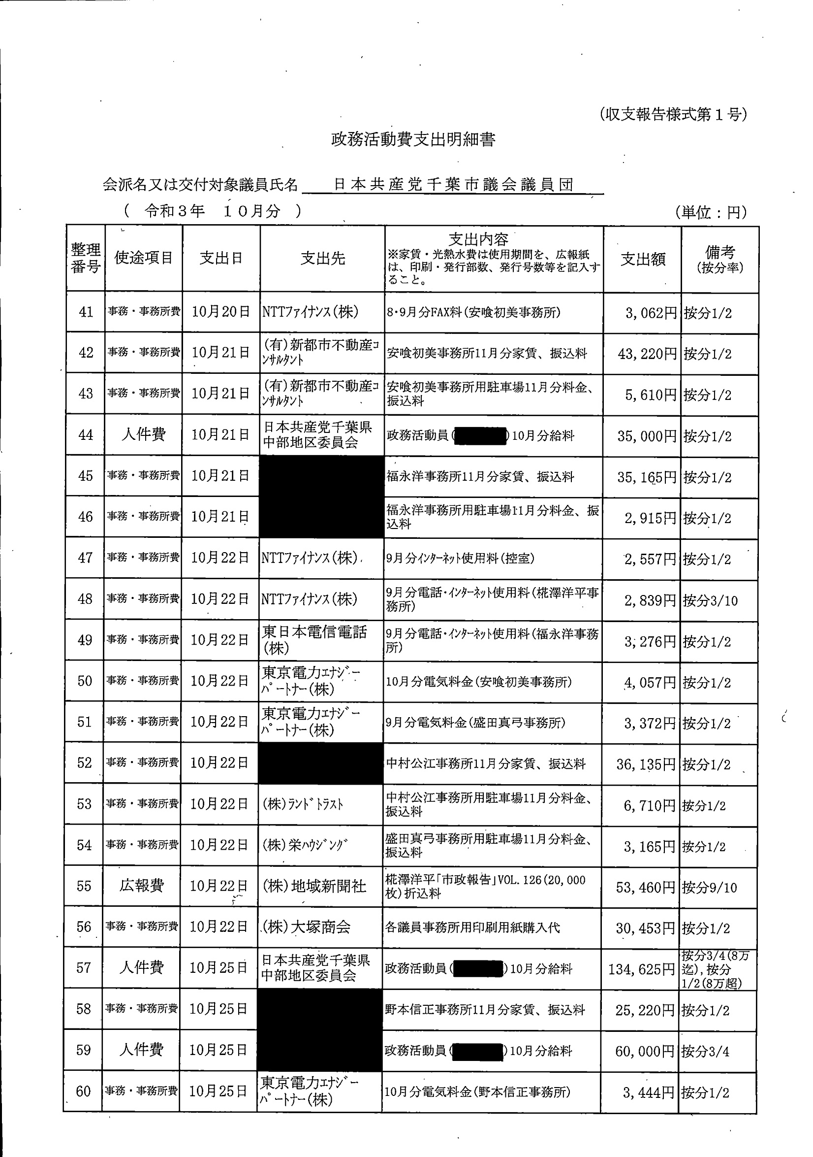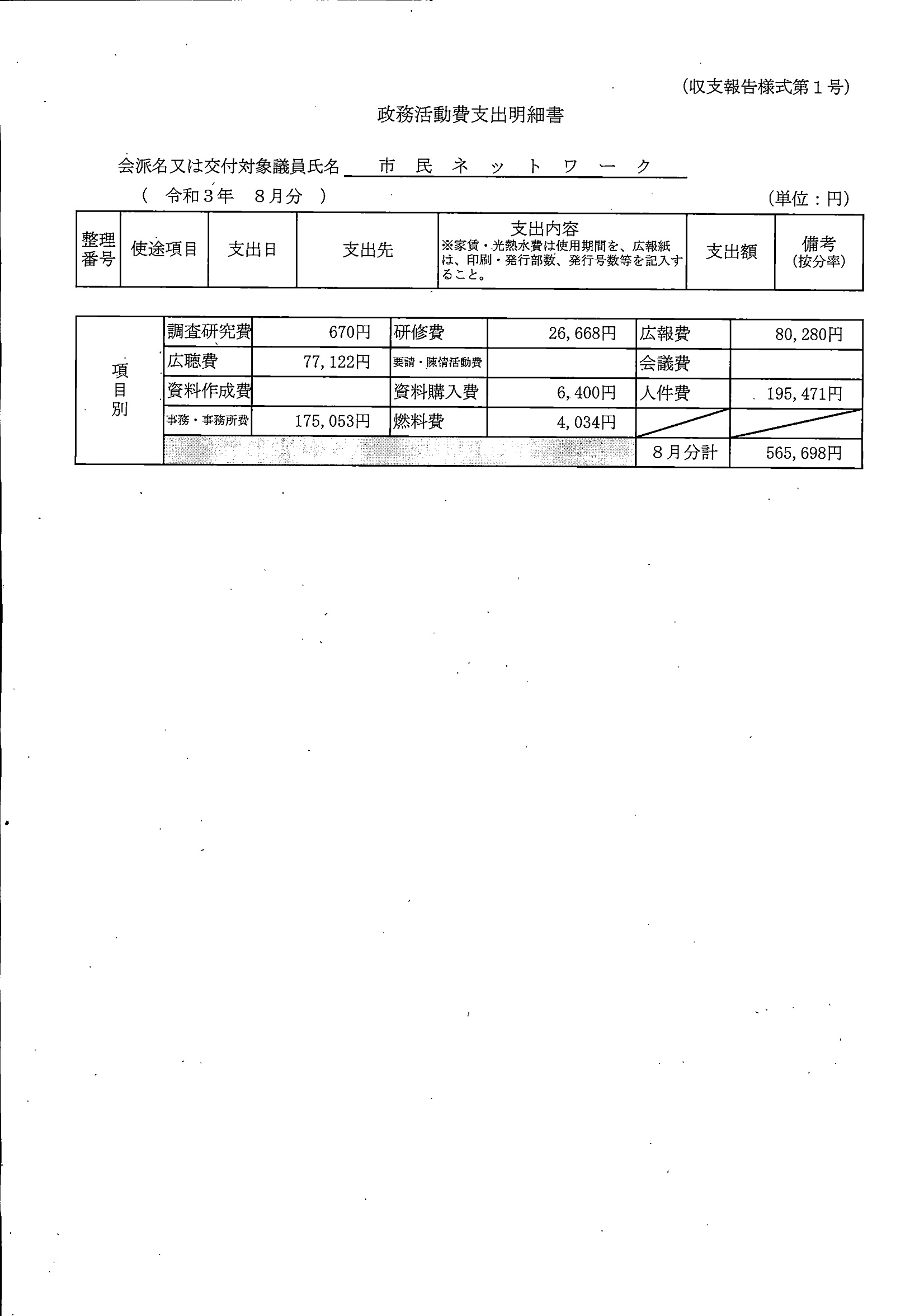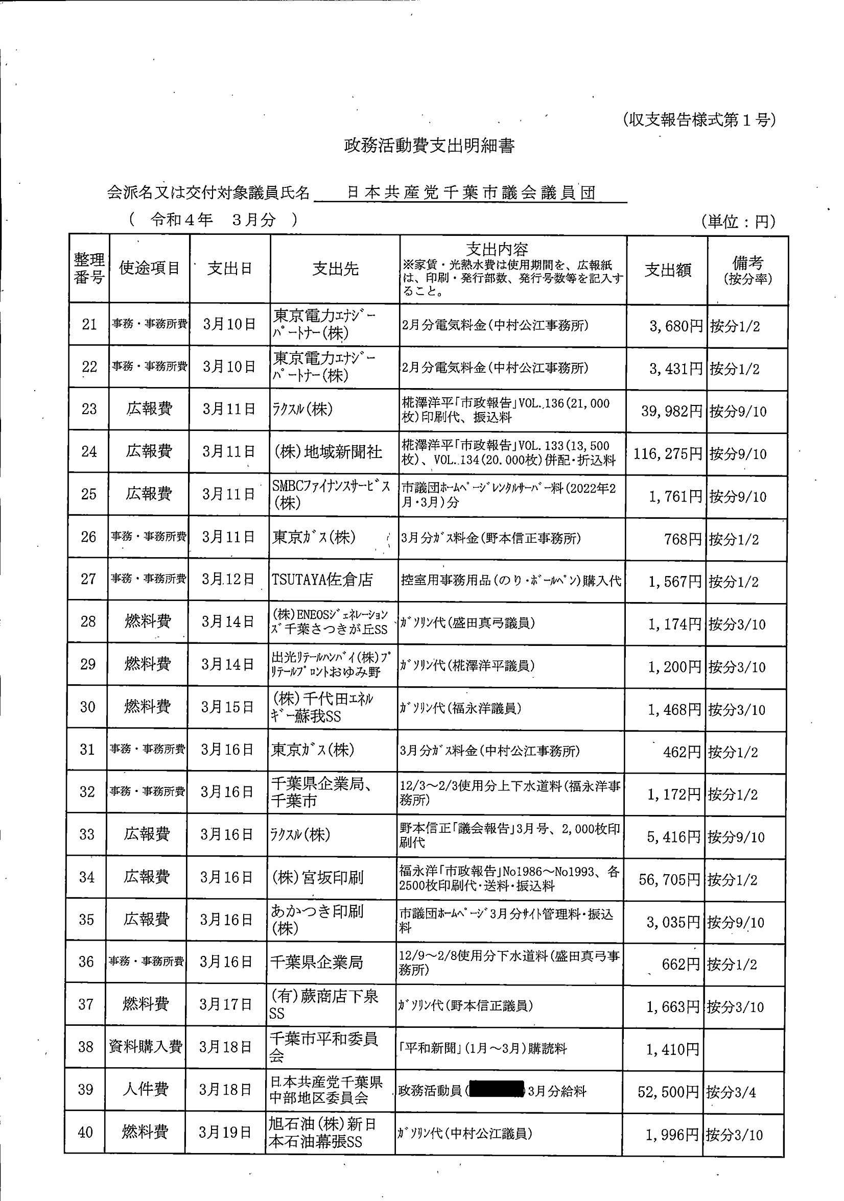 千葉市議会トップページ > 広報・情報公開 > 政務活動費 > 令和3年度交付分(政務活動費収支報告書)