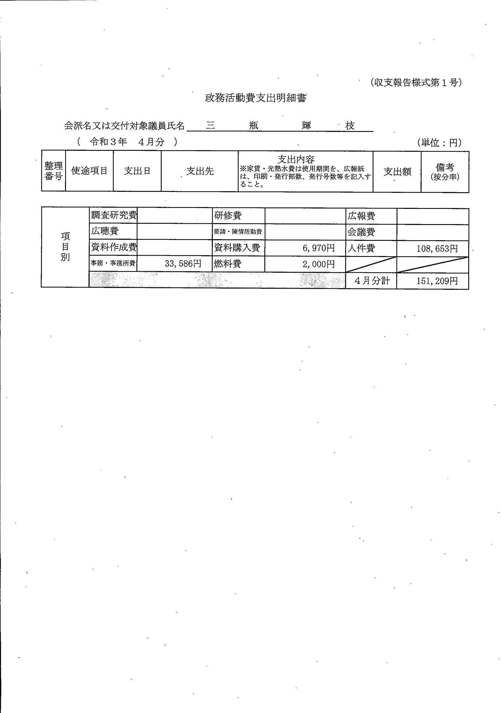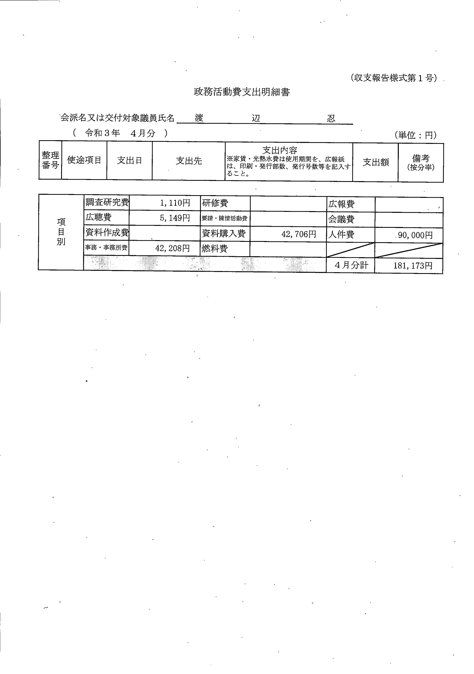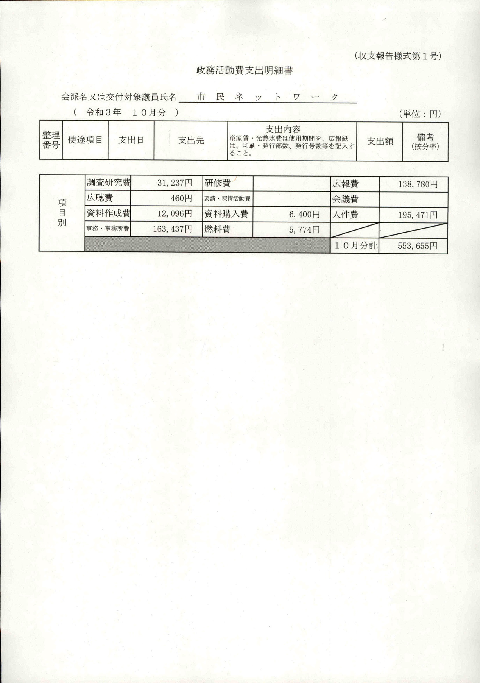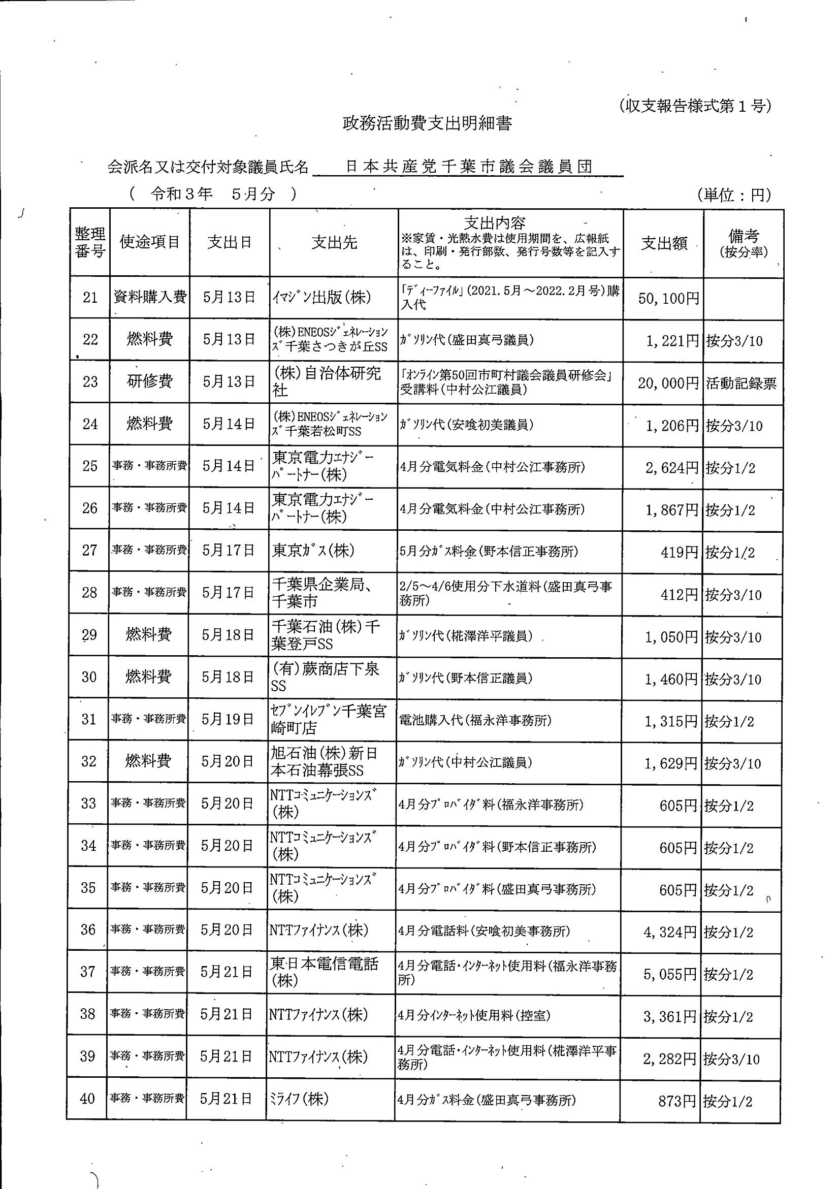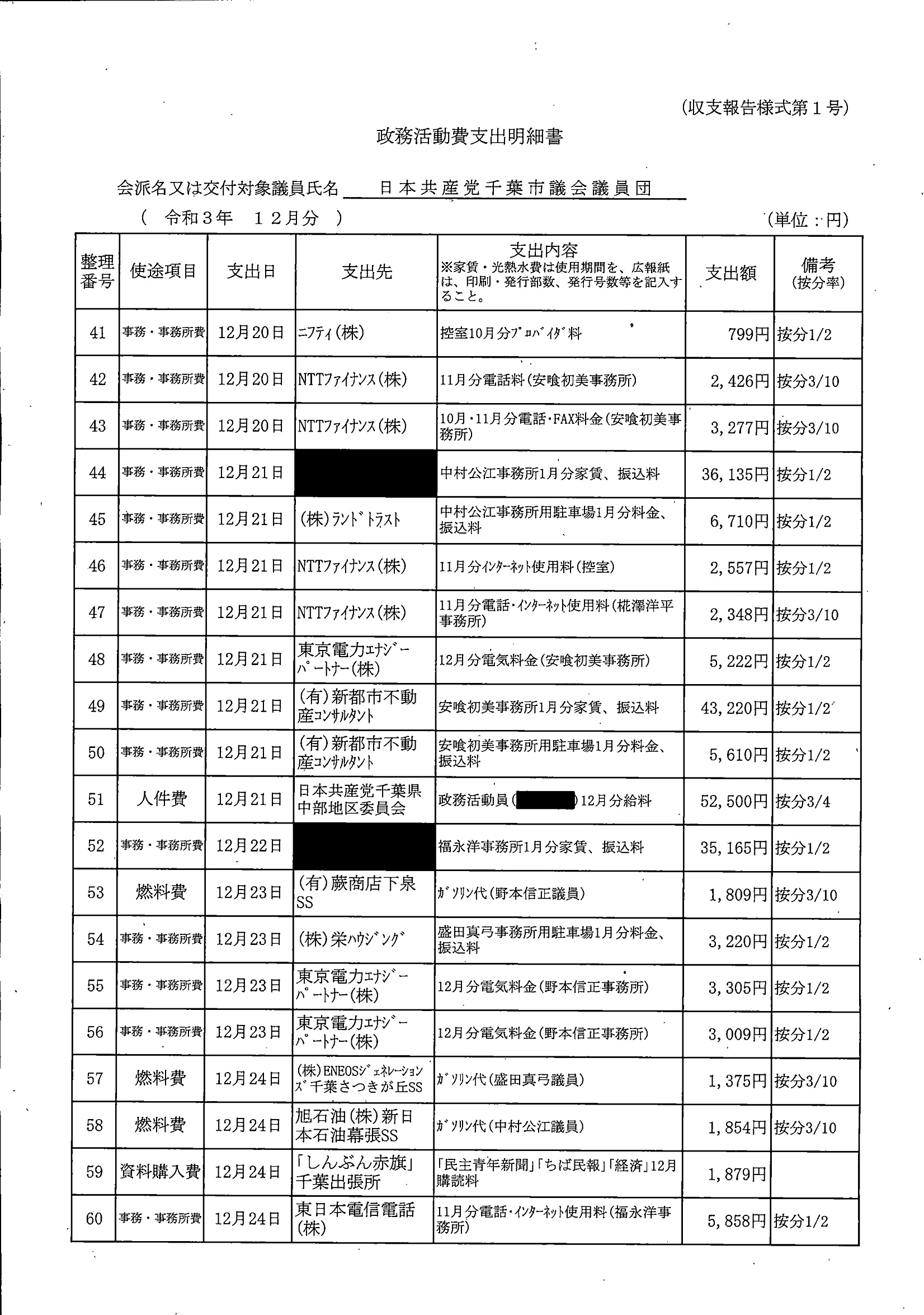 千葉市議会トップページ > 広報・情報公開 > 政務活動費 > 令和3年度交付分(政務活動費収支報告書)