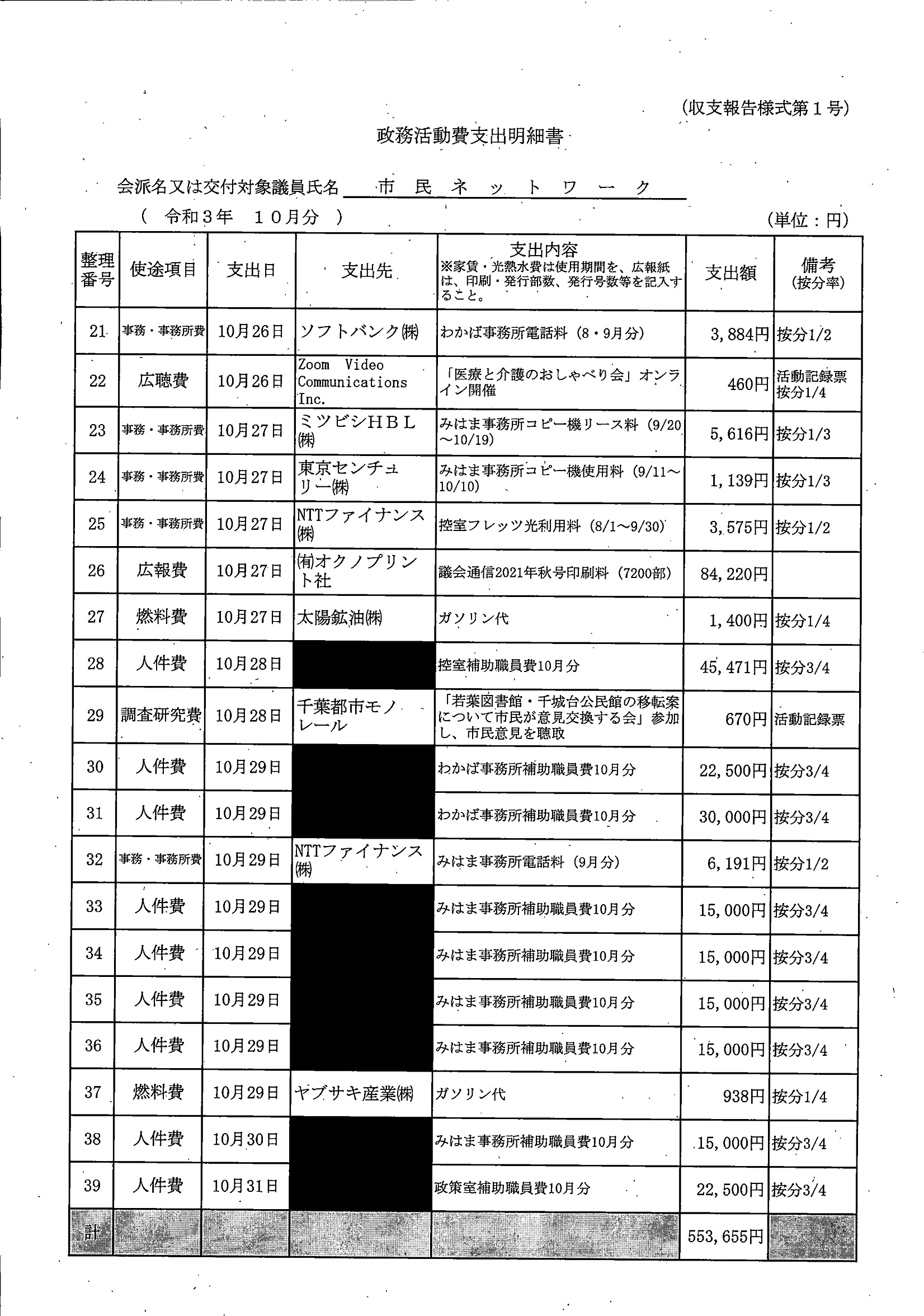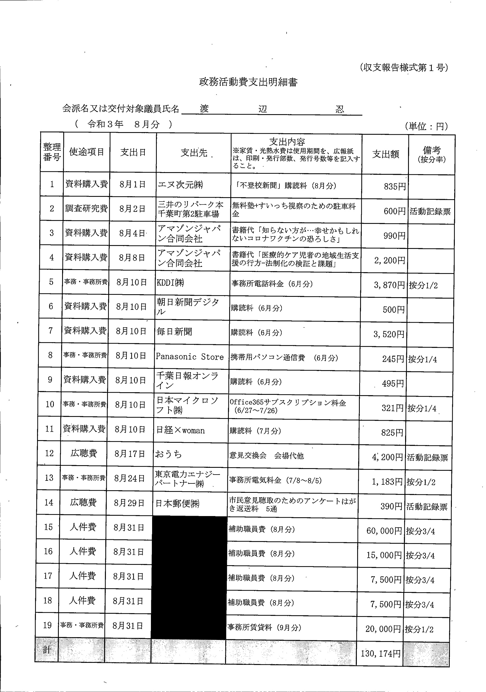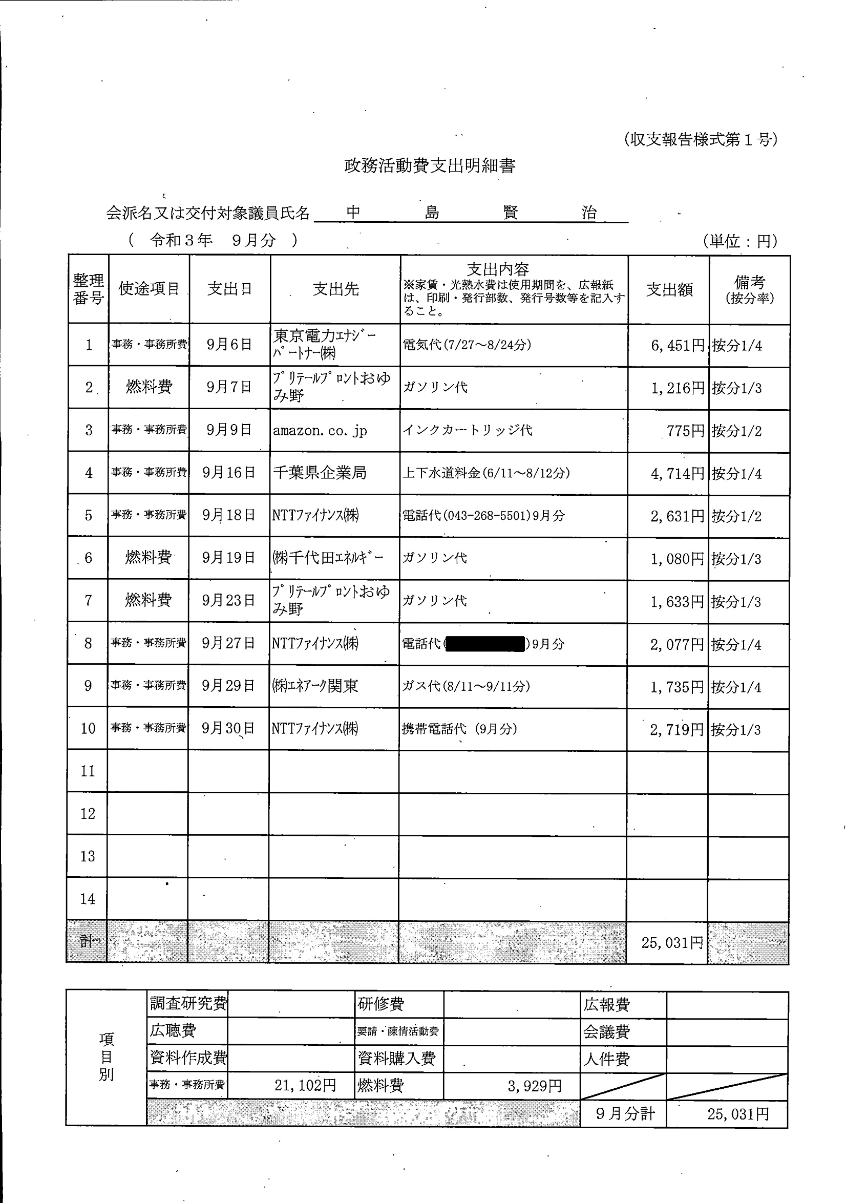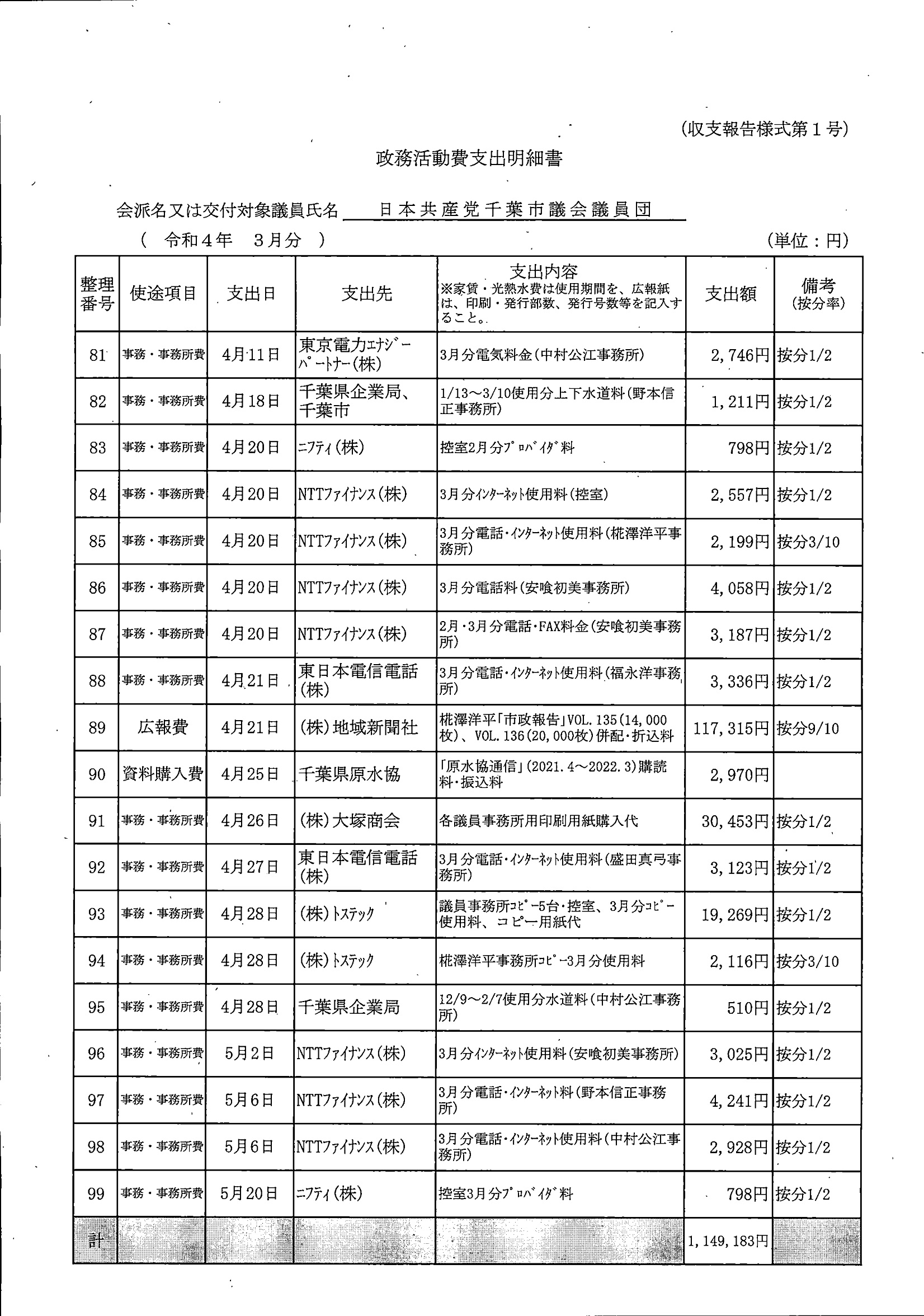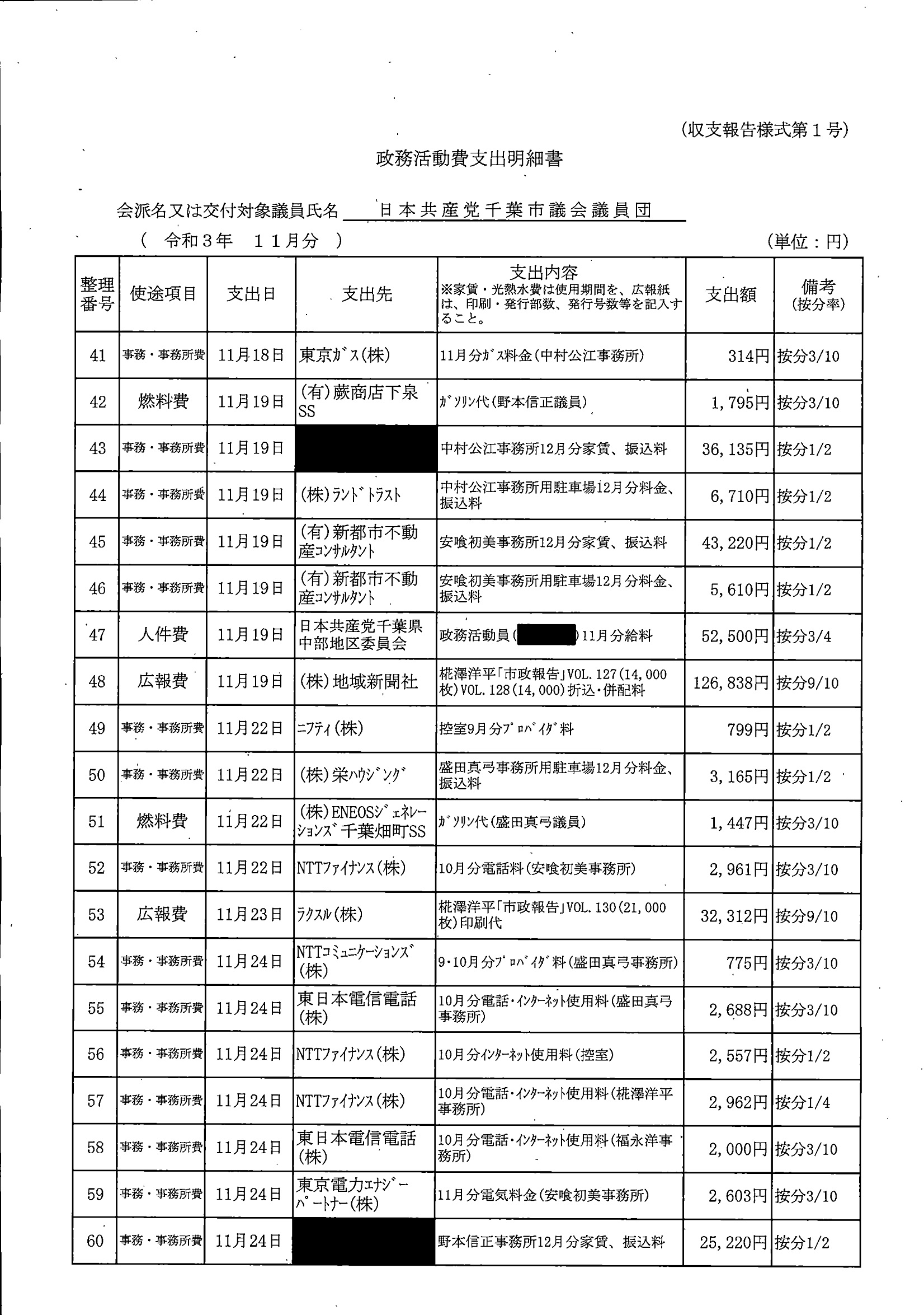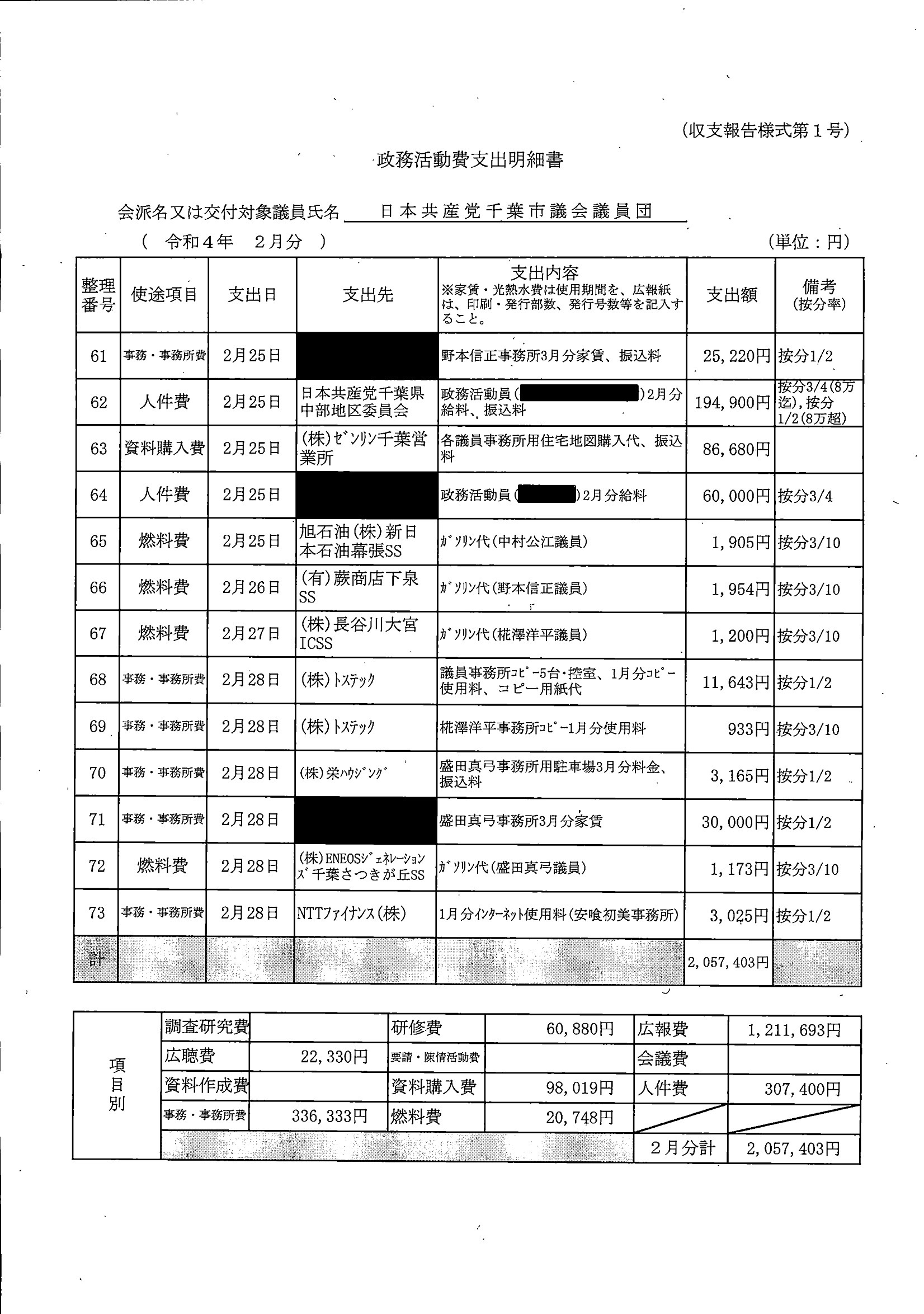 千葉市議会トップページ > 広報・情報公開 > 政務活動費 > 令和3年度交付分(政務活動費収支報告書)