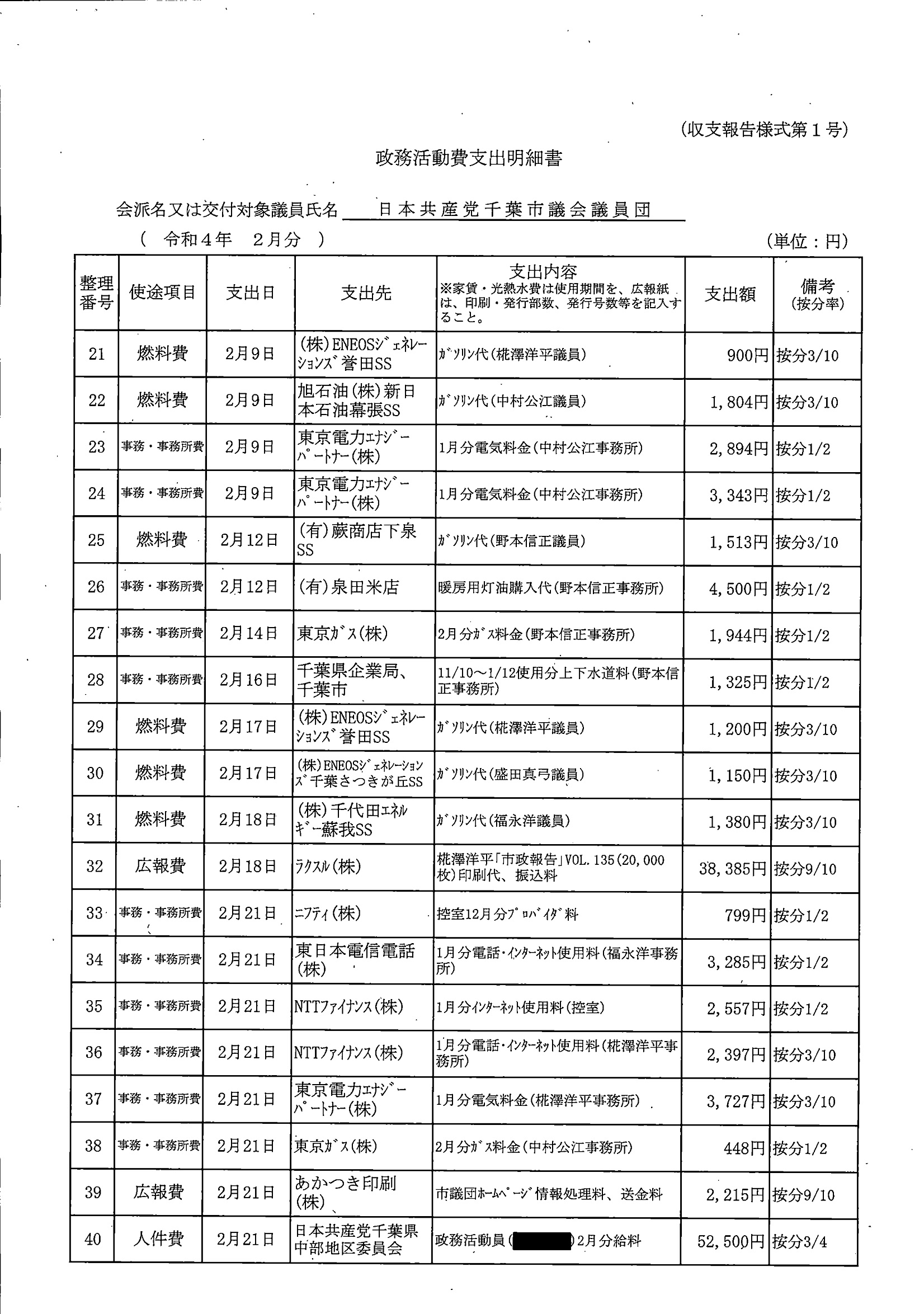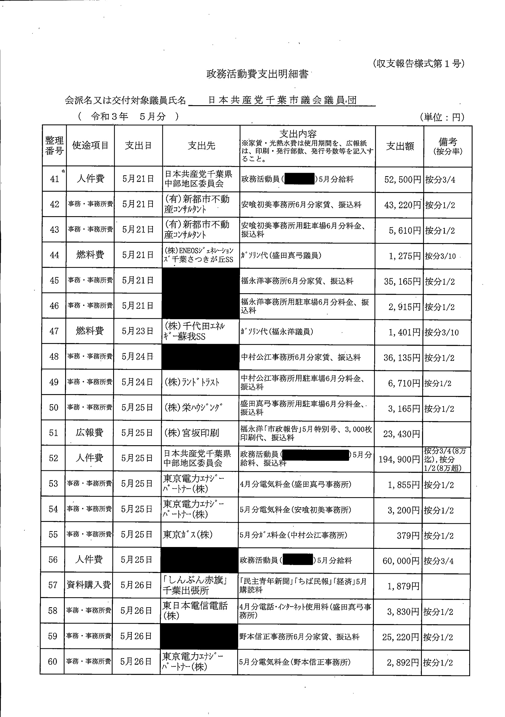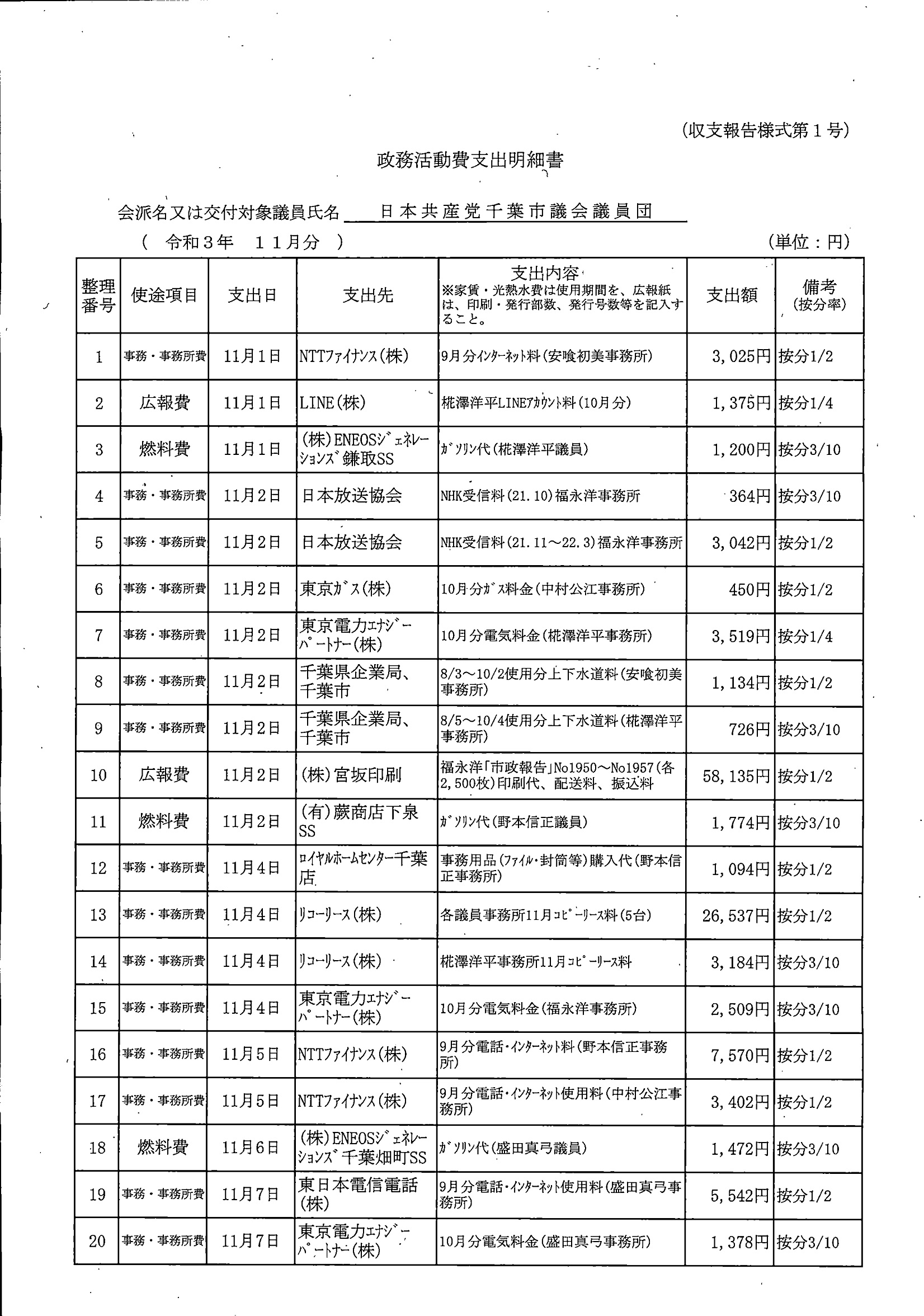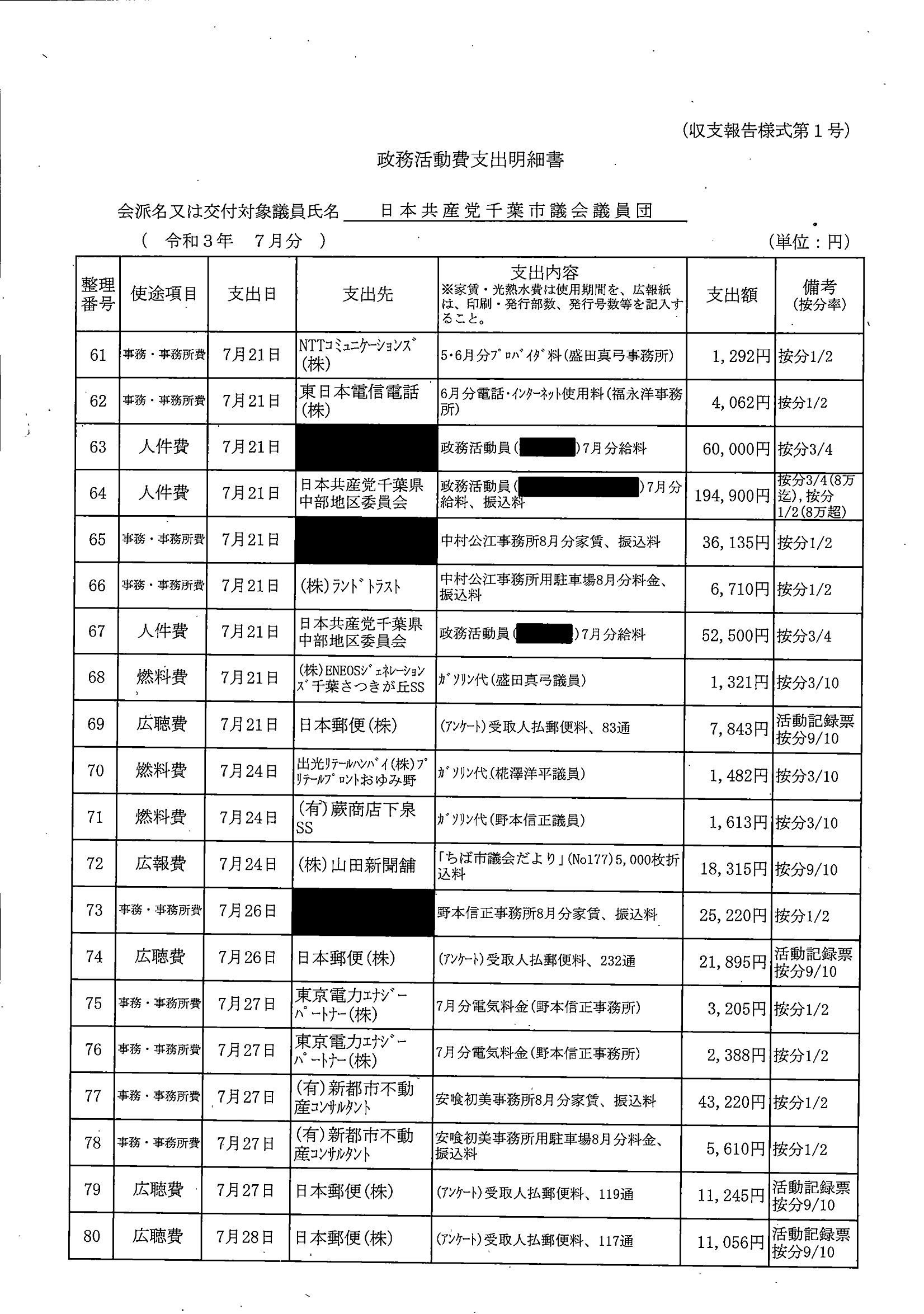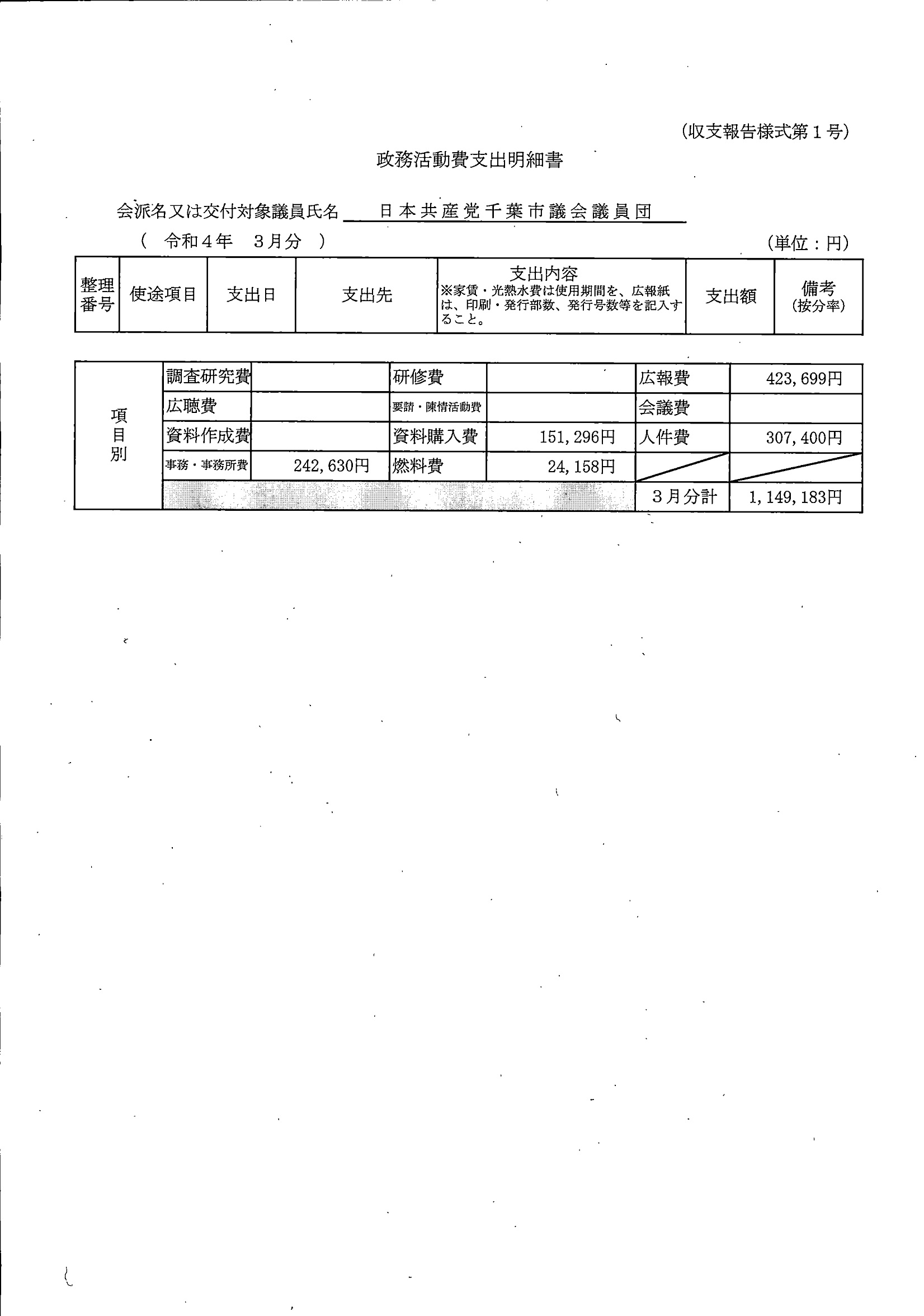 千葉市議会トップページ > 広報・情報公開 > 政務活動費 > 令和3年度交付分(政務活動費収支報告書)