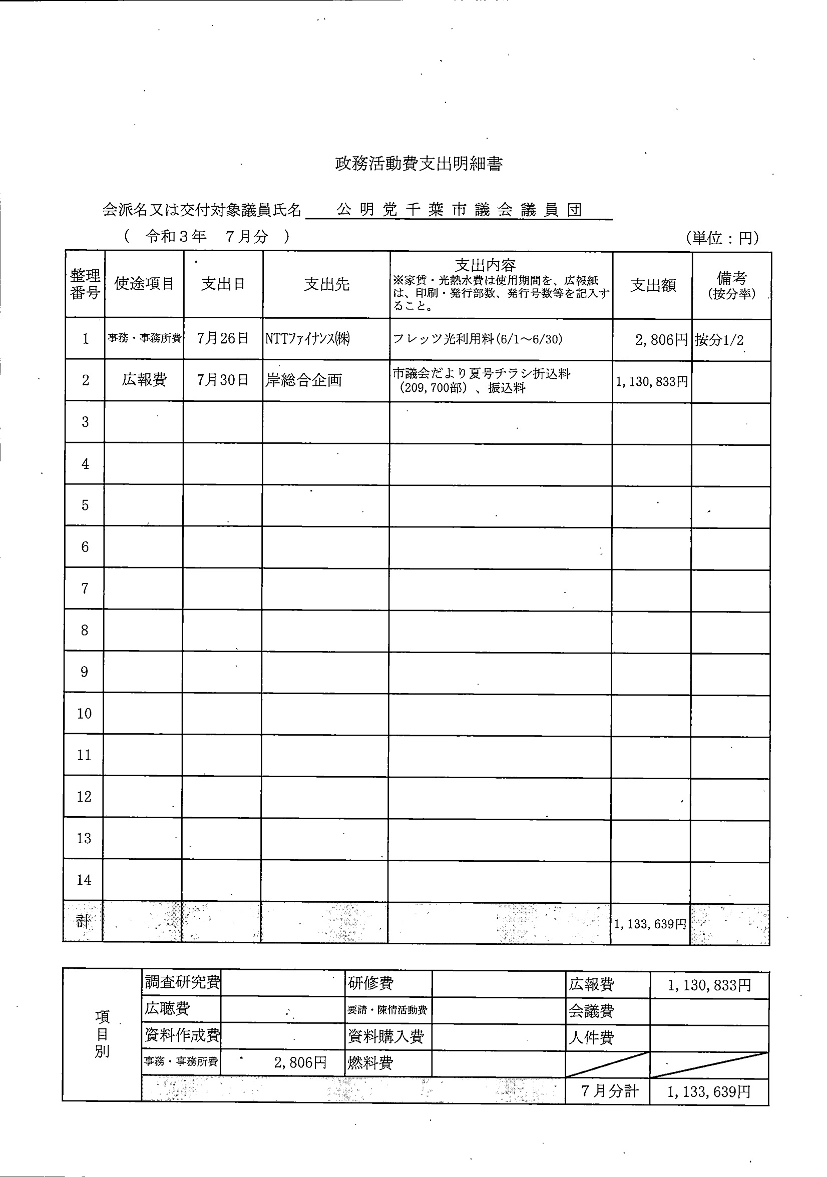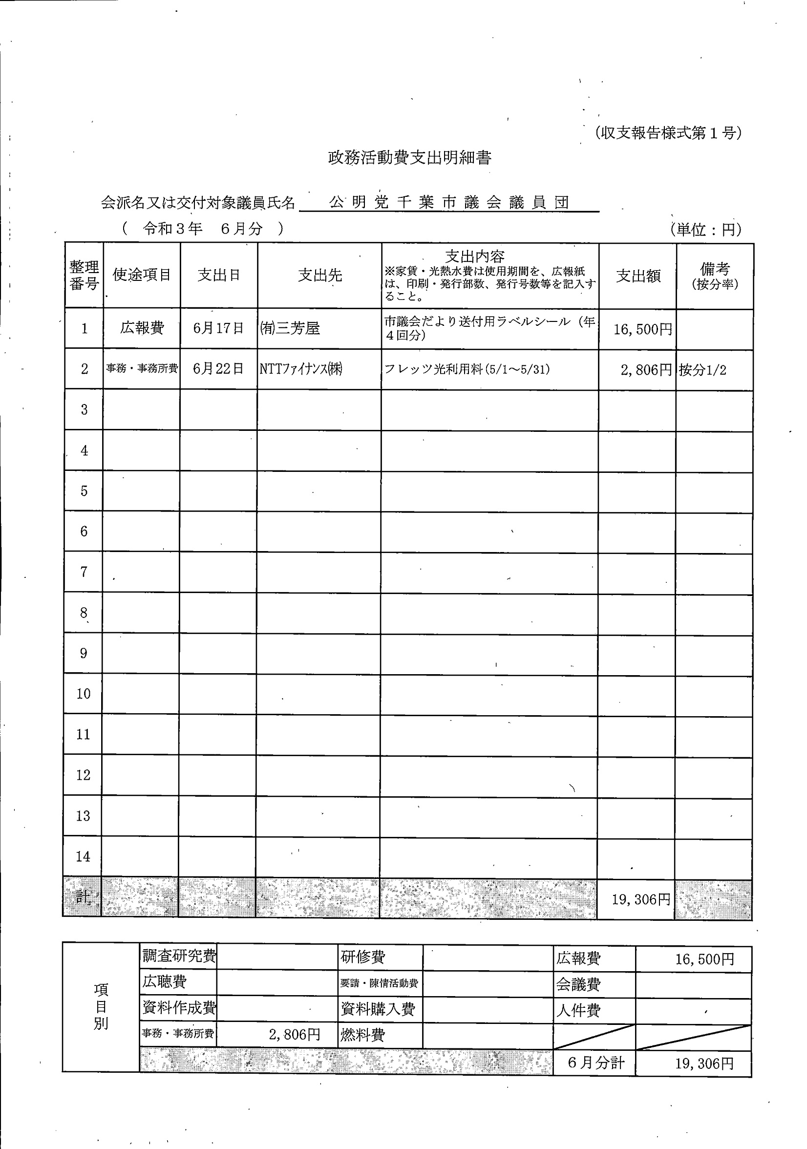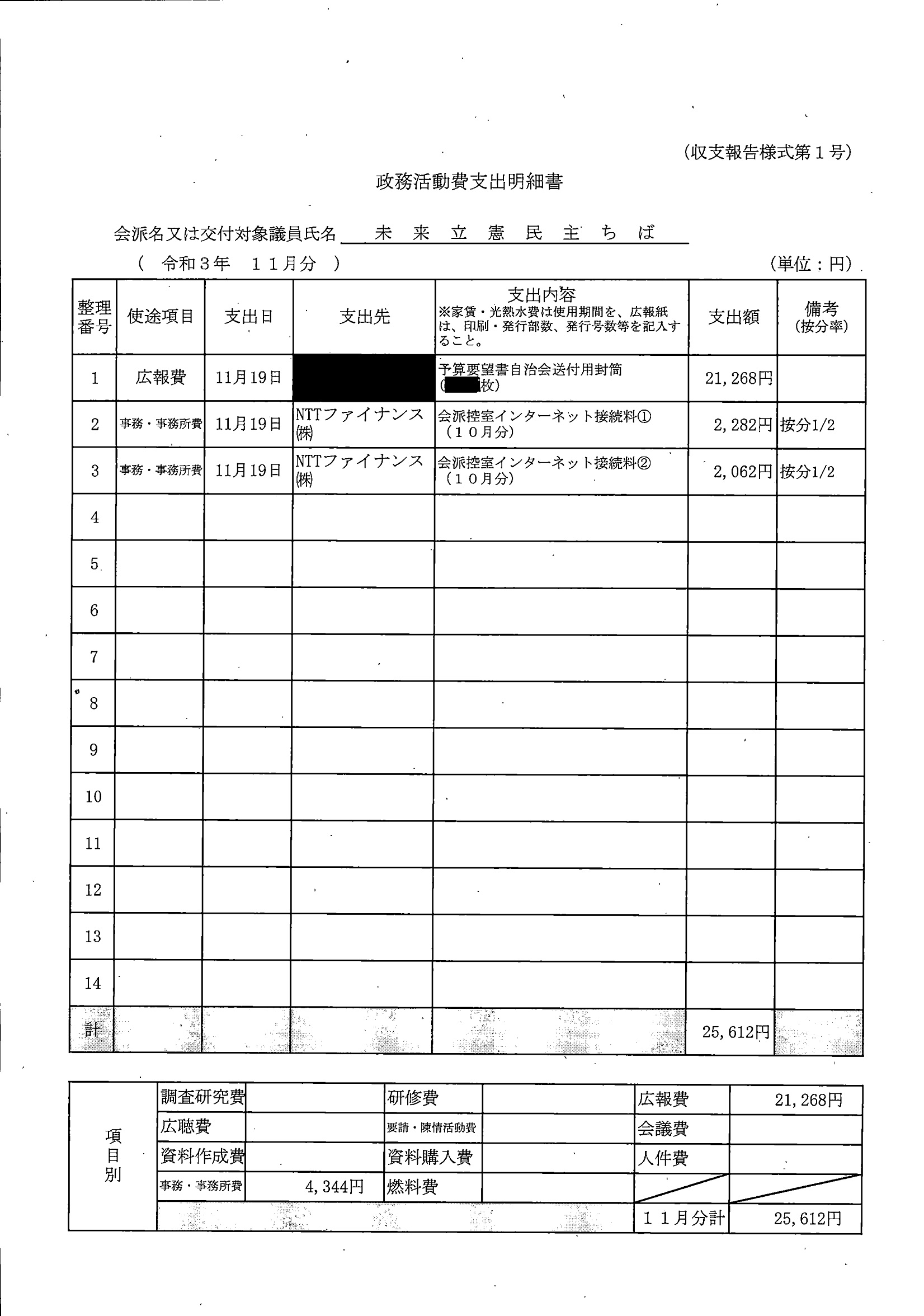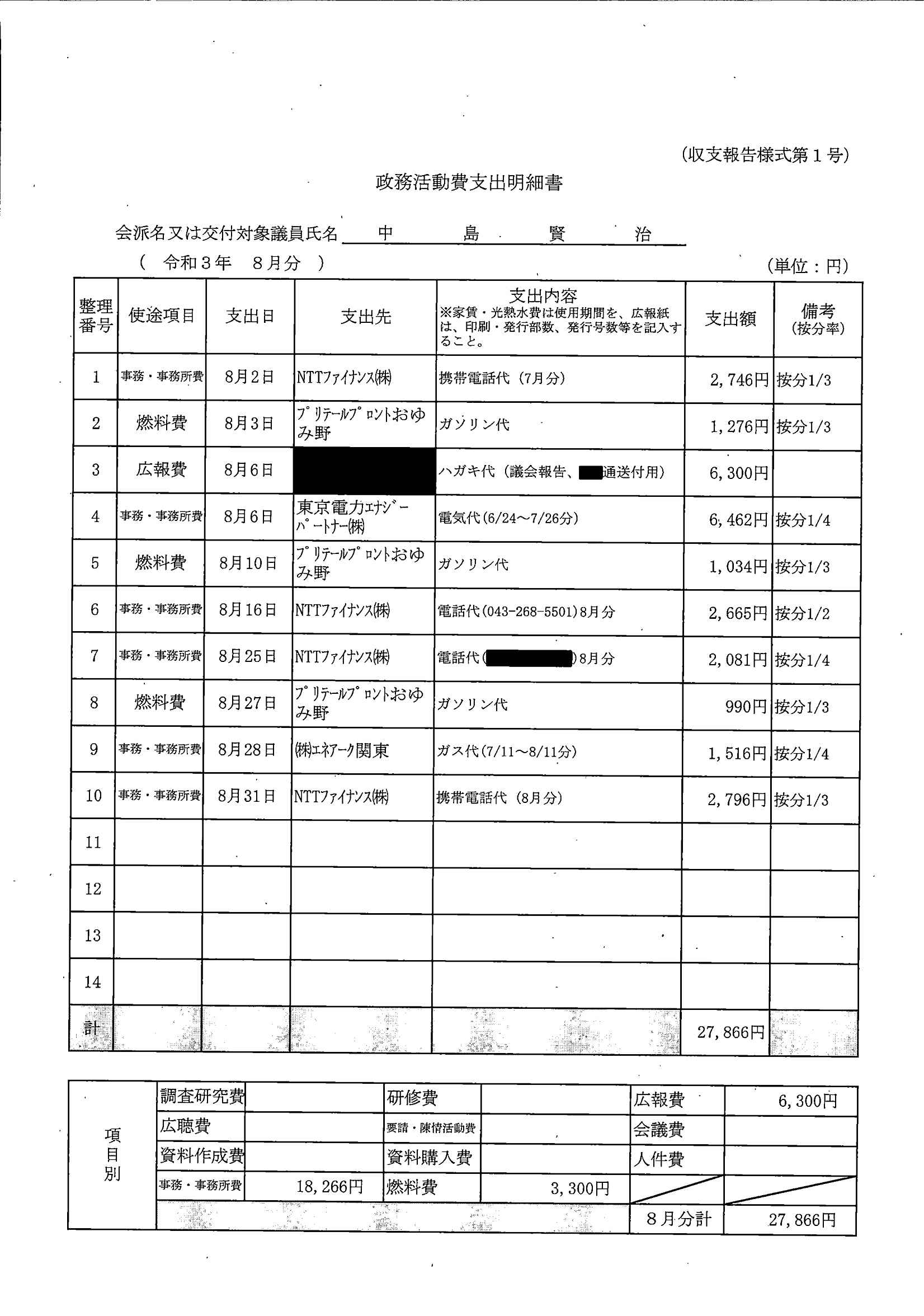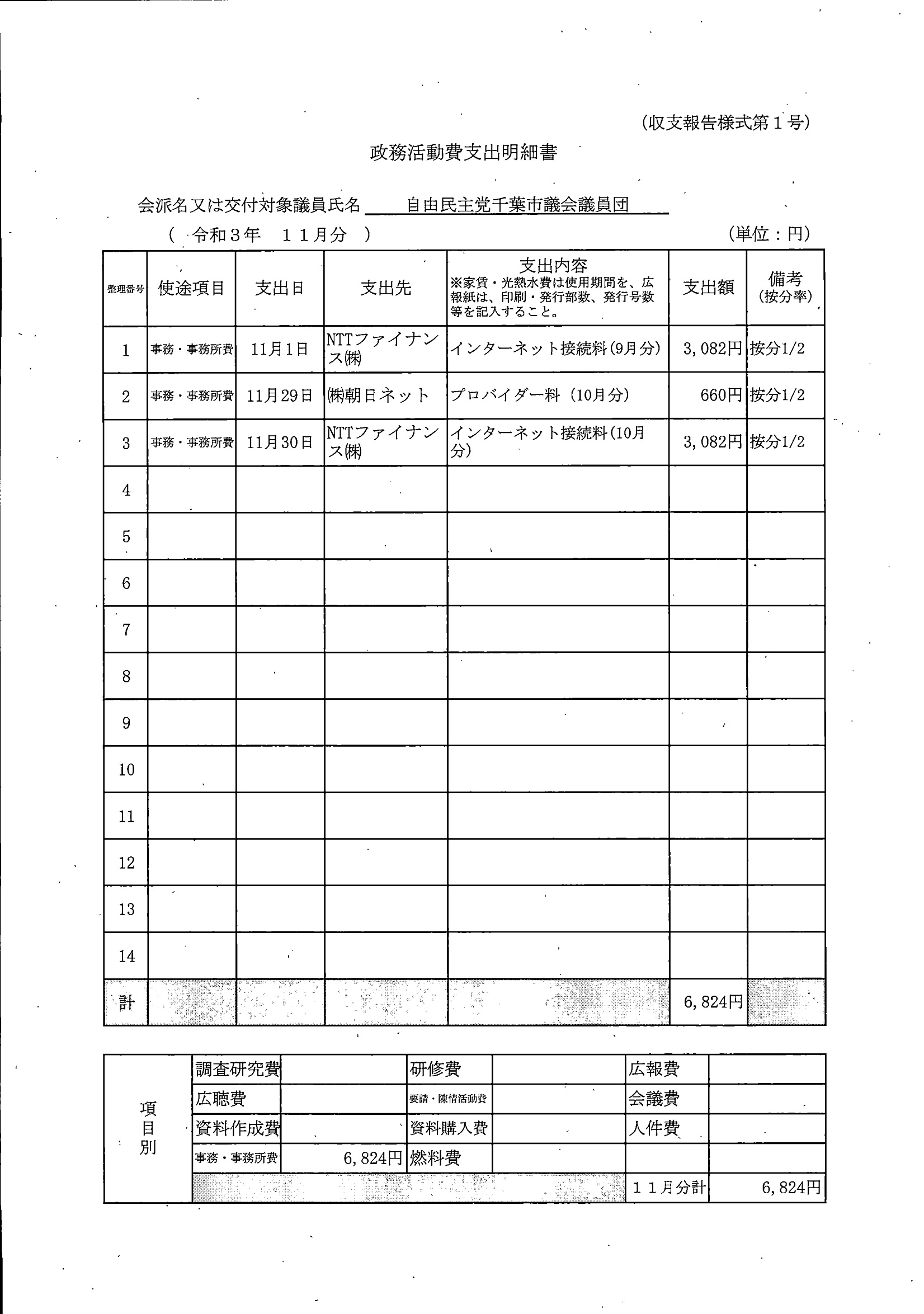 千葉市議会トップページ > 広報・情報公開 > 政務活動費 > 令和3年度交付分(政務活動費収支報告書)