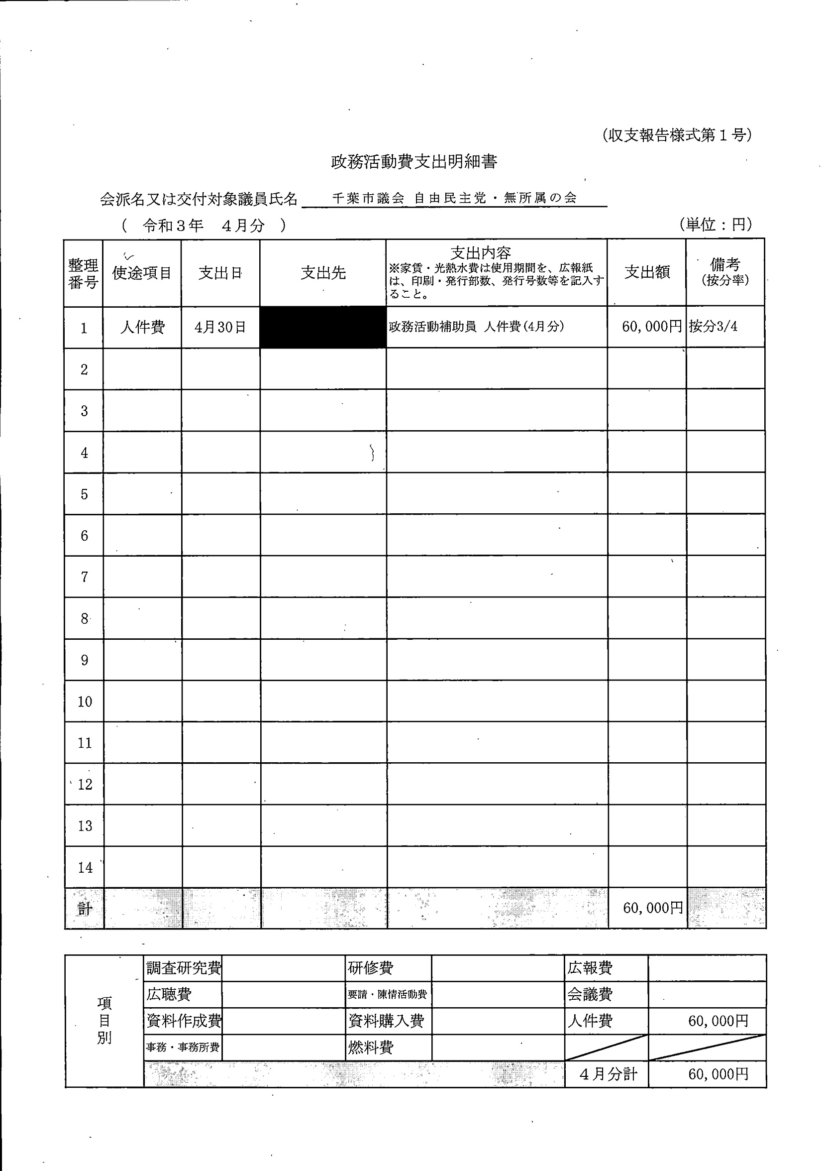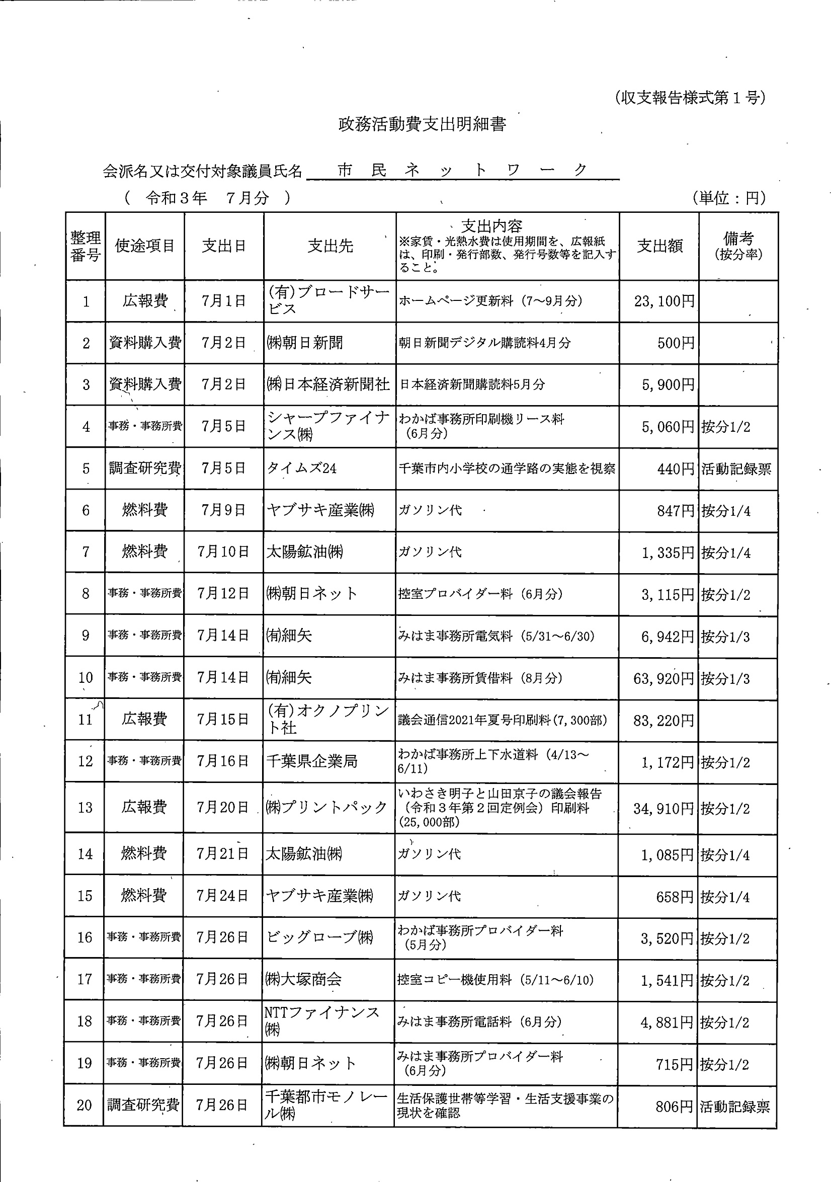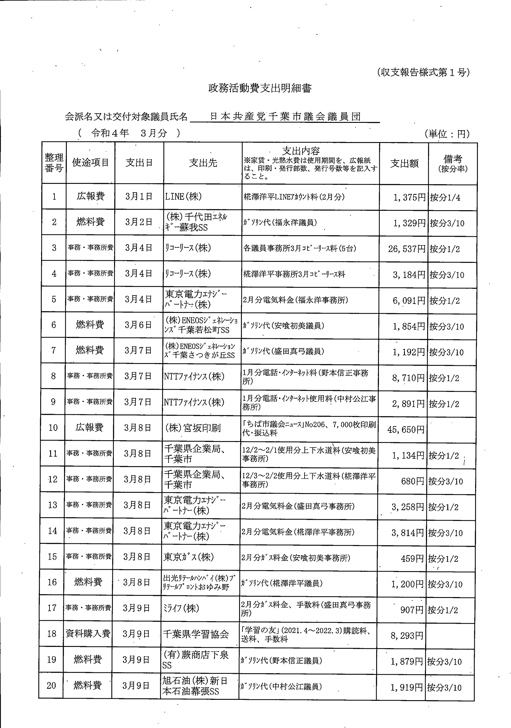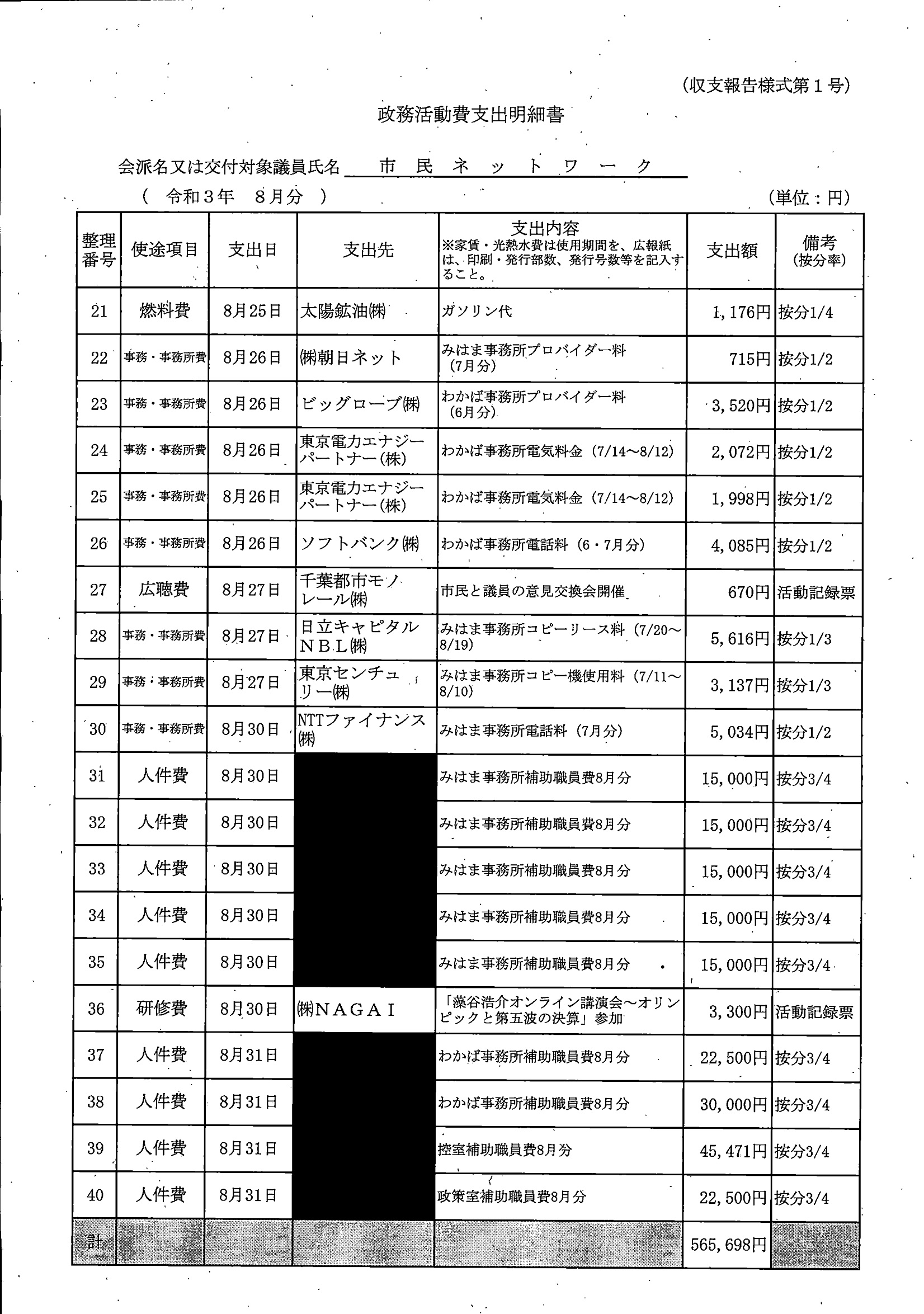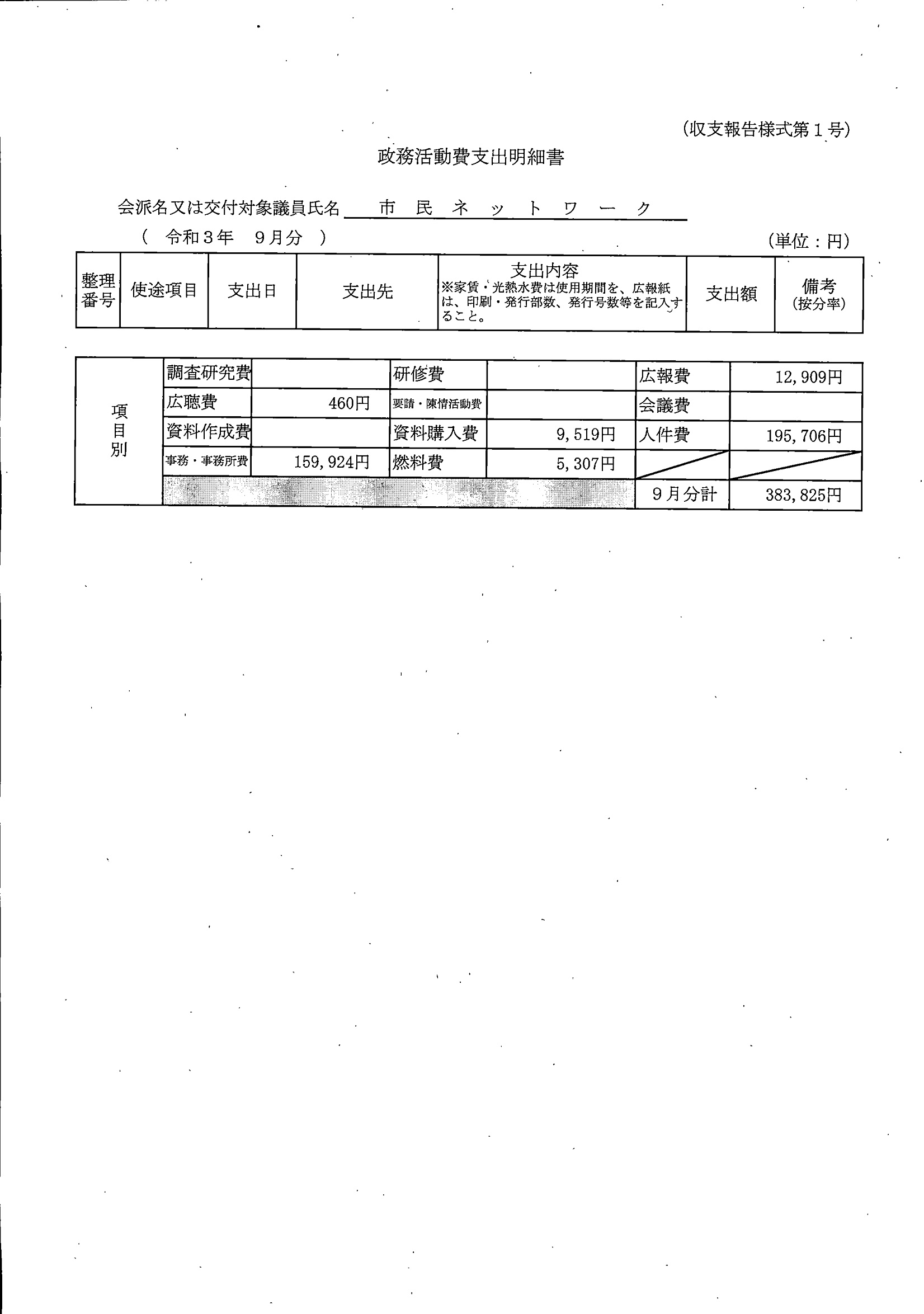 千葉市議会トップページ > 広報・情報公開 > 政務活動費 > 令和3年度交付分(政務活動費収支報告書)