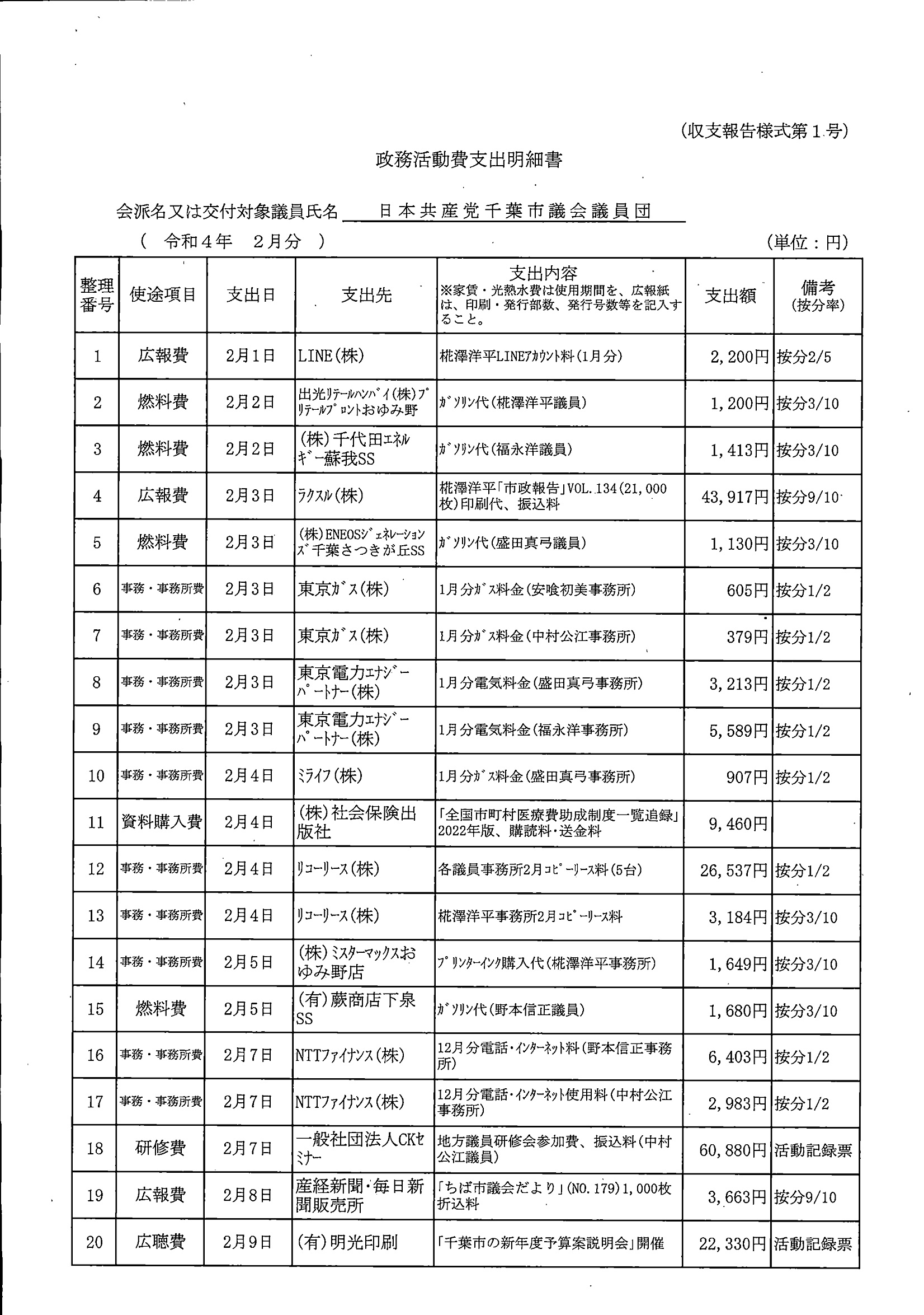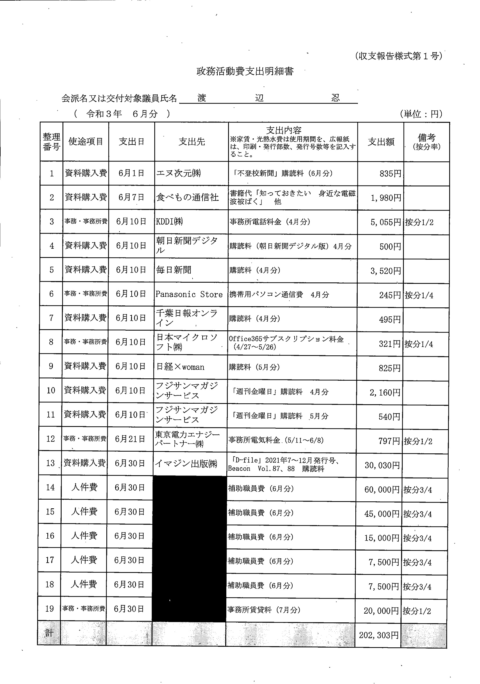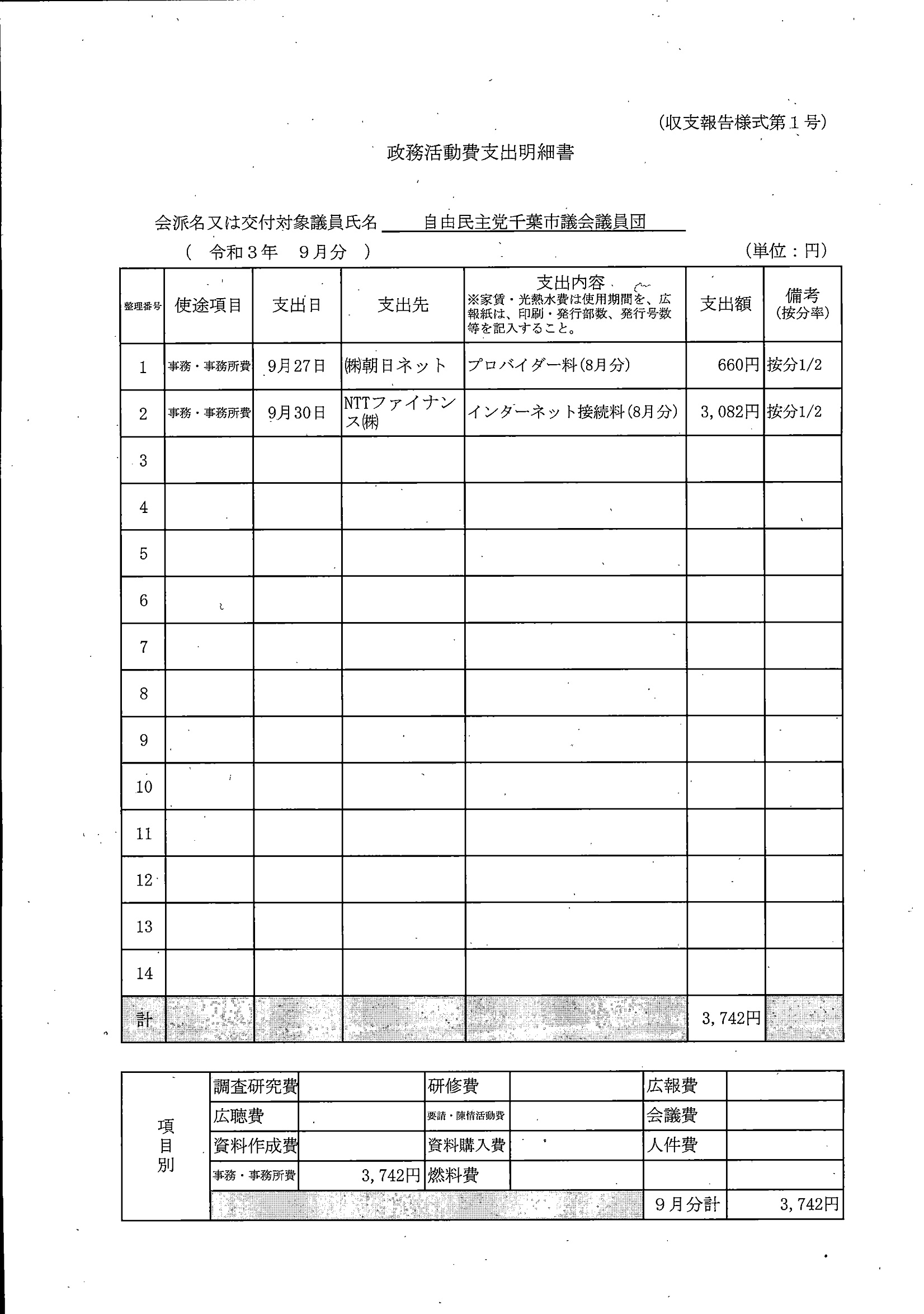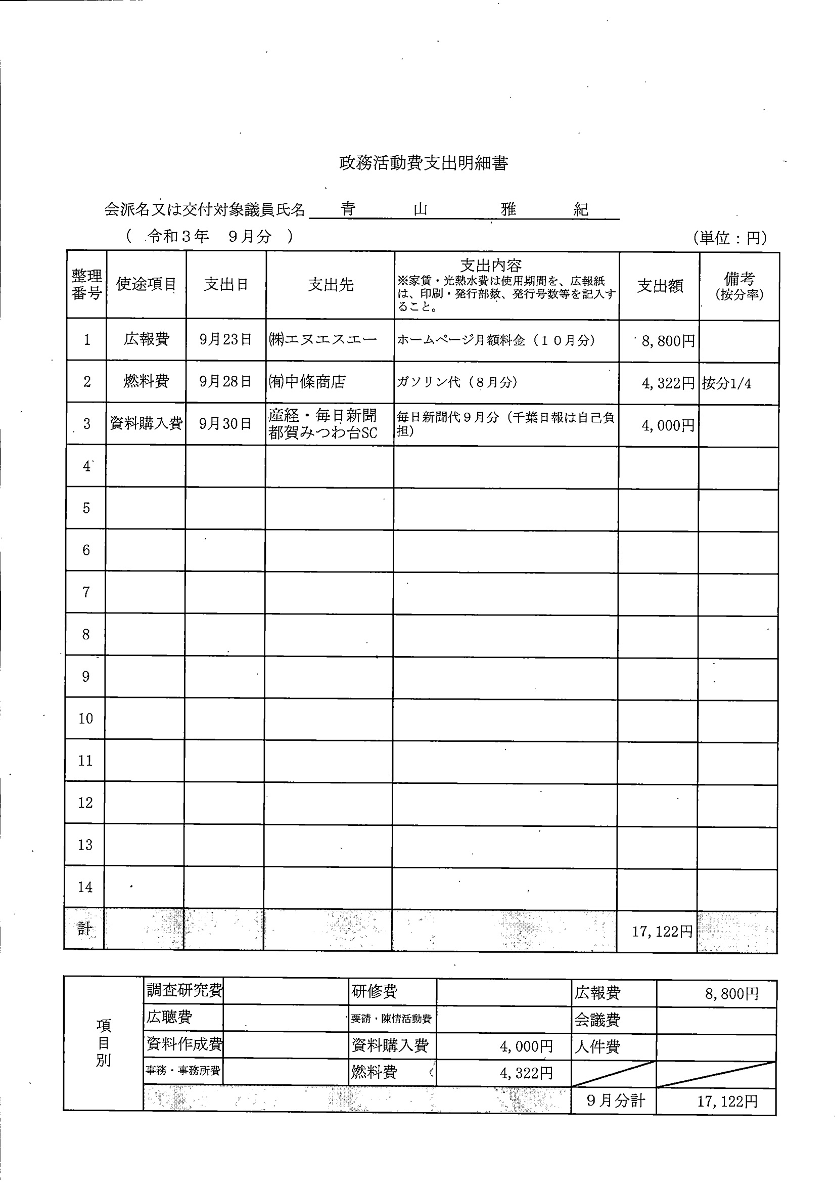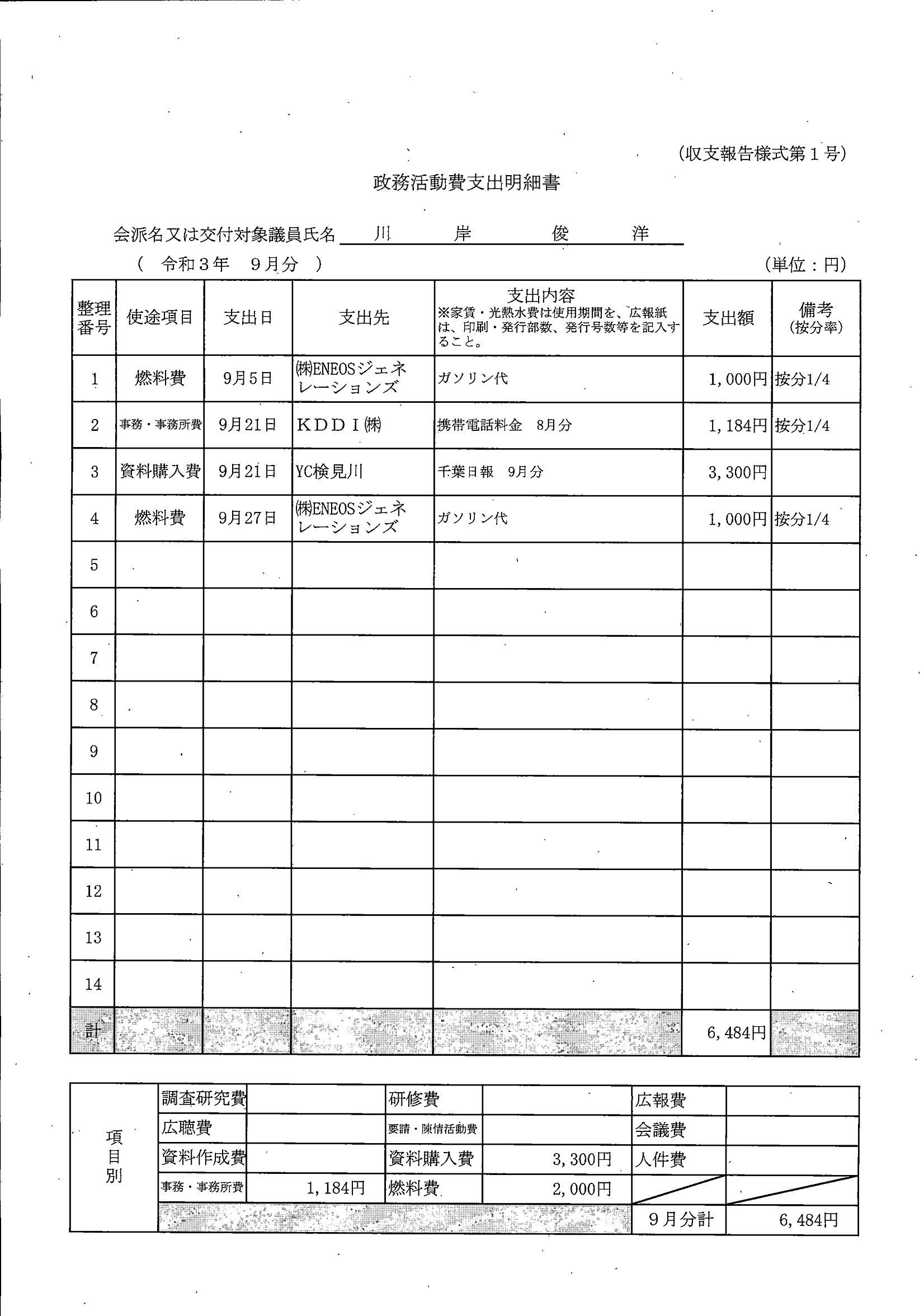 千葉市議会トップページ > 広報・情報公開 > 政務活動費 > 令和3年度交付分(政務活動費収支報告書)