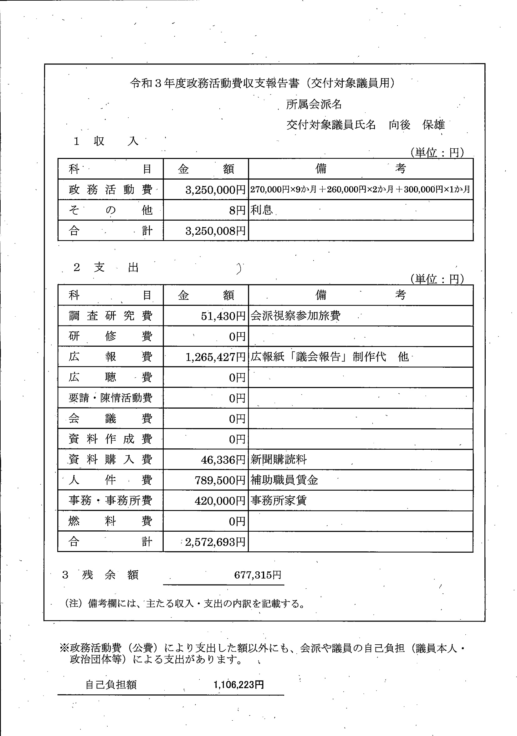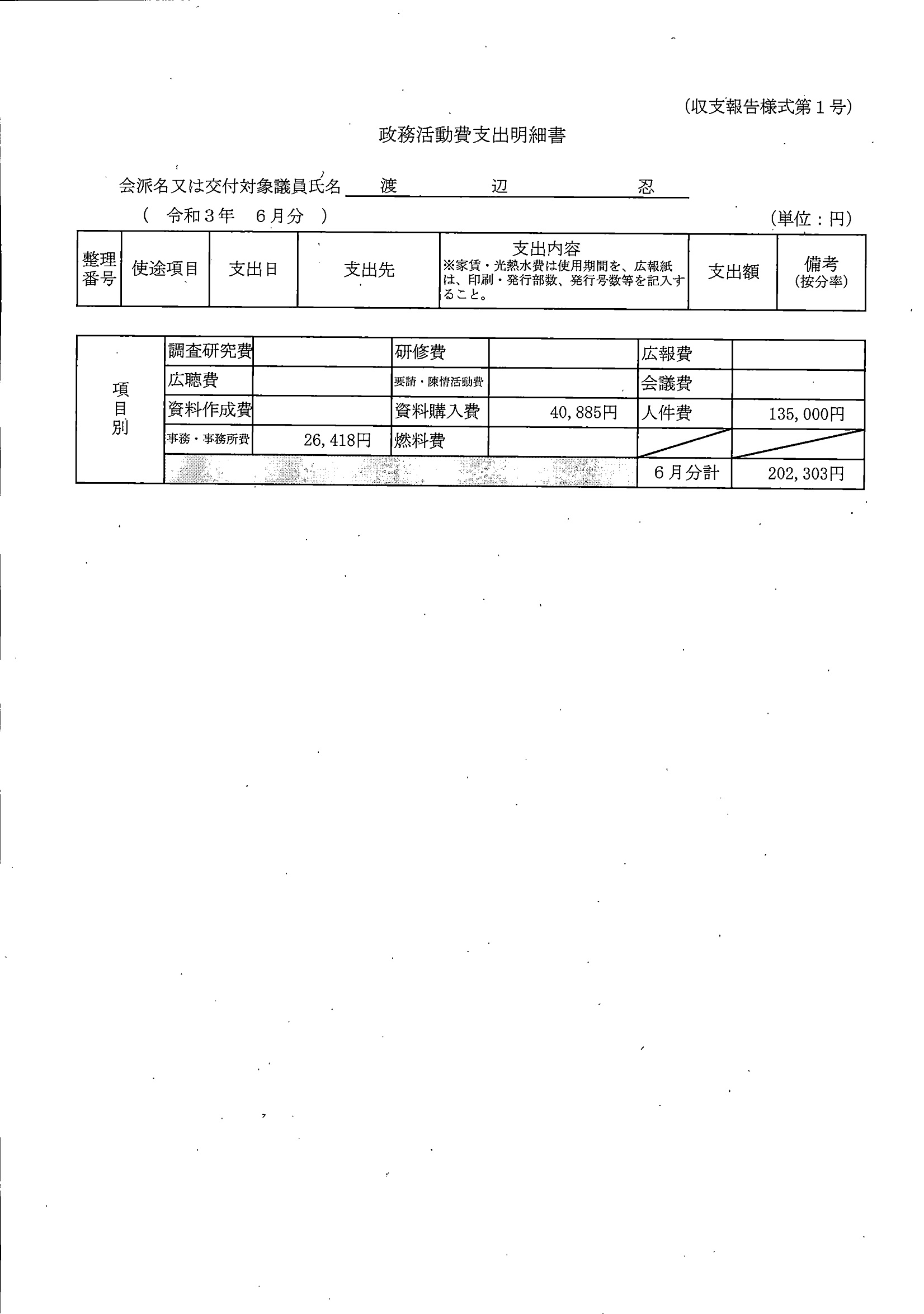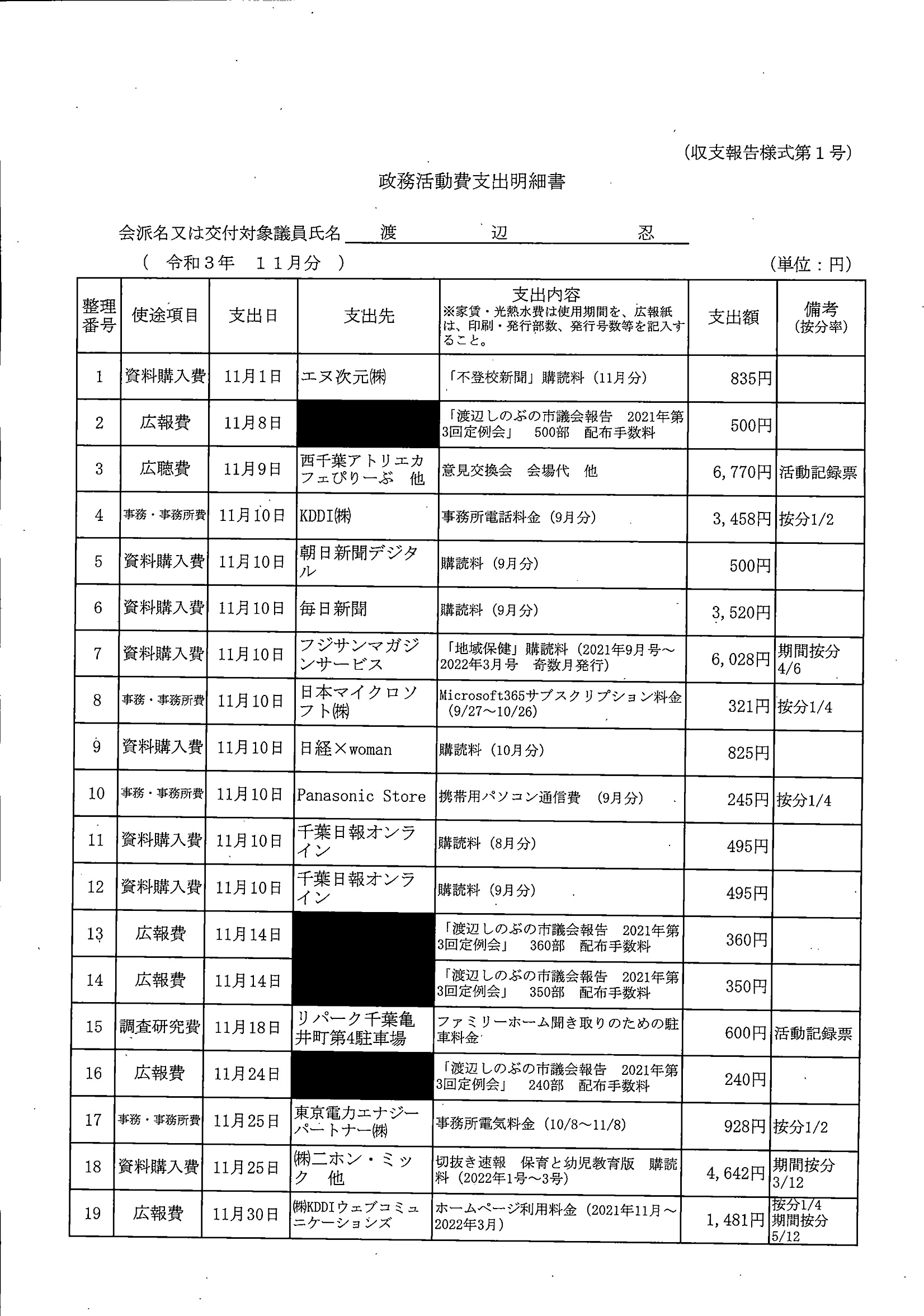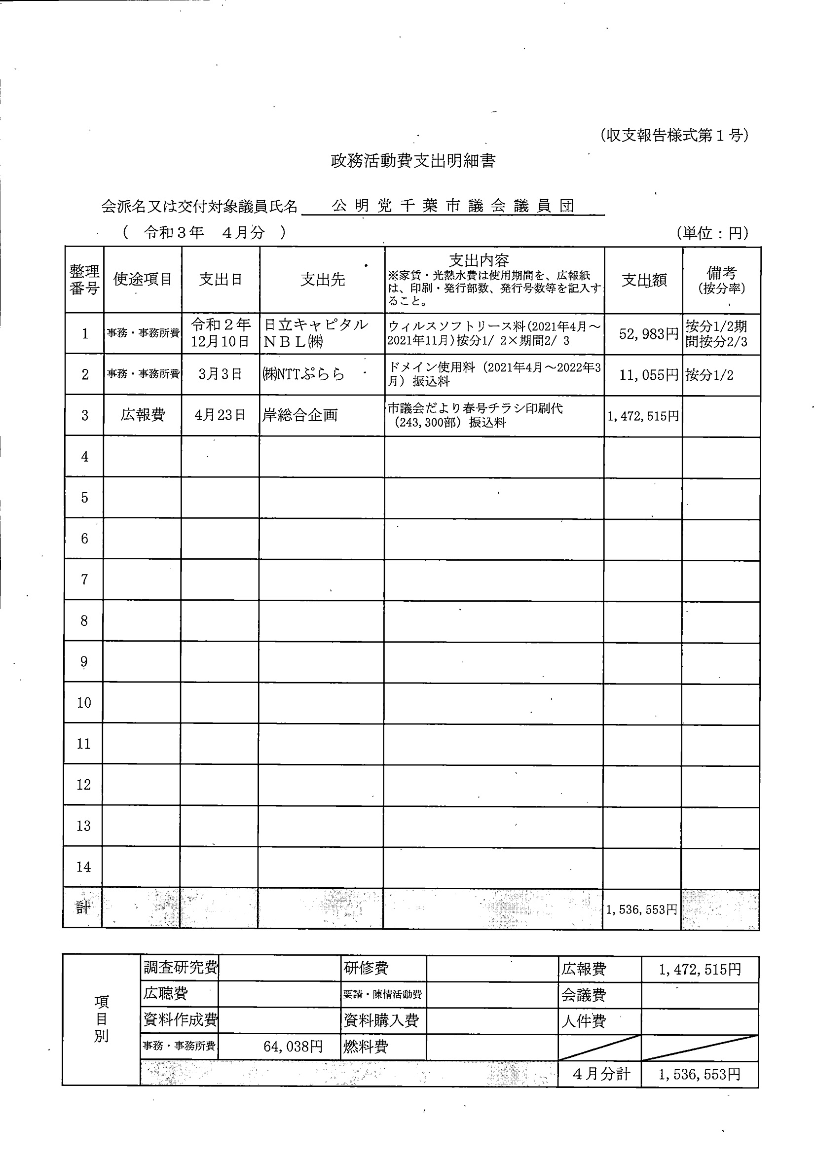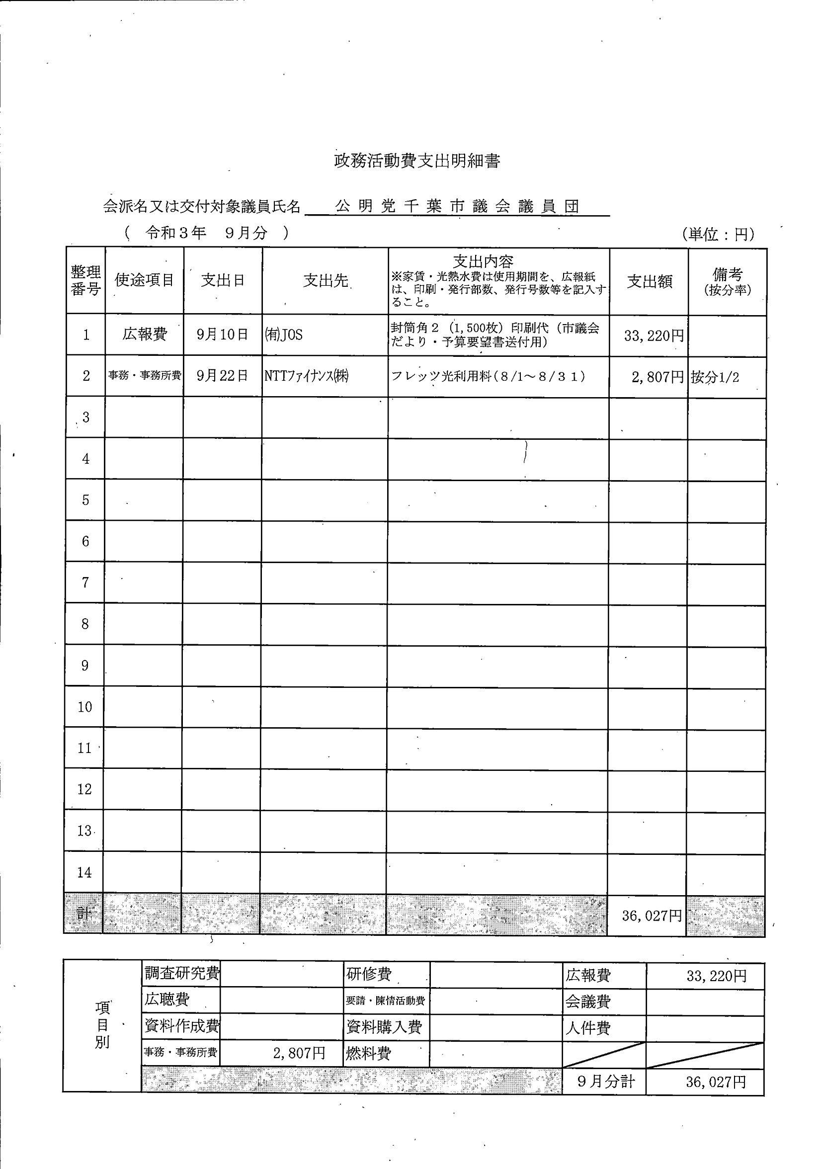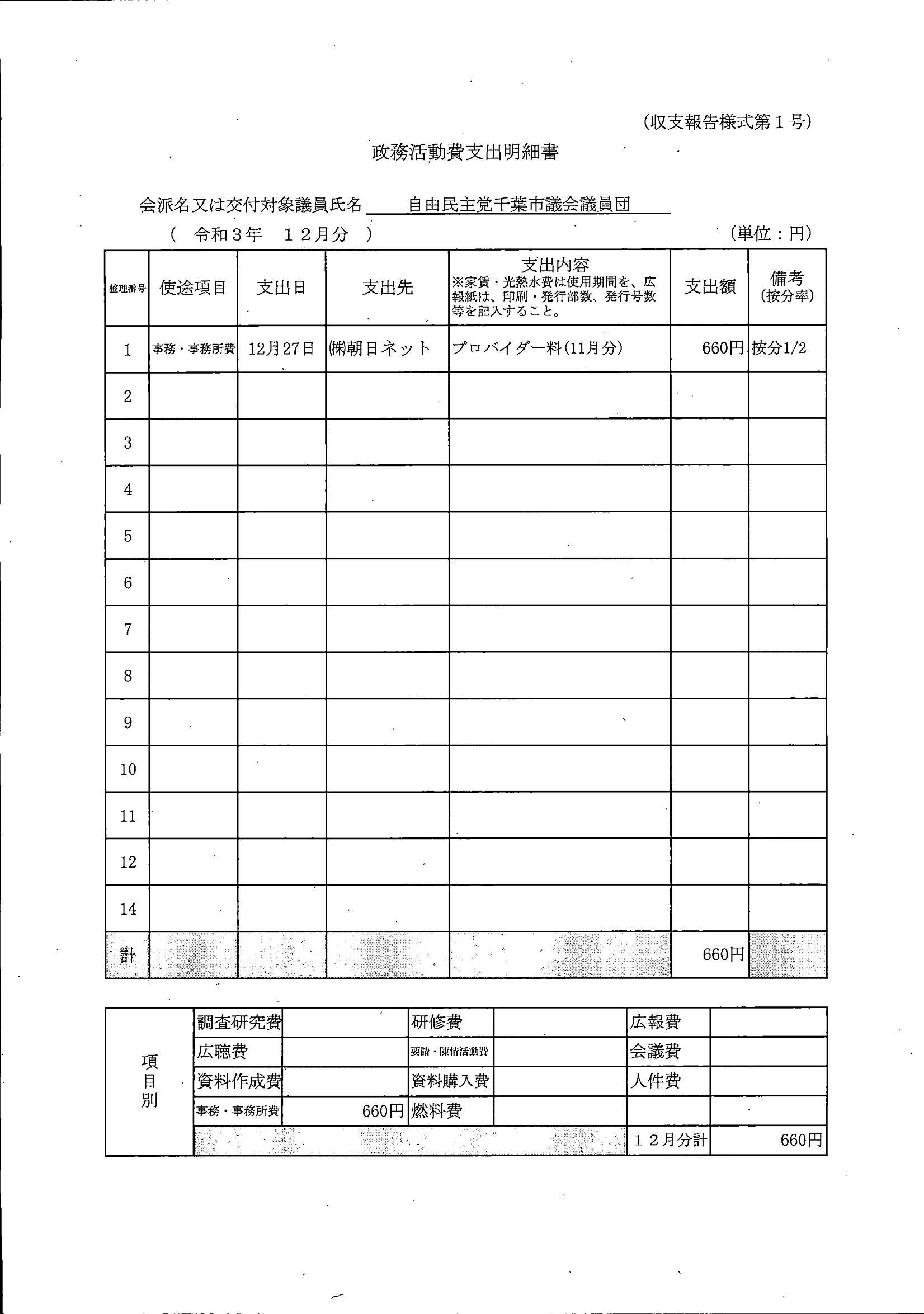 千葉市議会トップページ > 広報・情報公開 > 政務活動費 > 令和3年度交付分(政務活動費収支報告書)
