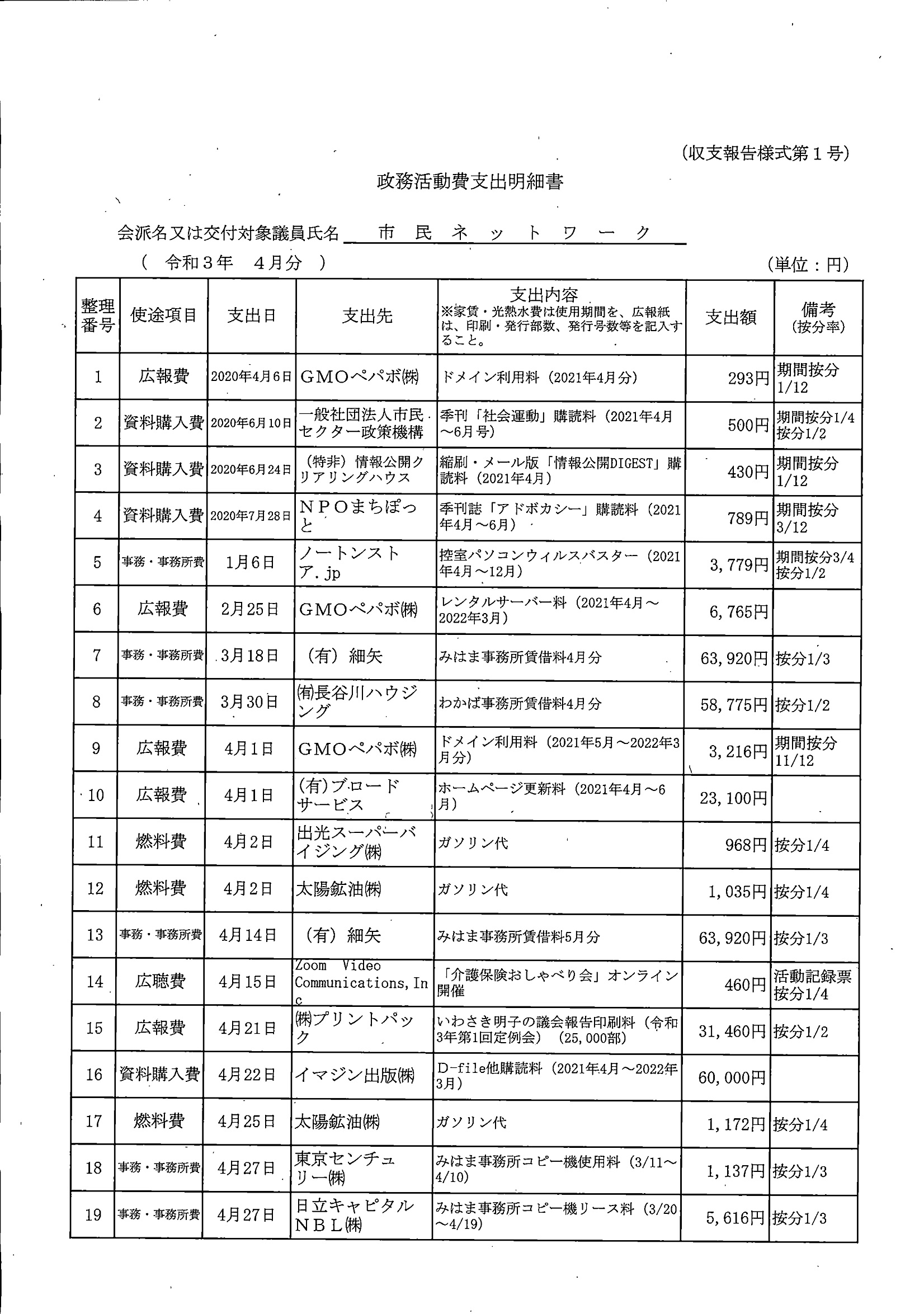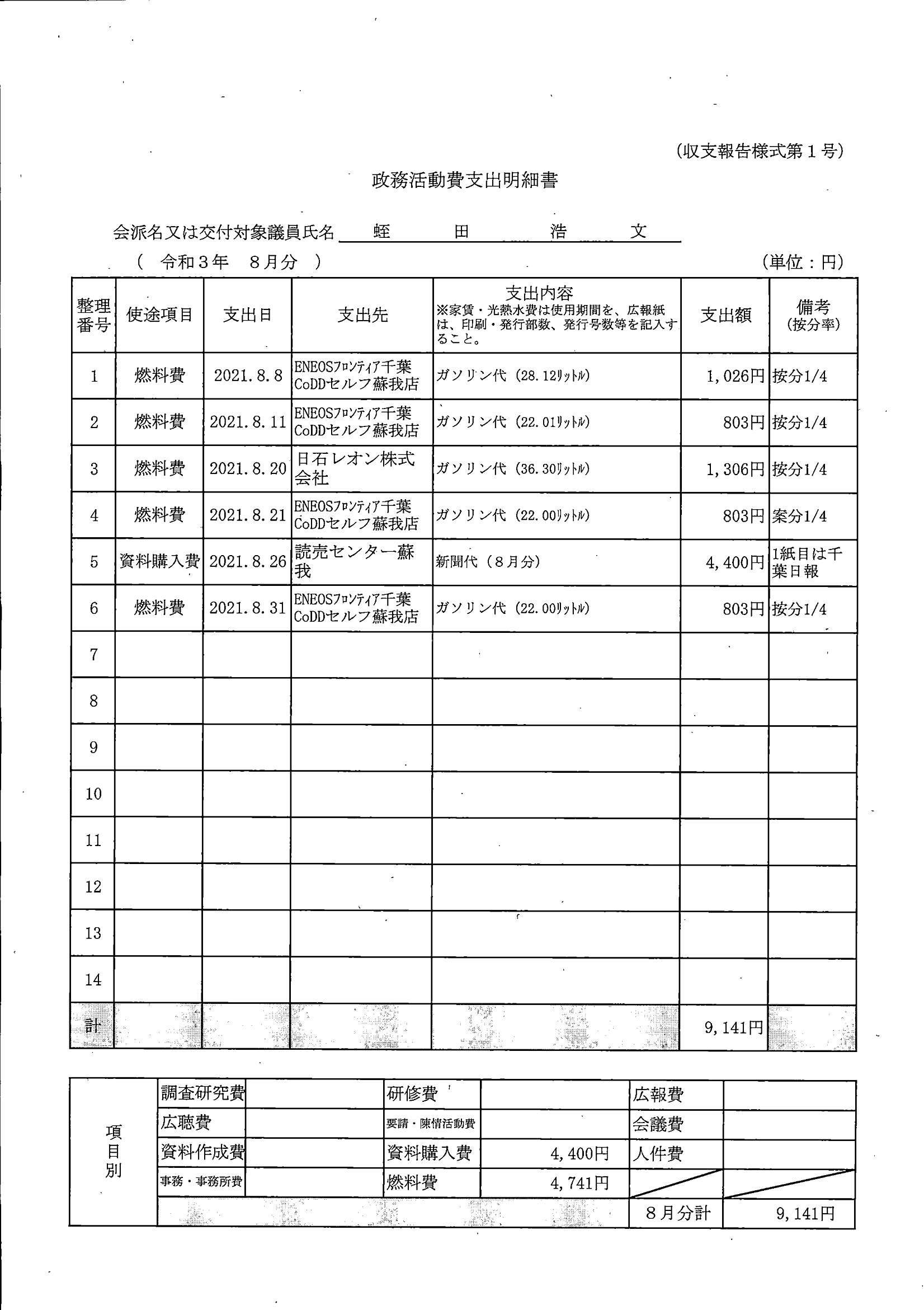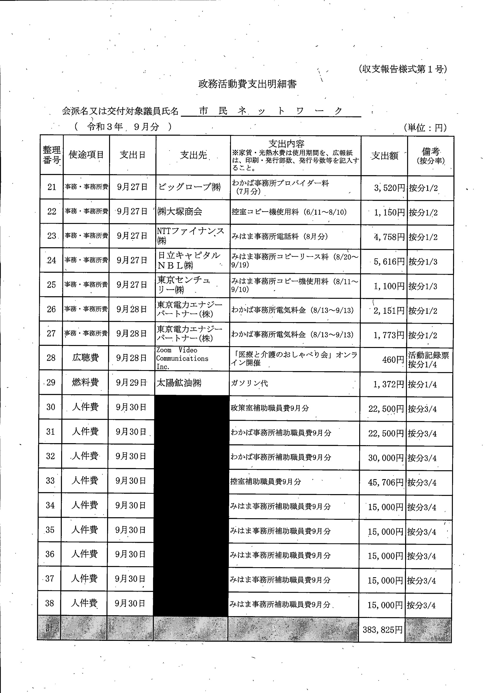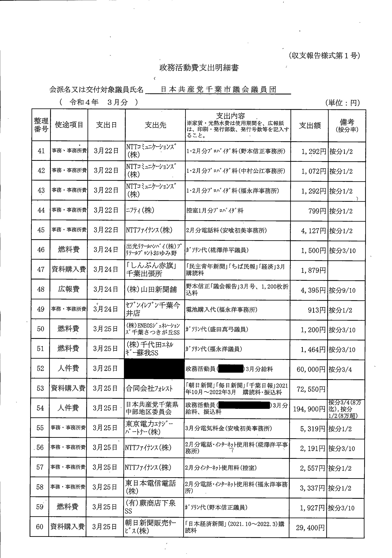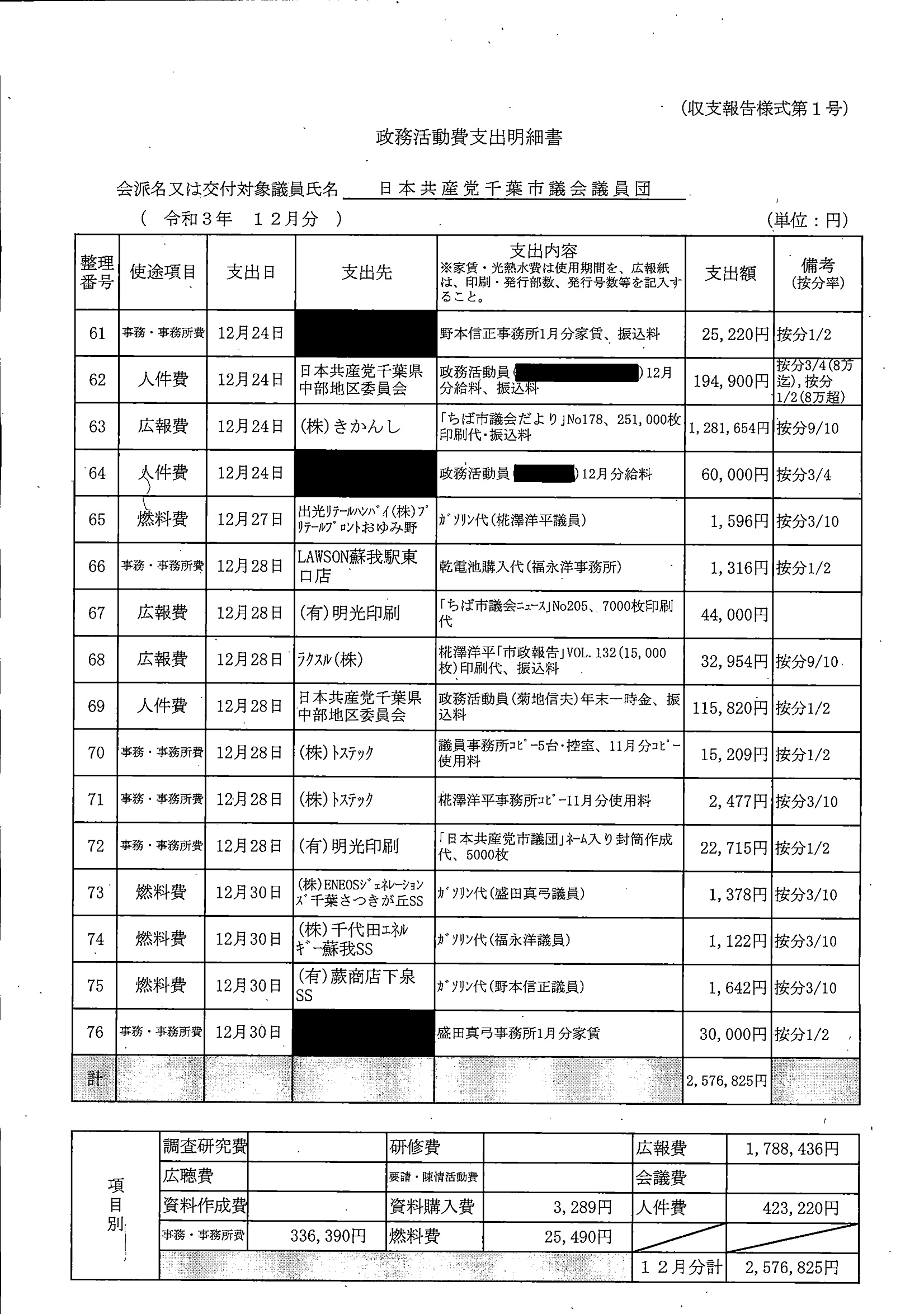 千葉市議会トップページ > 広報・情報公開 > 政務活動費 > 令和3年度交付分(政務活動費収支報告書)