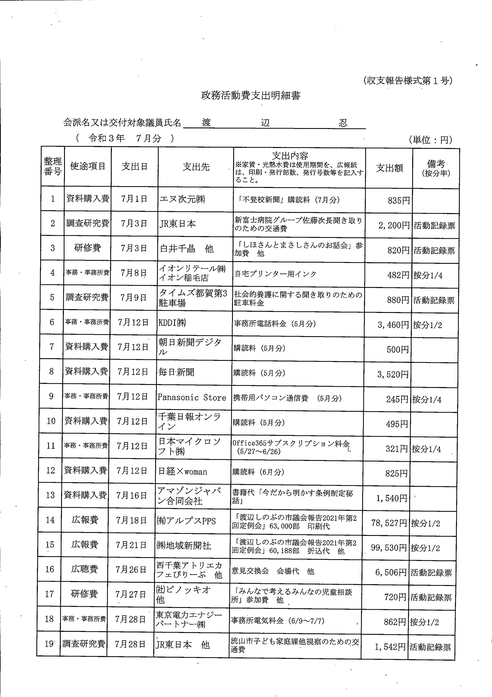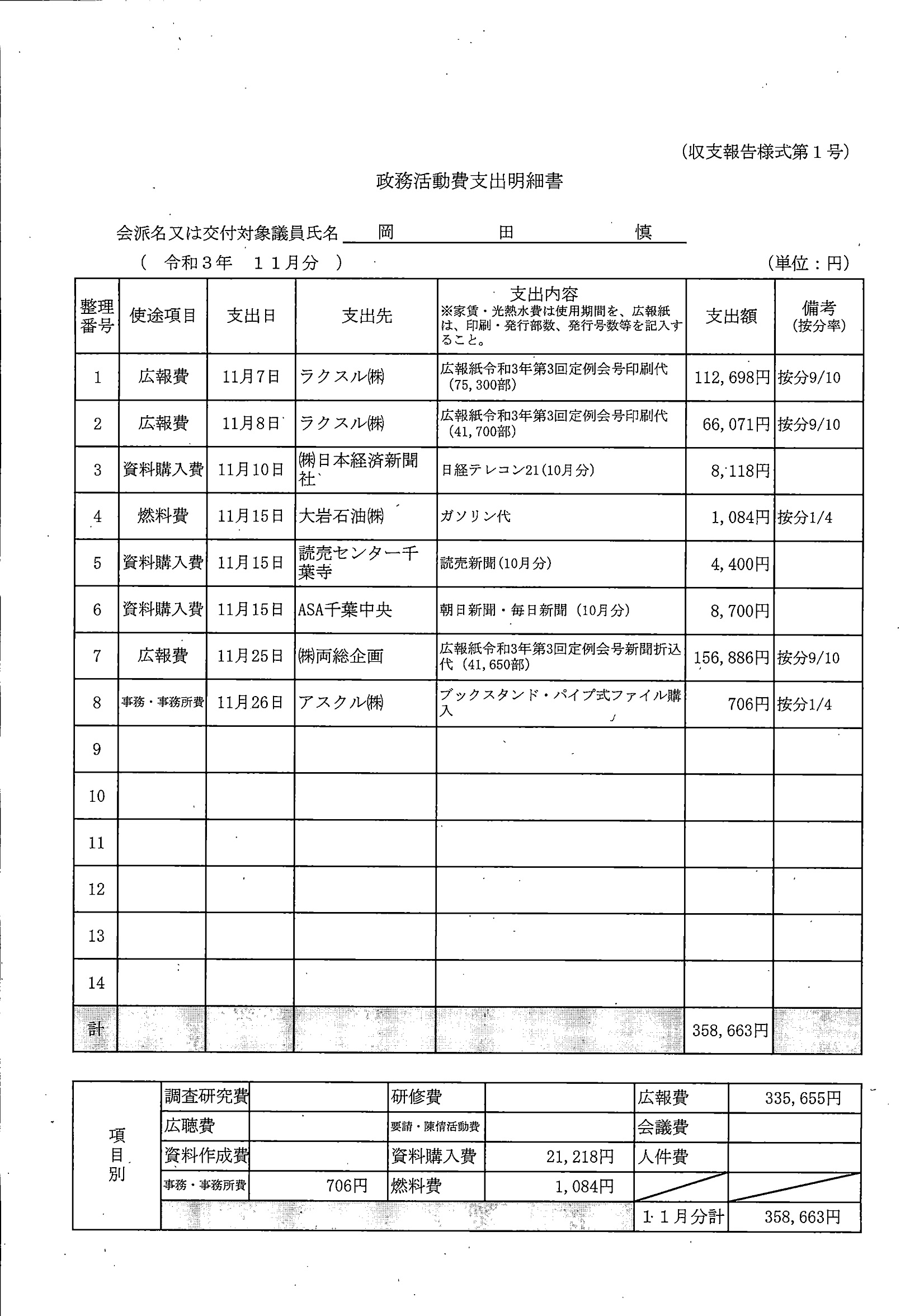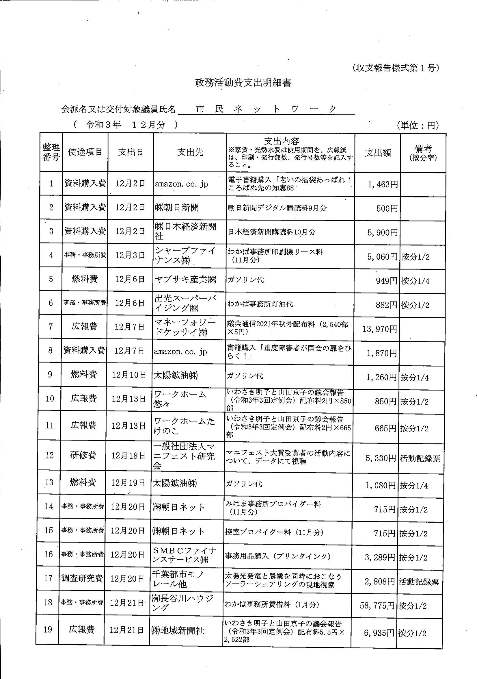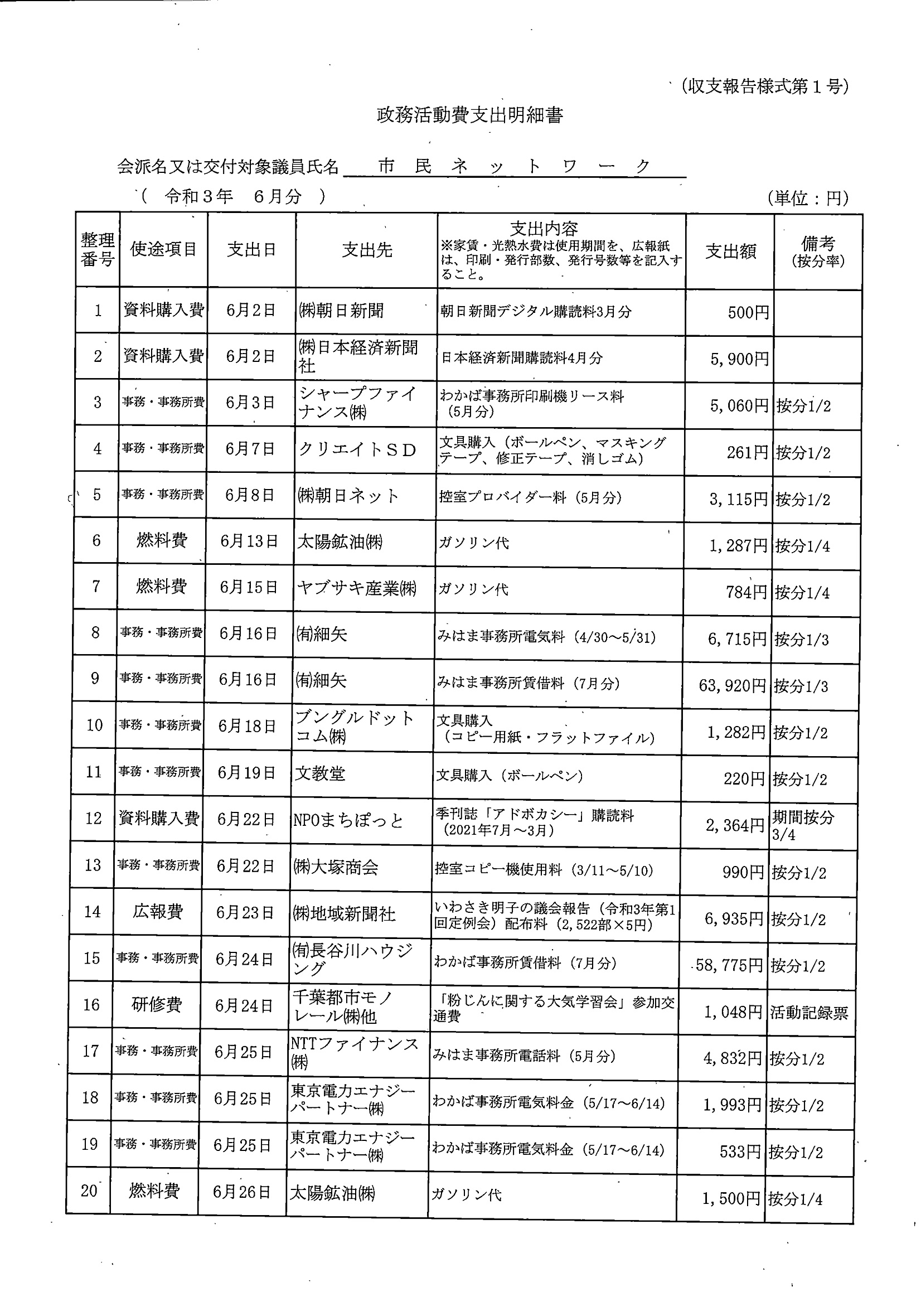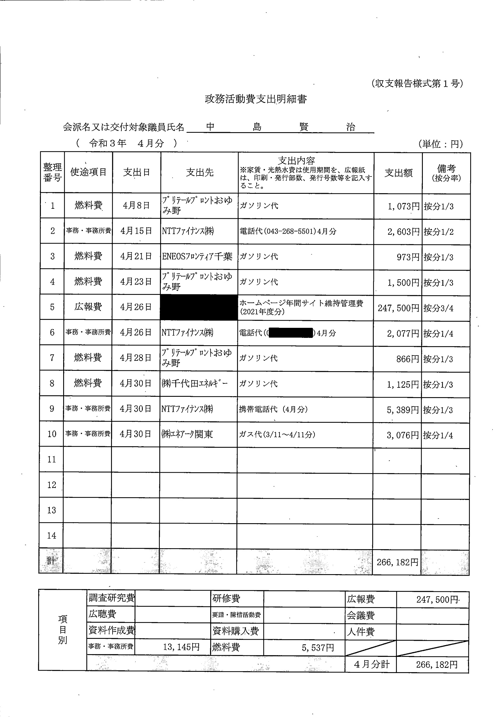 千葉市議会トップページ > 広報・情報公開 > 政務活動費 > 令和3年度交付分(政務活動費収支報告書)