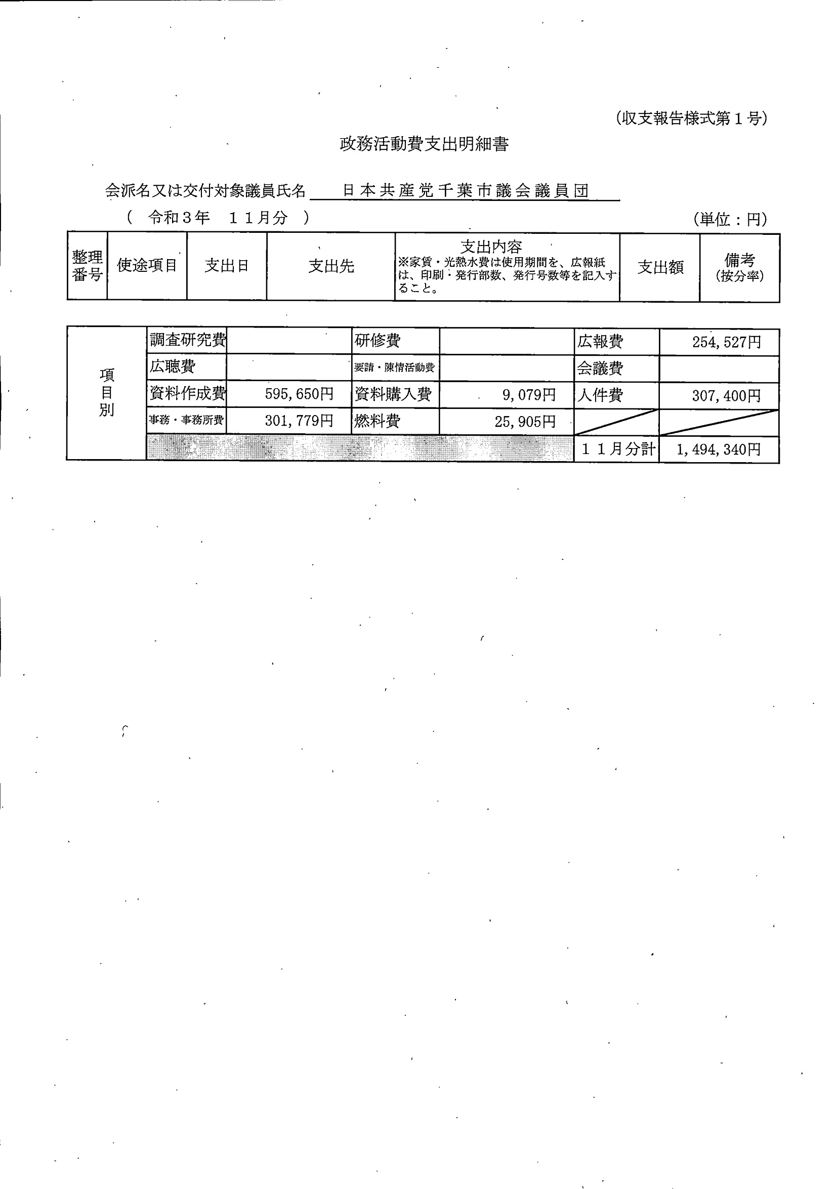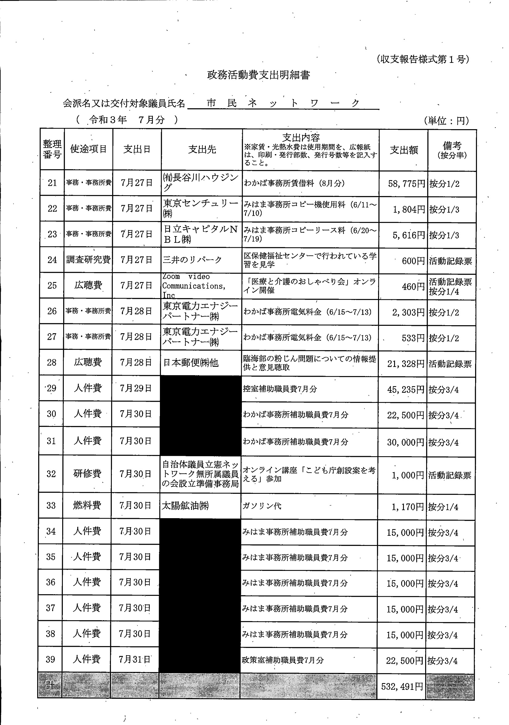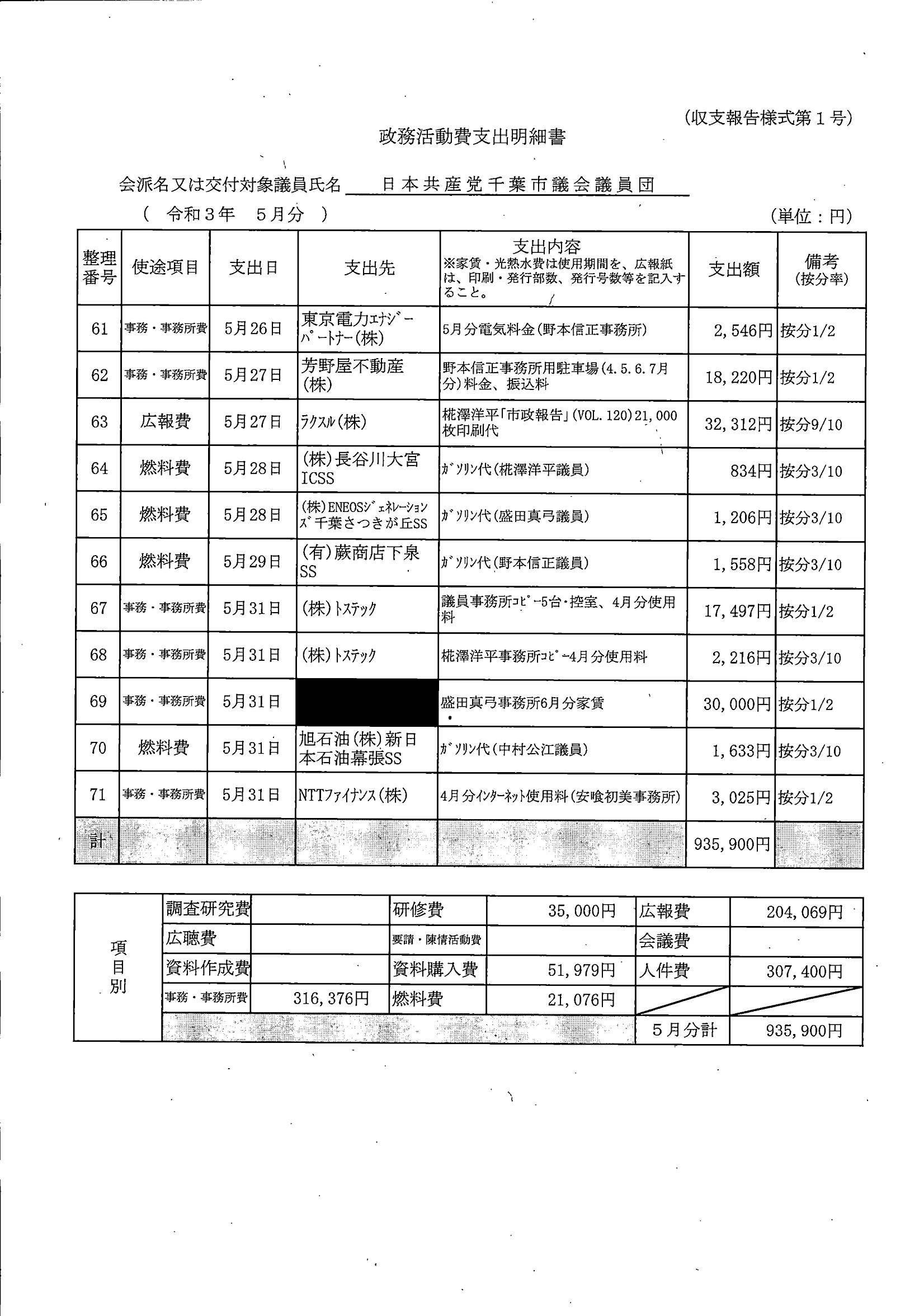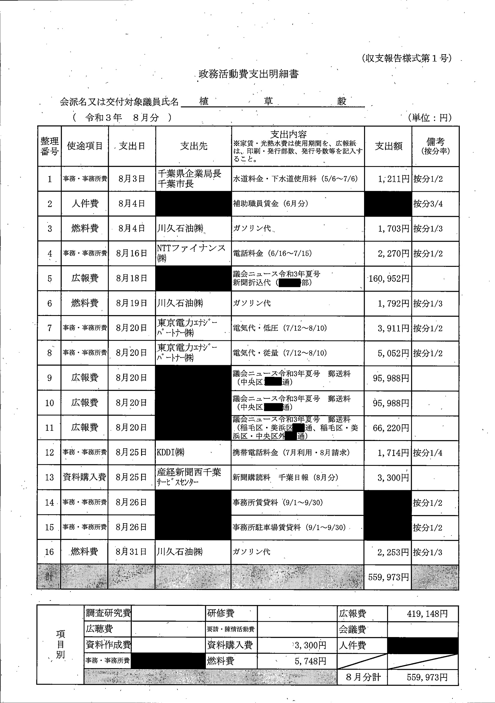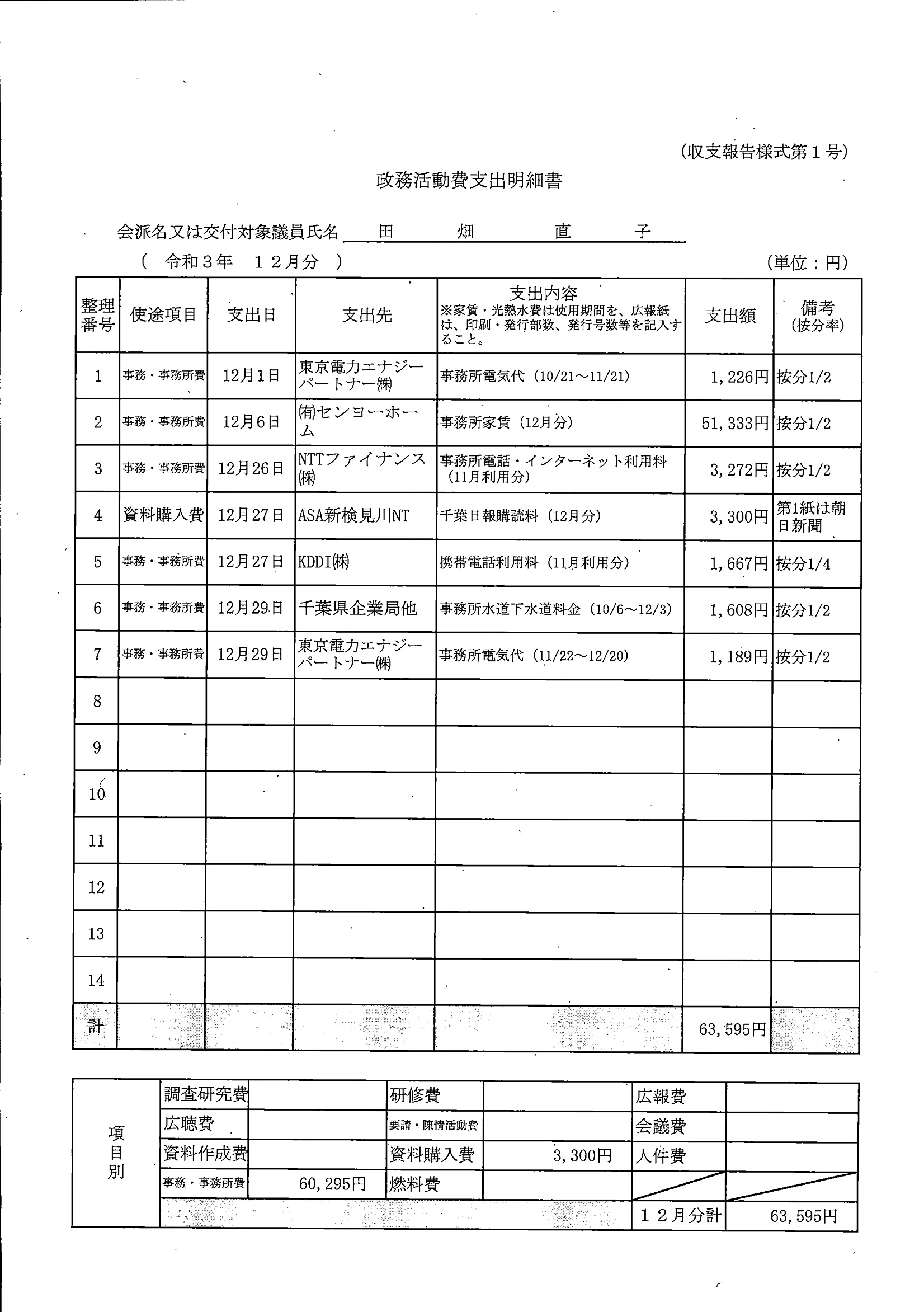 千葉市議会トップページ > 広報・情報公開 > 政務活動費 > 令和3年度交付分(政務活動費収支報告書)
