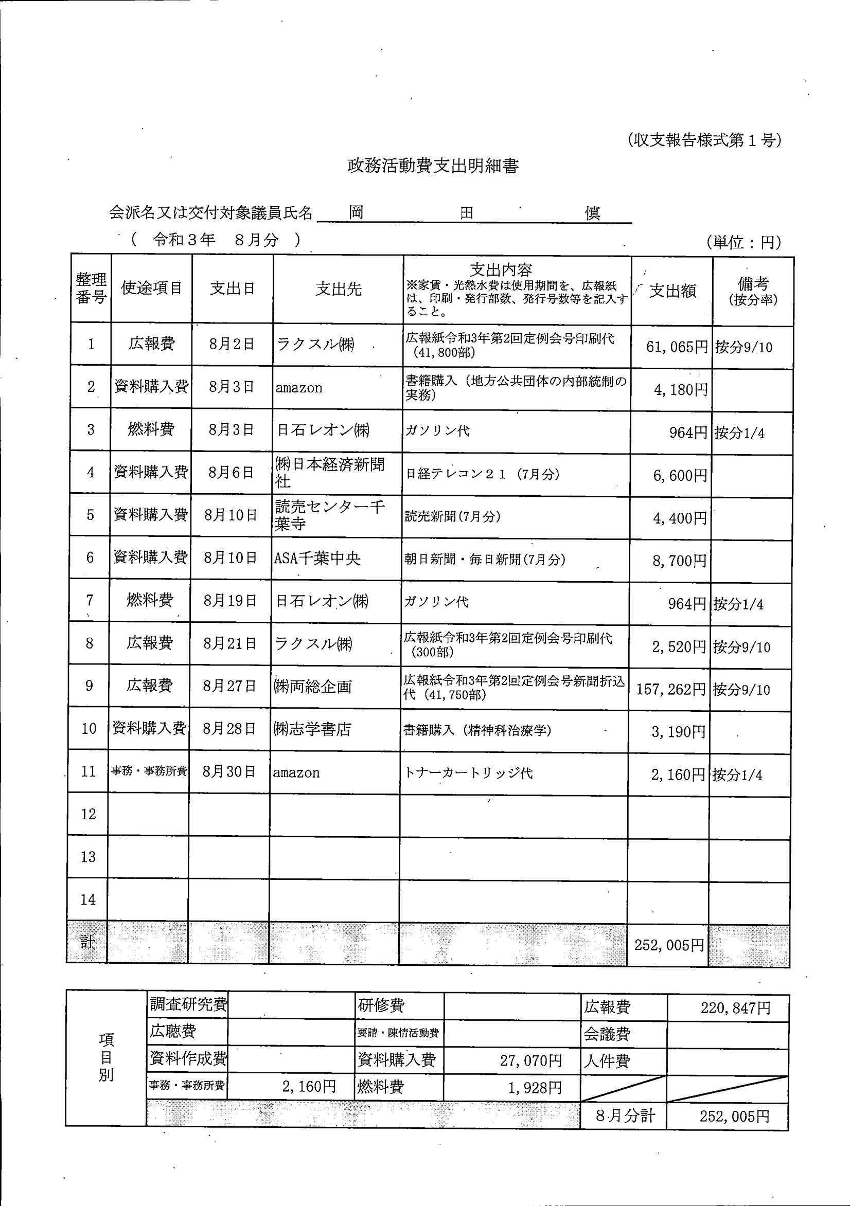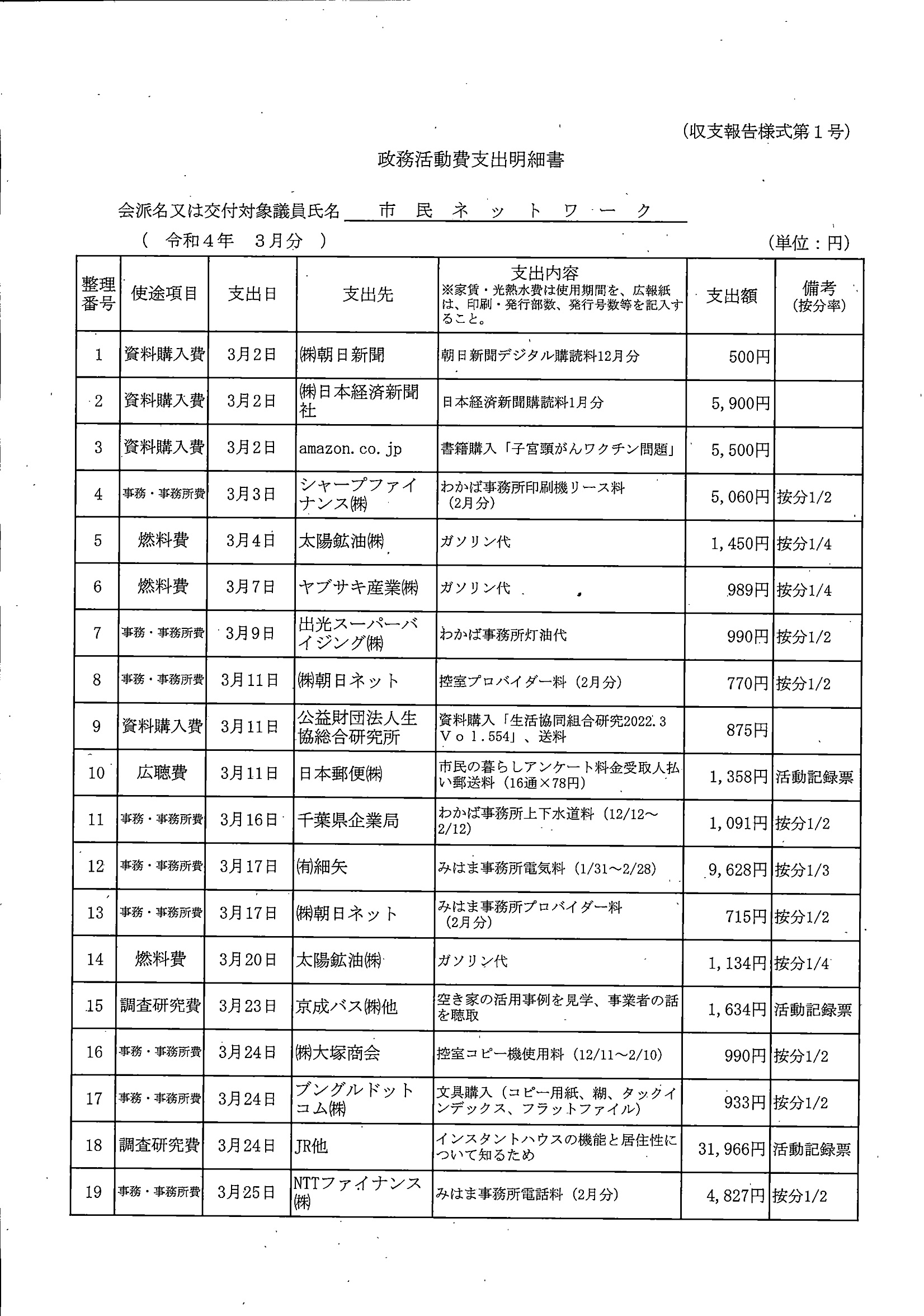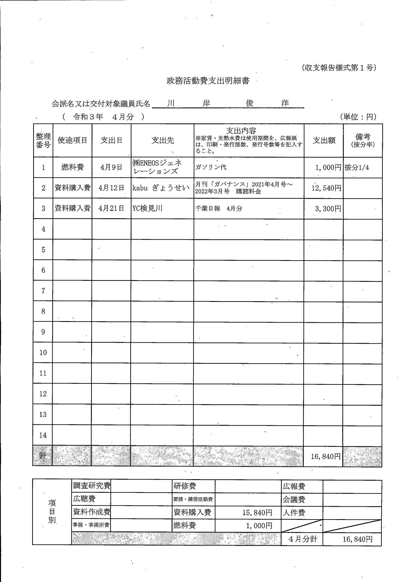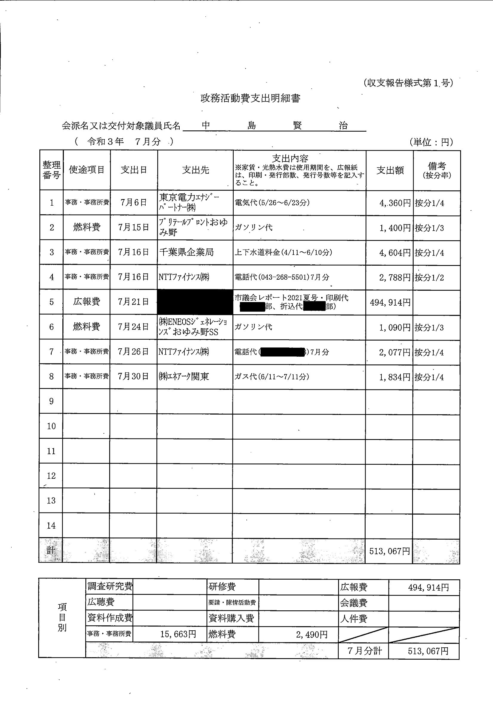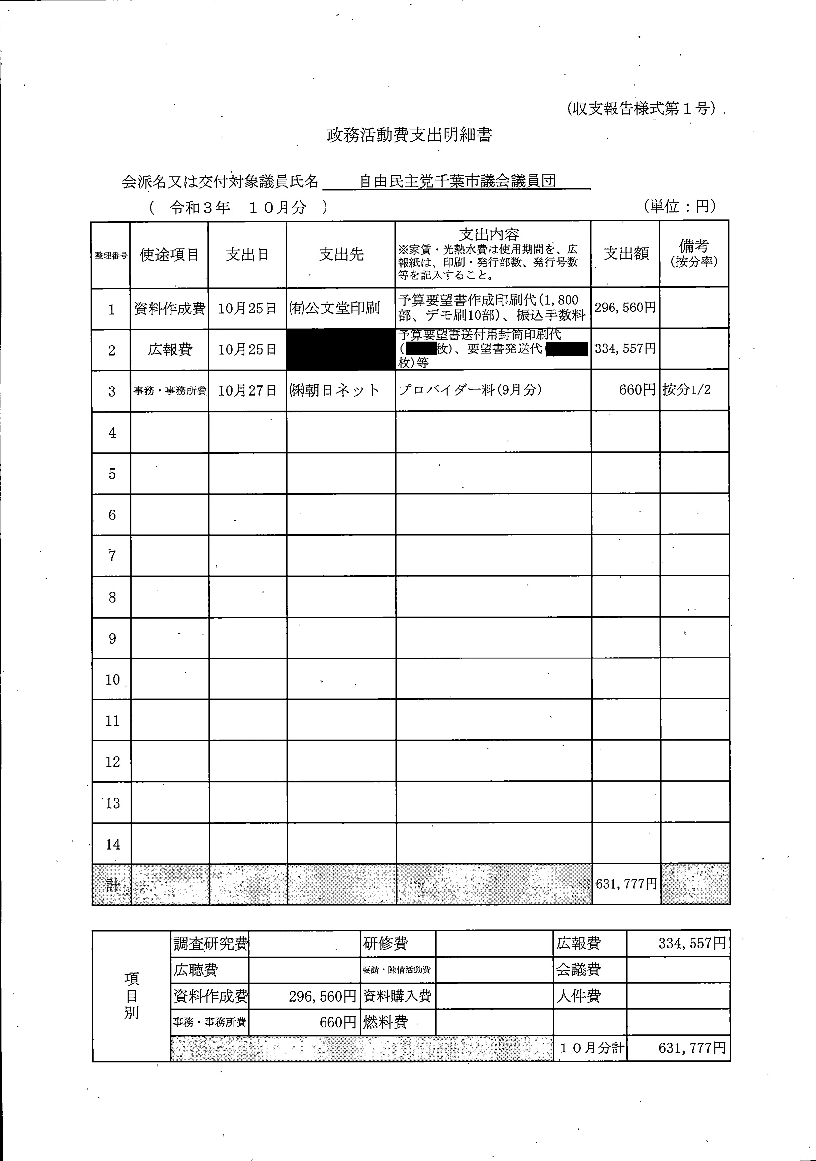 千葉市議会トップページ > 広報・情報公開 > 政務活動費 > 令和3年度交付分(政務活動費収支報告書)