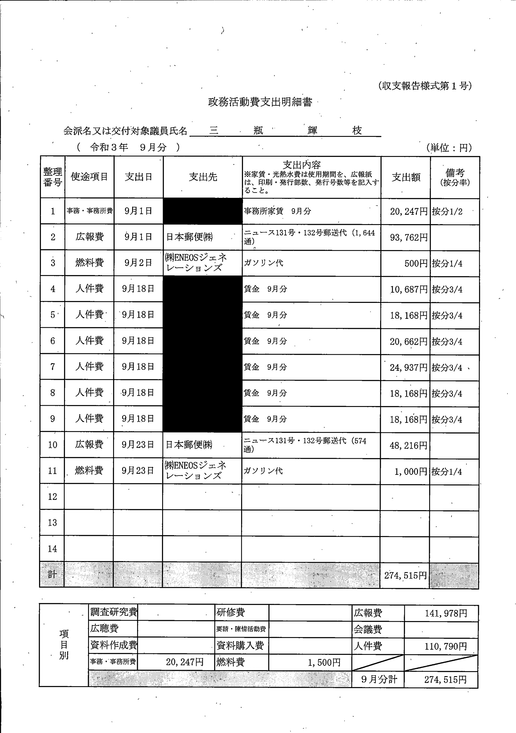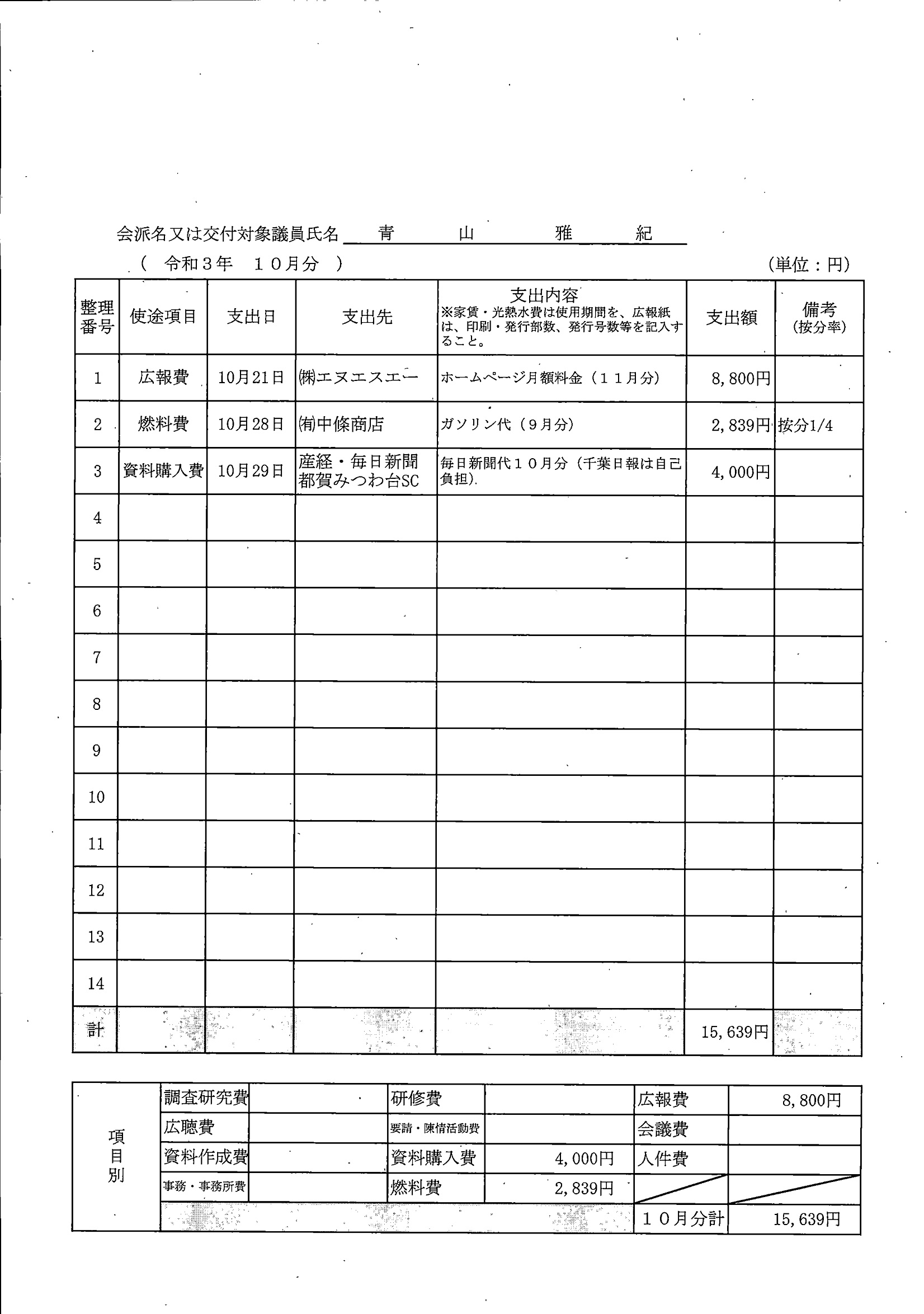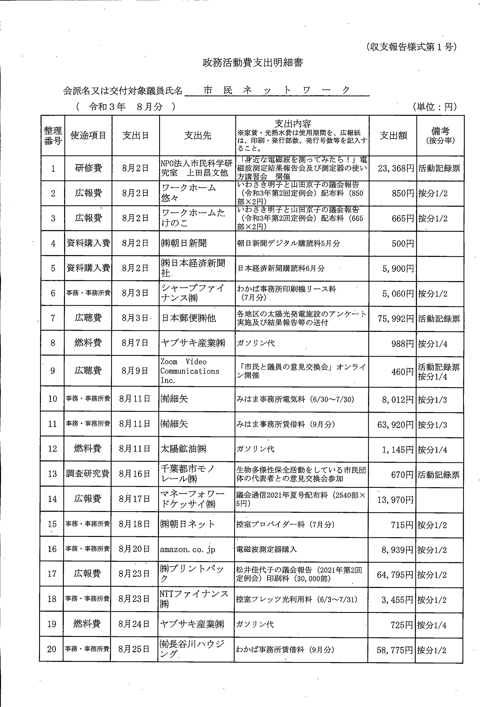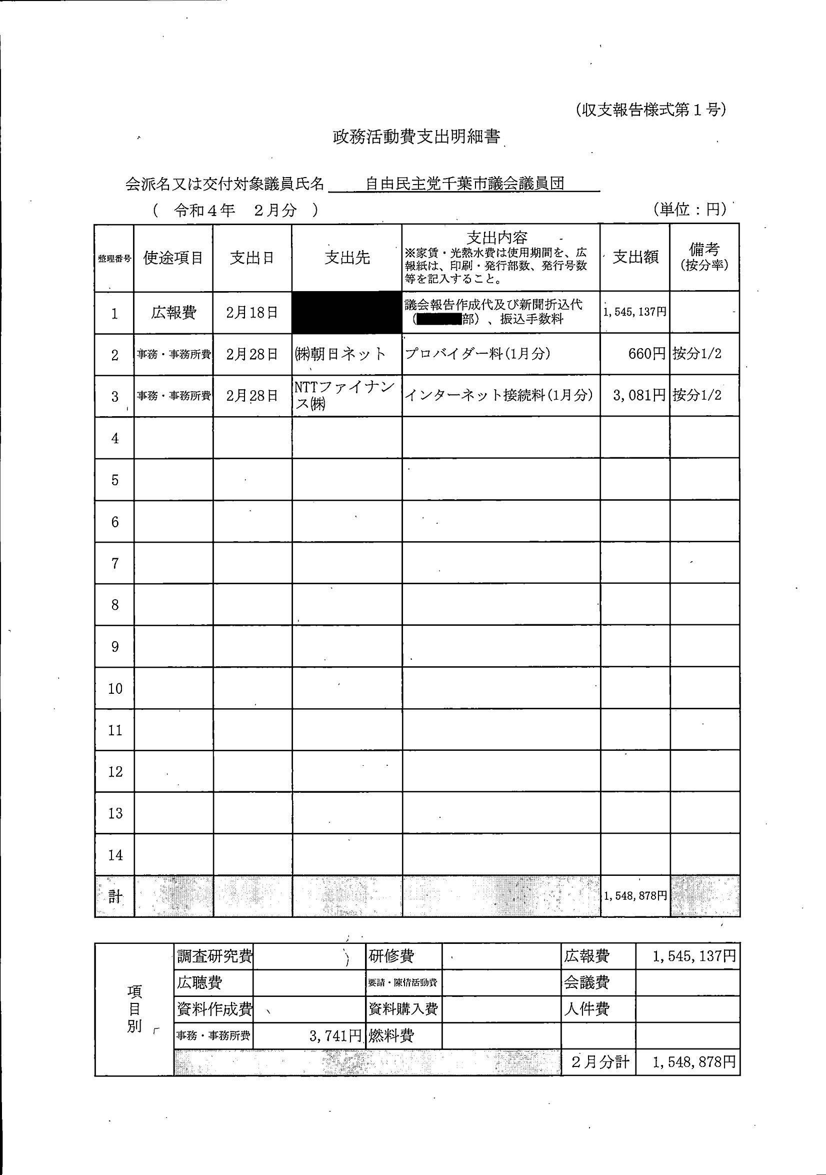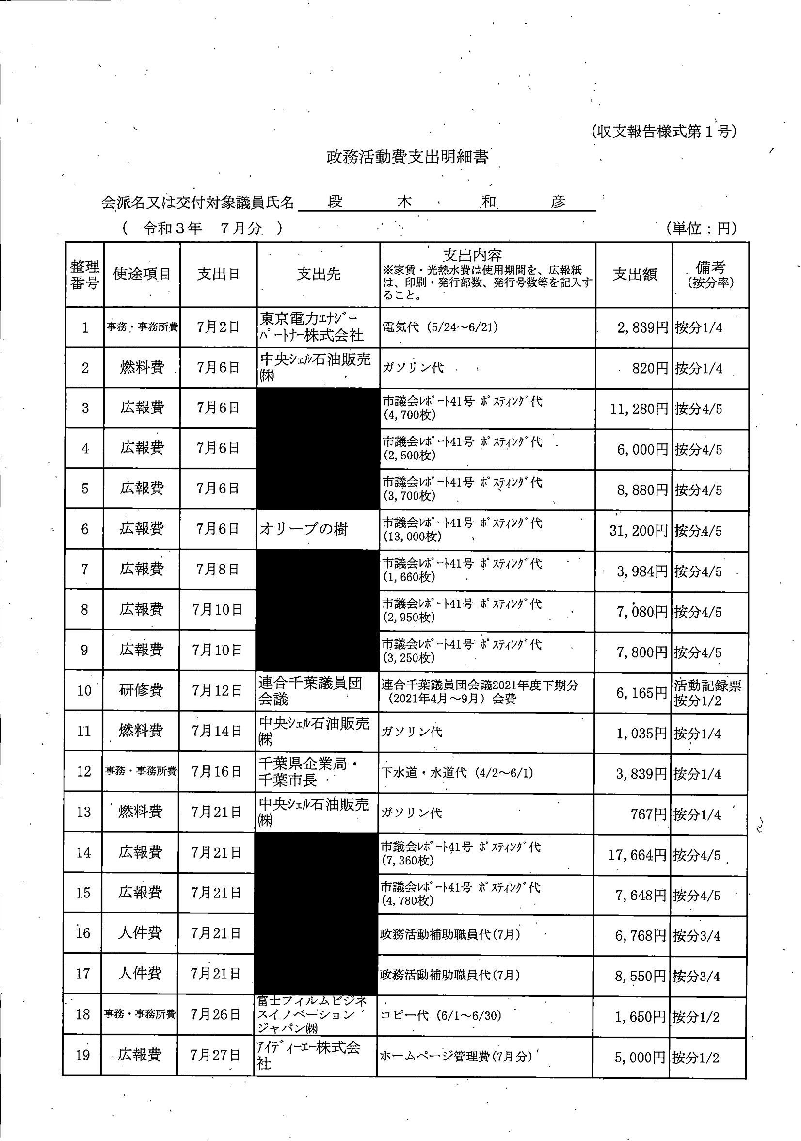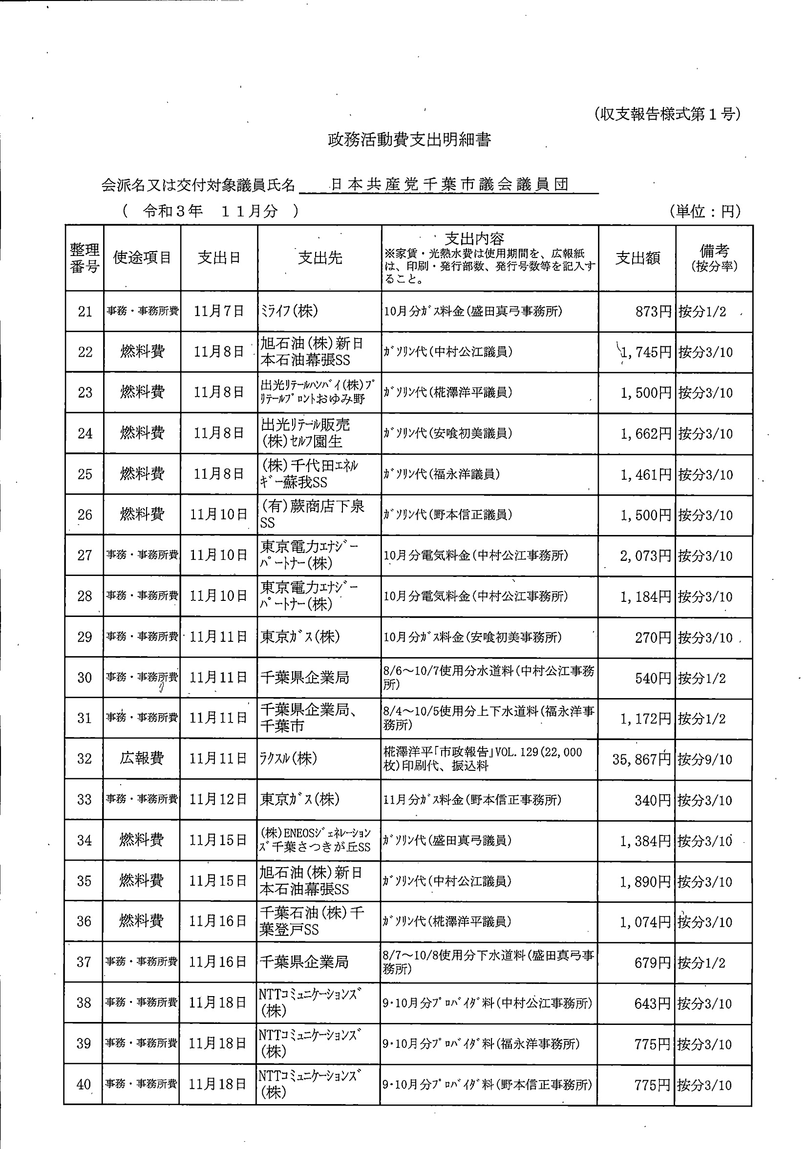 千葉市議会トップページ > 広報・情報公開 > 政務活動費 > 令和3年度交付分(政務活動費収支報告書)