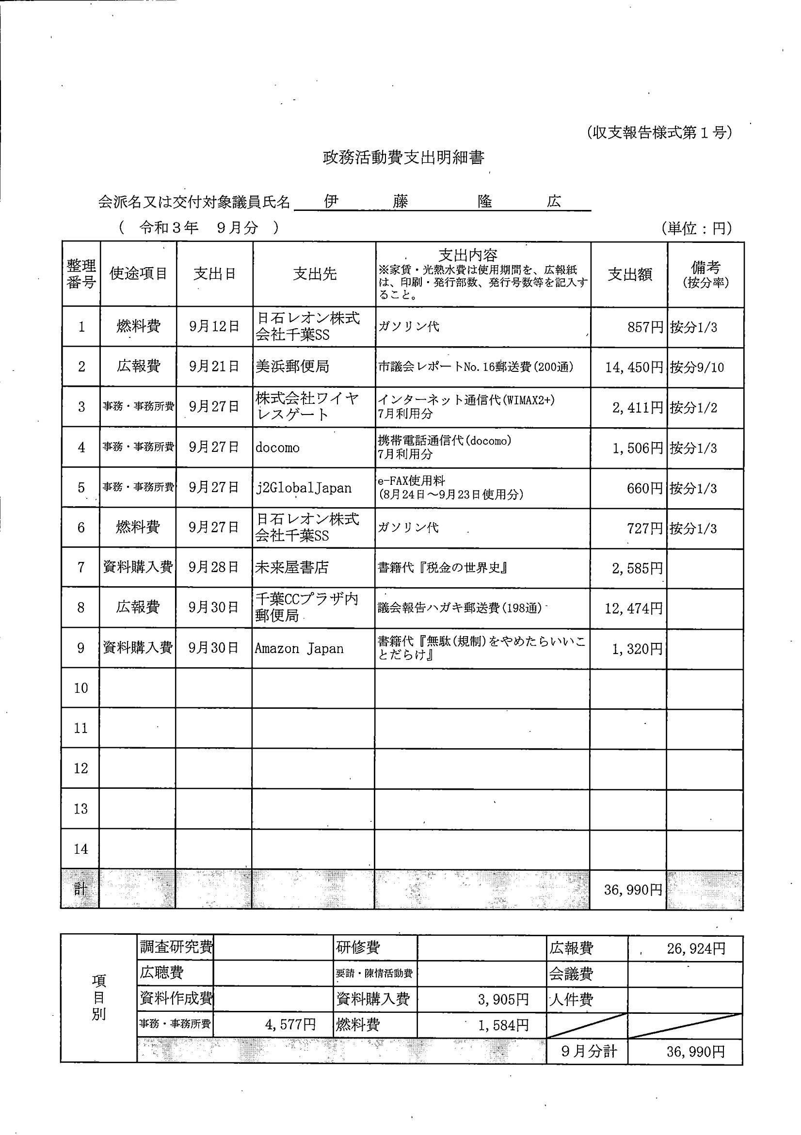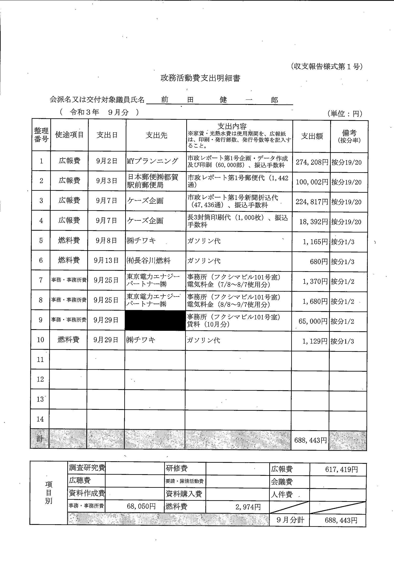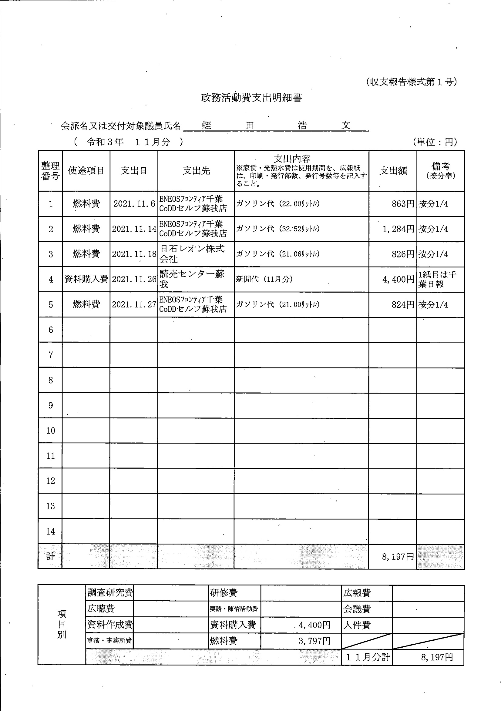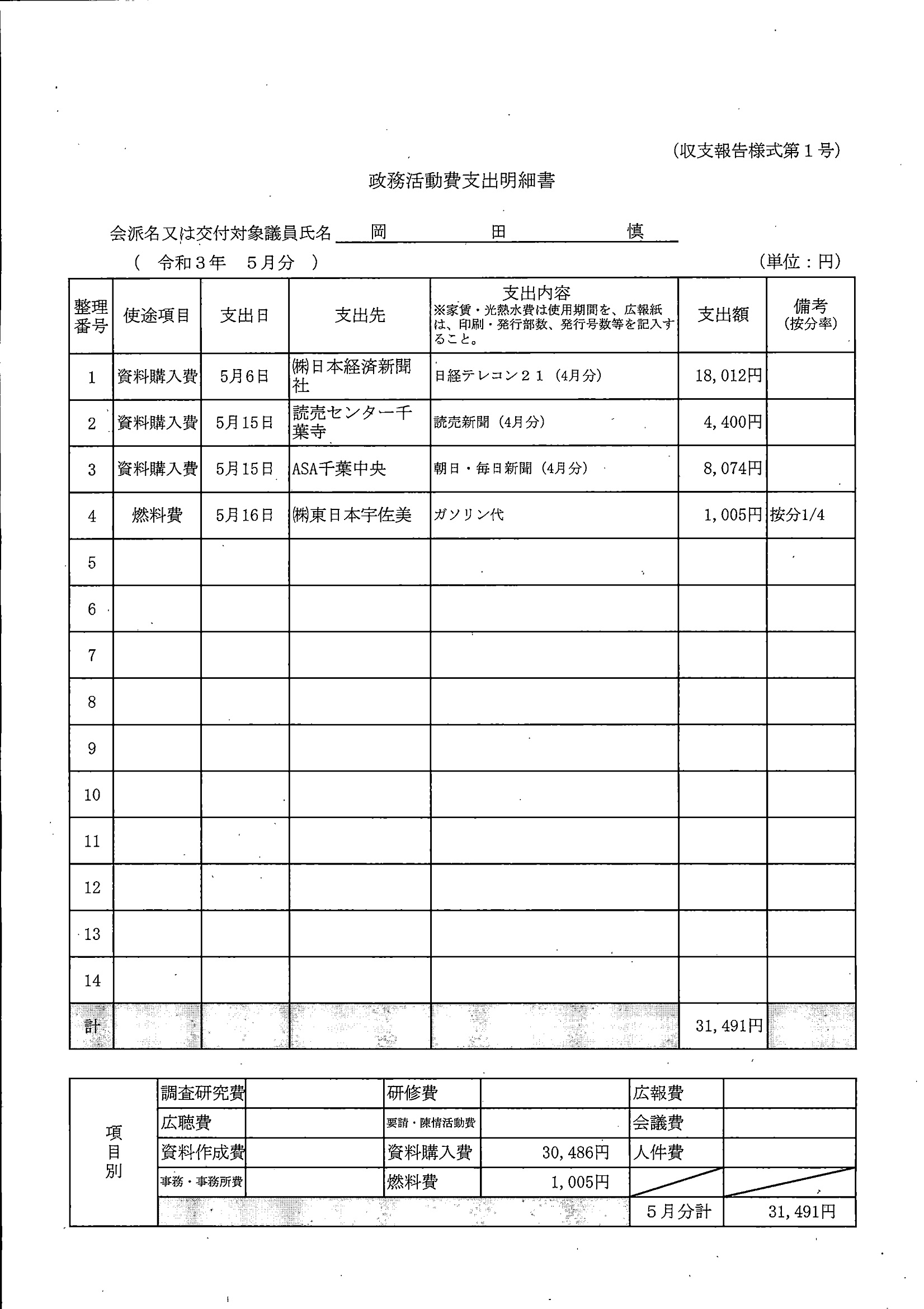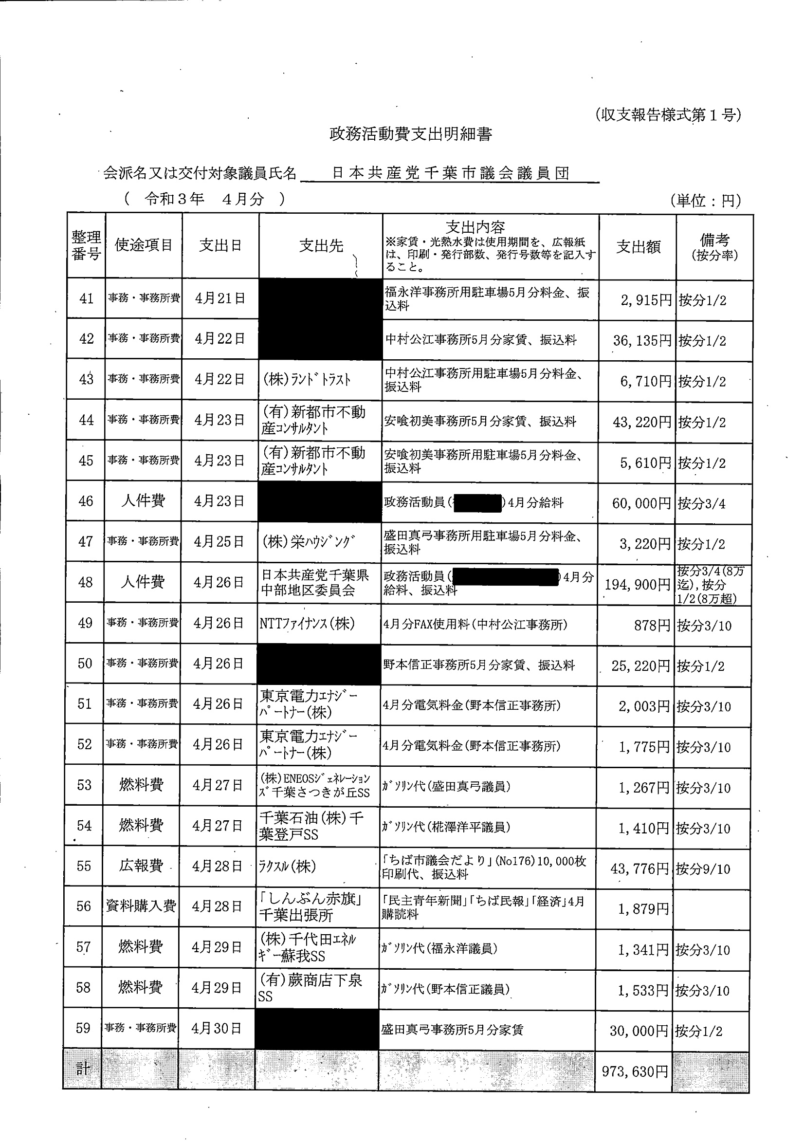千葉市議会トップページ > 広報・情報公開 > 政務活動費 > 令和3年度交付分(政務活動費収支報告書)