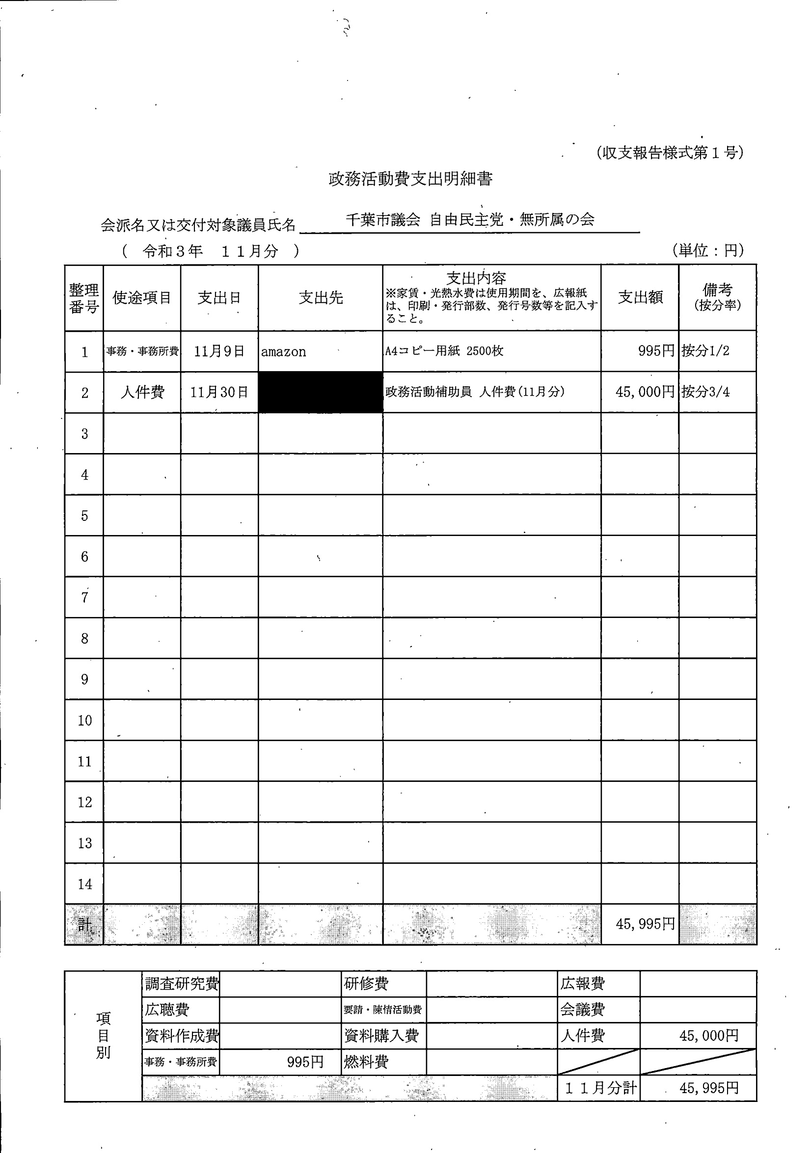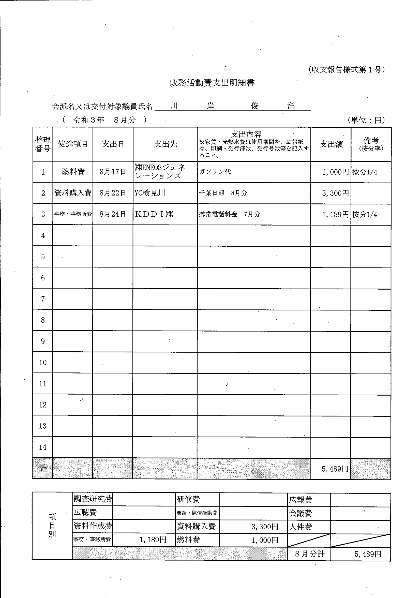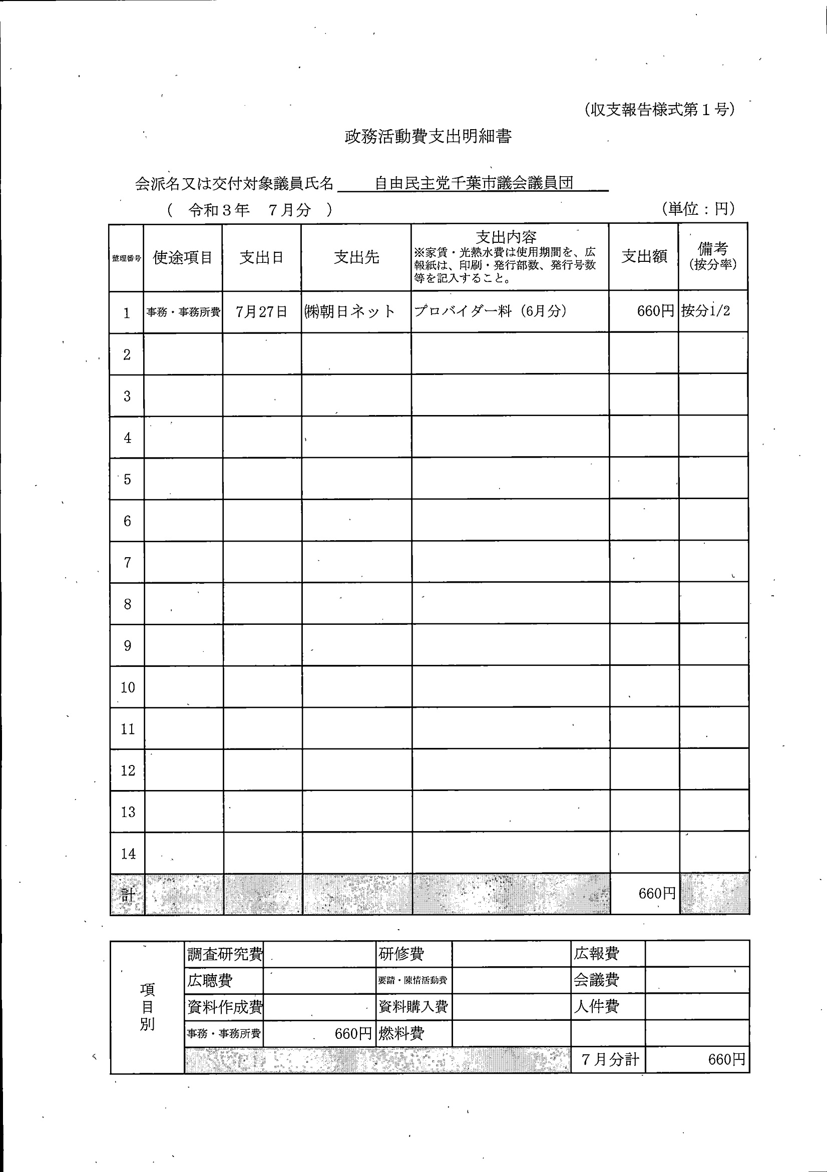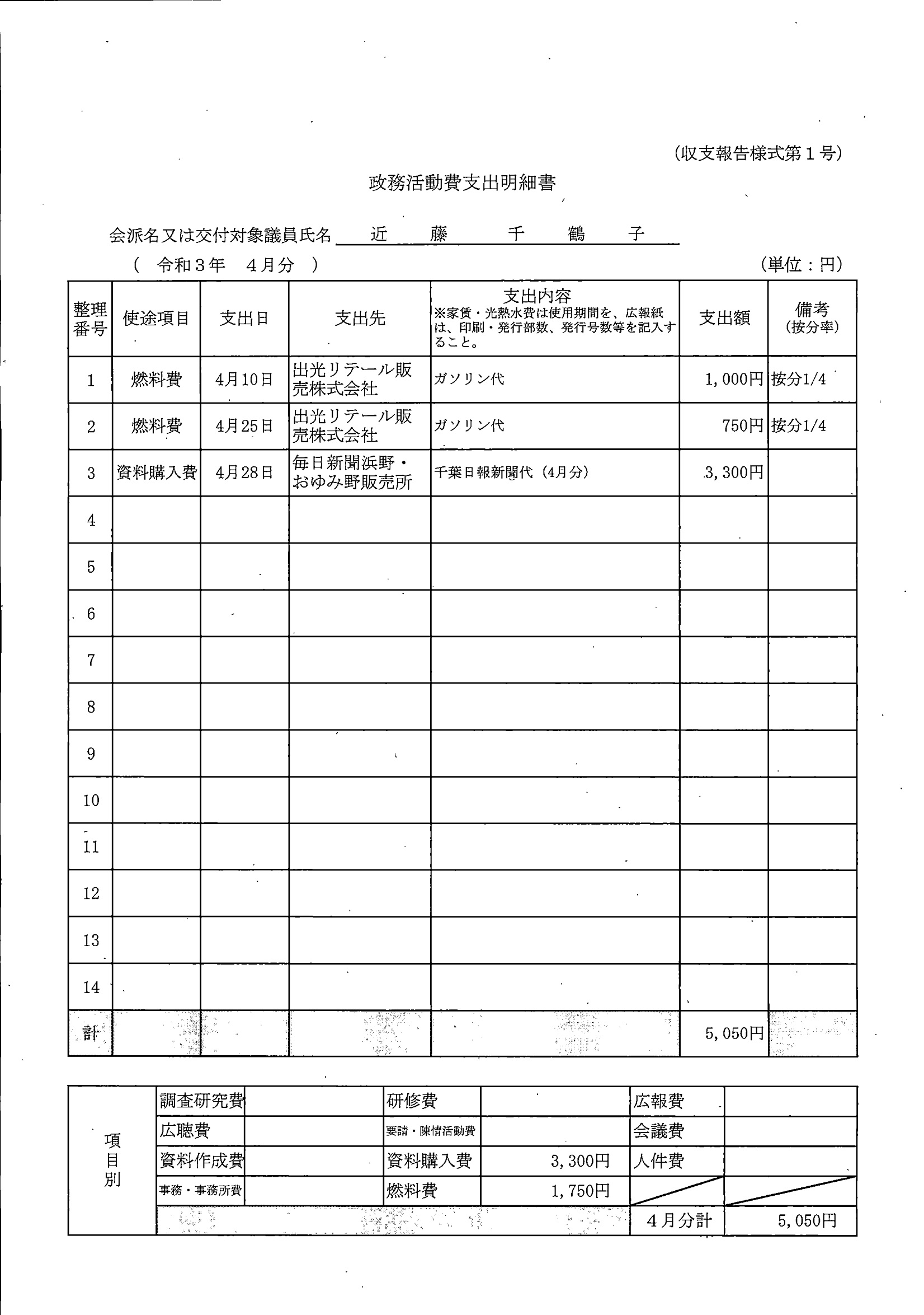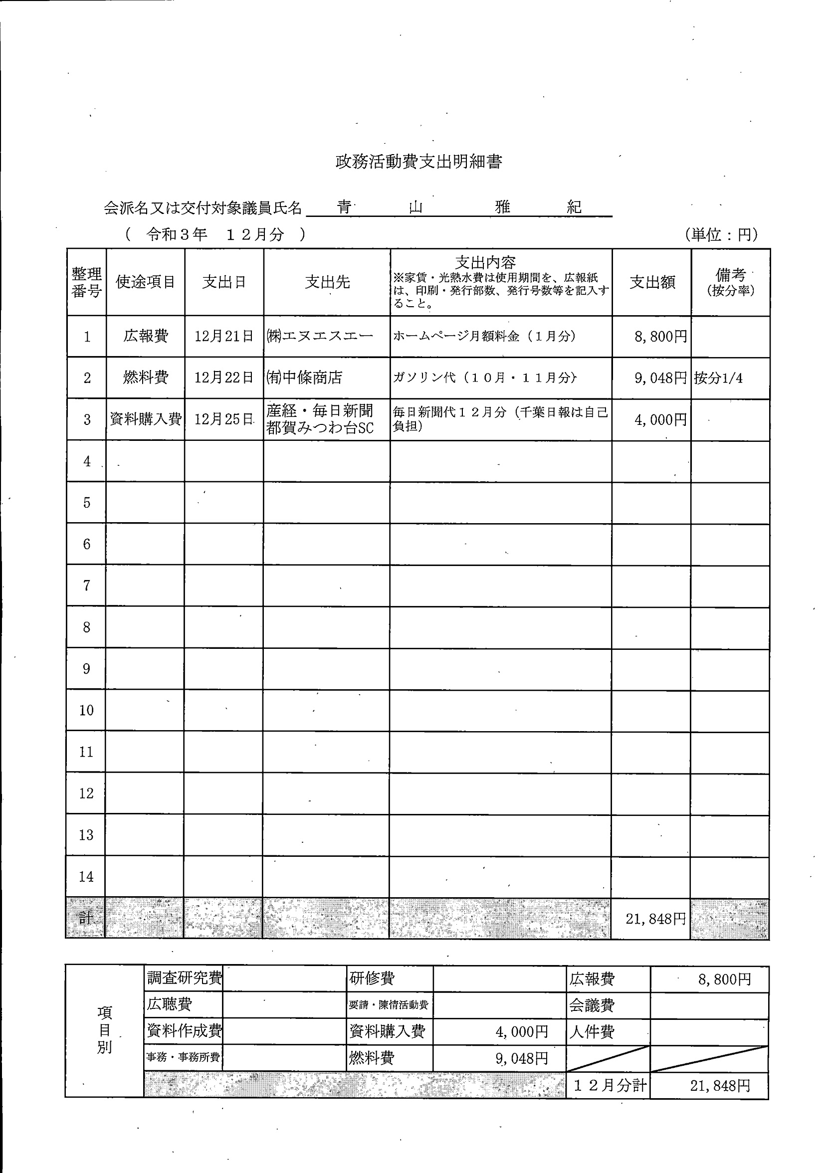 千葉市議会トップページ > 広報・情報公開 > 政務活動費 > 令和3年度交付分(政務活動費収支報告書)