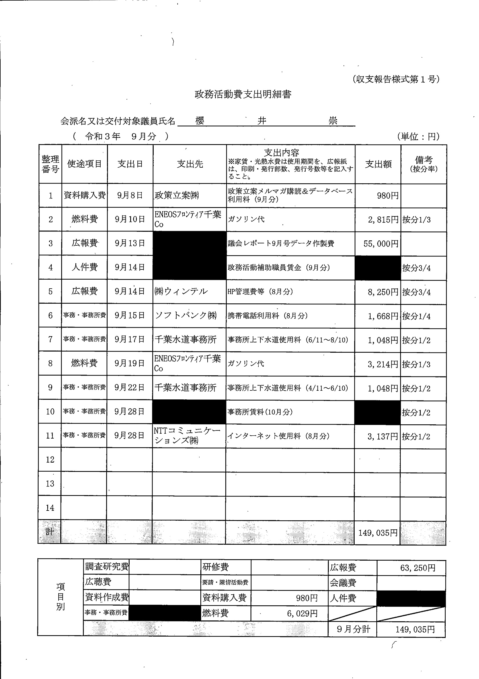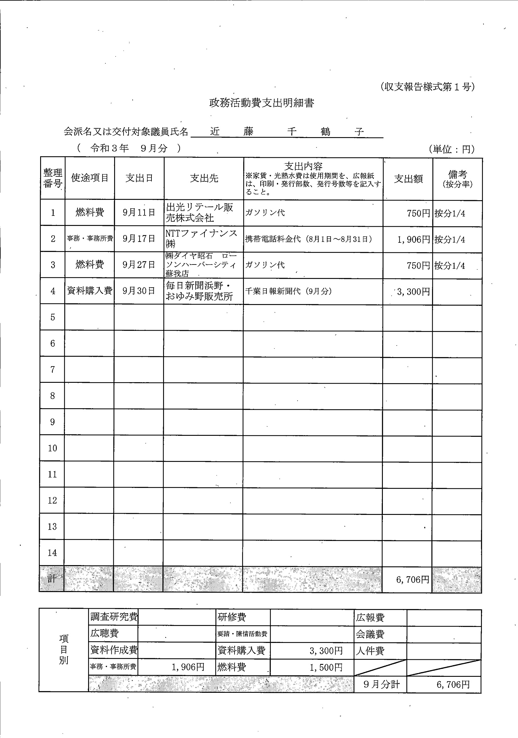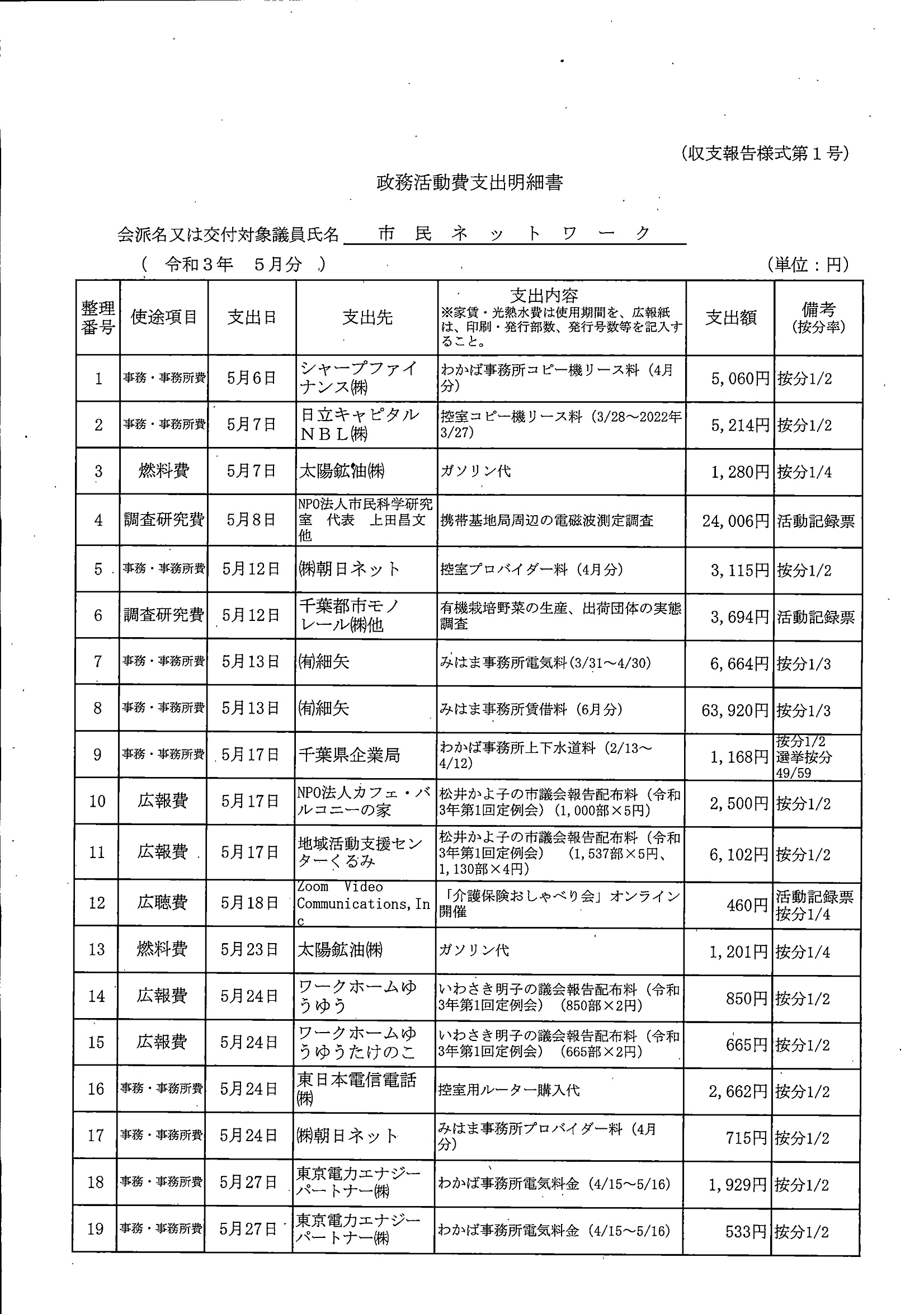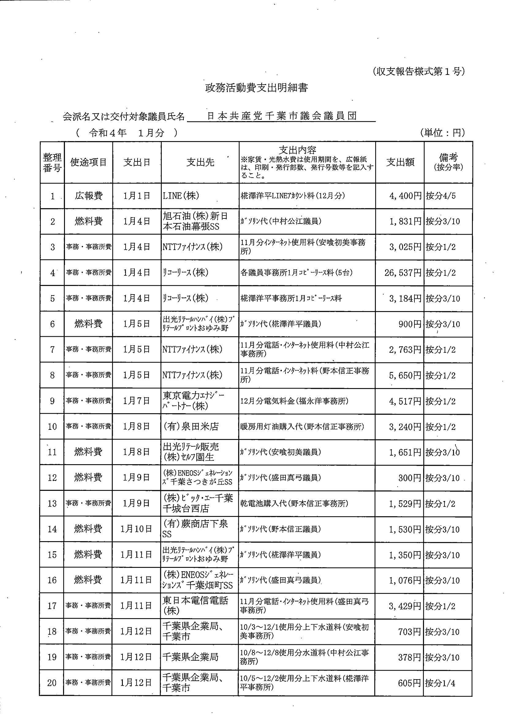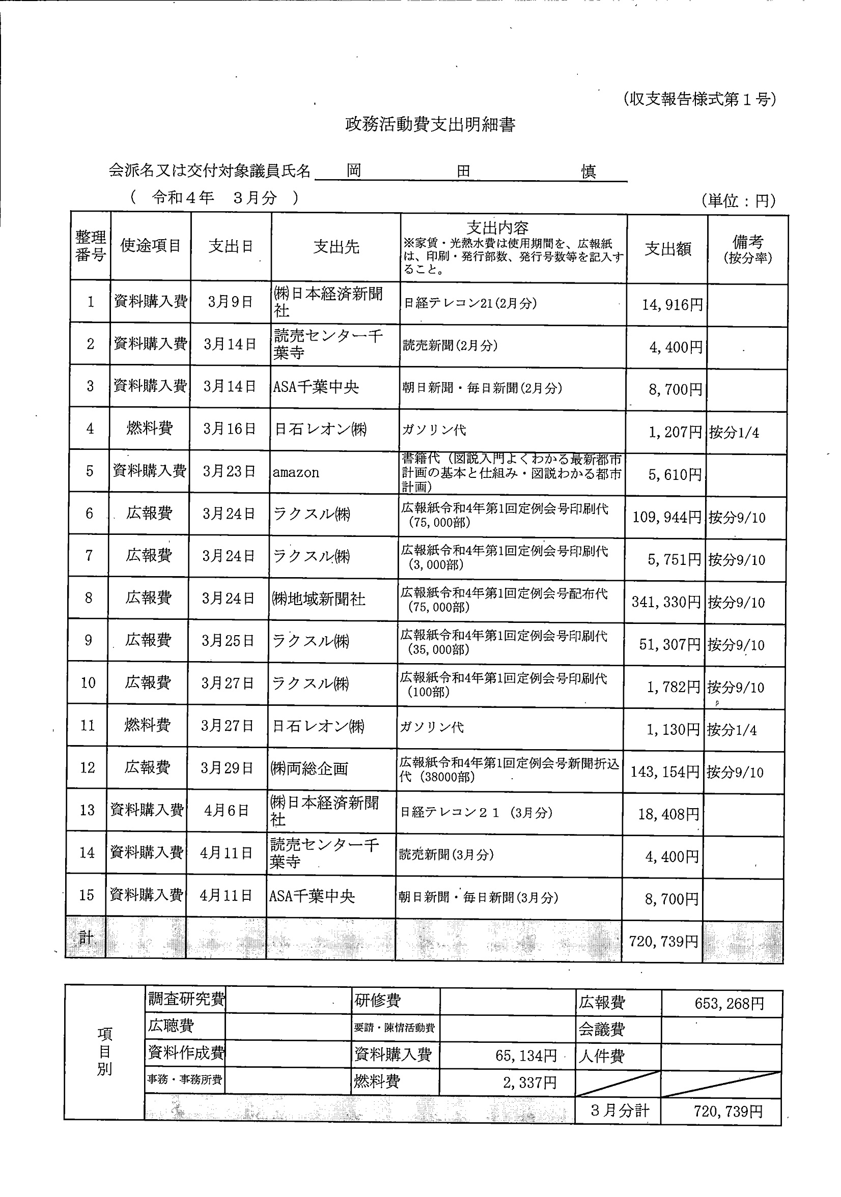 千葉市議会トップページ > 広報・情報公開 > 政務活動費 > 令和3年度交付分(政務活動費収支報告書)