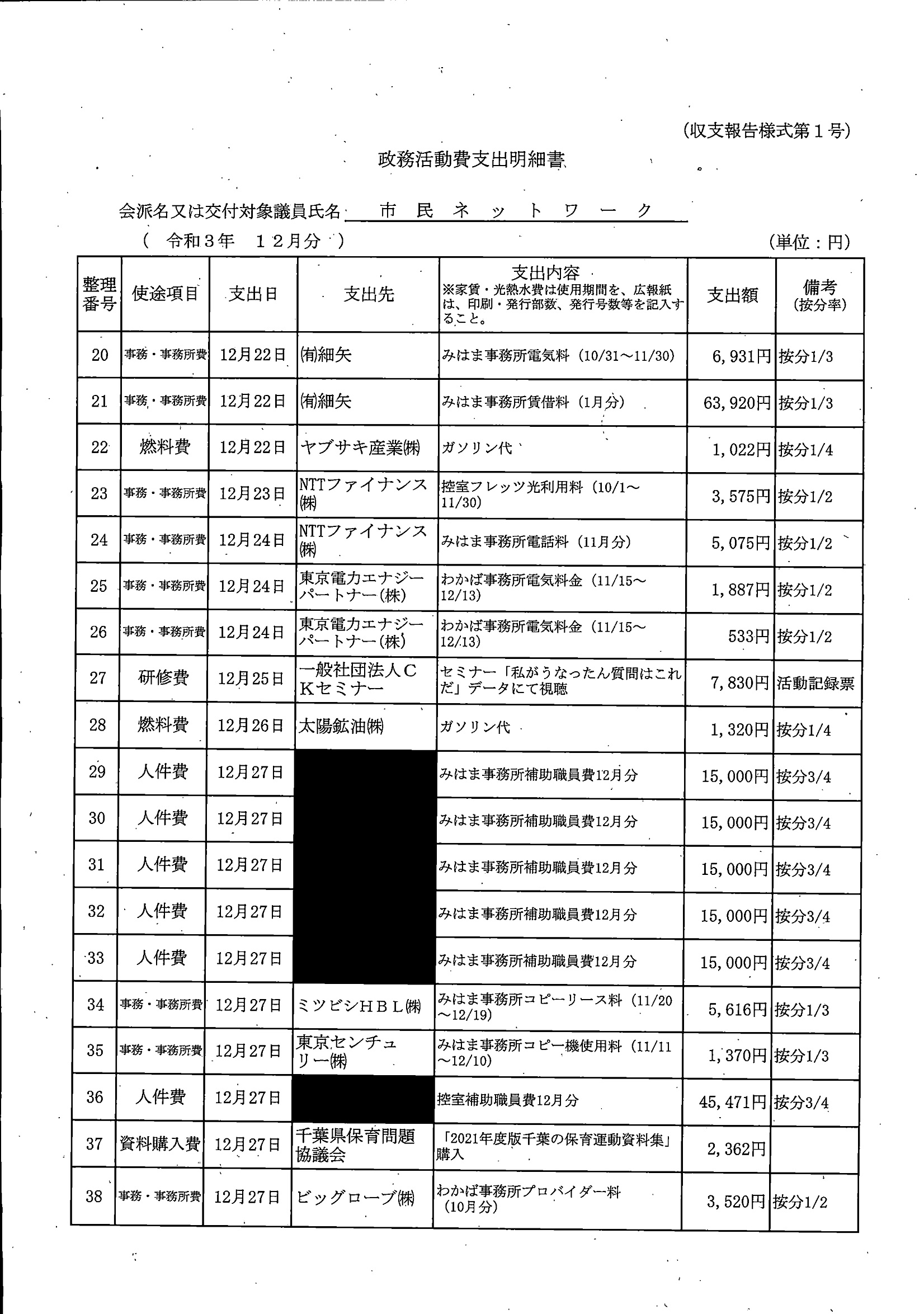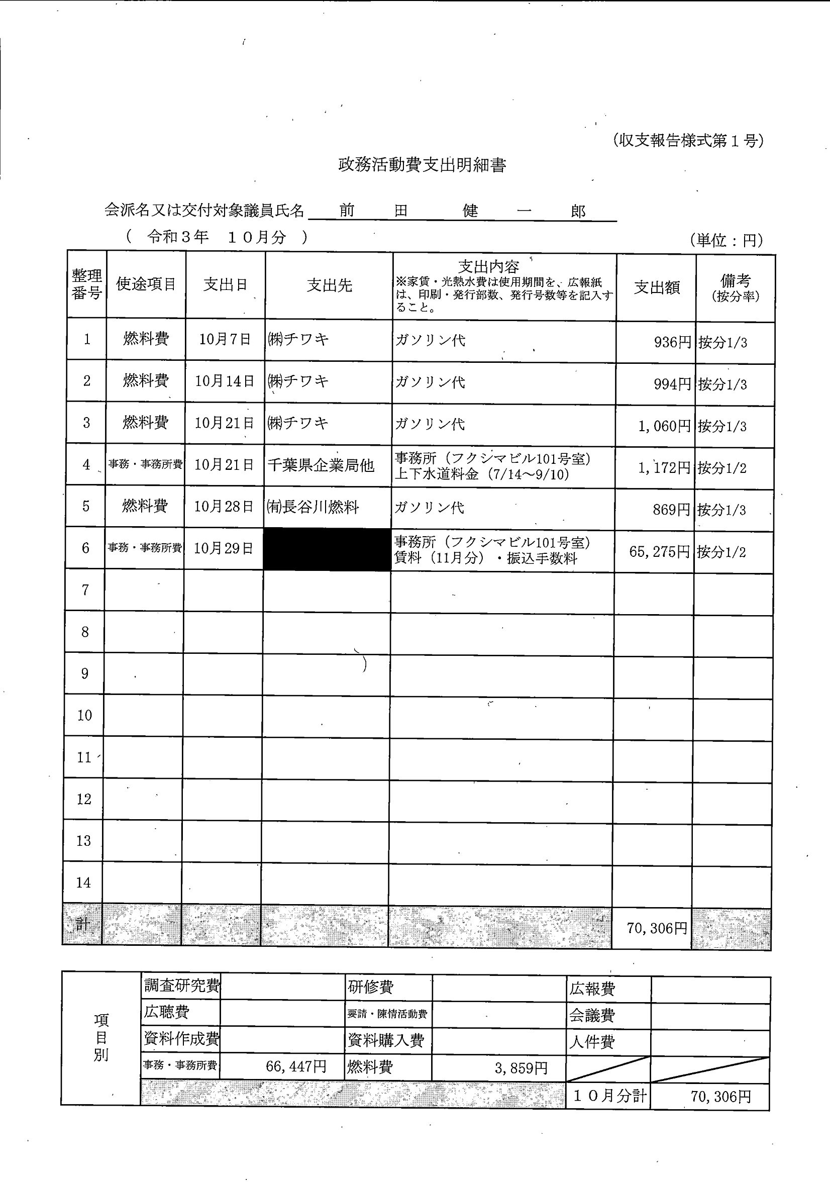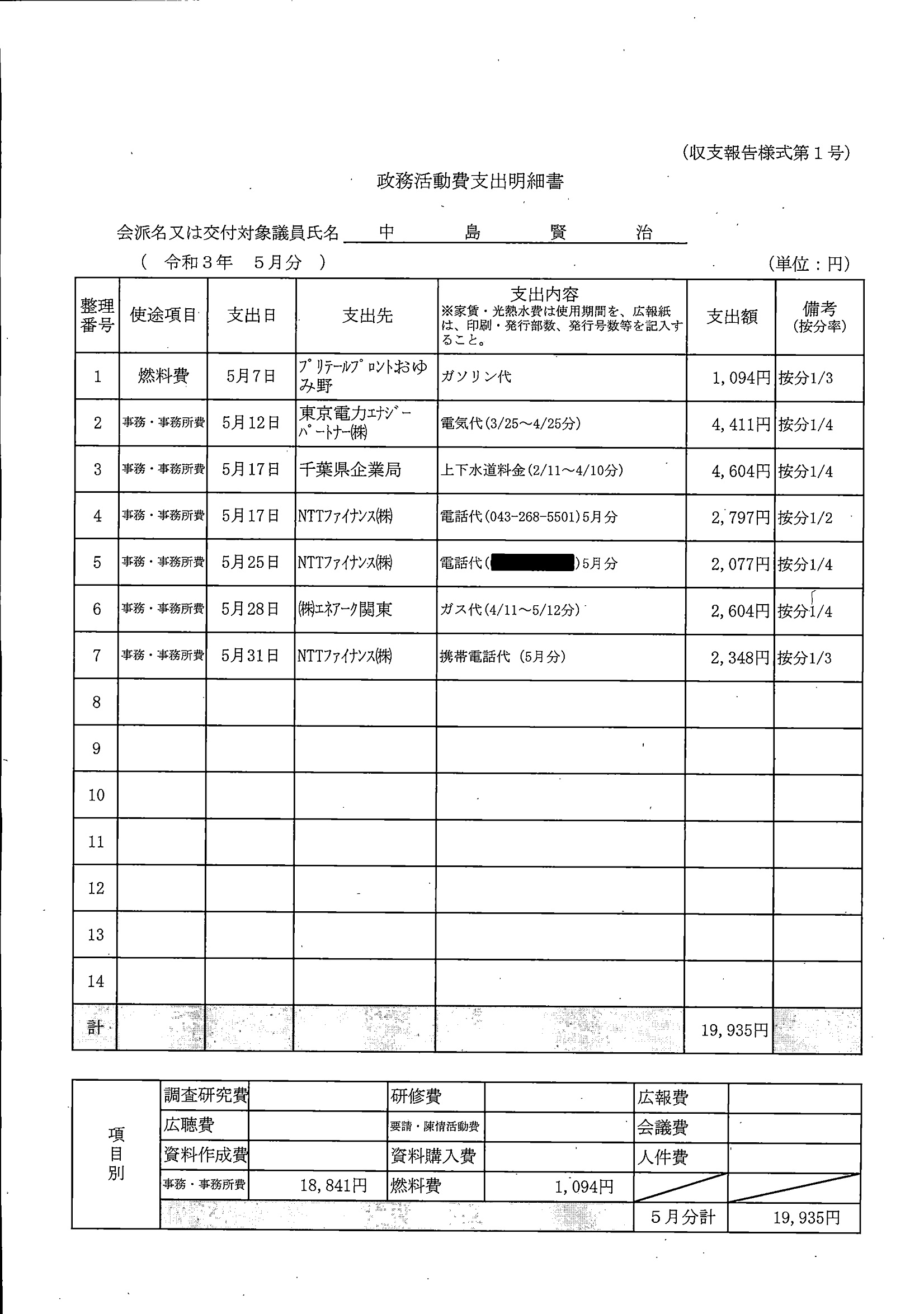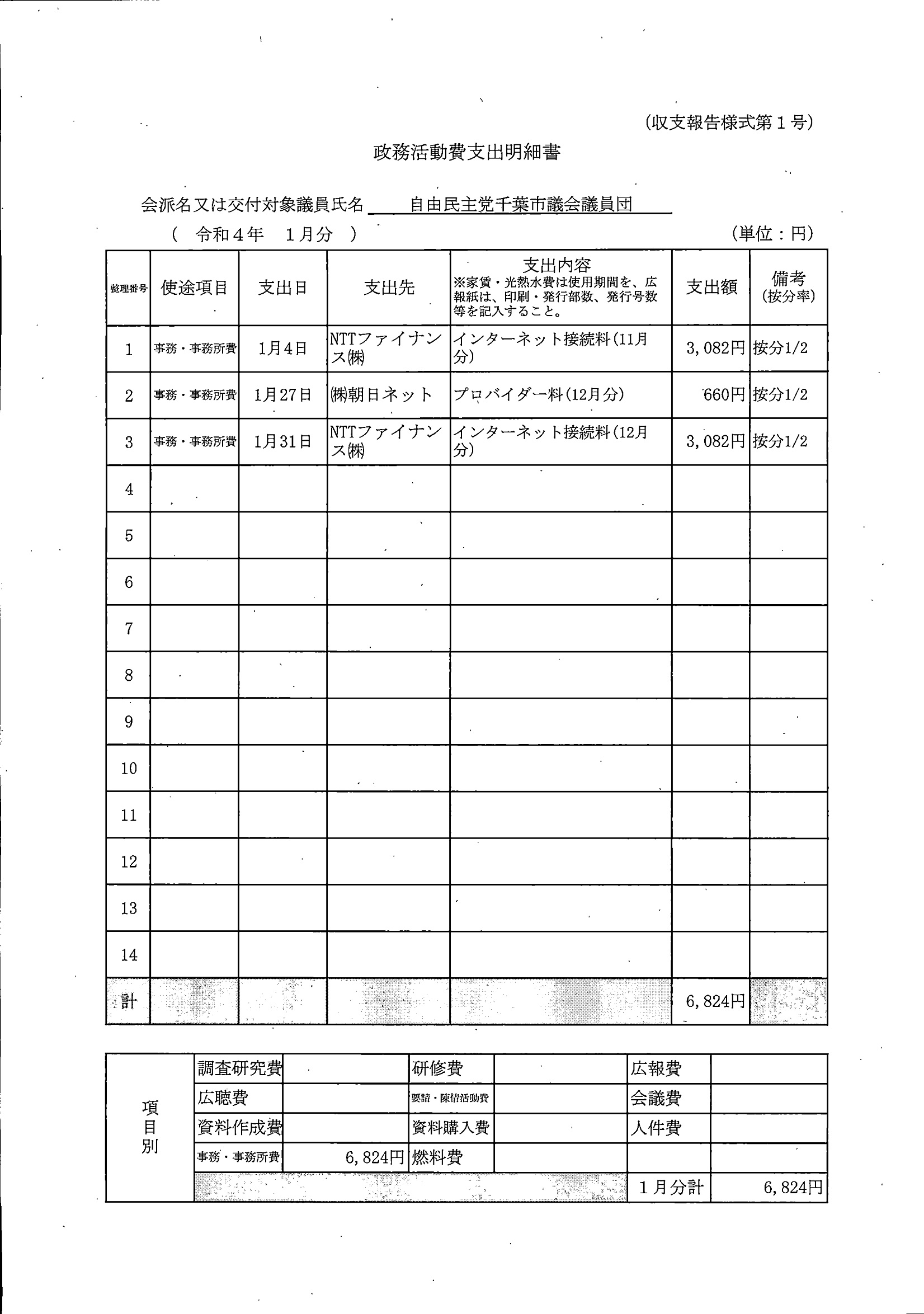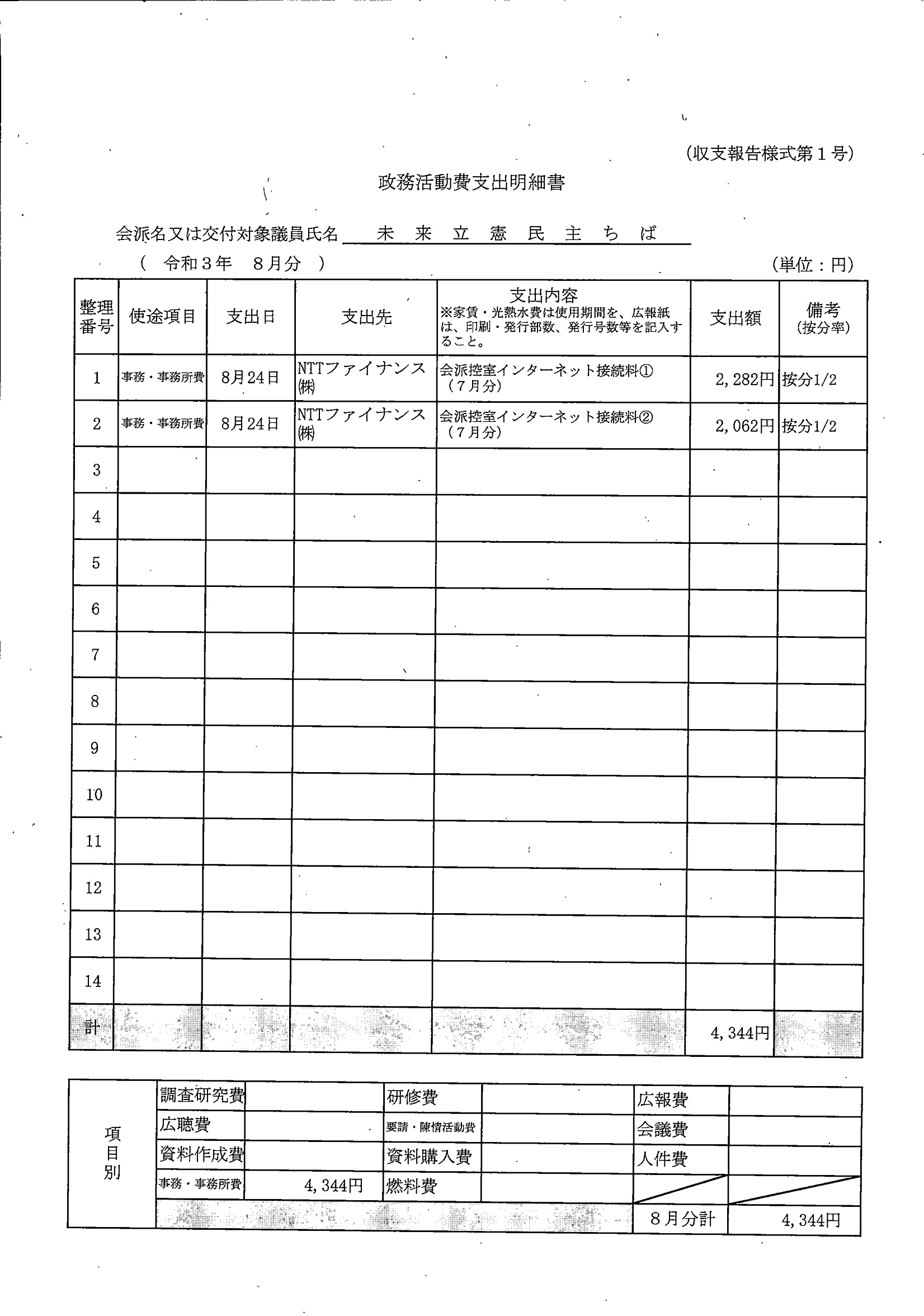千葉市議会トップページ > 広報・情報公開 > 政務活動費 > 令和3年度交付分(政務活動費収支報告書)