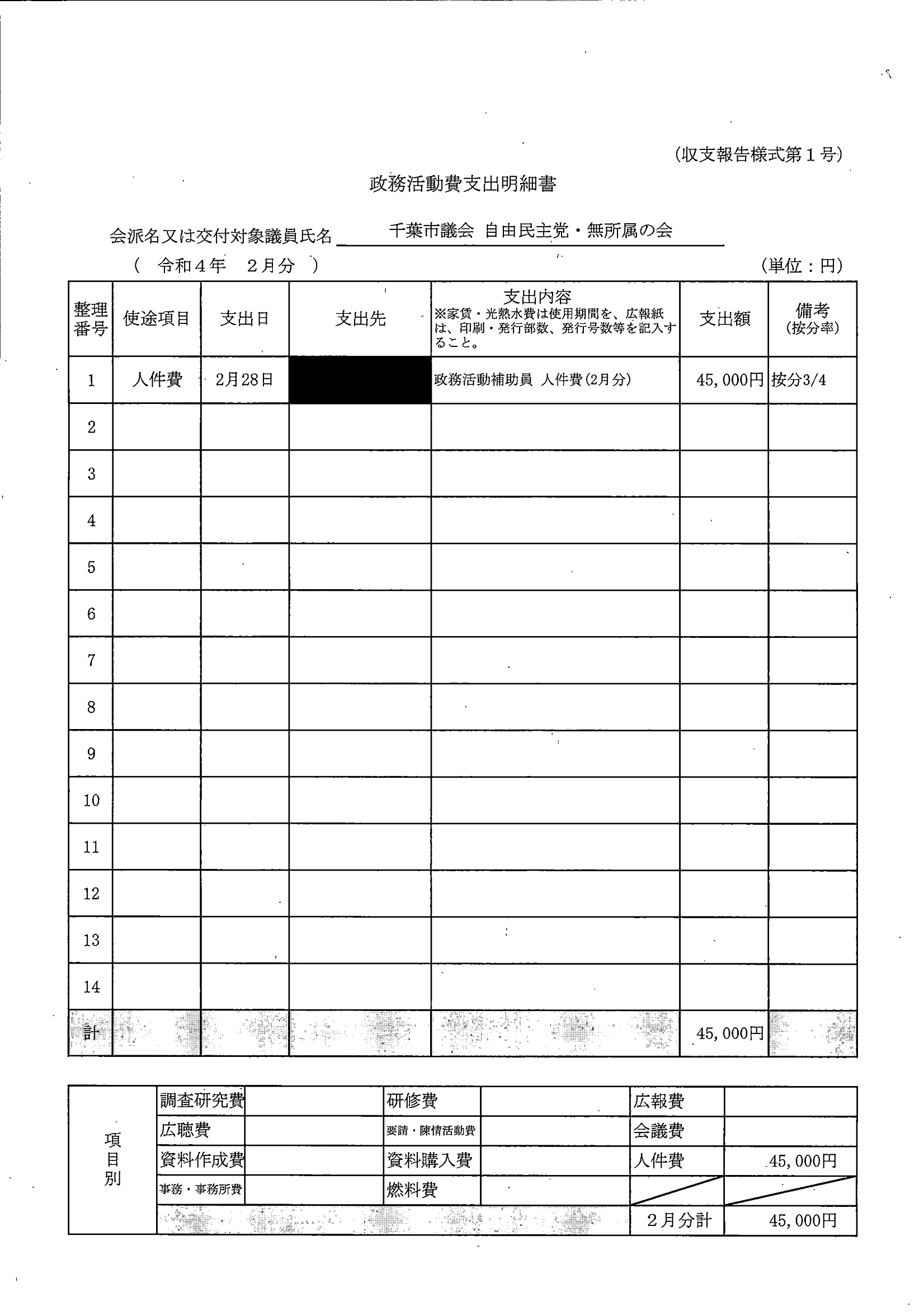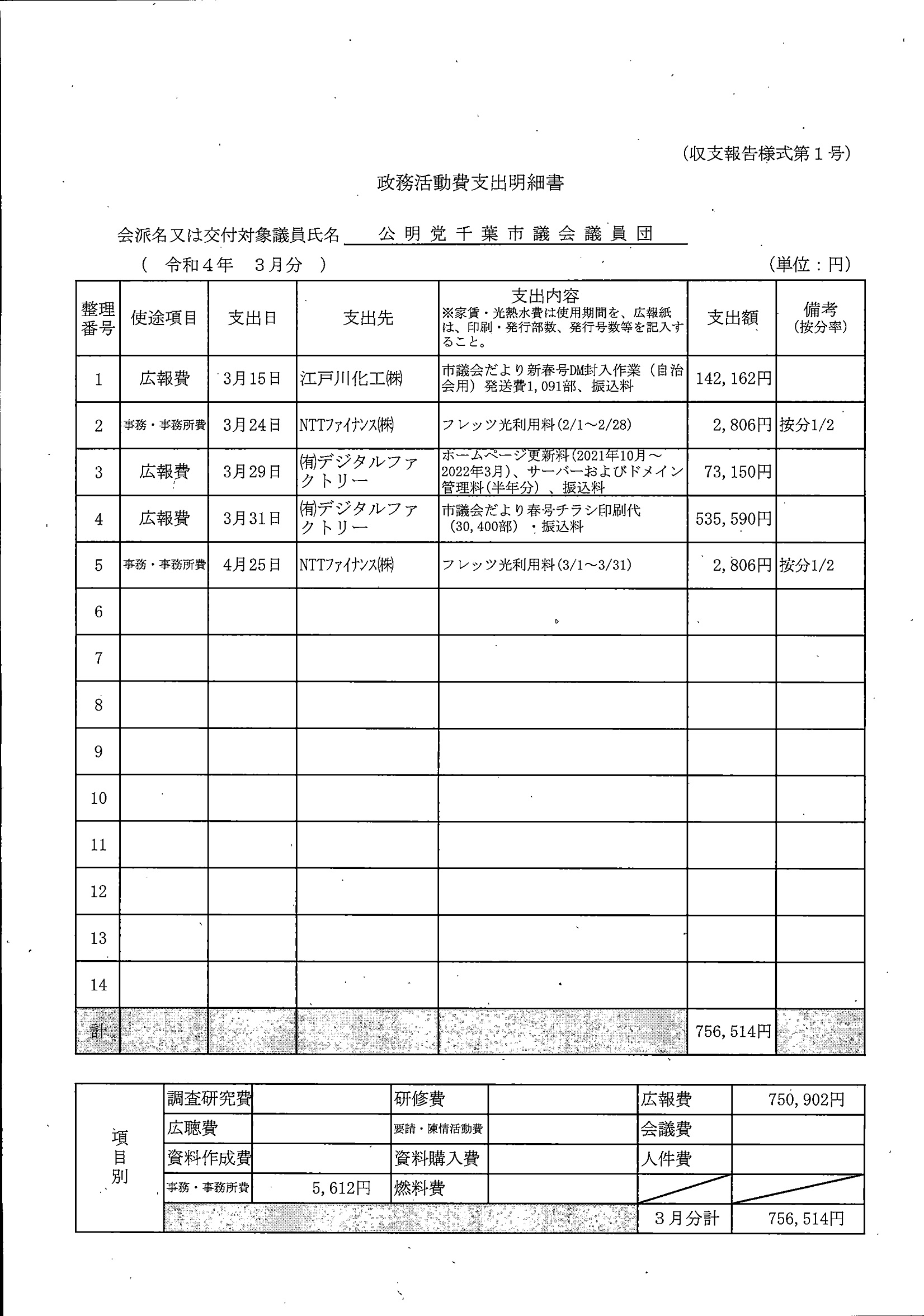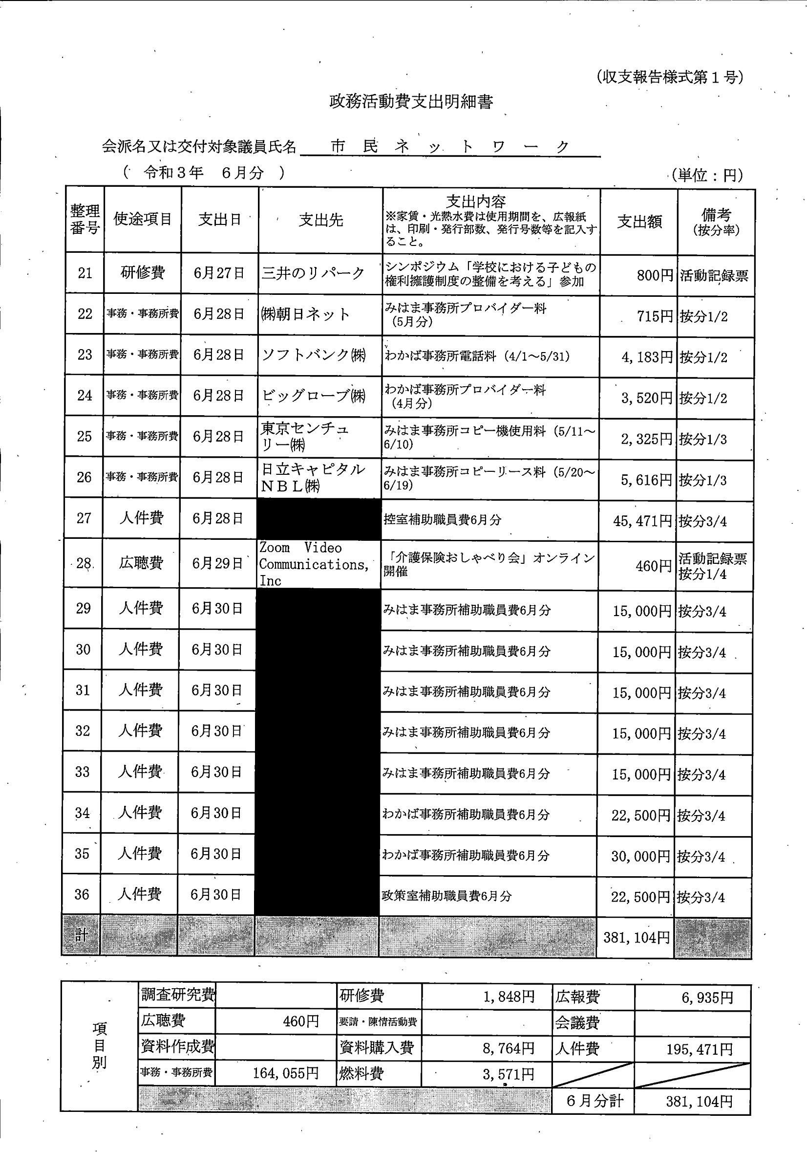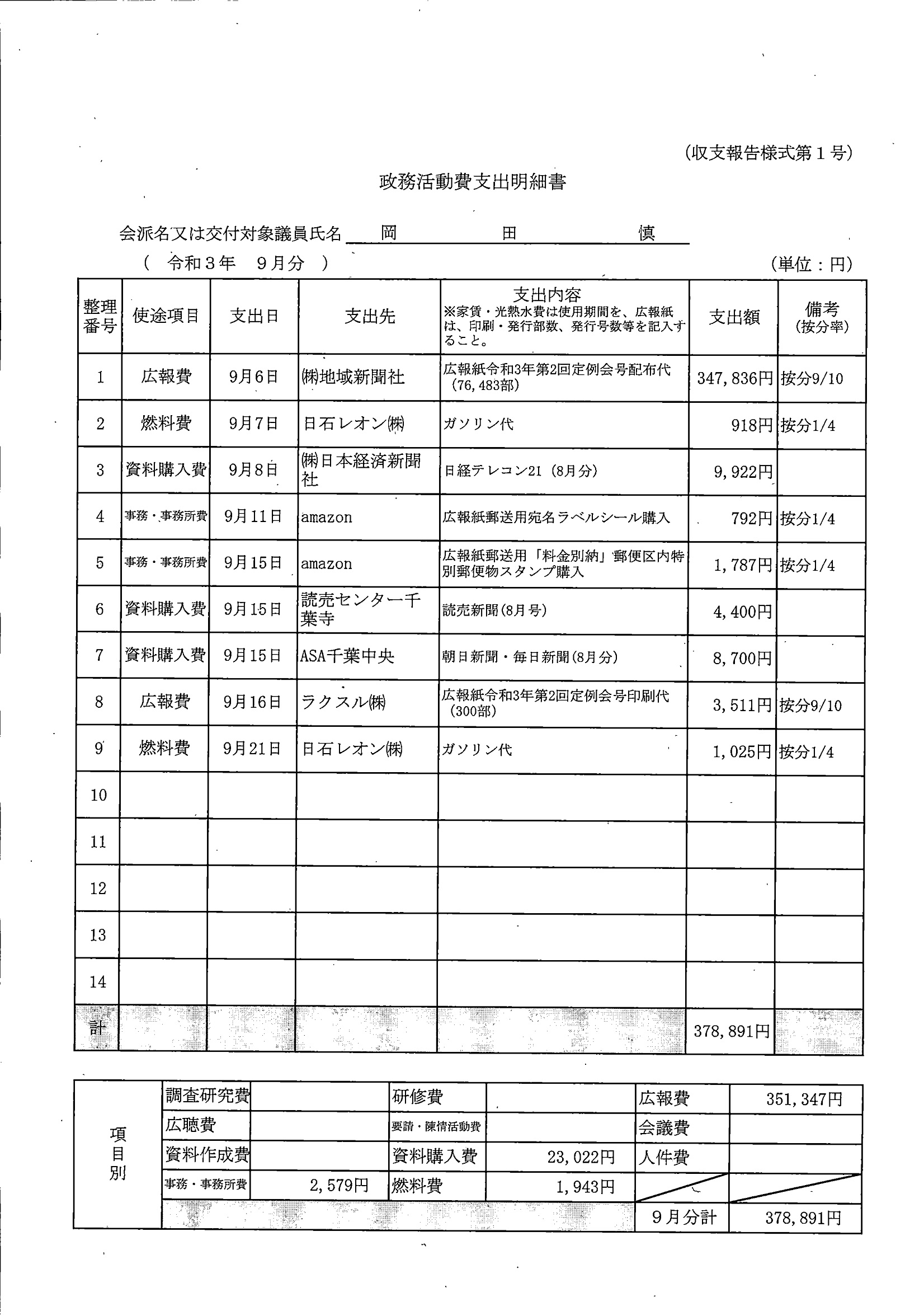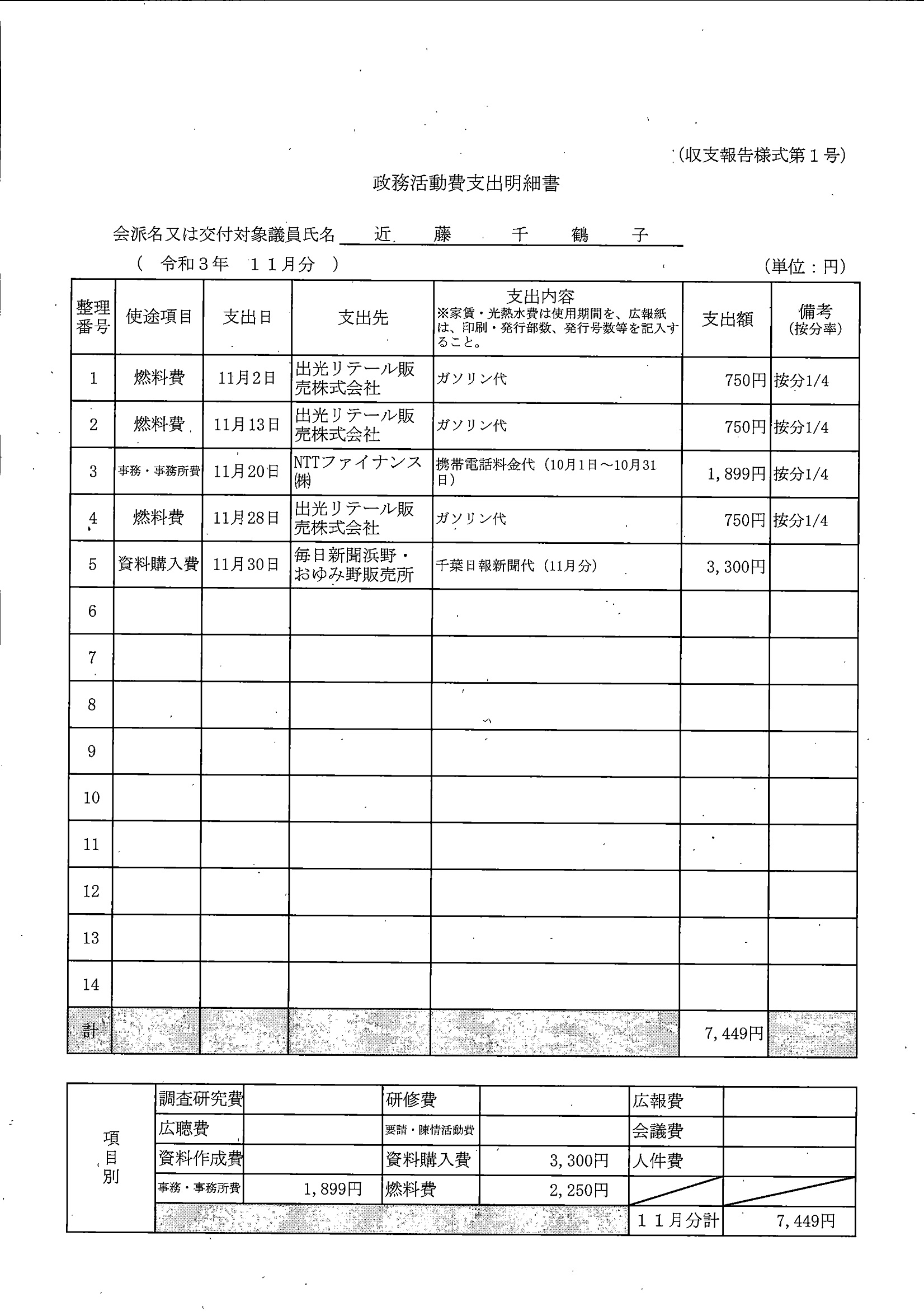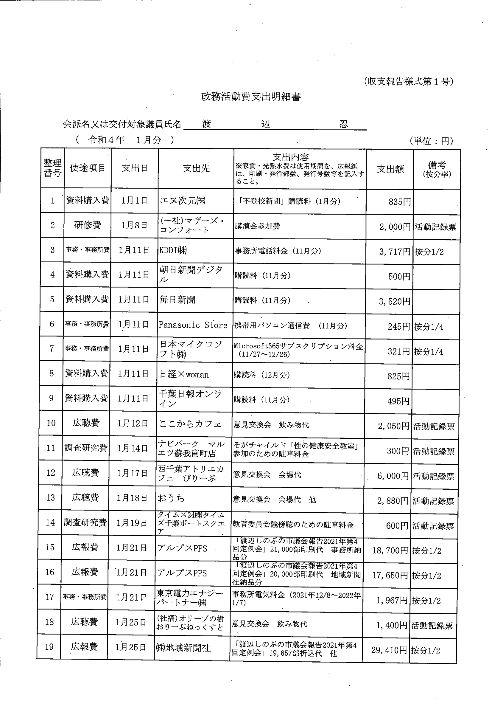 千葉市議会トップページ > 広報・情報公開 > 政務活動費 > 令和3年度交付分(政務活動費収支報告書)
