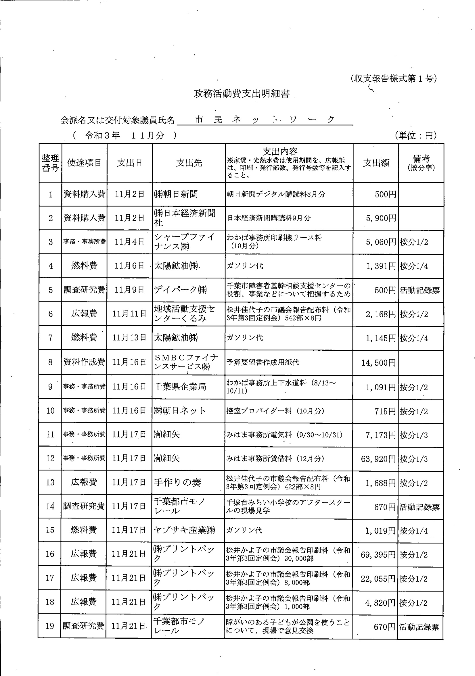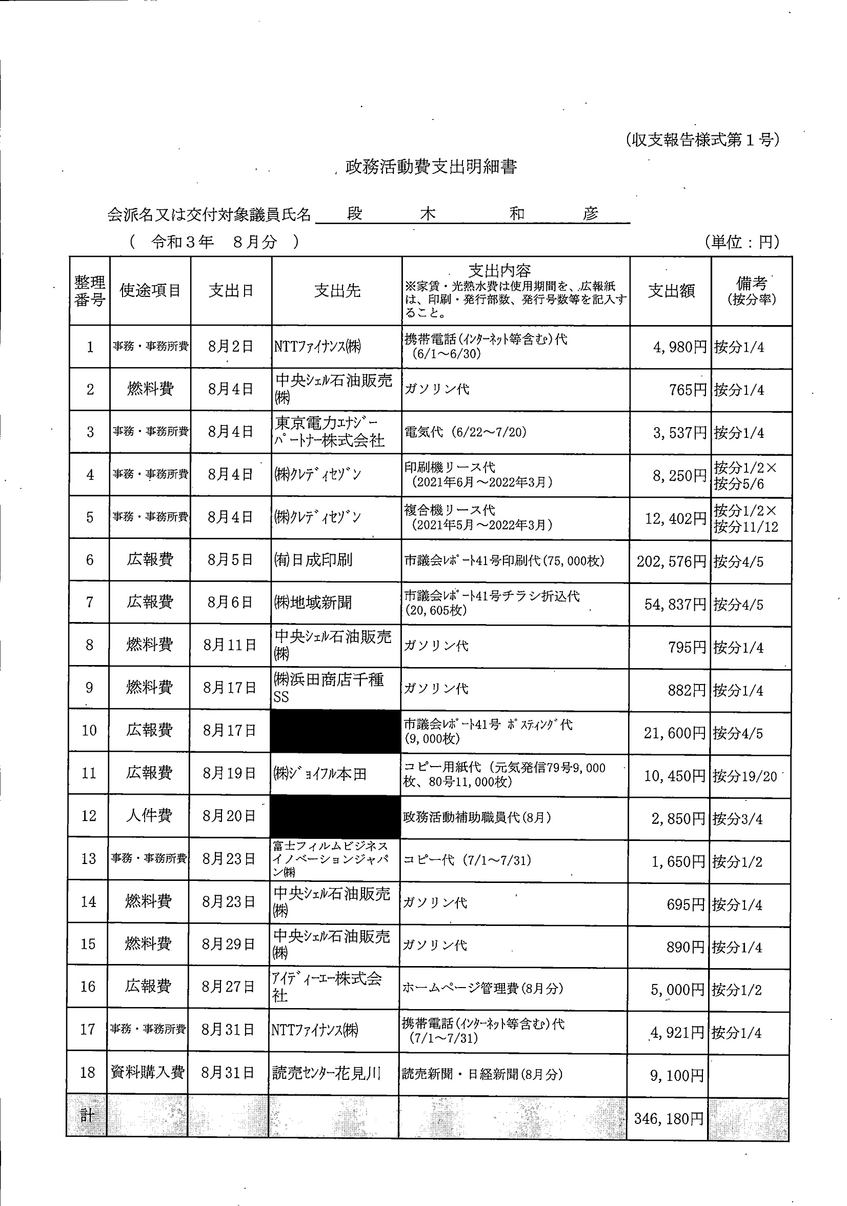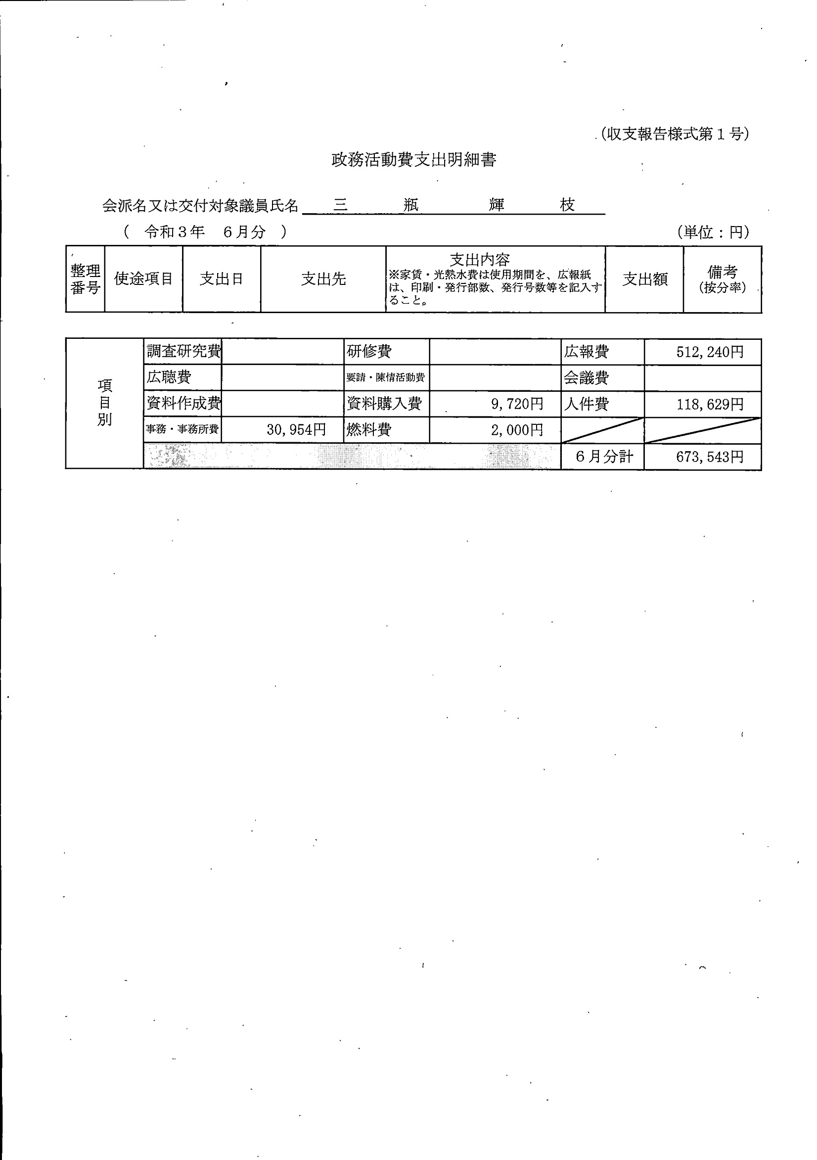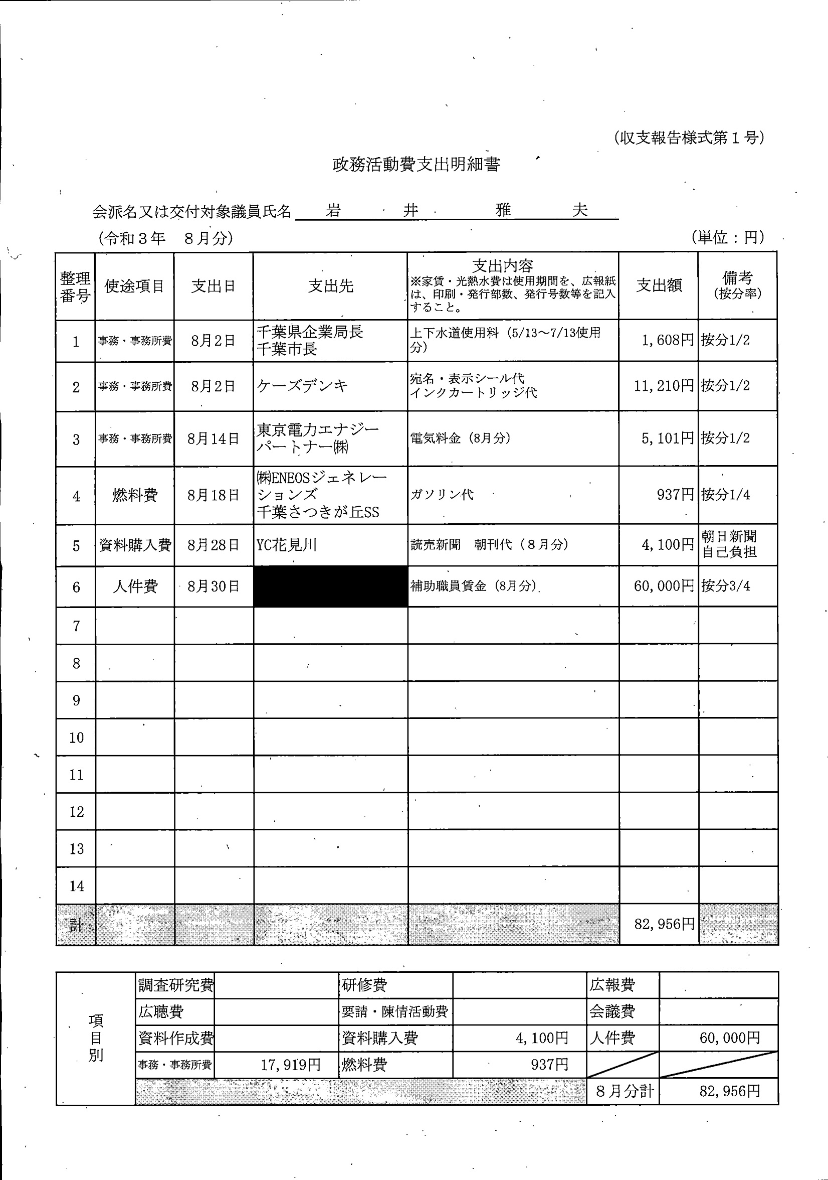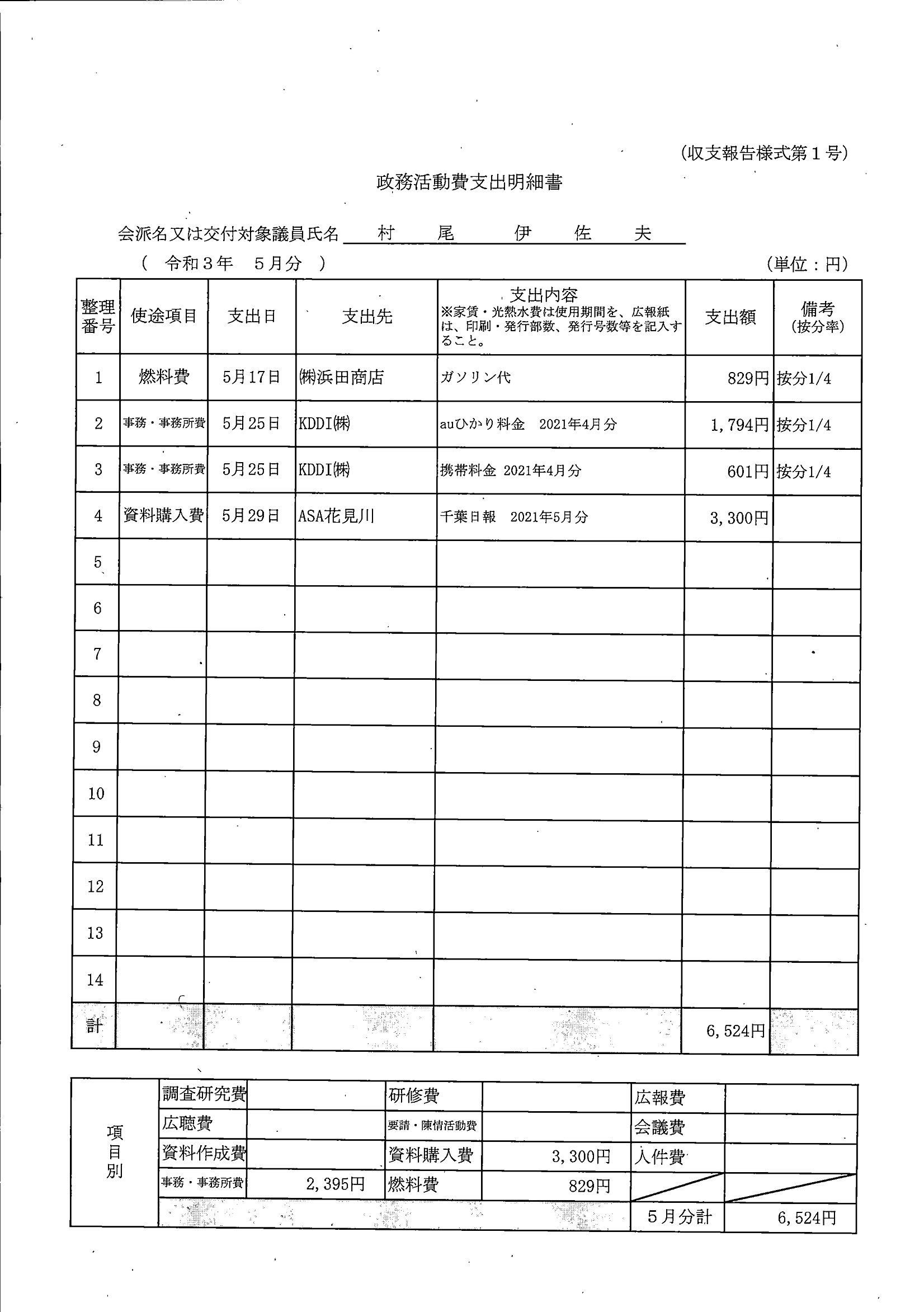 千葉市議会トップページ > 広報・情報公開 > 政務活動費 > 令和3年度交付分(政務活動費収支報告書)
