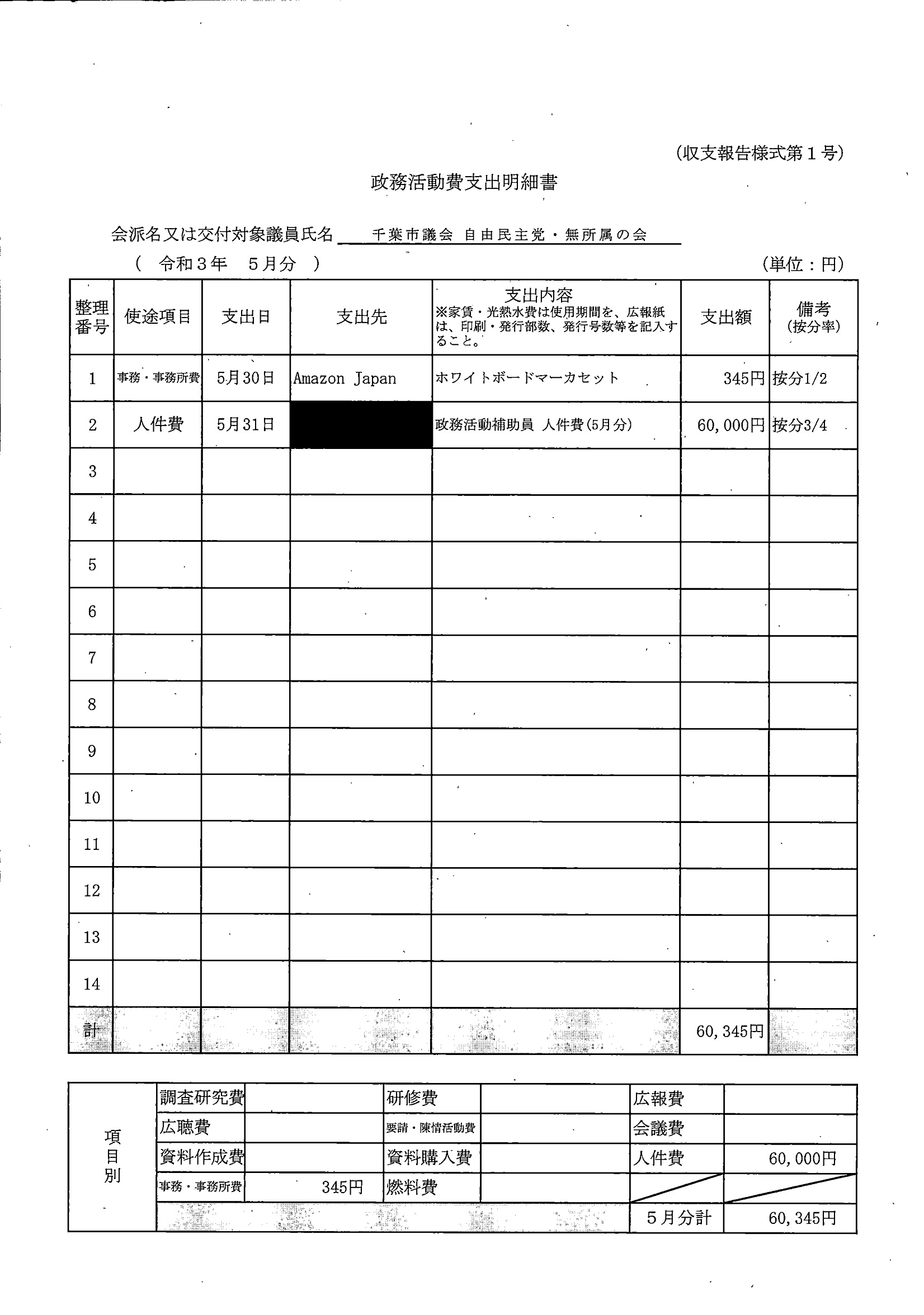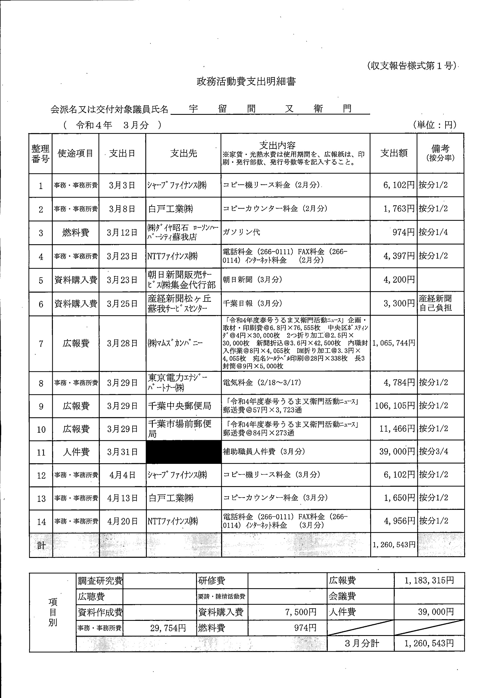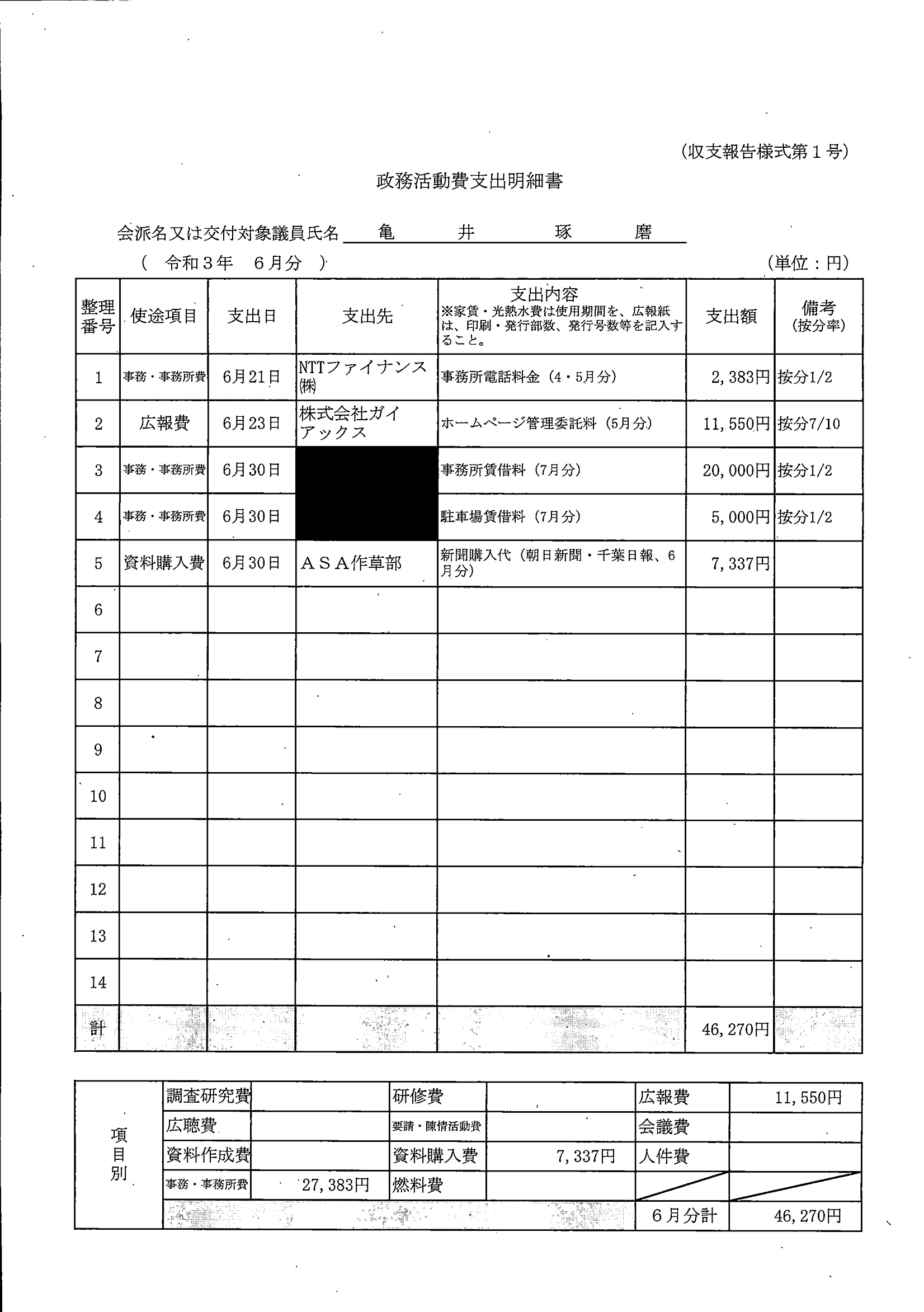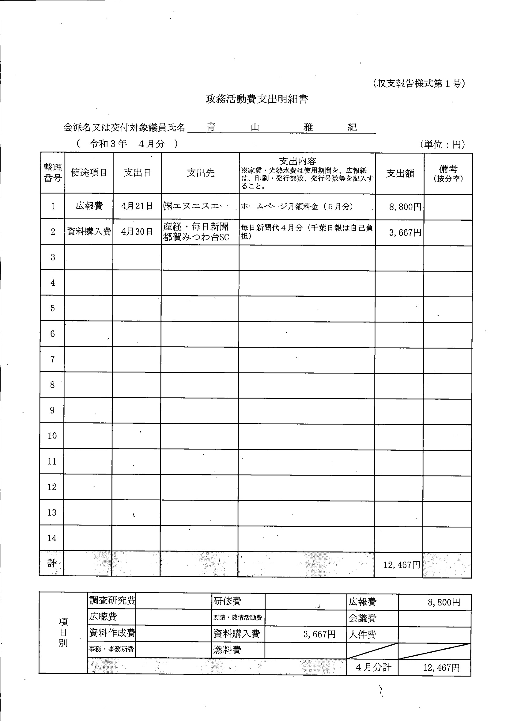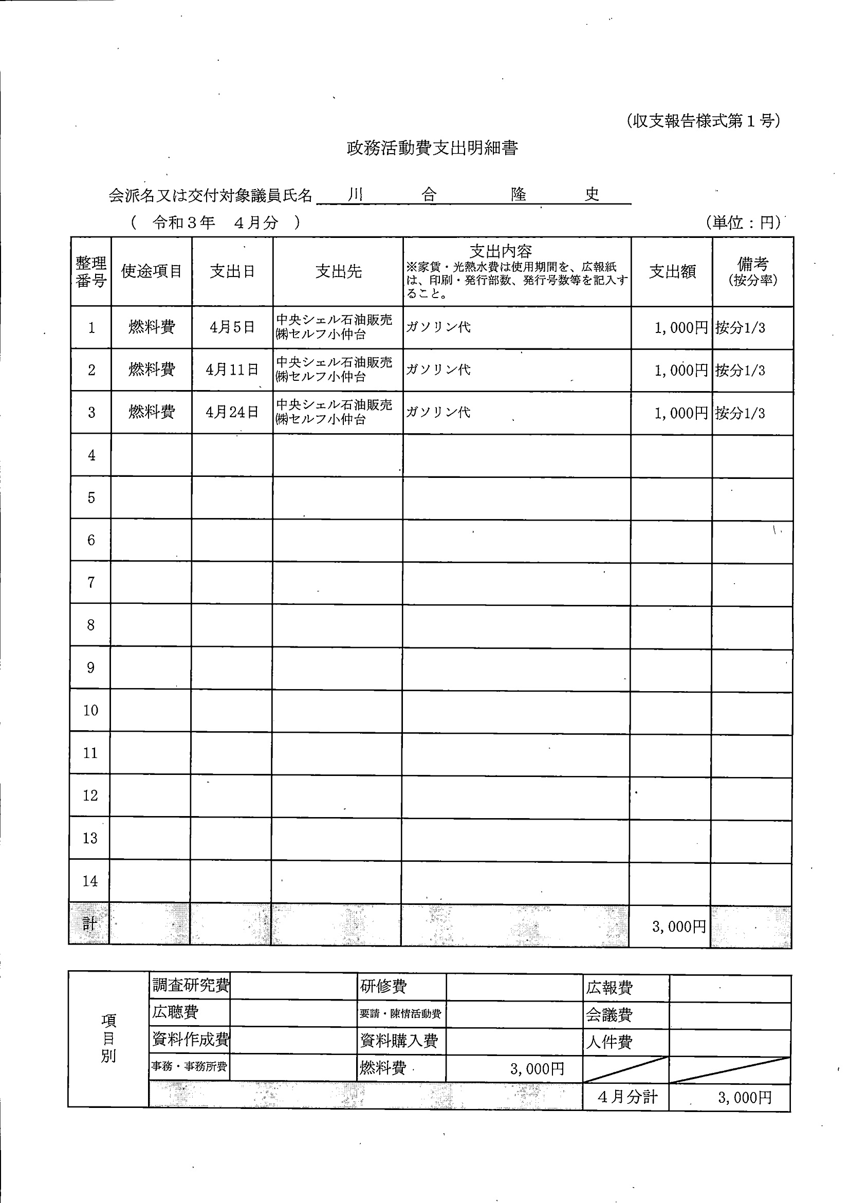 千葉市議会トップページ > 広報・情報公開 > 政務活動費 > 令和3年度交付分(政務活動費収支報告書)
