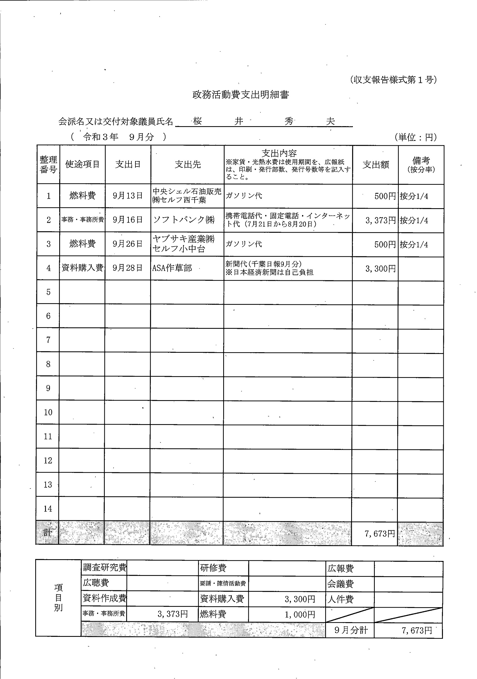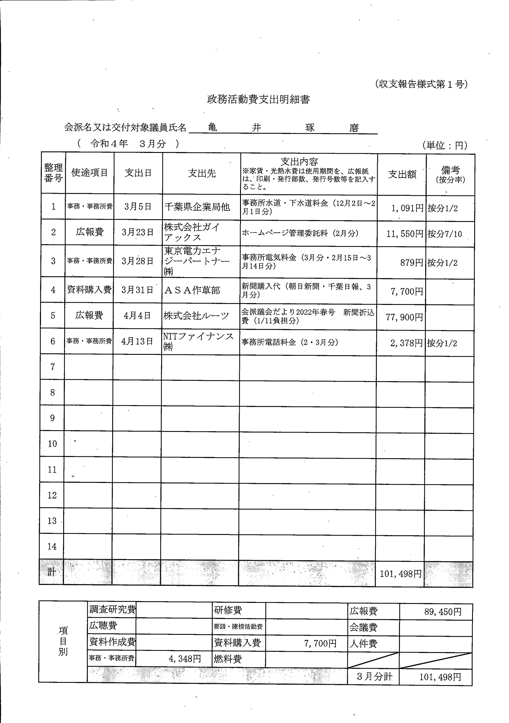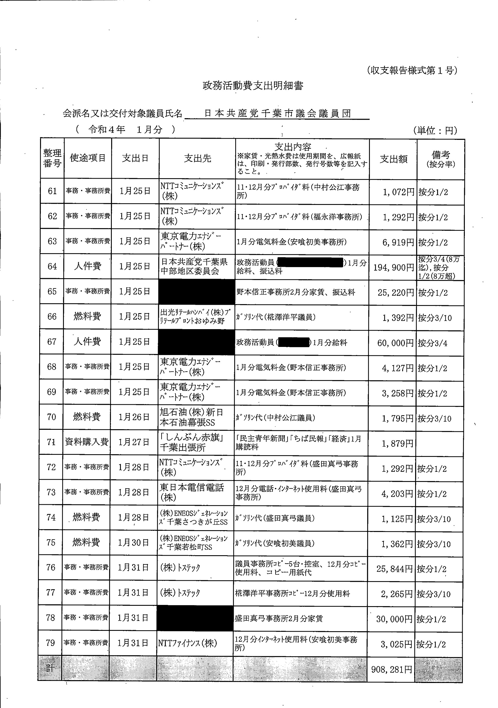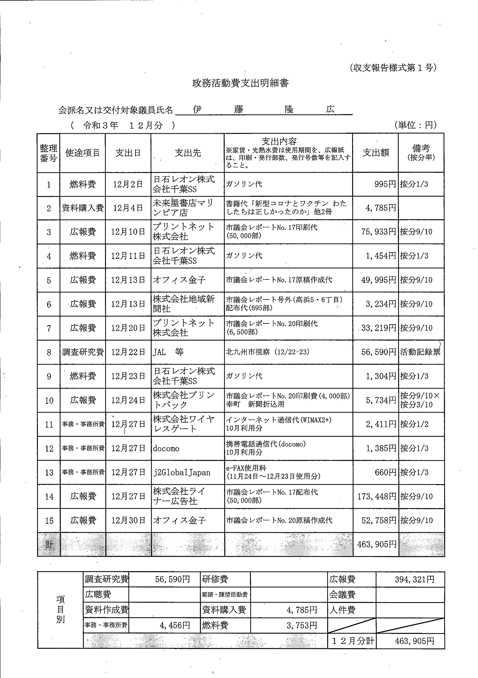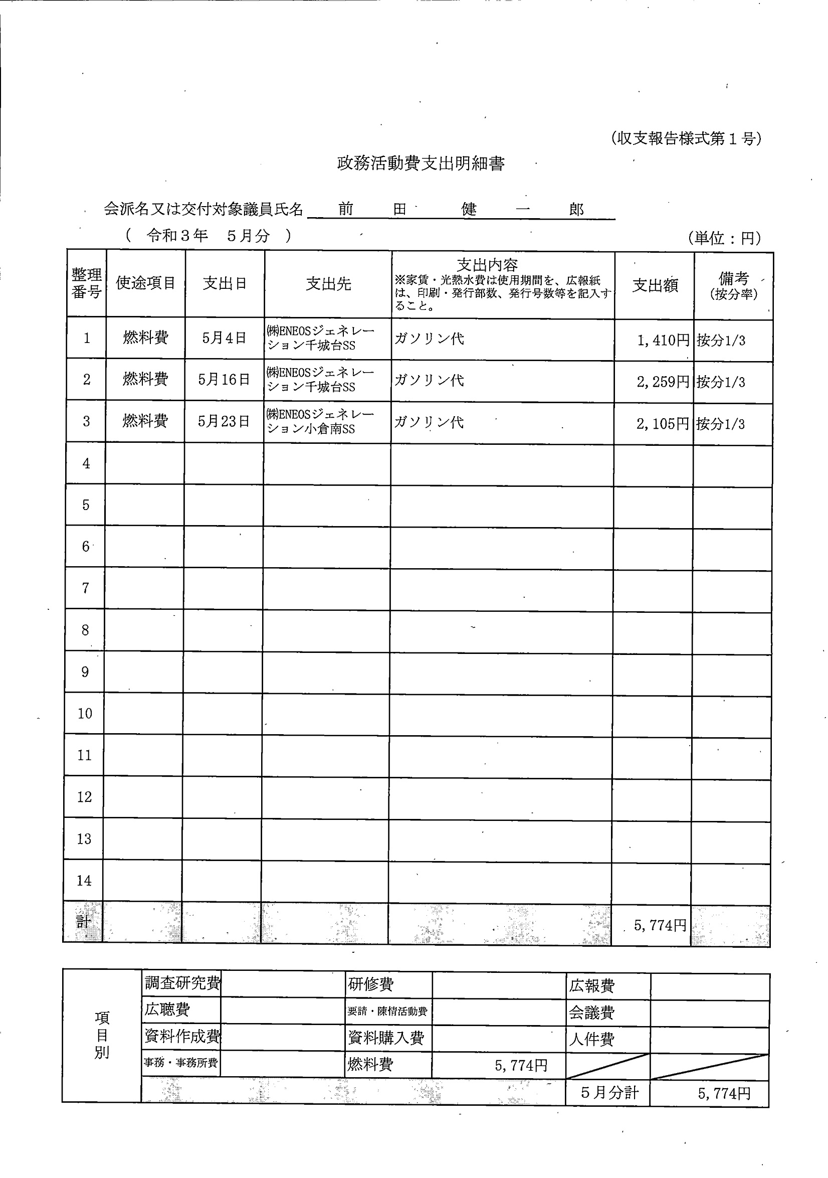 千葉市議会トップページ > 広報・情報公開 > 政務活動費 > 令和3年度交付分(政務活動費収支報告書)