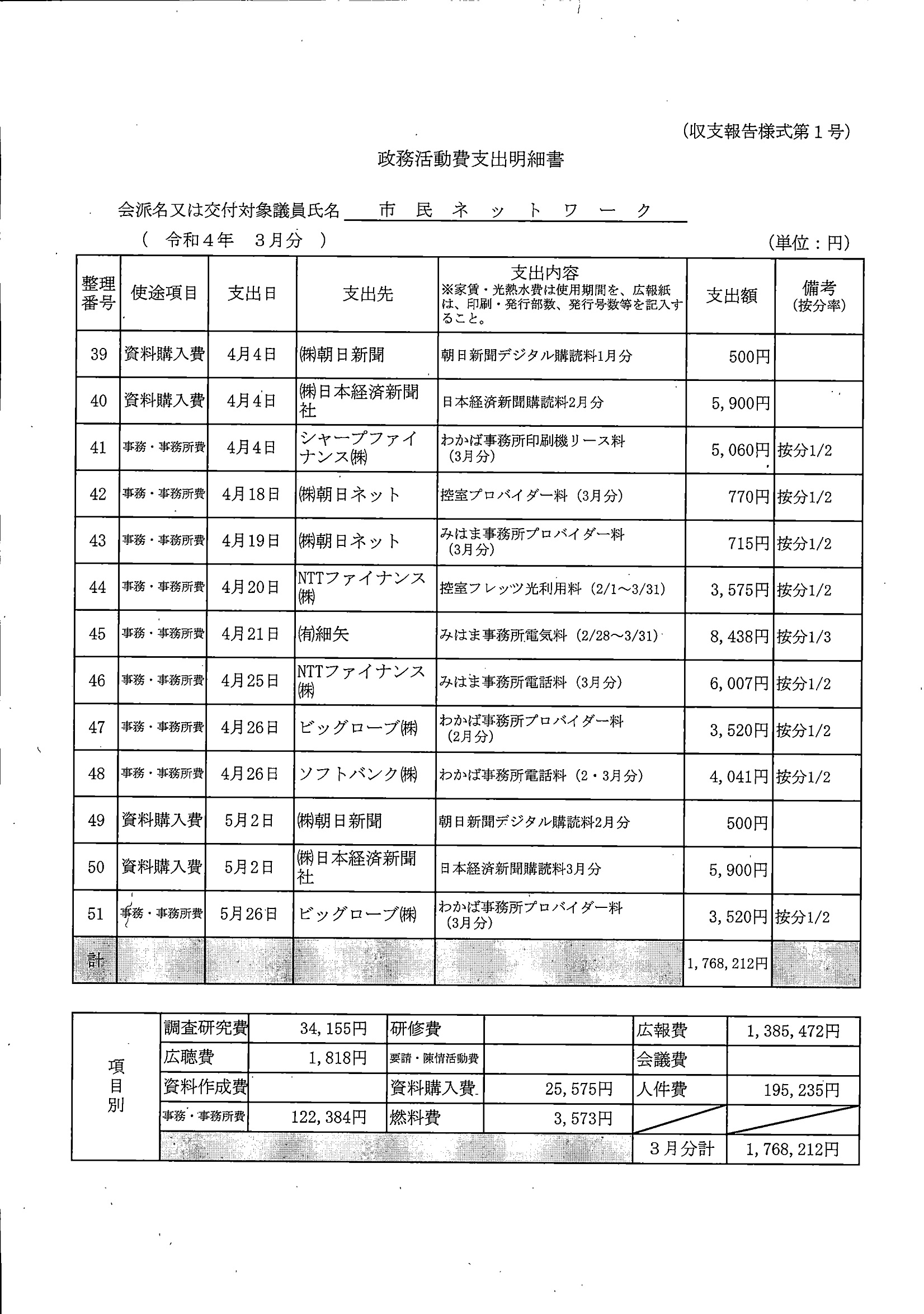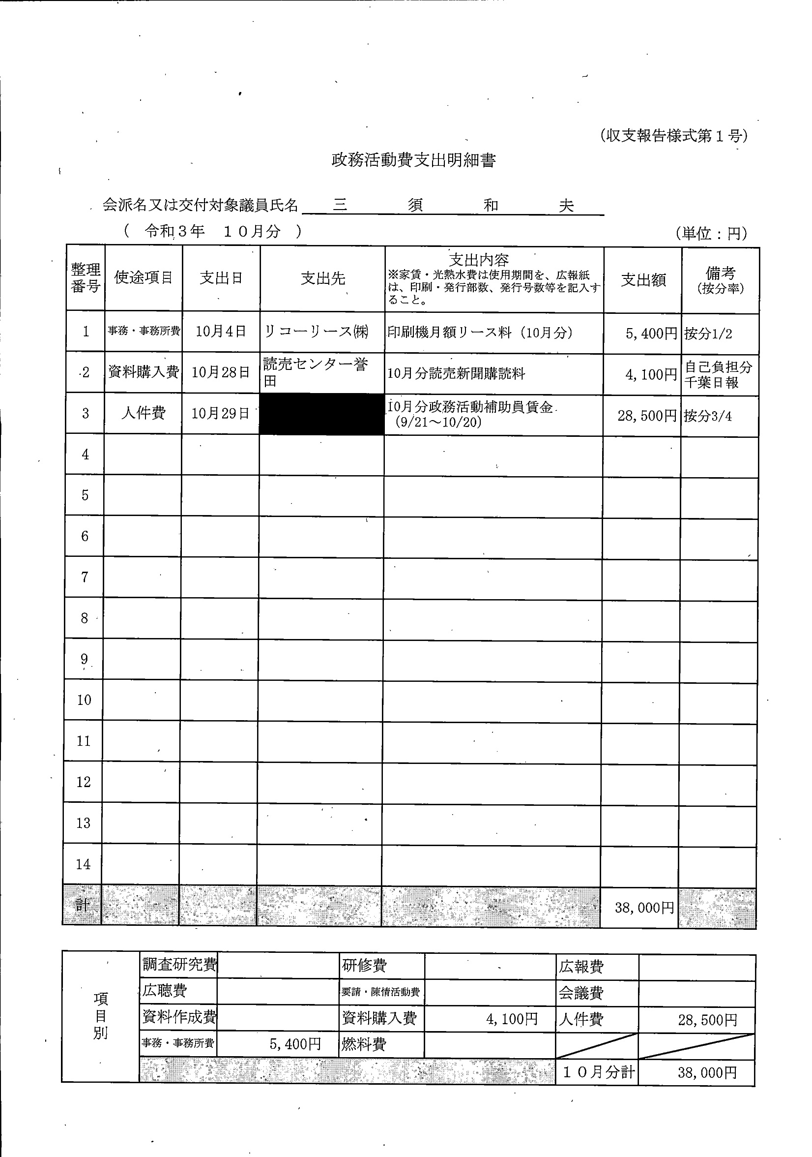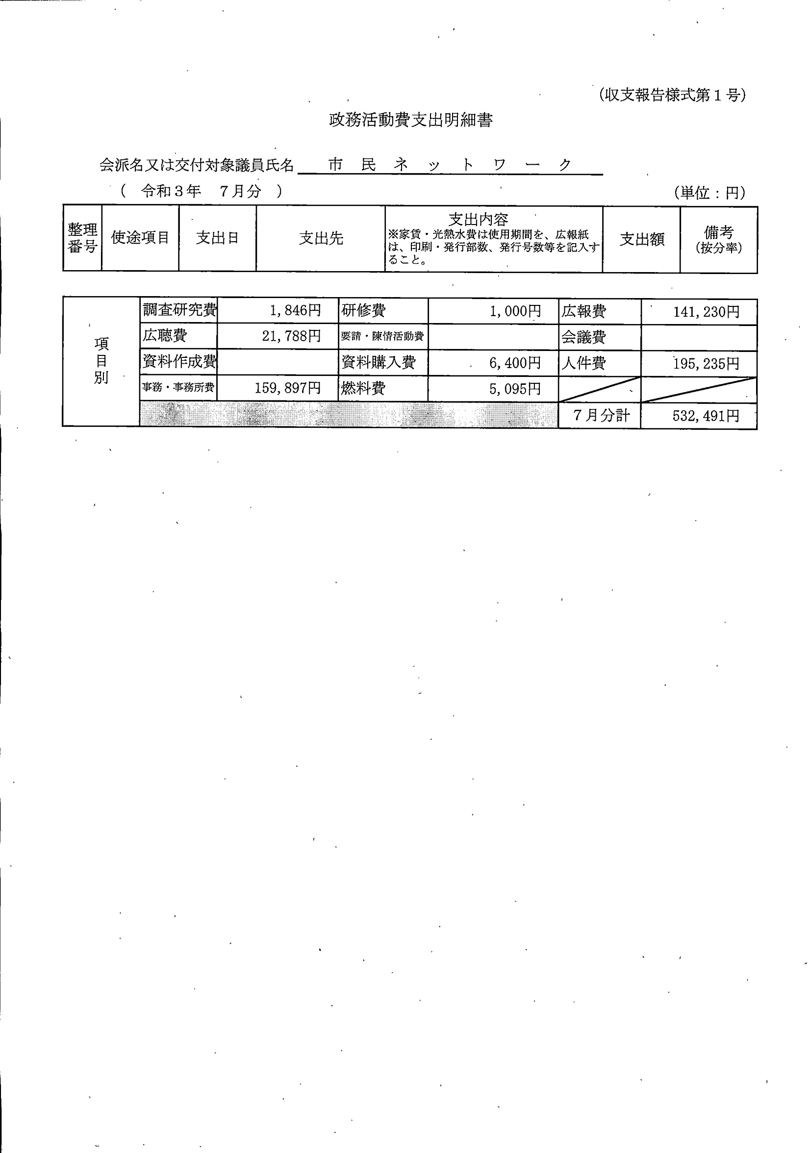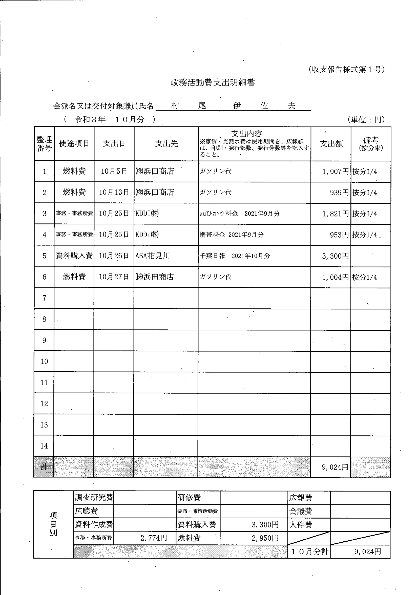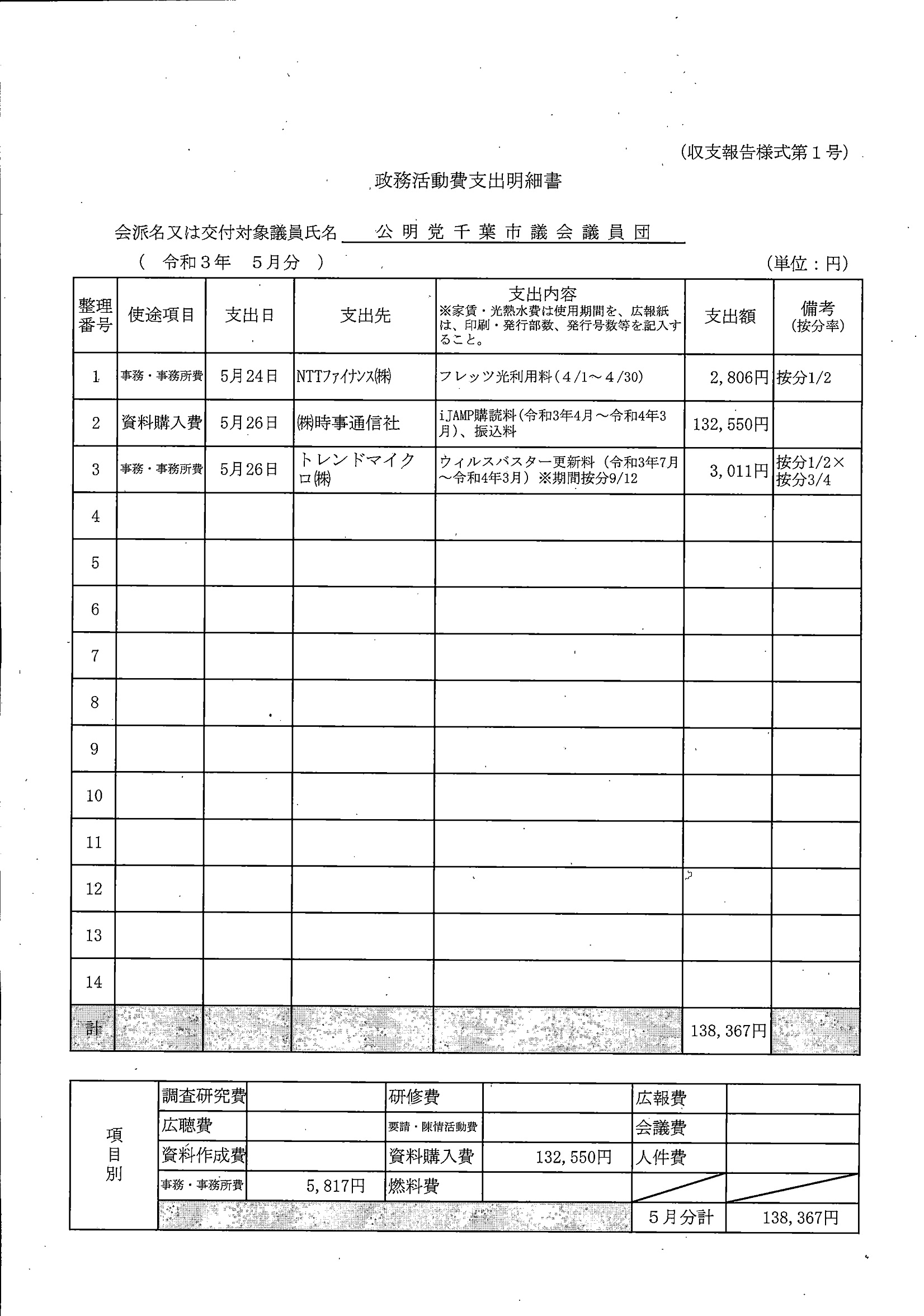 千葉市議会トップページ > 広報・情報公開 > 政務活動費 > 令和3年度交付分(政務活動費収支報告書)