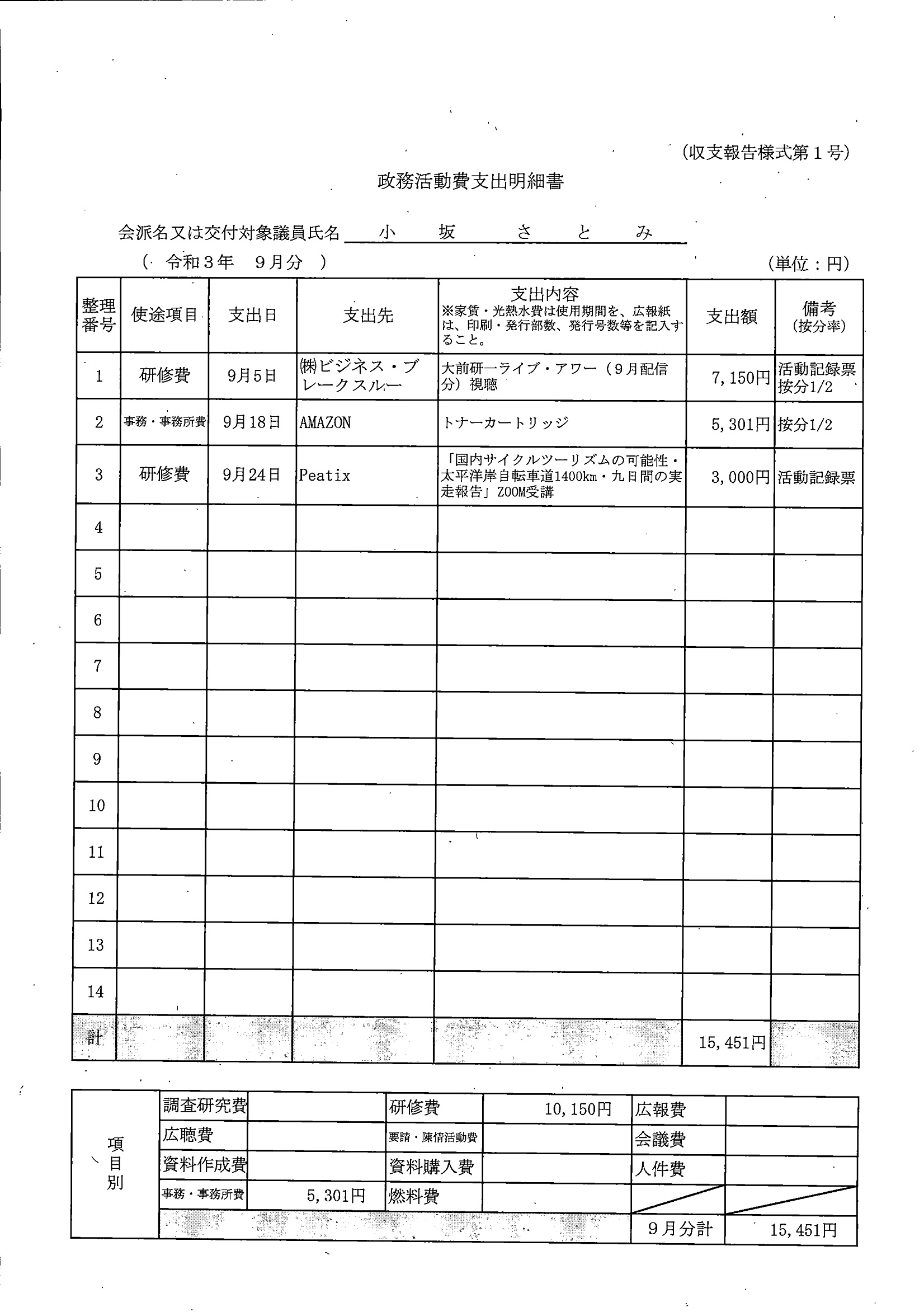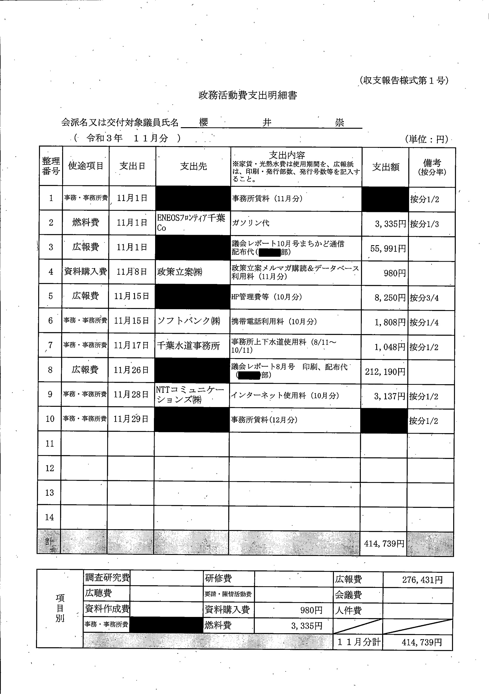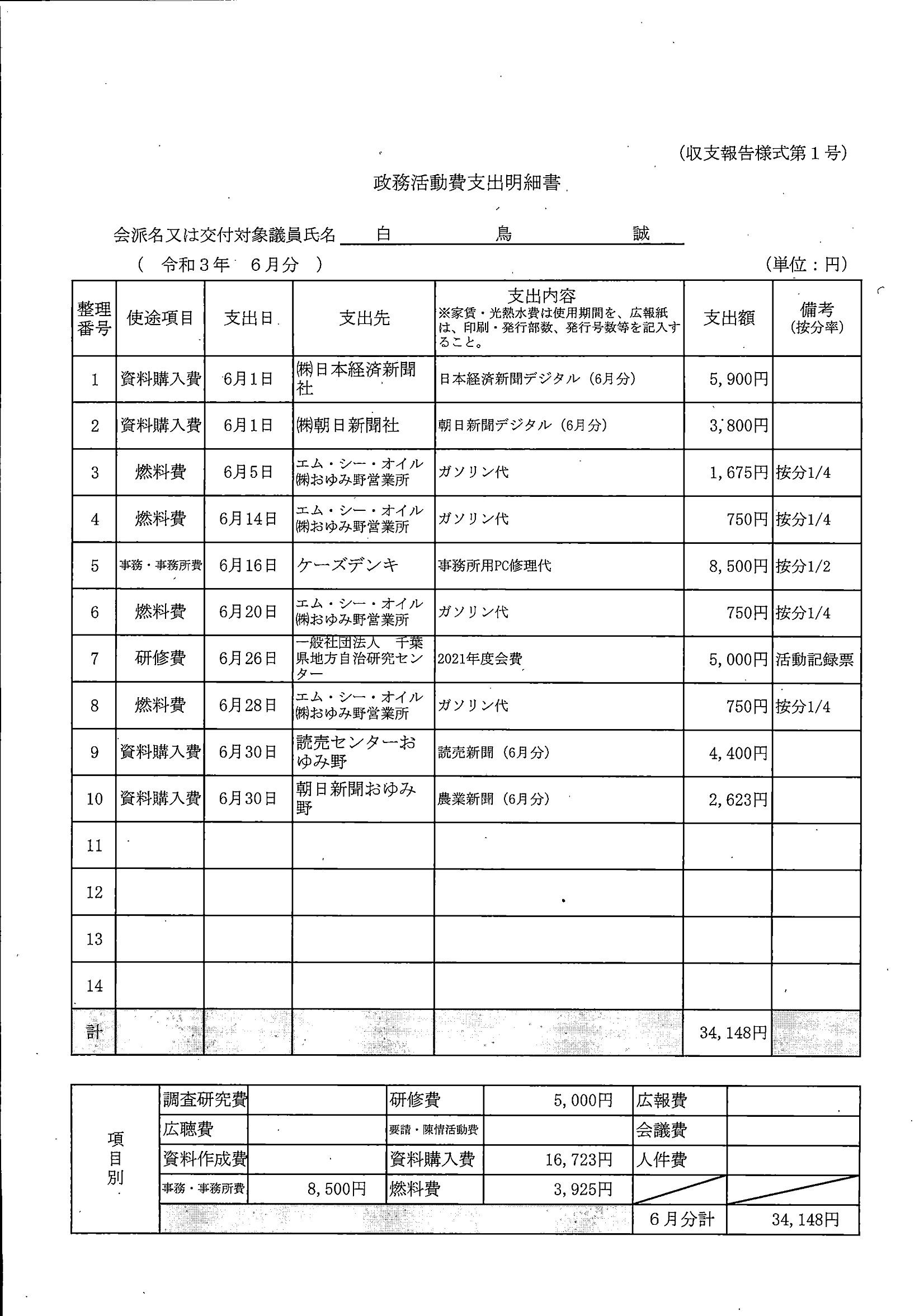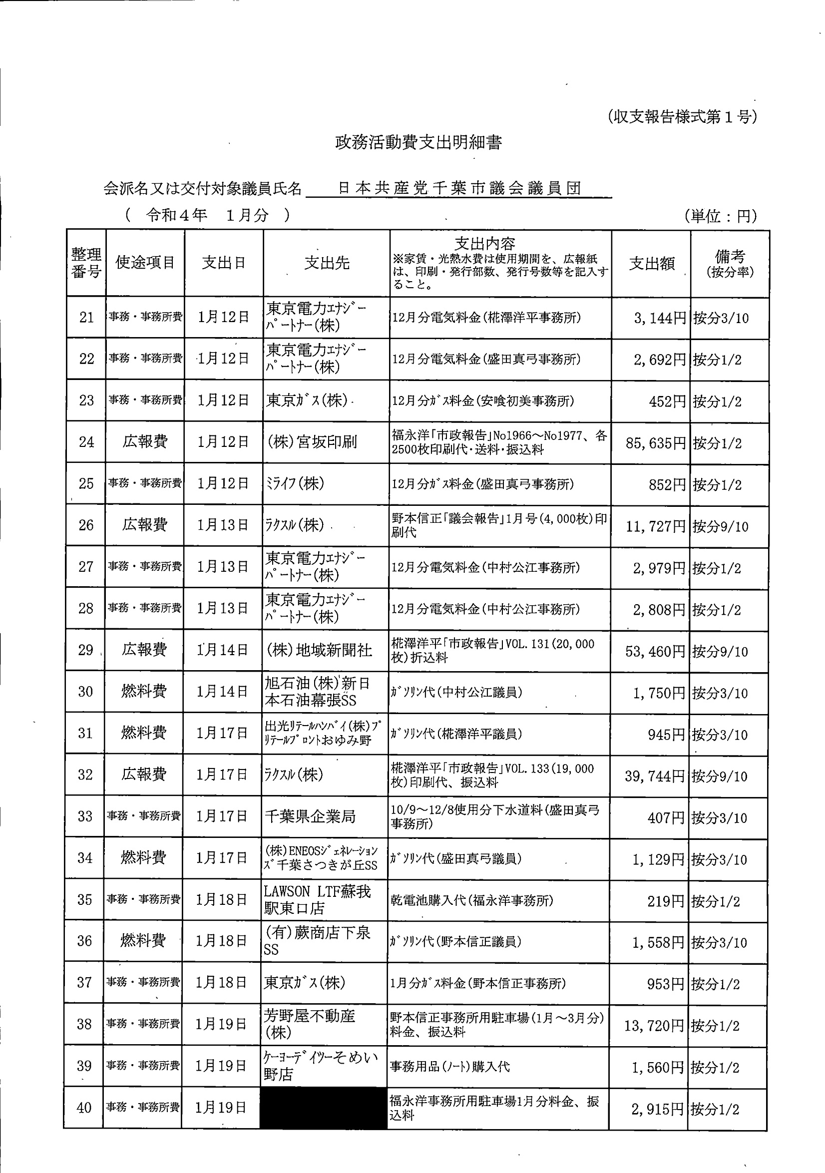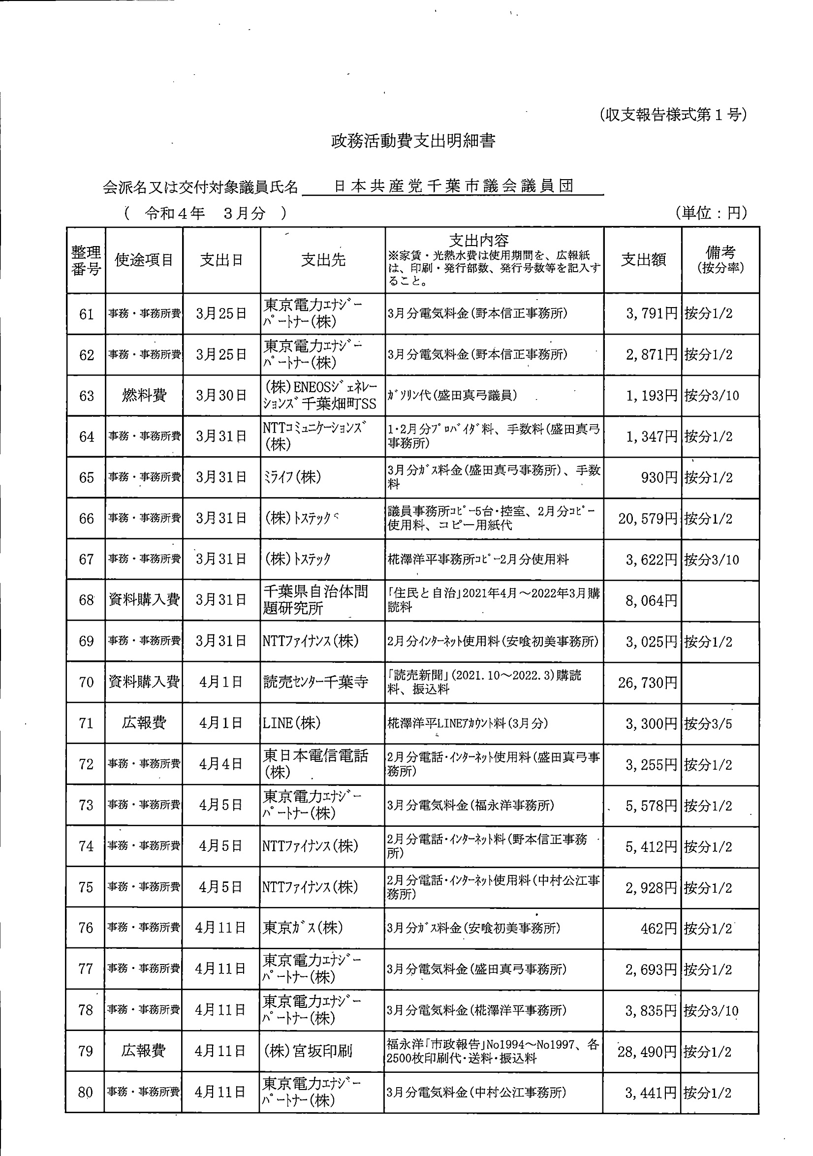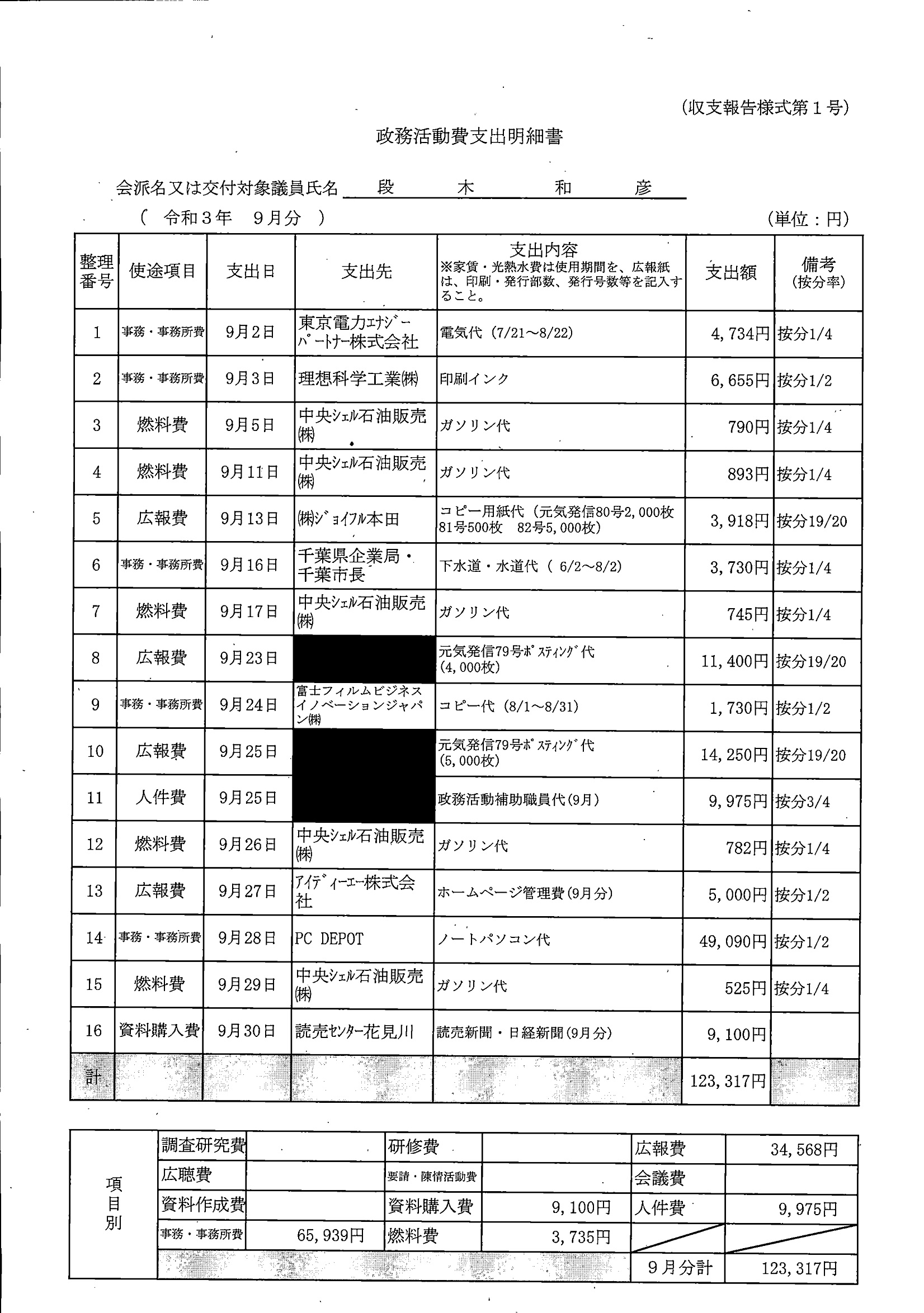 千葉市議会トップページ > 広報・情報公開 > 政務活動費 > 令和3年度交付分(政務活動費収支報告書)