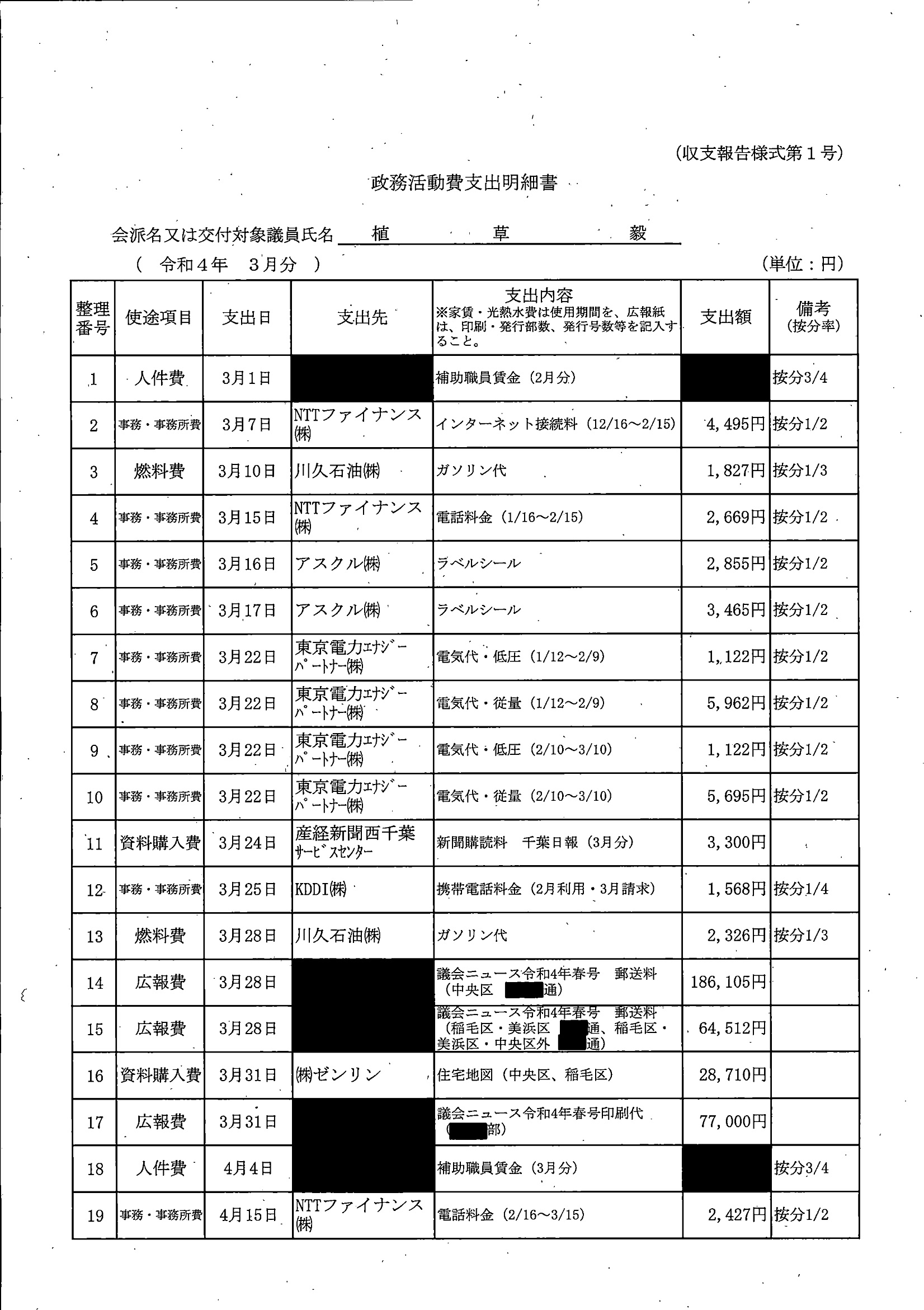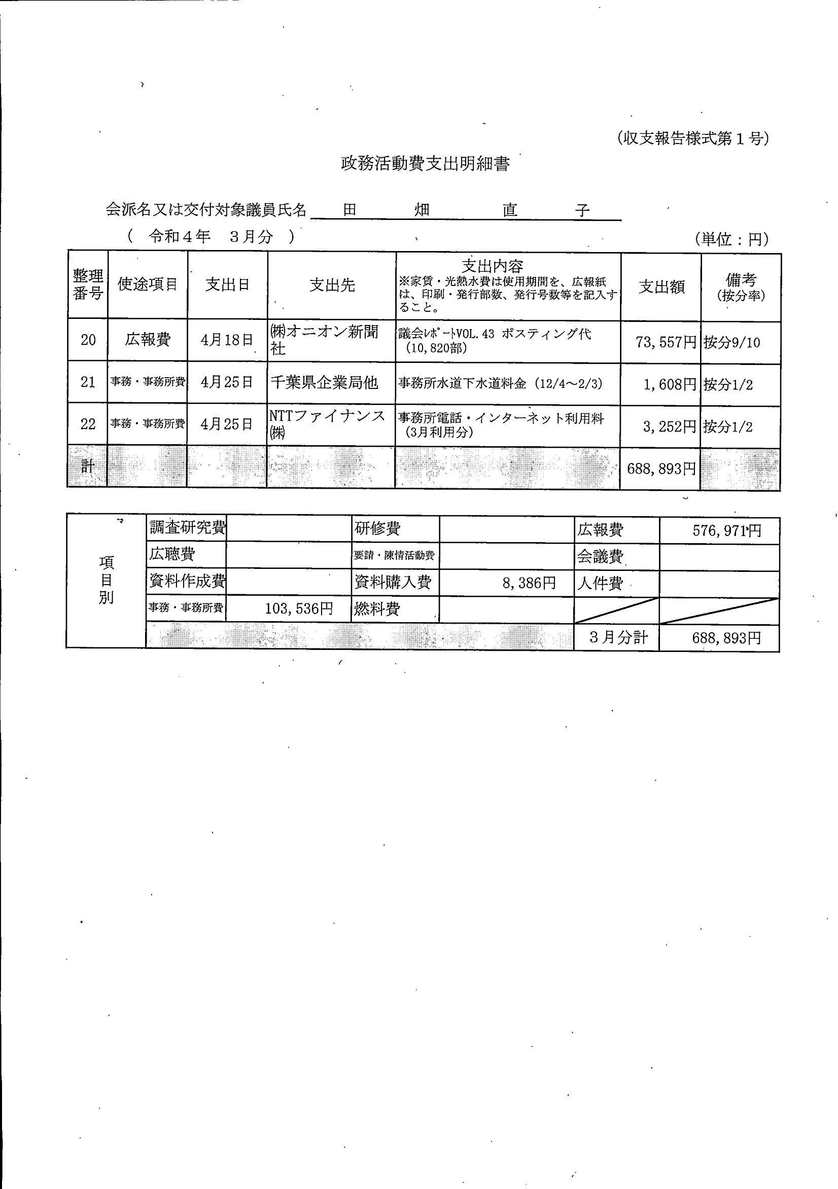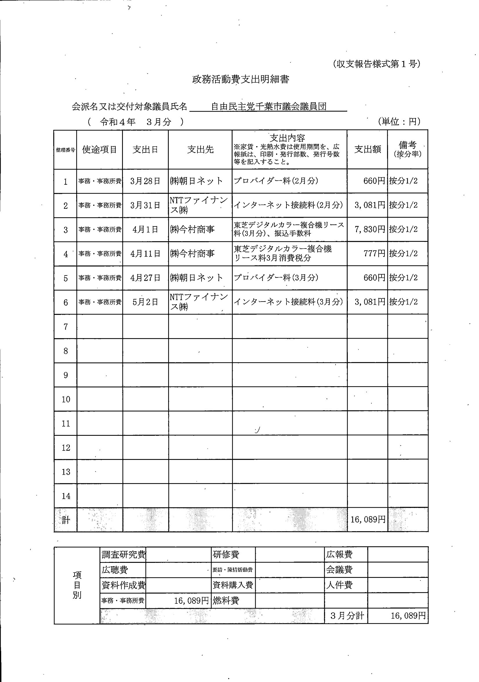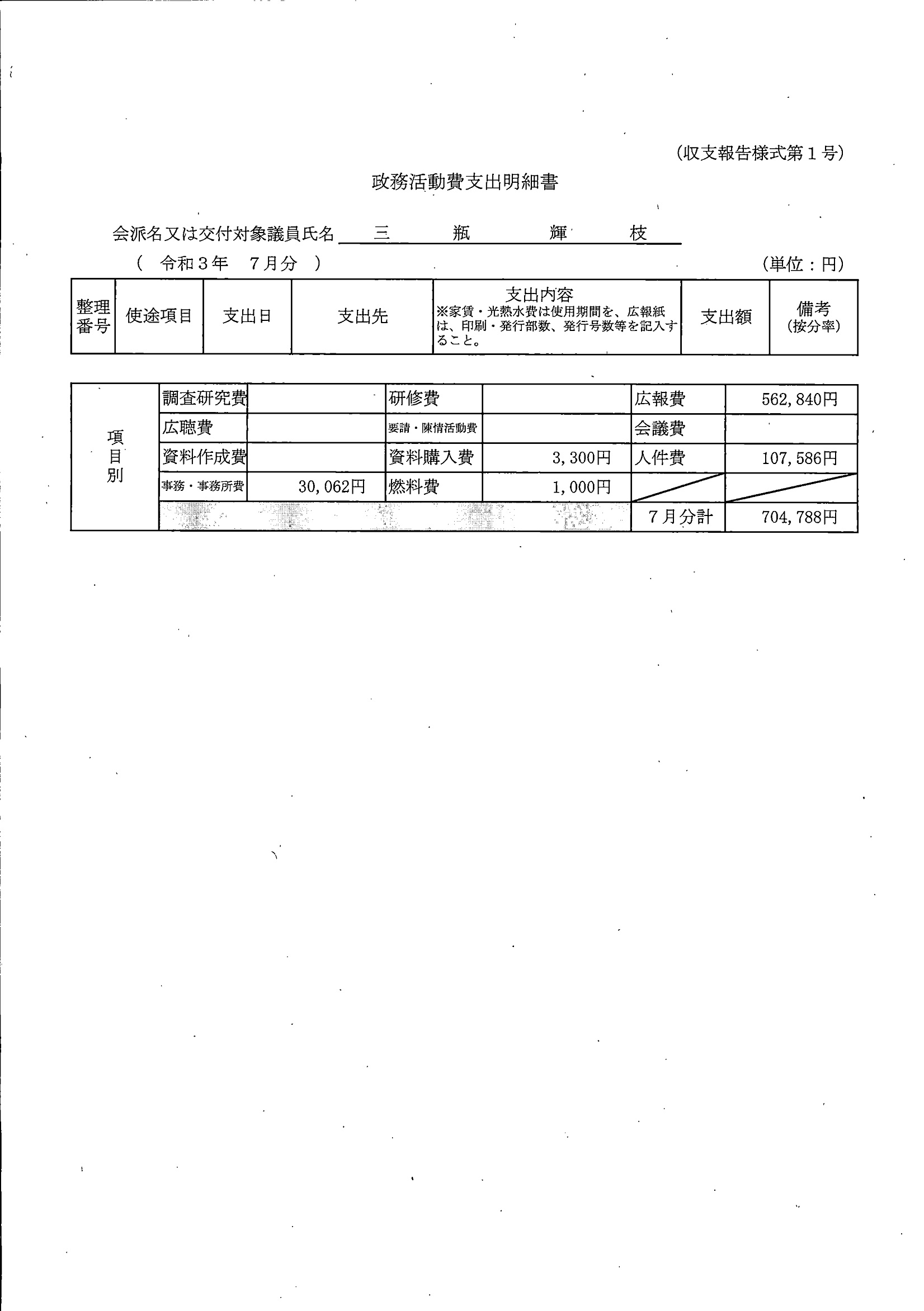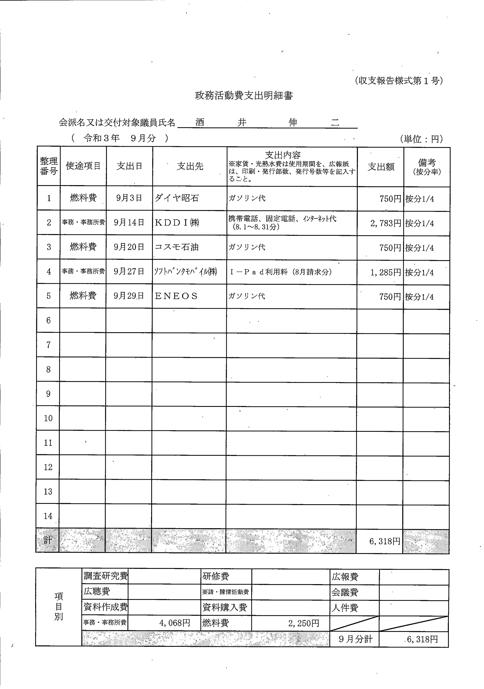 千葉市議会トップページ > 広報・情報公開 > 政務活動費 > 令和3年度交付分(政務活動費収支報告書)