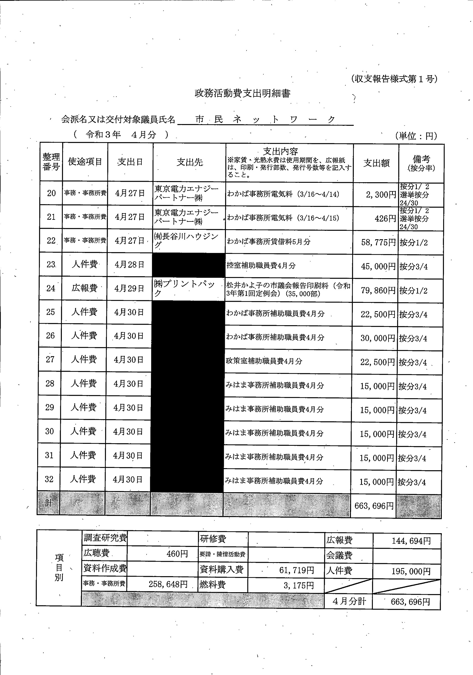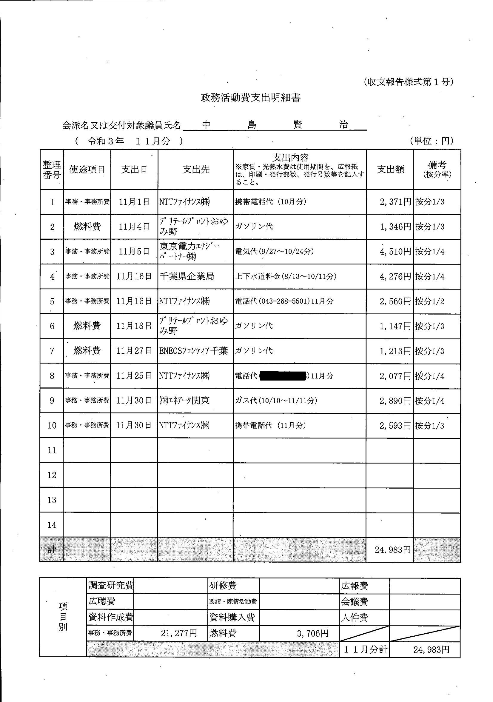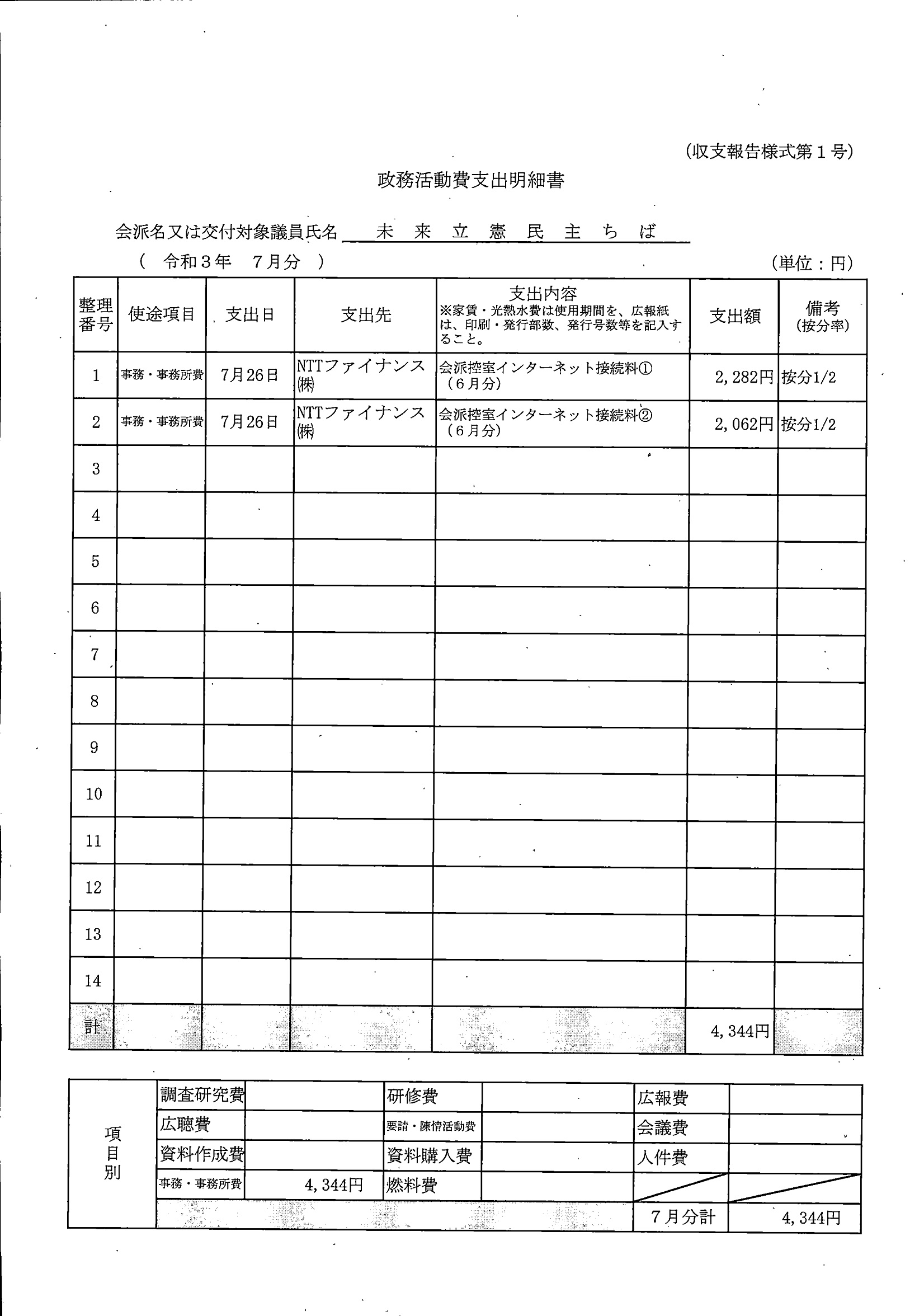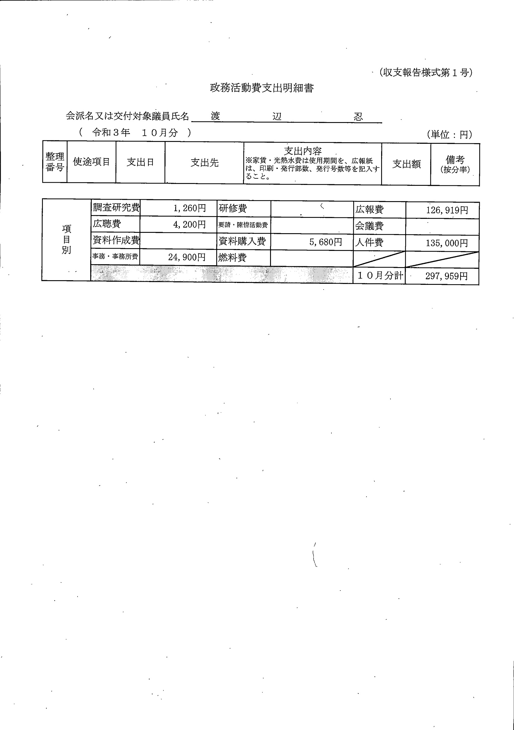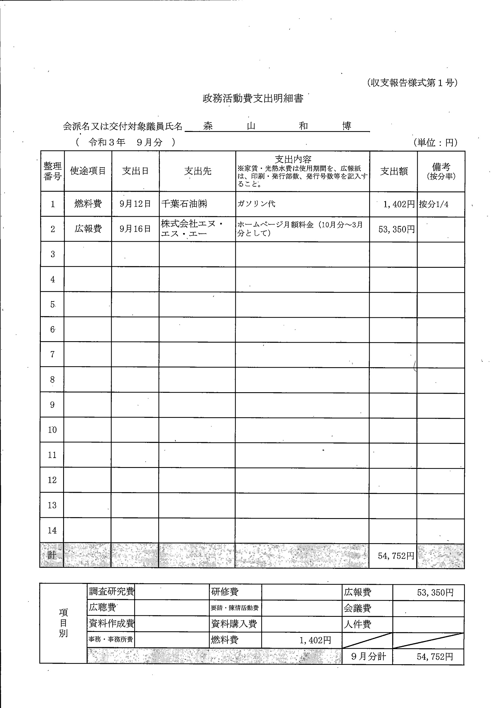 千葉市議会トップページ > 広報・情報公開 > 政務活動費 > 令和3年度交付分(政務活動費収支報告書)