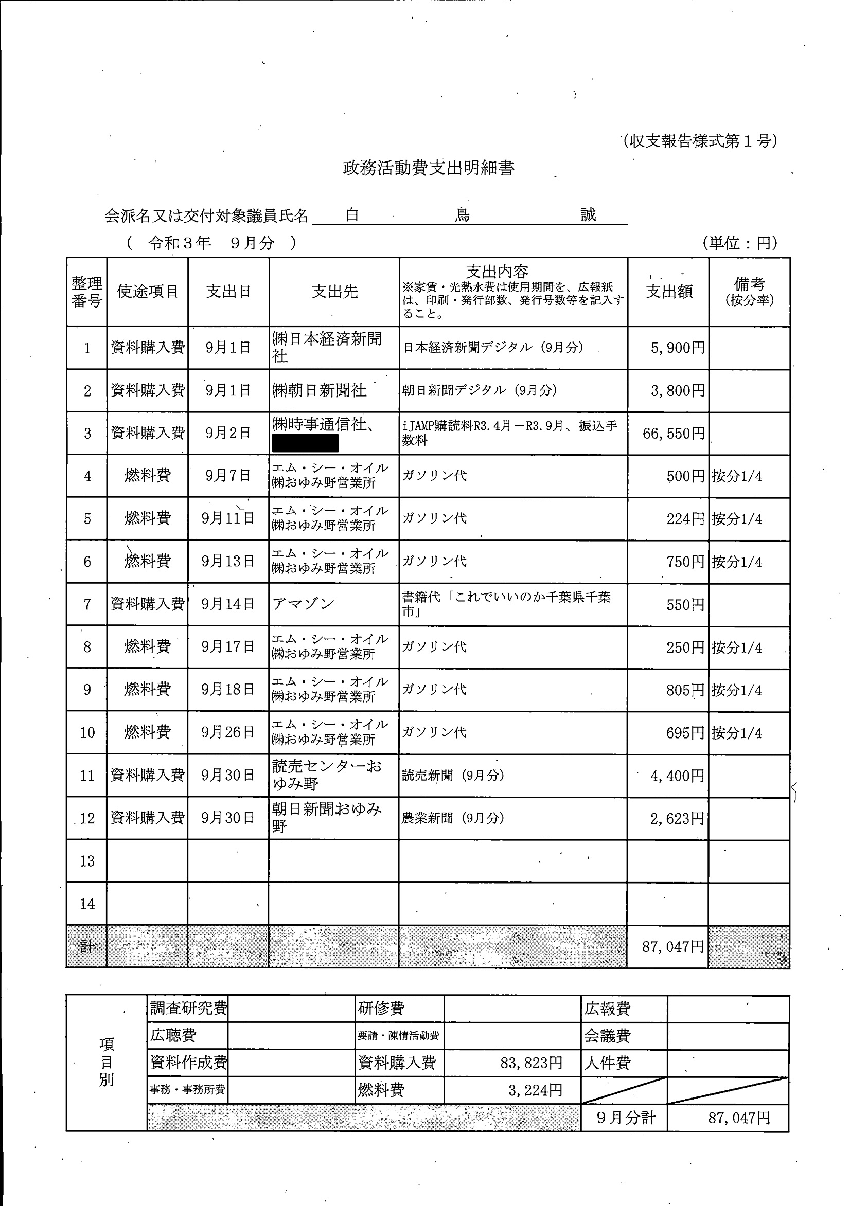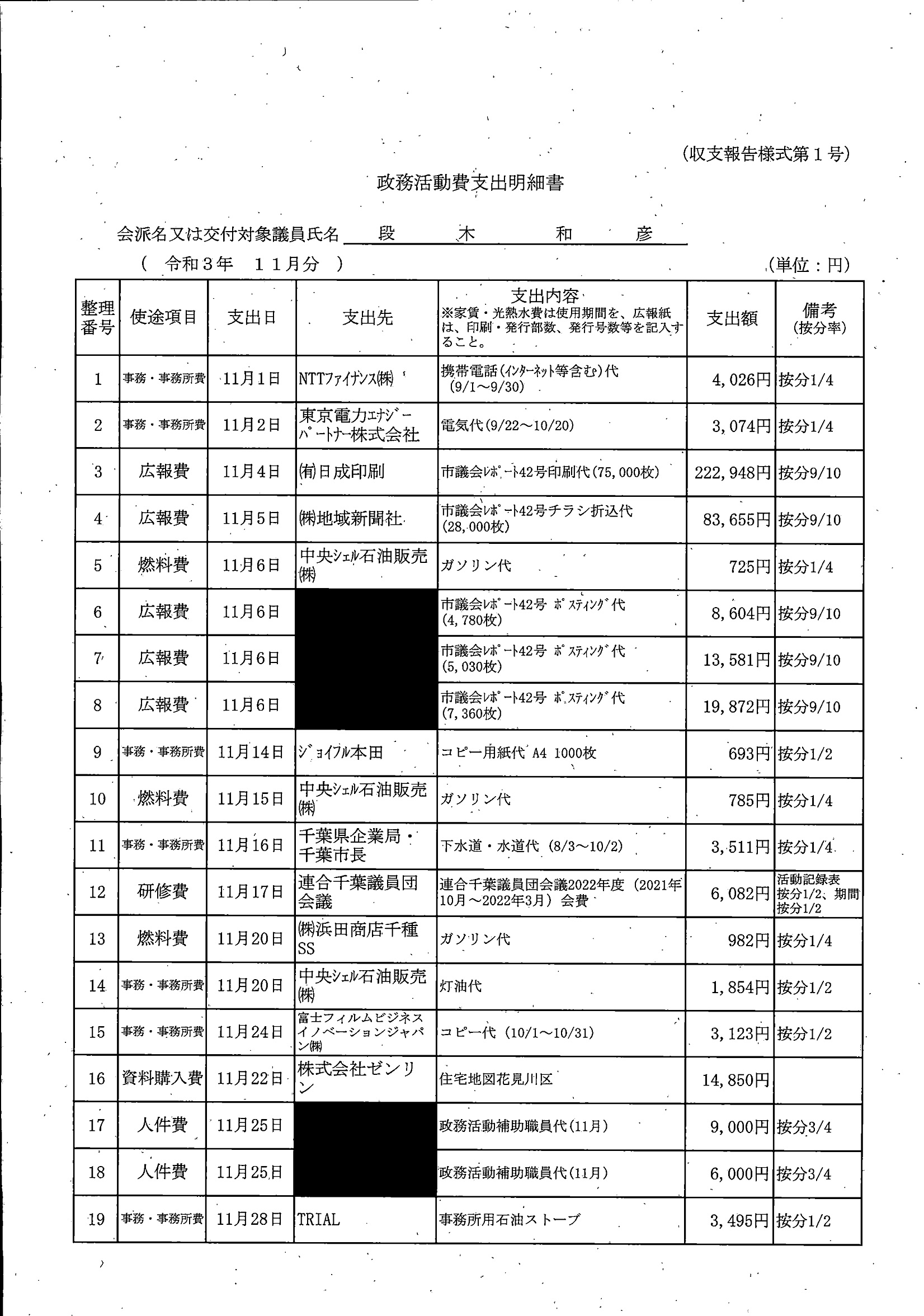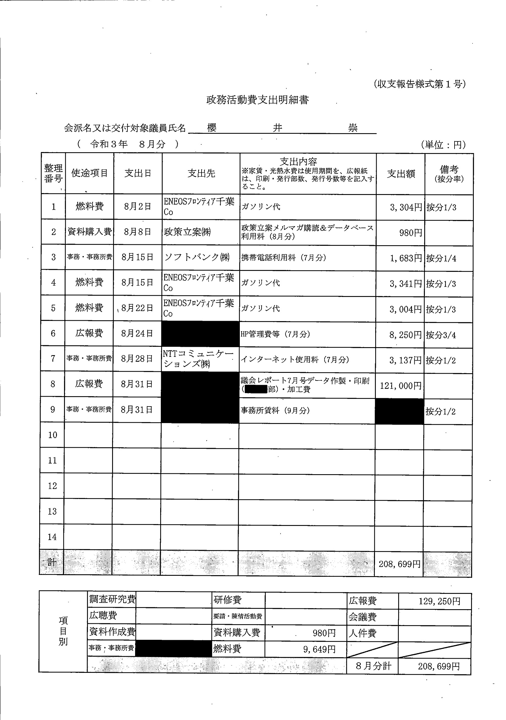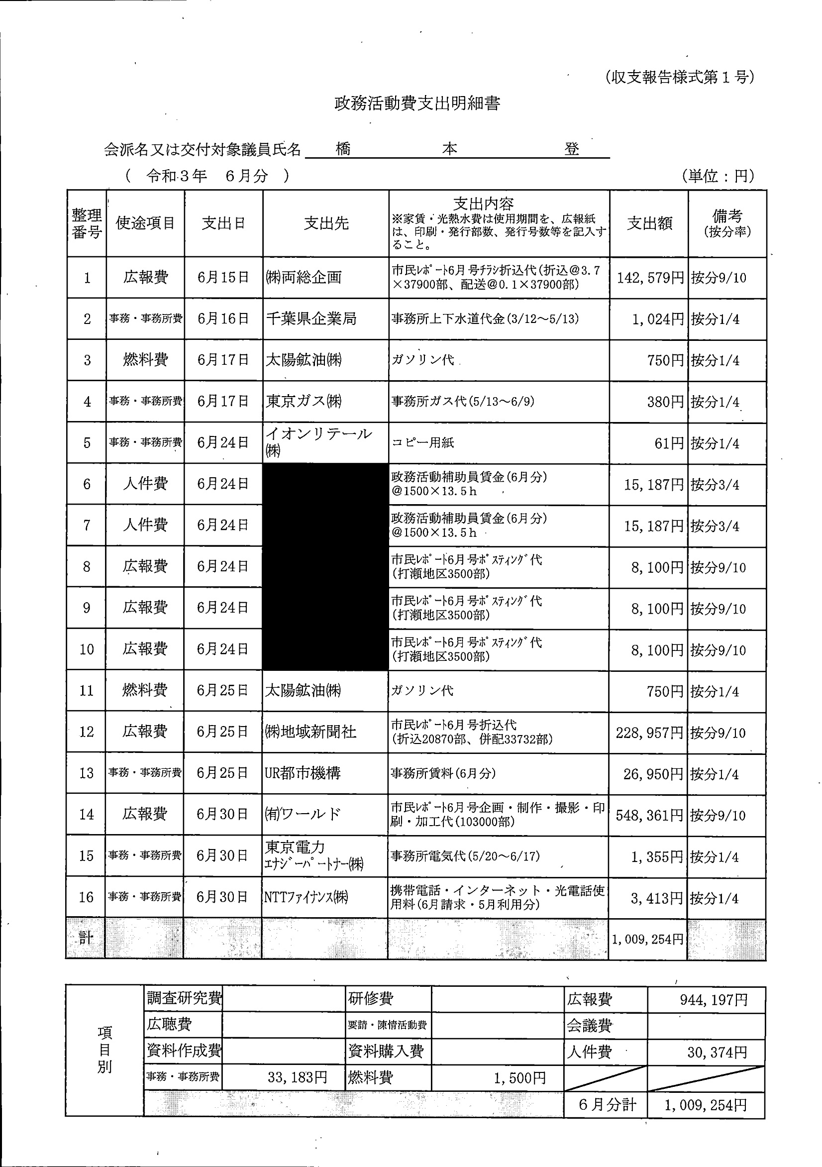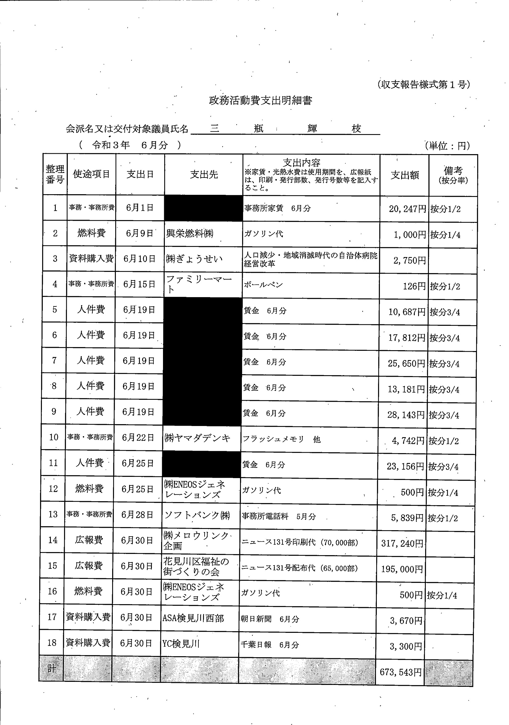 千葉市議会トップページ > 広報・情報公開 > 政務活動費 > 令和3年度交付分(政務活動費収支報告書)