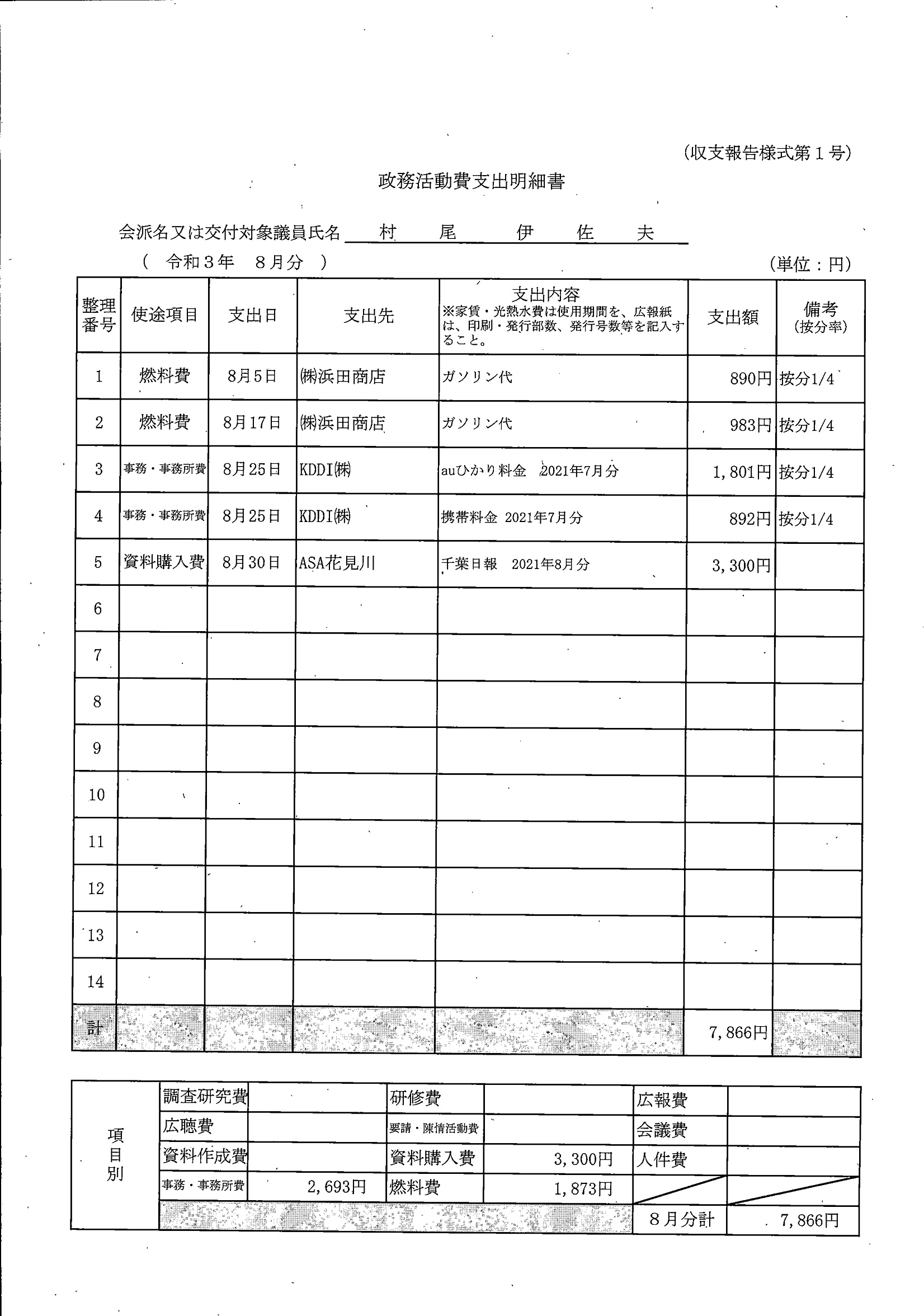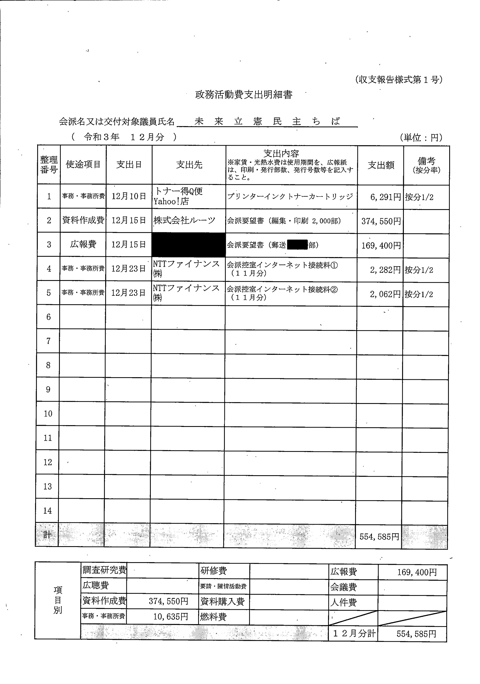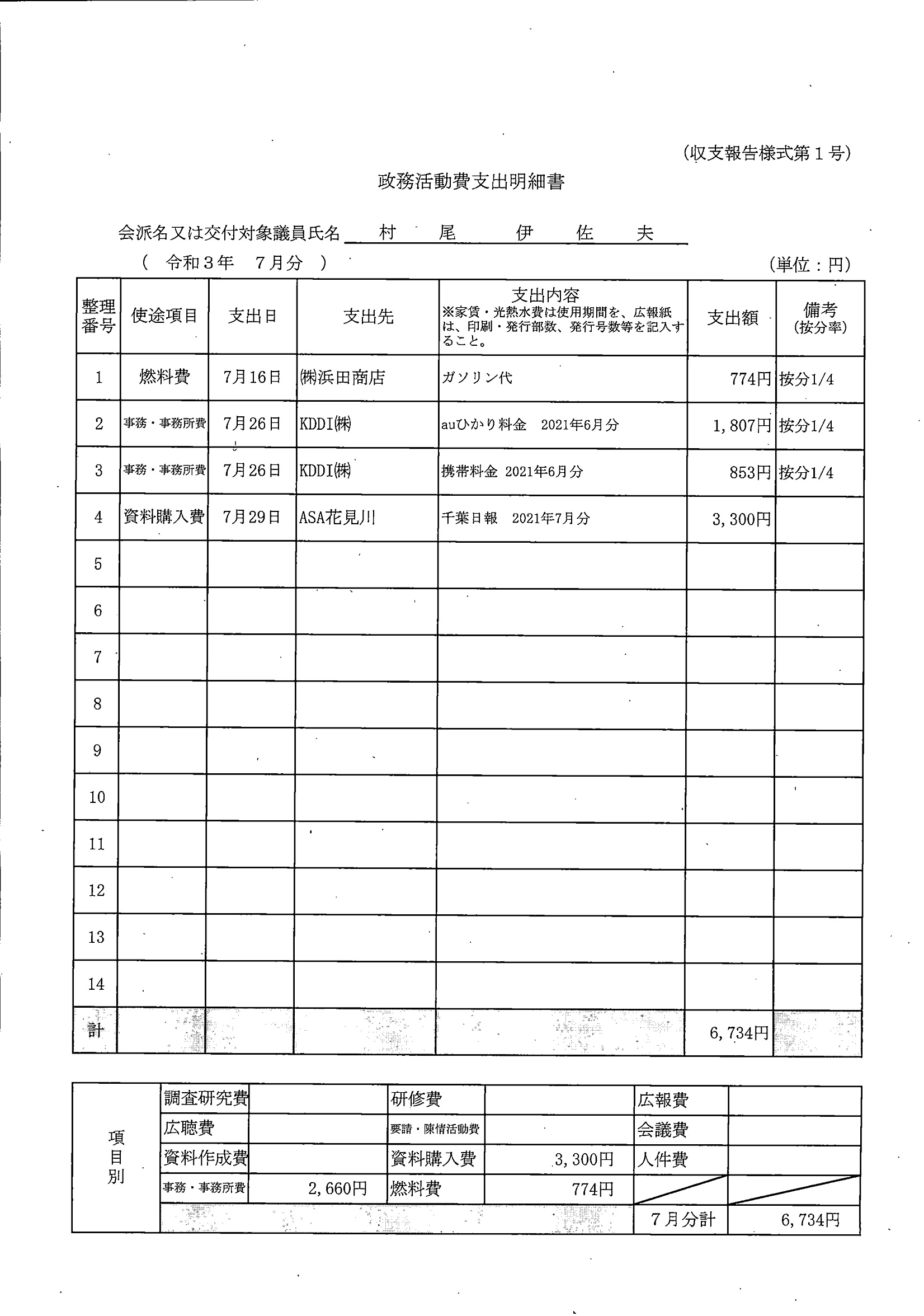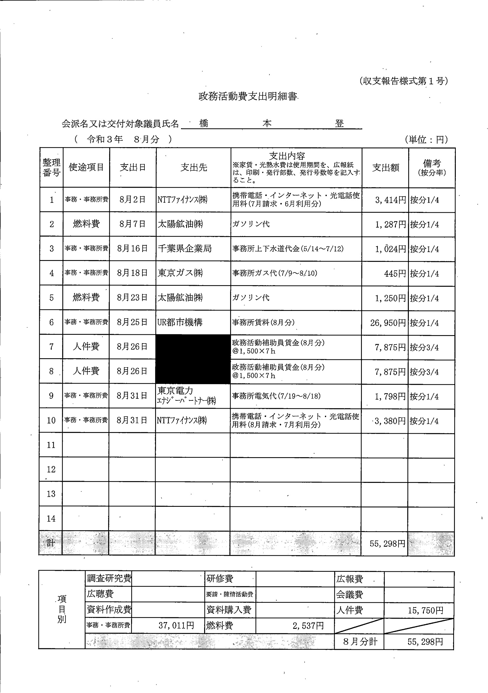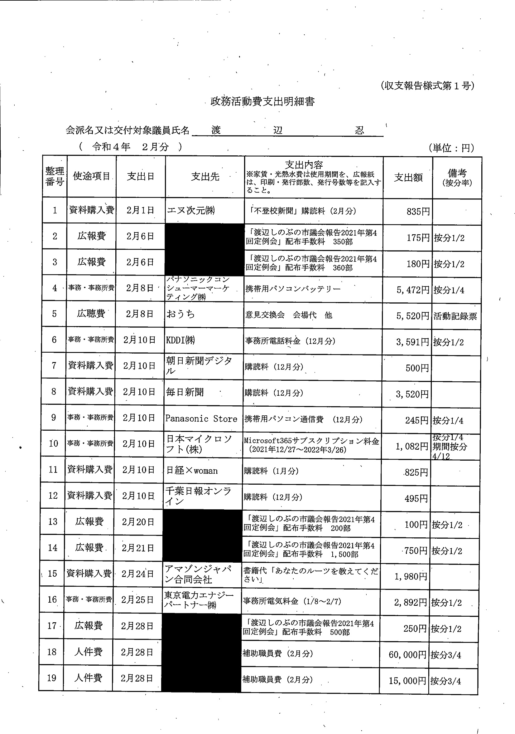 千葉市議会トップページ > 広報・情報公開 > 政務活動費 > 令和3年度交付分(政務活動費収支報告書)