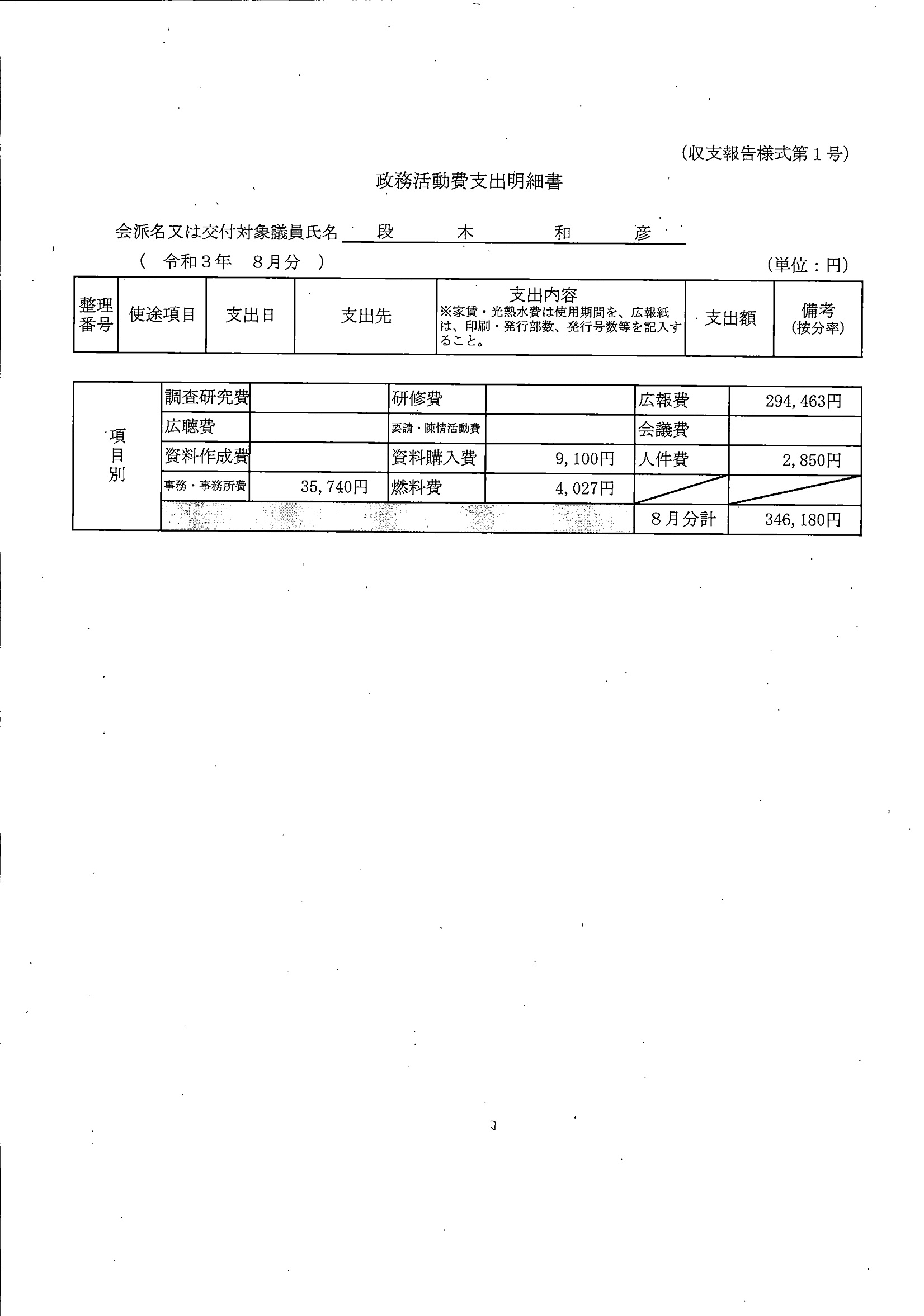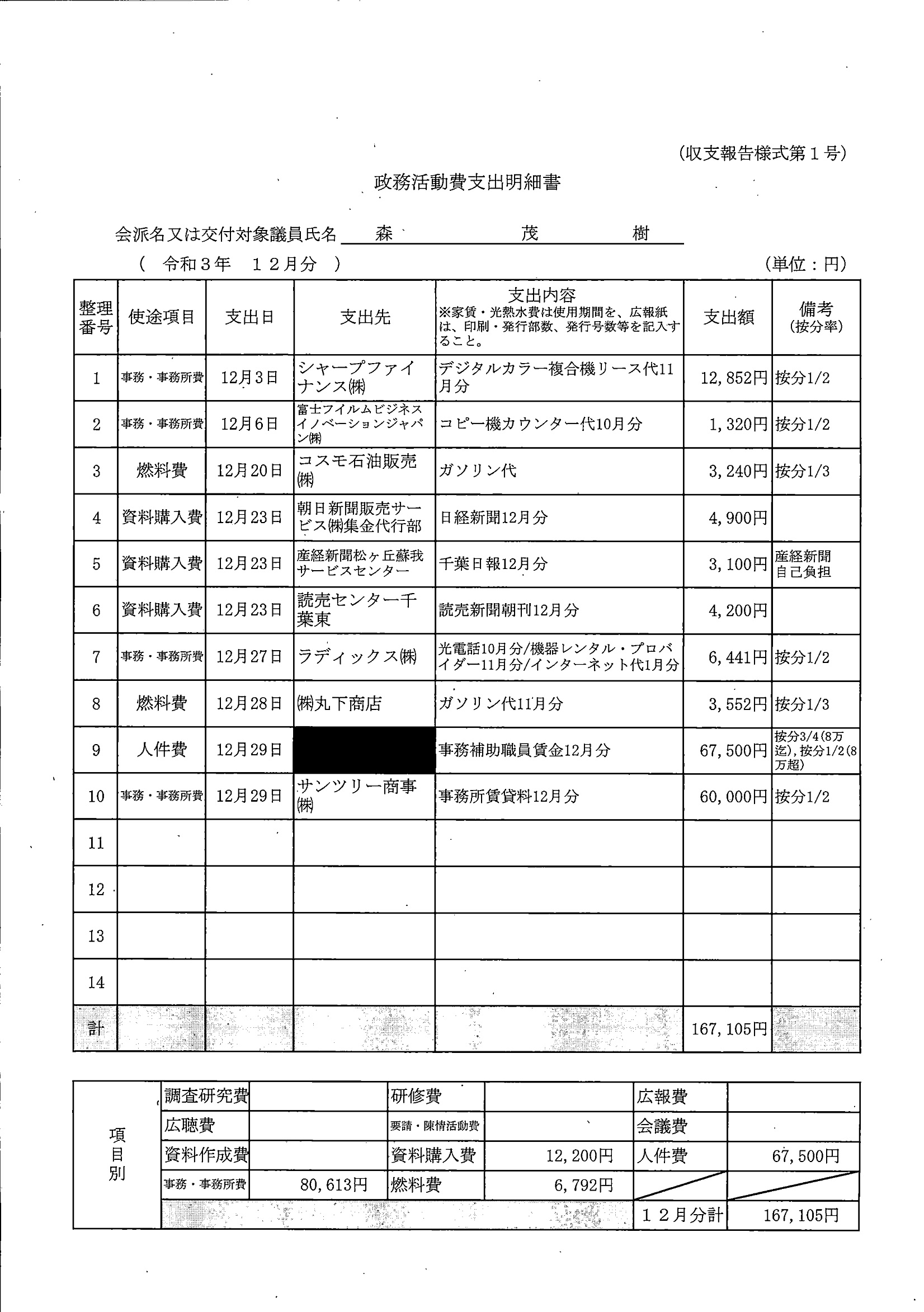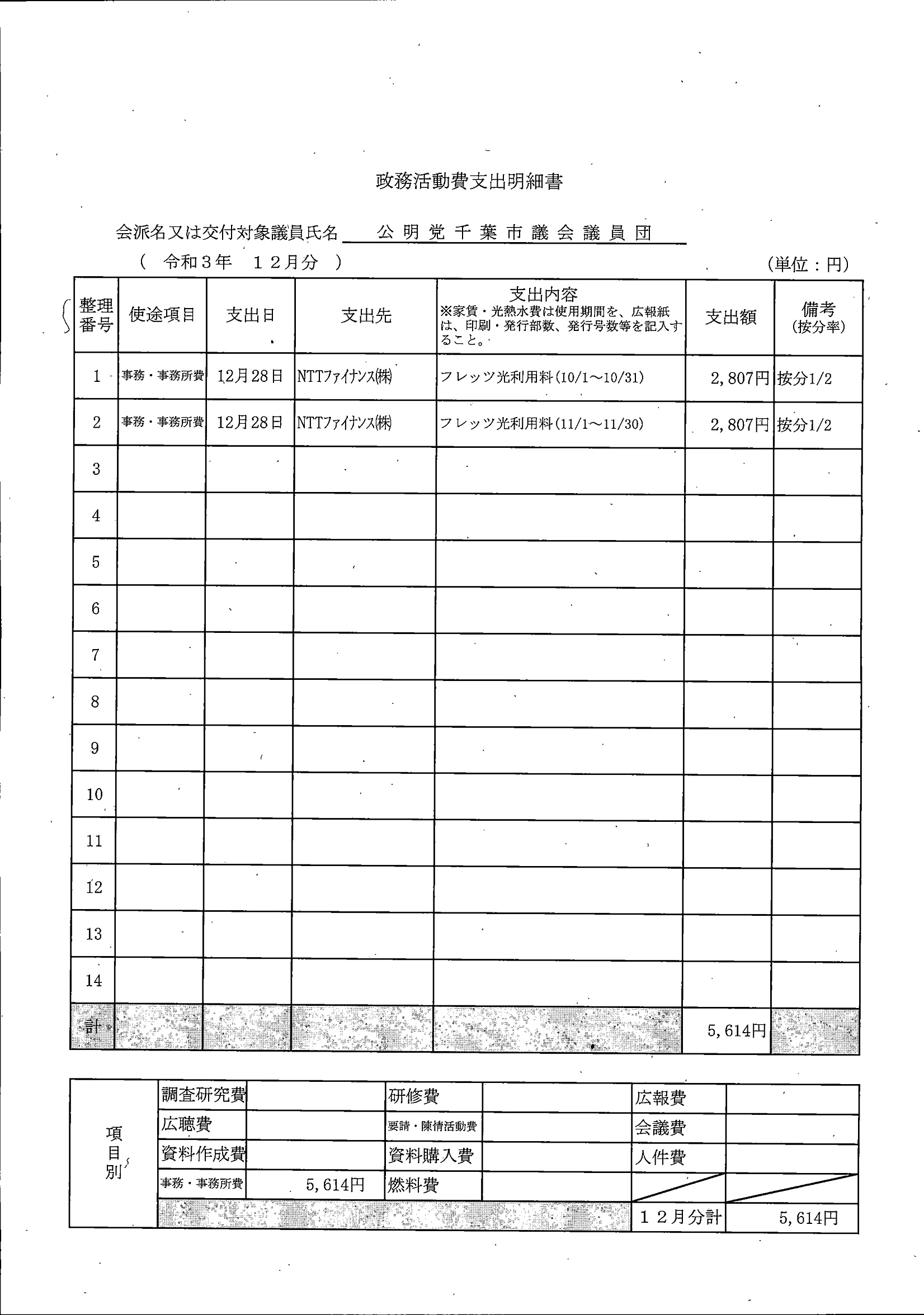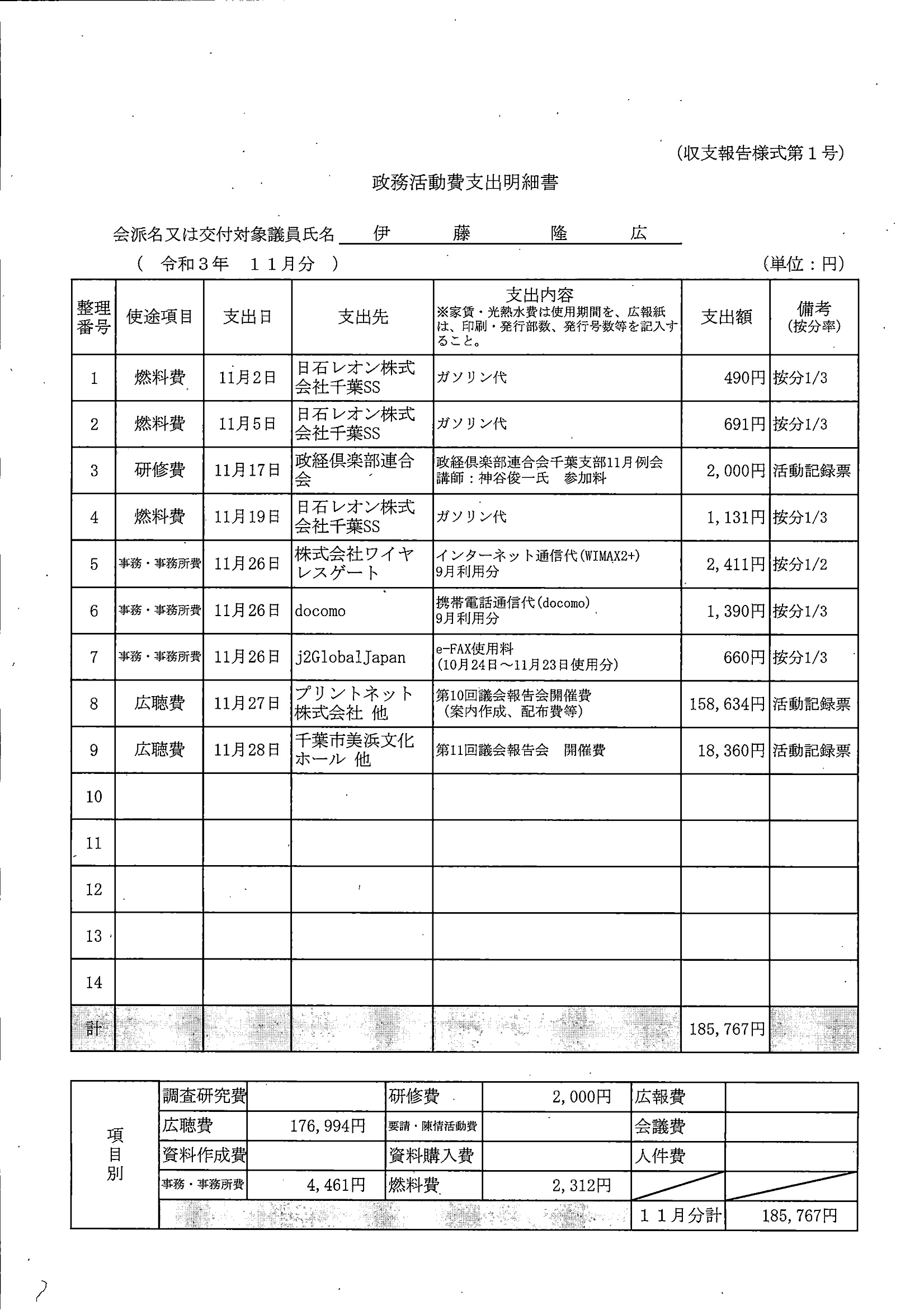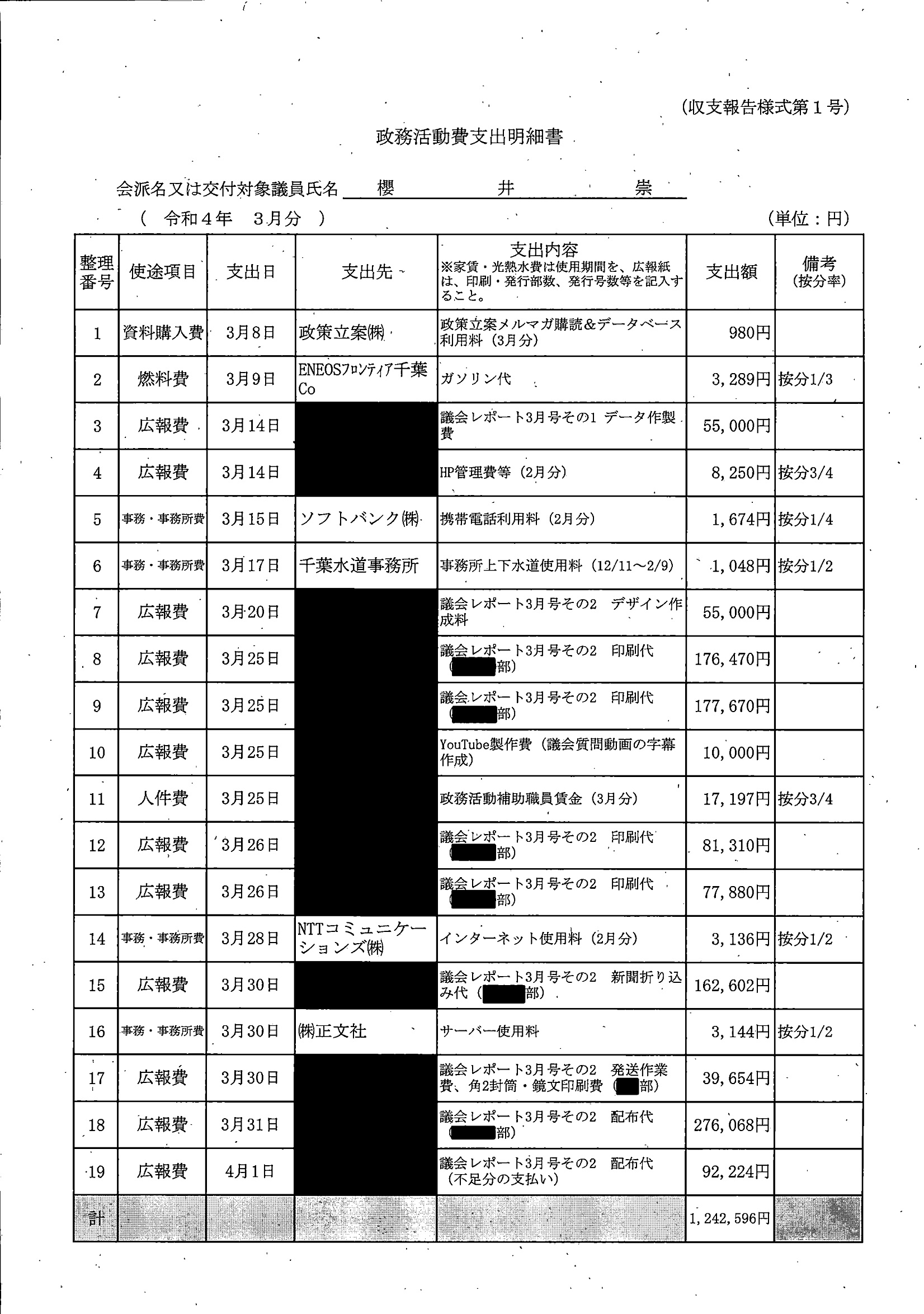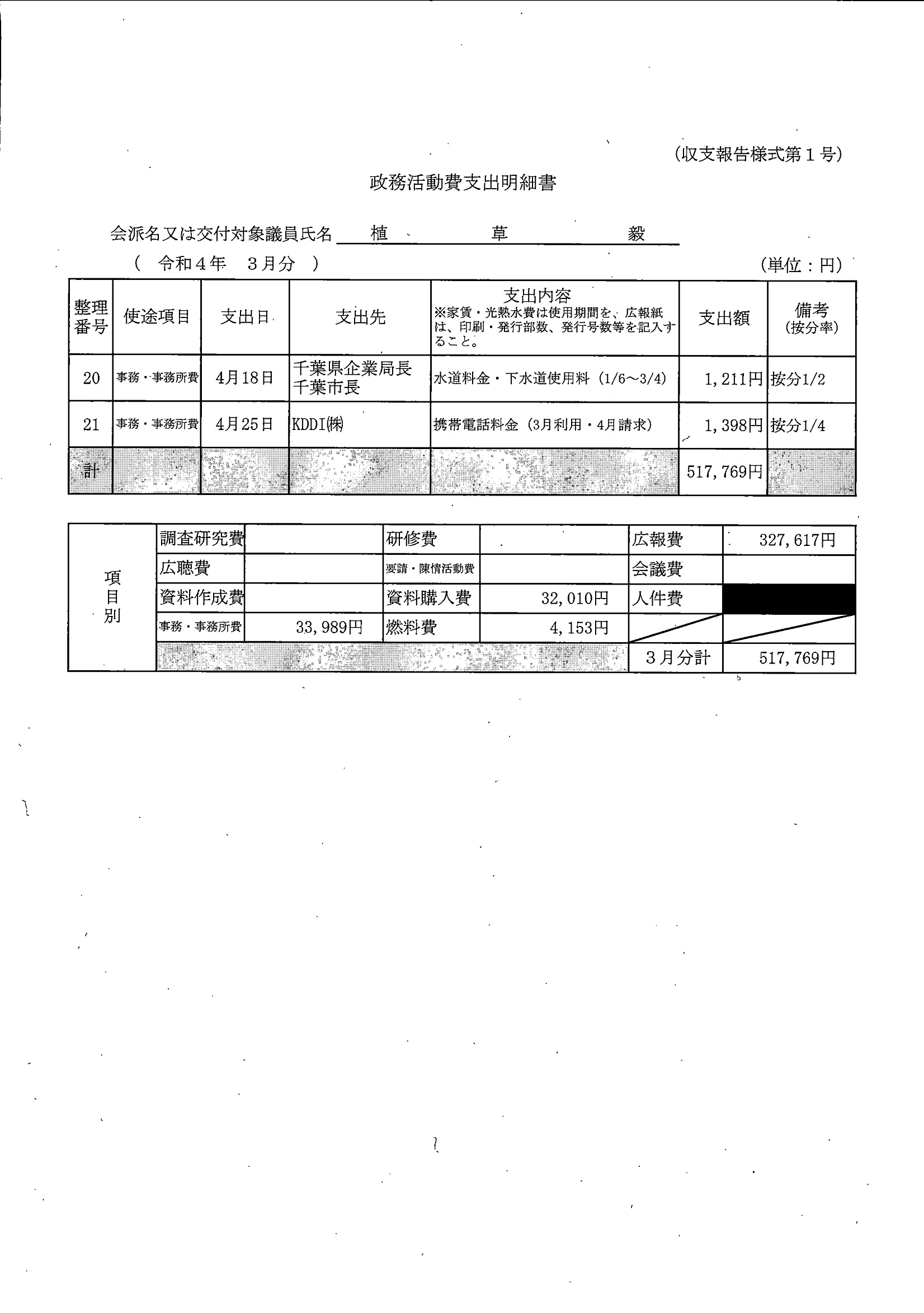 千葉市議会トップページ > 広報・情報公開 > 政務活動費 > 令和3年度交付分(政務活動費収支報告書)