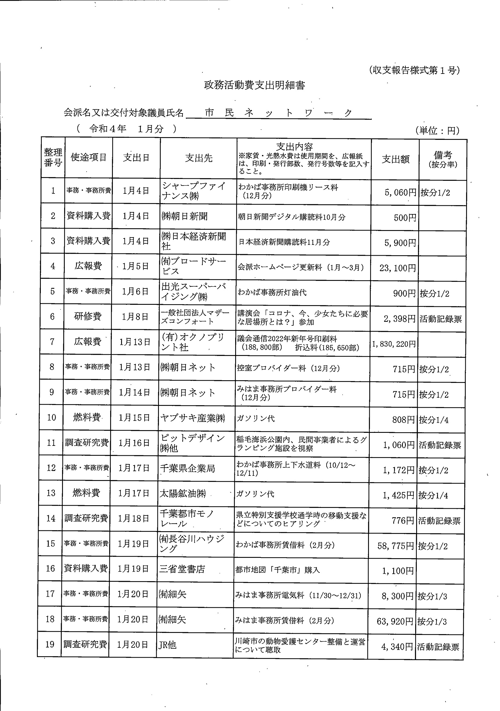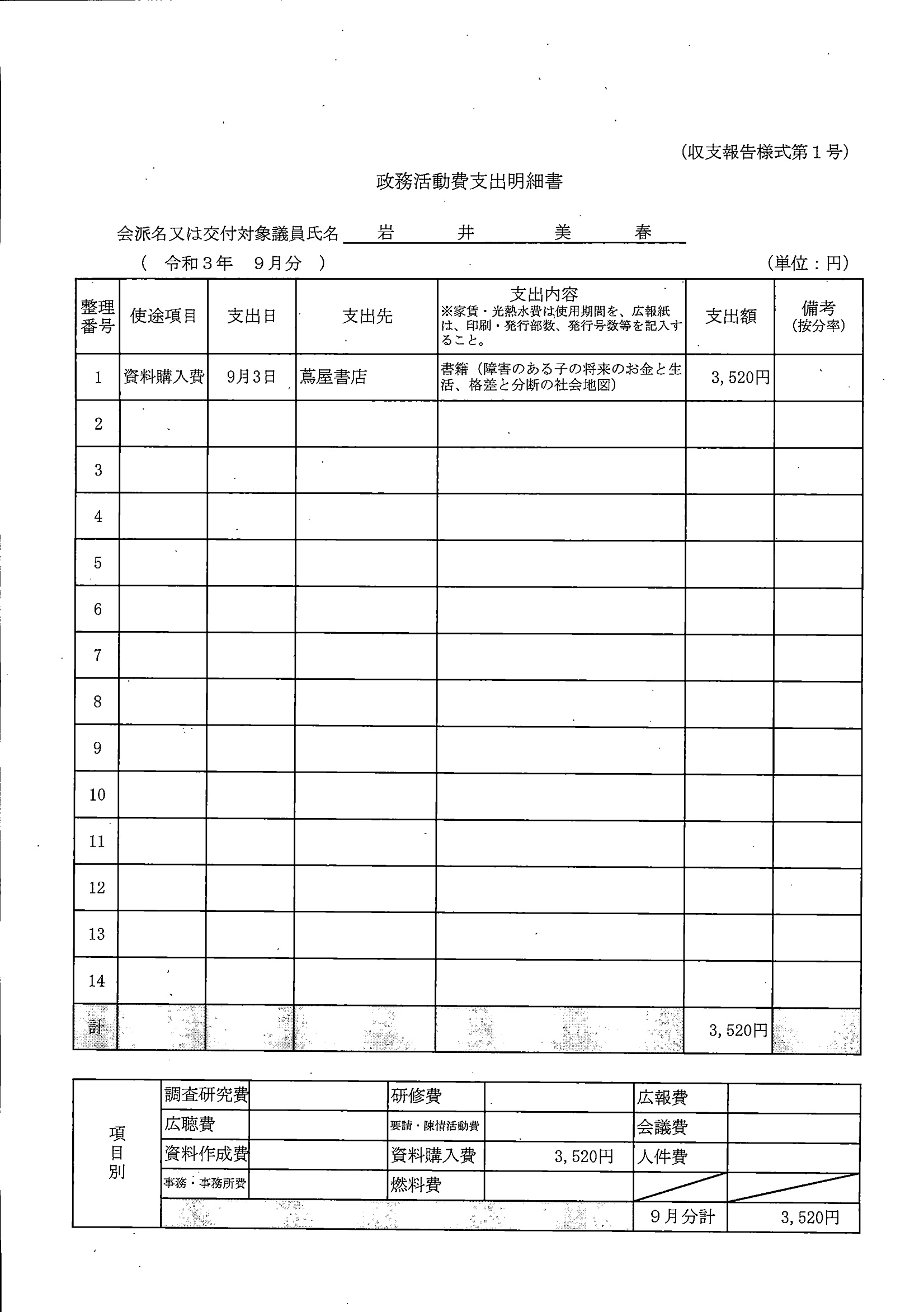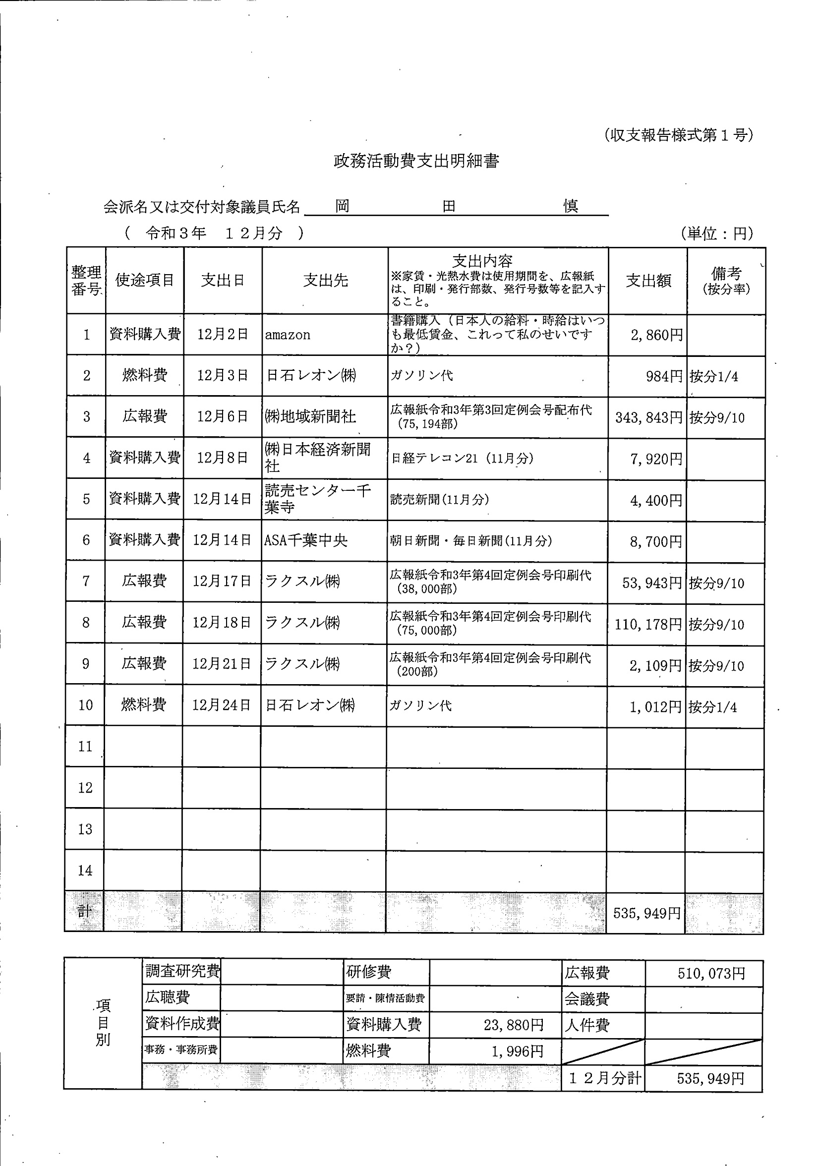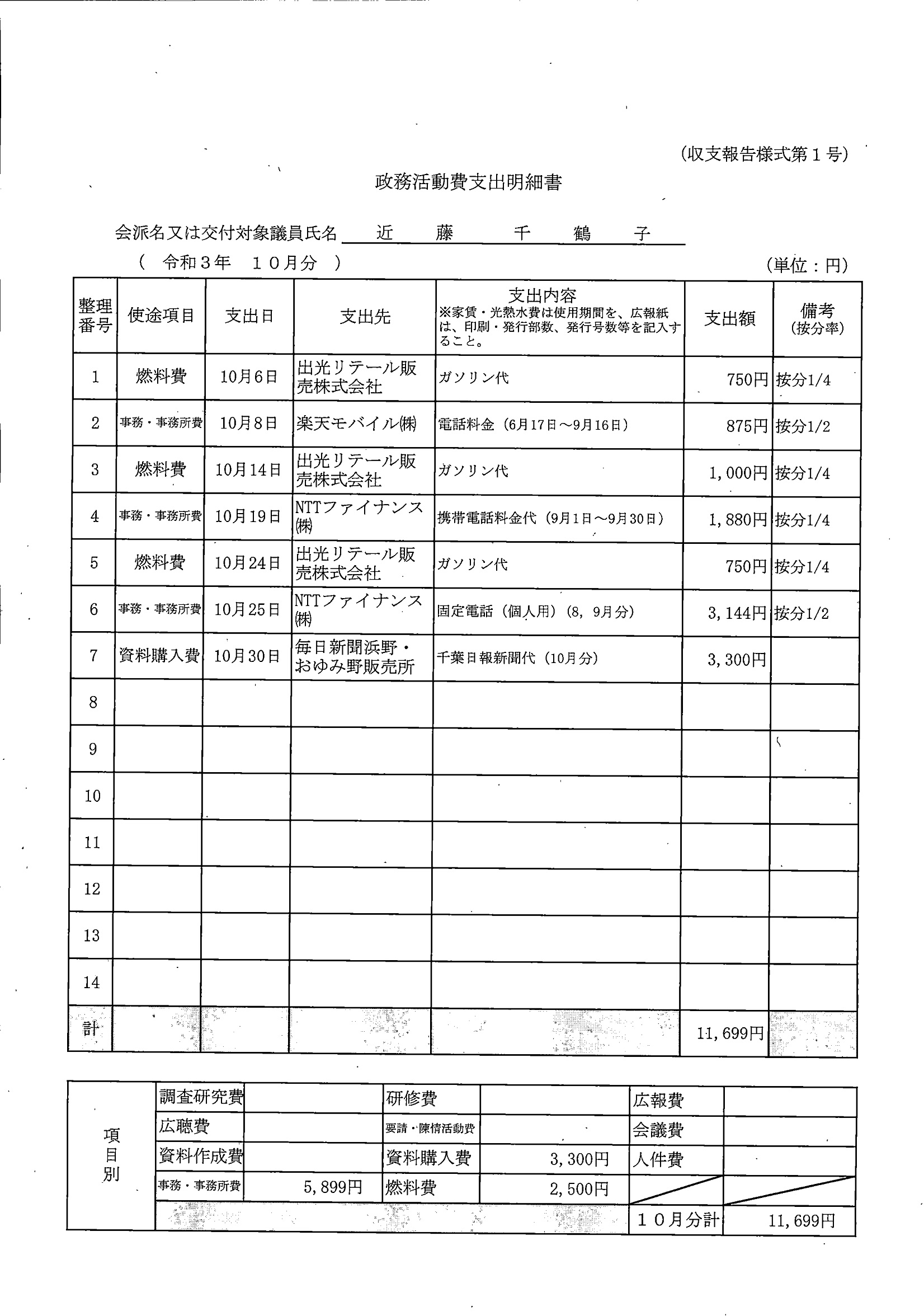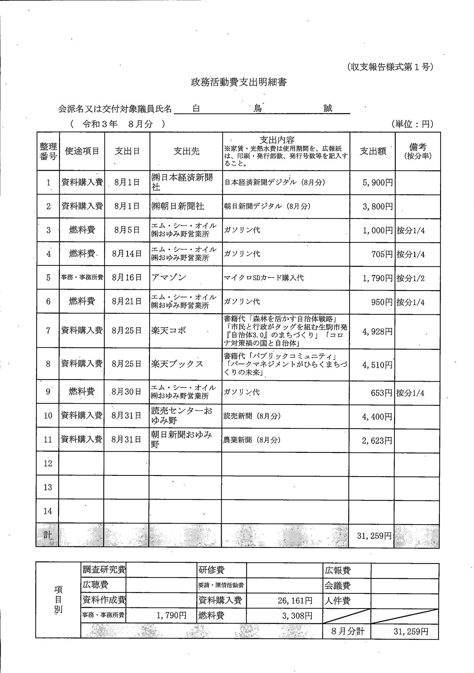 千葉市議会トップページ > 広報・情報公開 > 政務活動費 > 令和3年度交付分(政務活動費収支報告書)