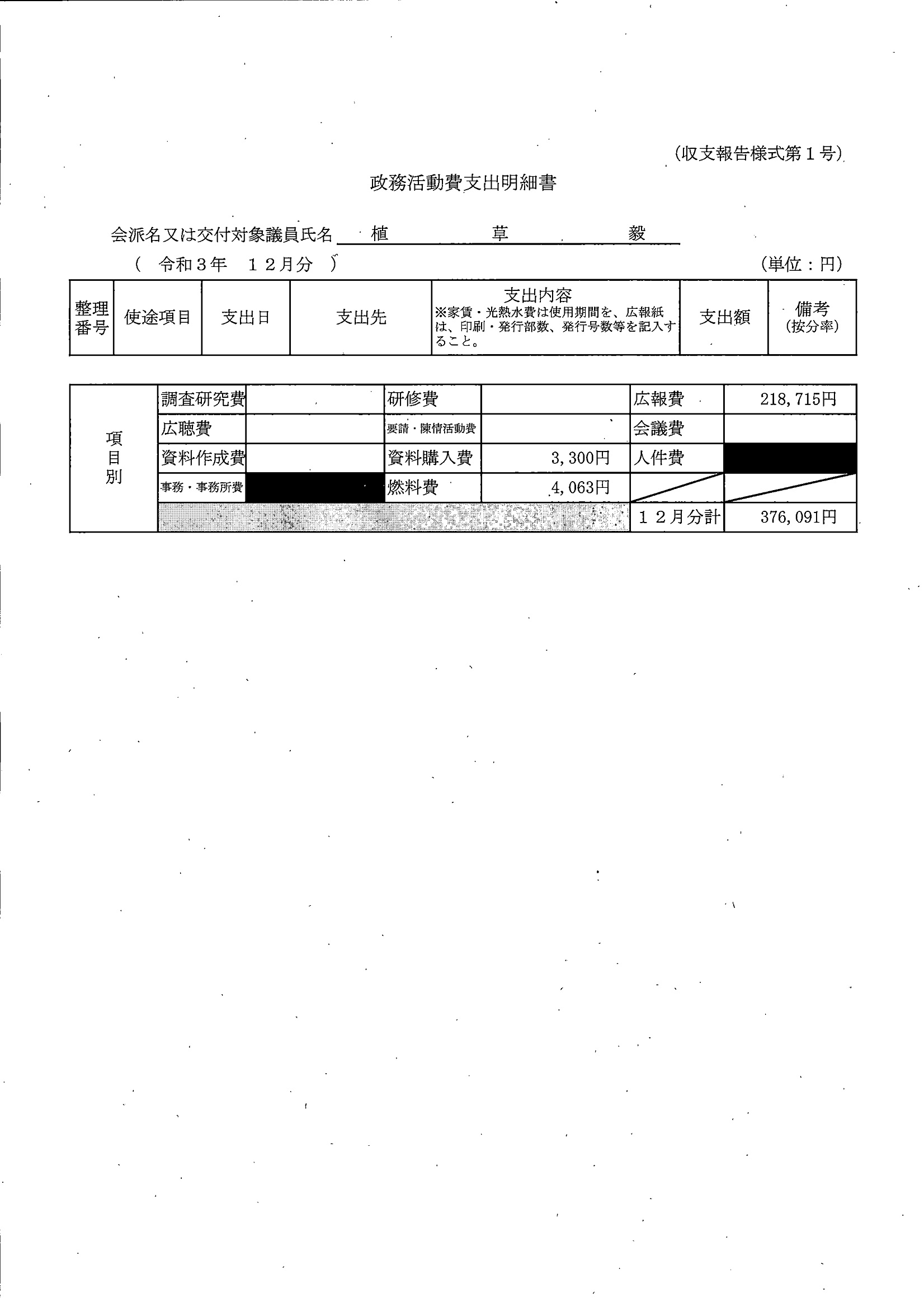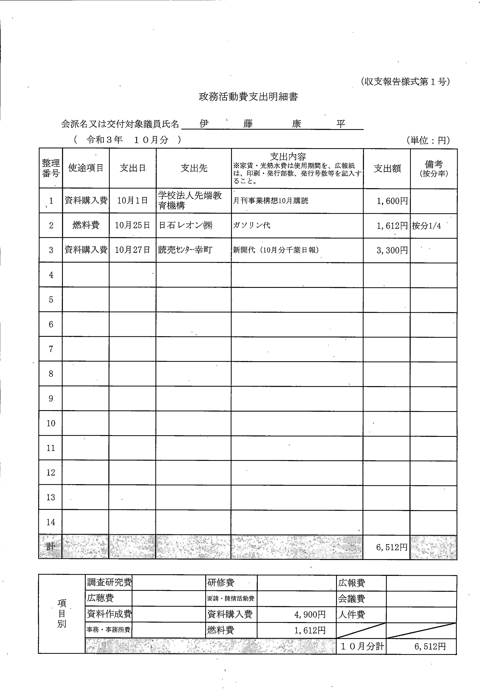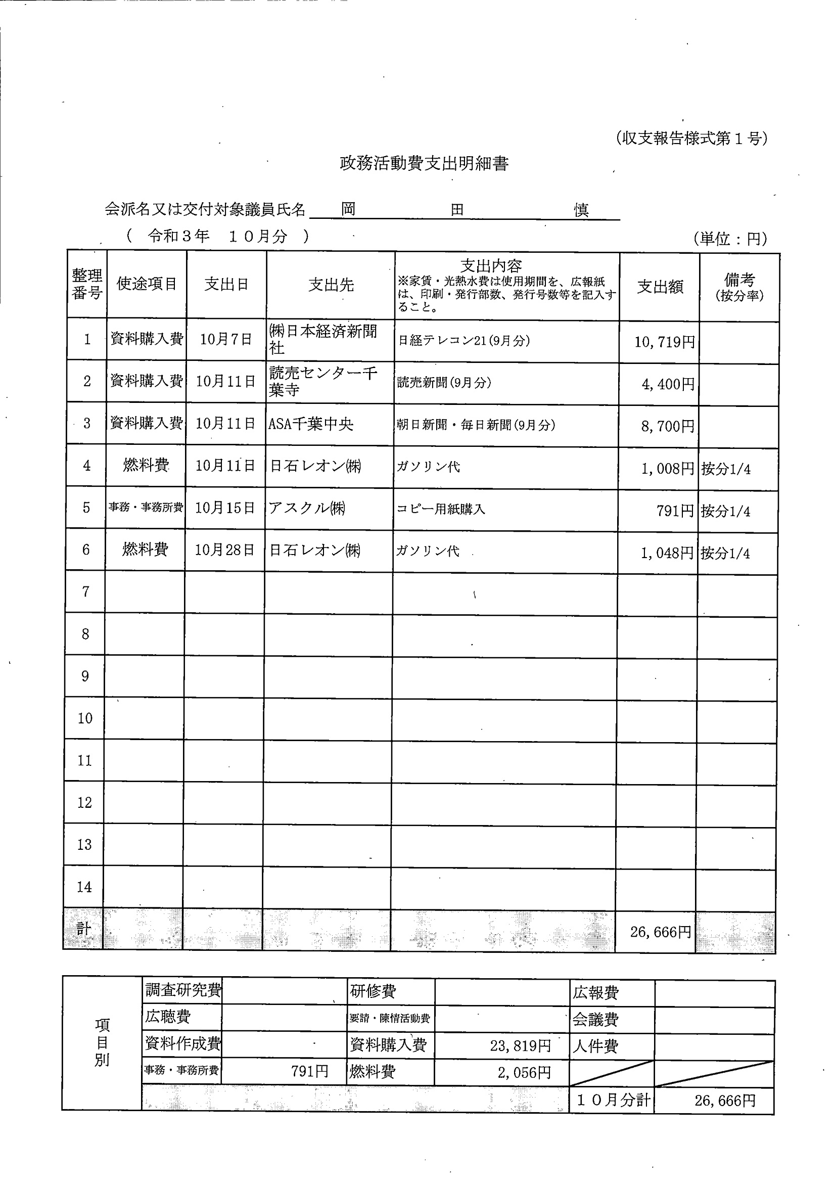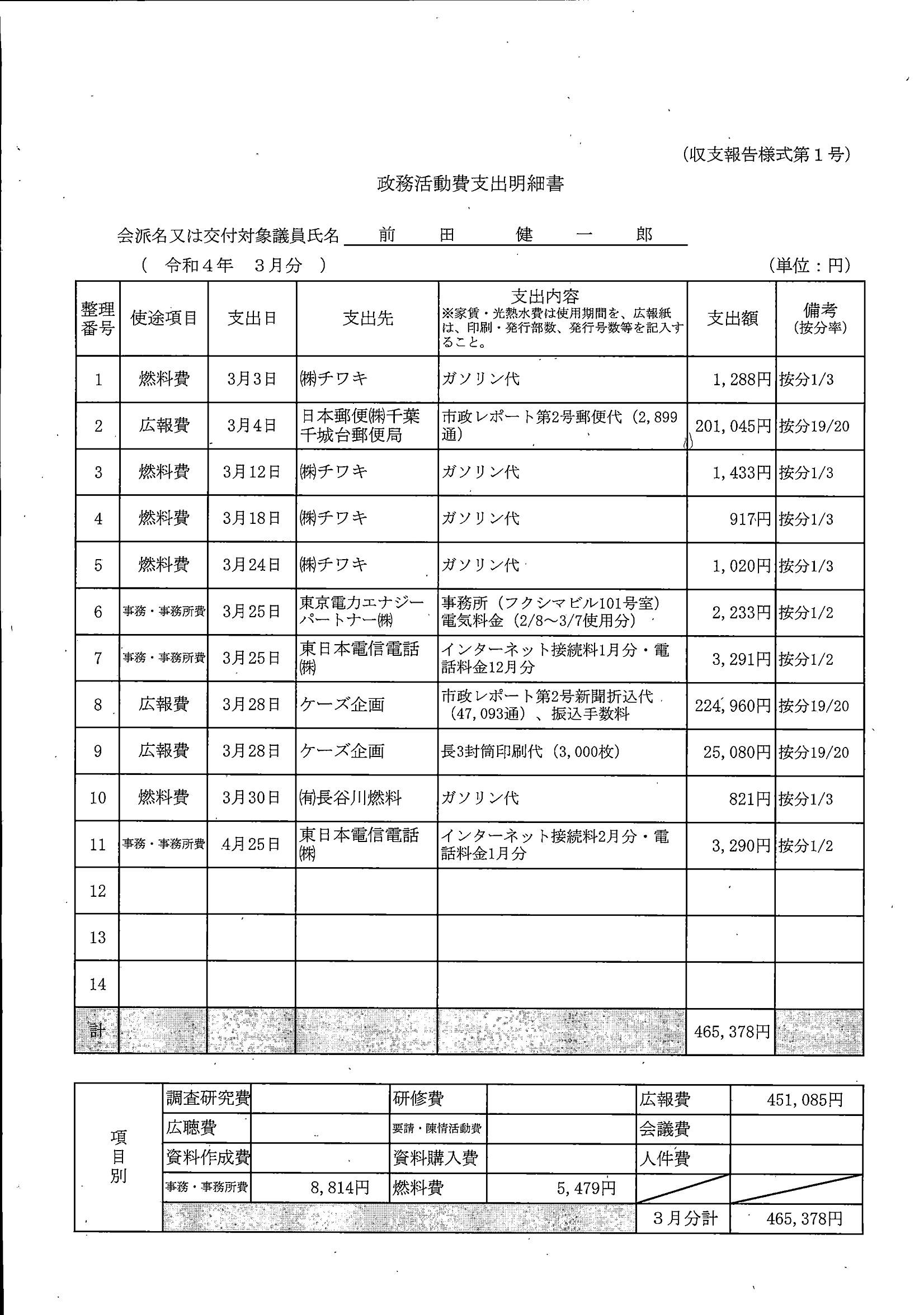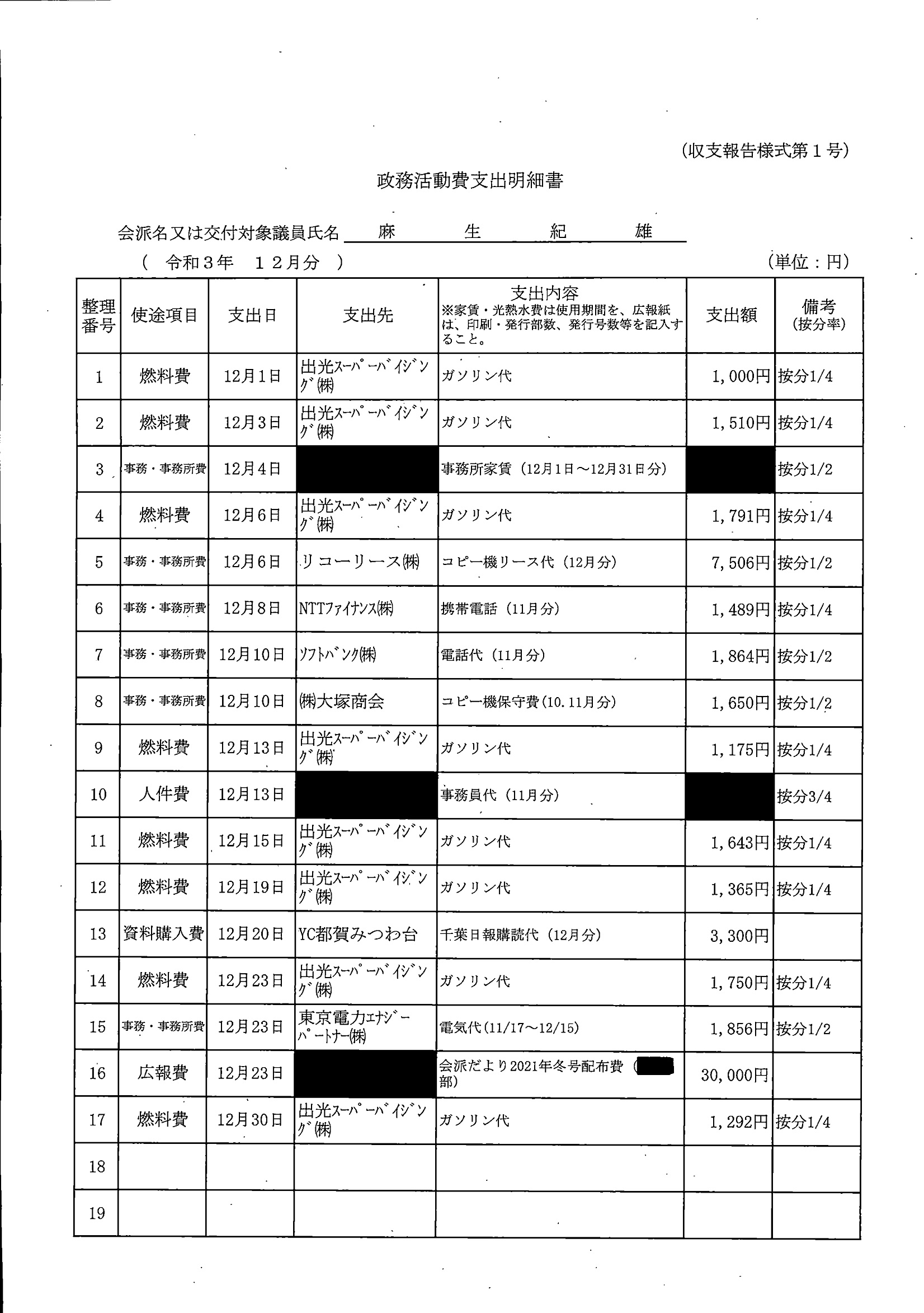 千葉市議会トップページ > 広報・情報公開 > 政務活動費 > 令和3年度交付分(政務活動費収支報告書)