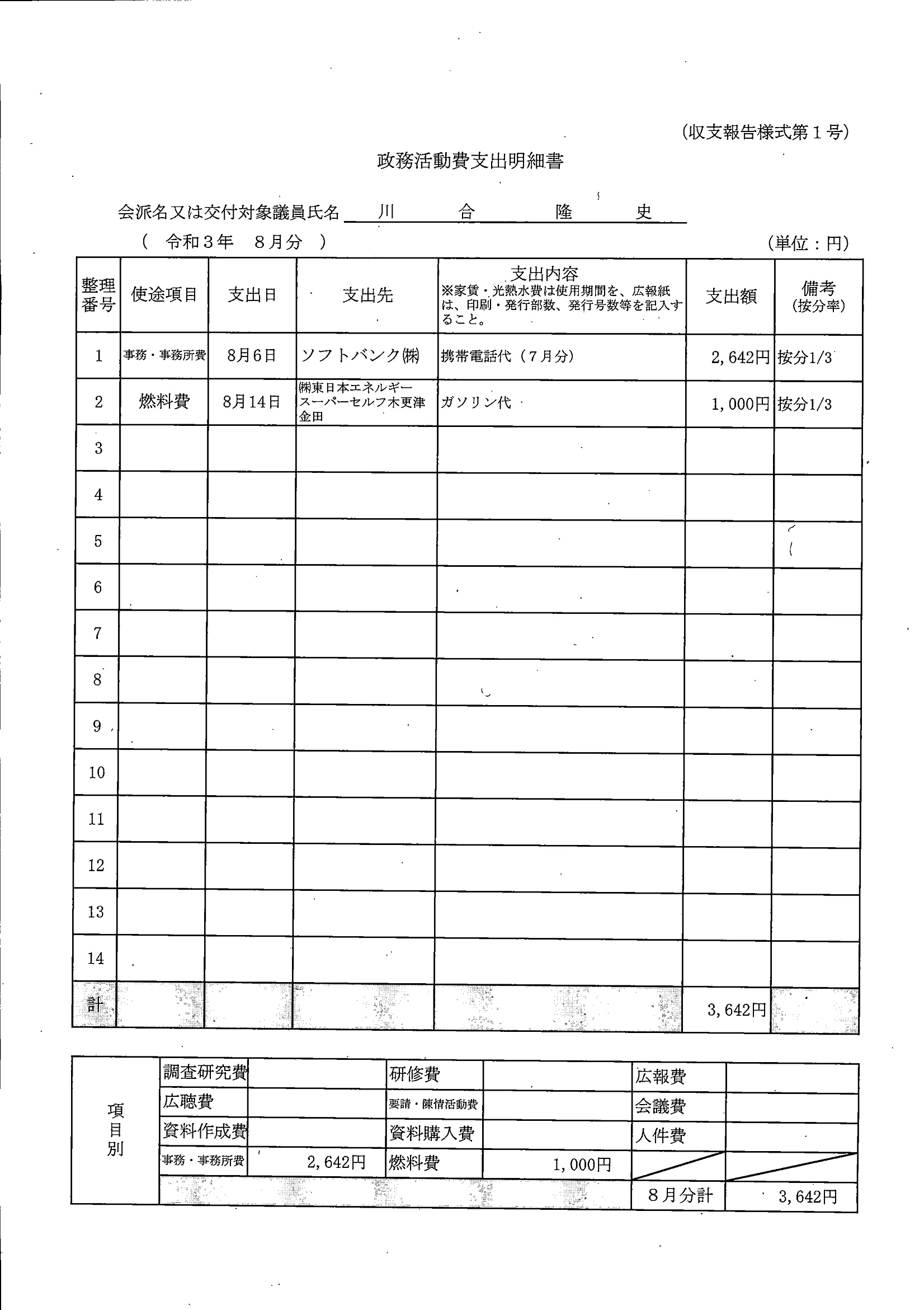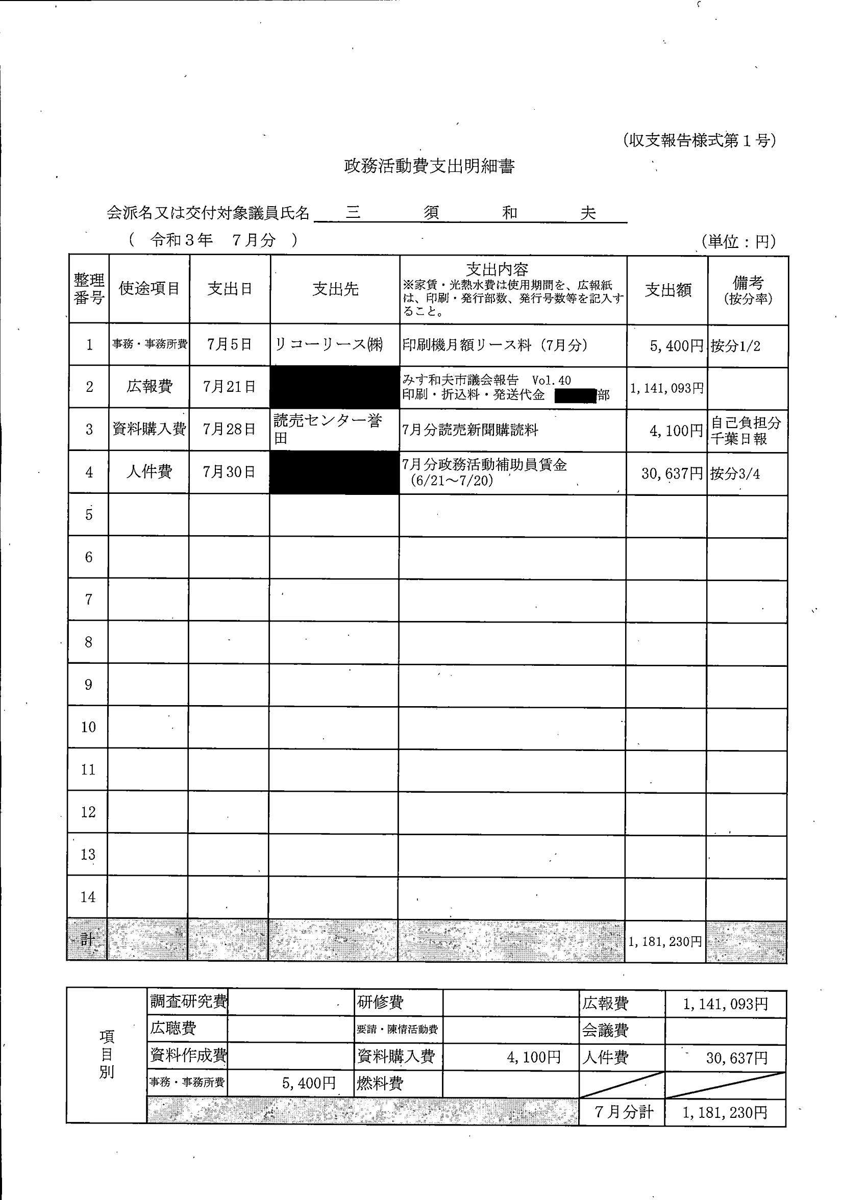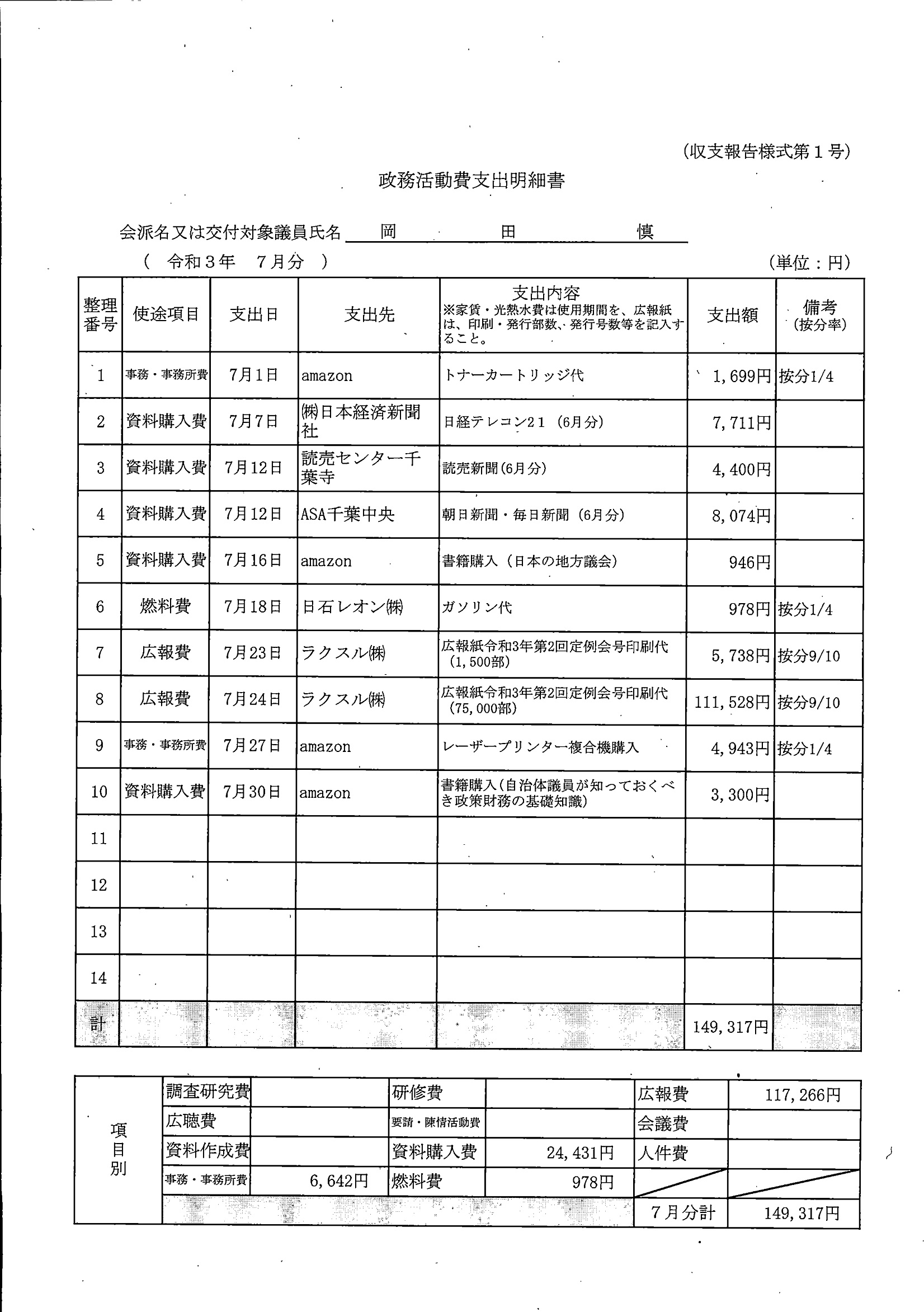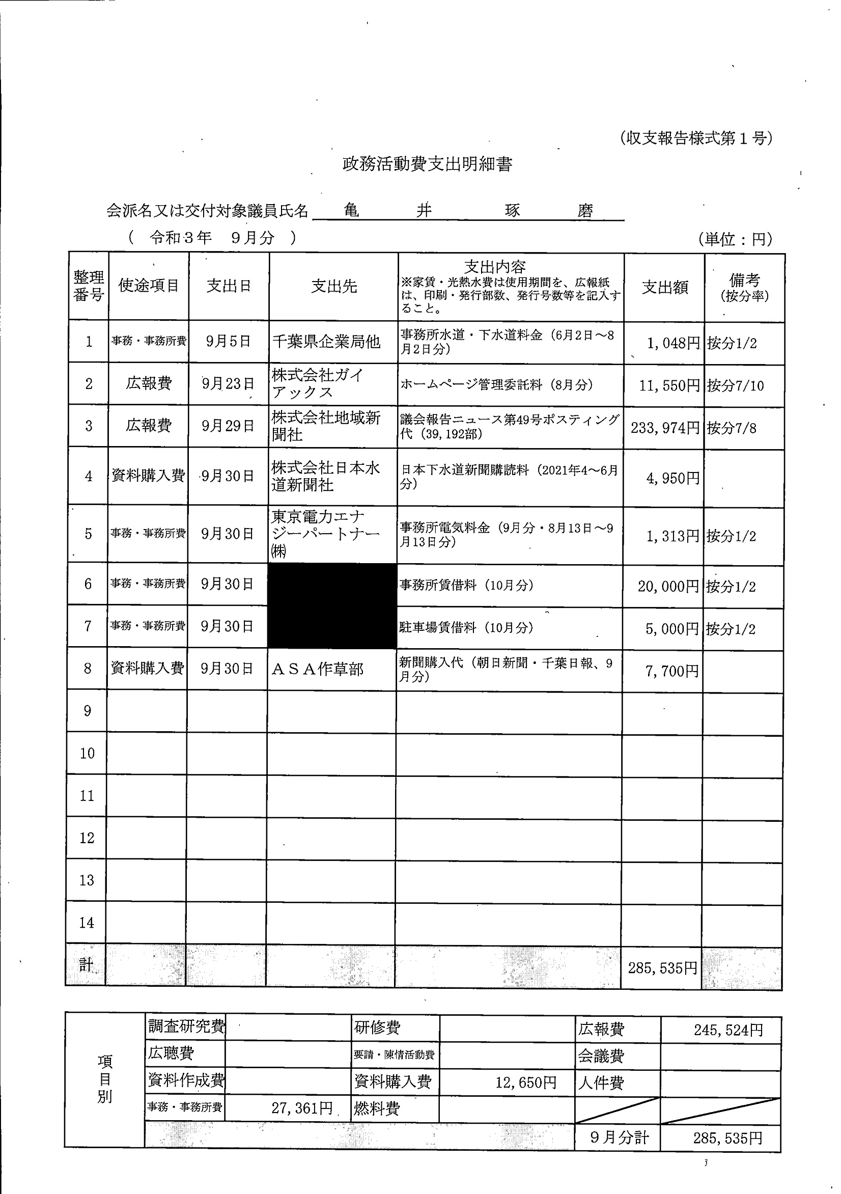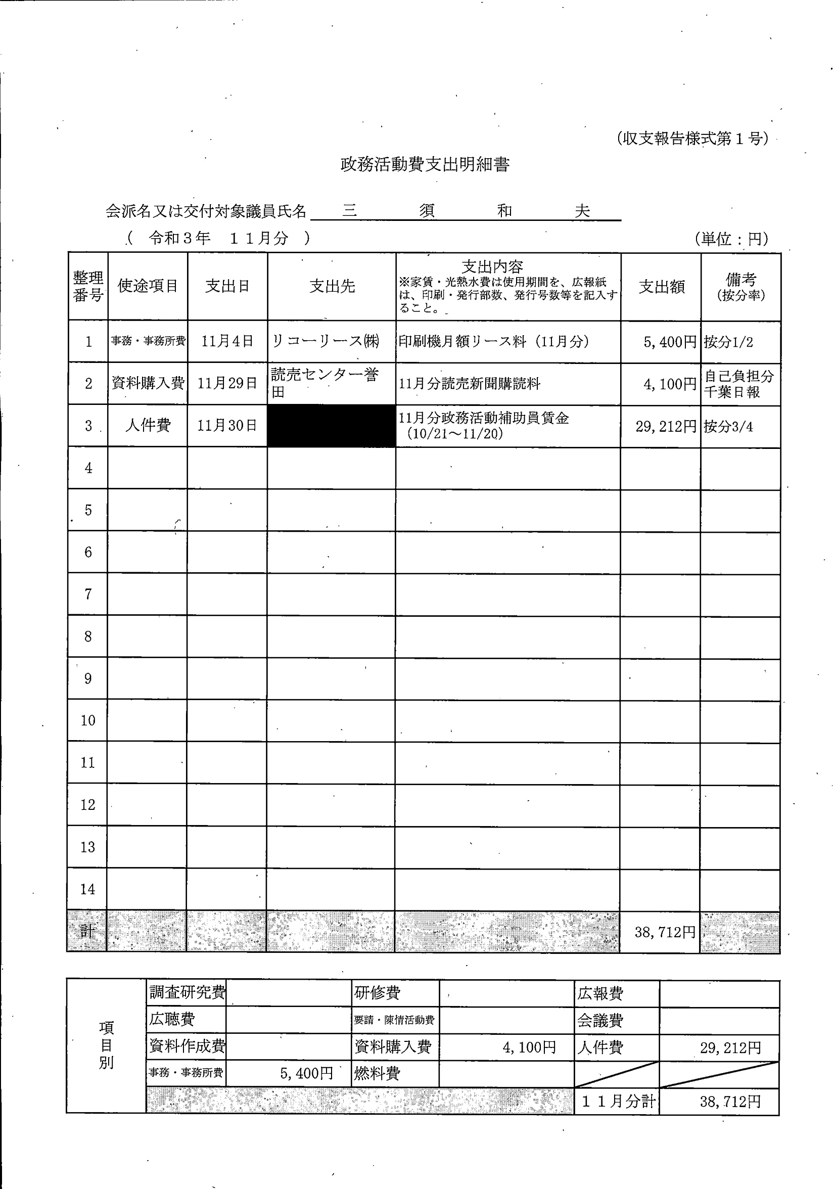 千葉市議会トップページ > 広報・情報公開 > 政務活動費 > 令和3年度交付分(政務活動費収支報告書)