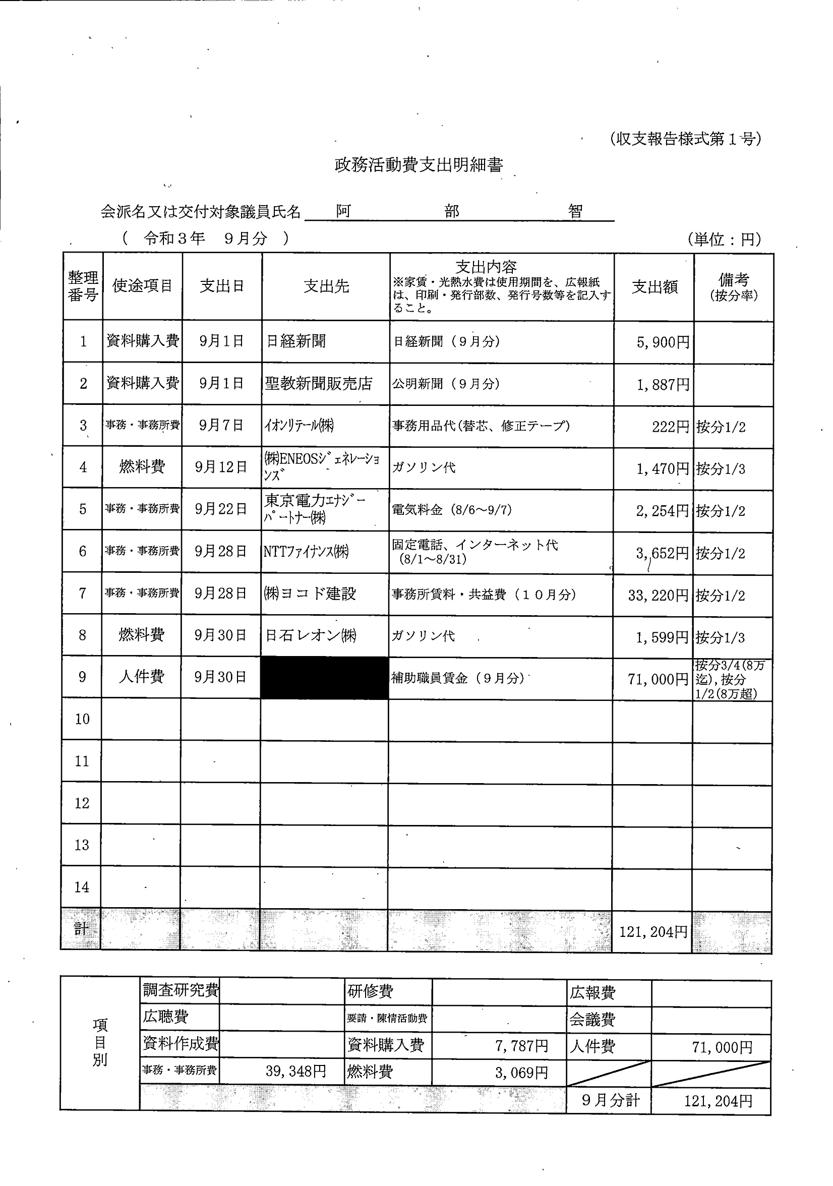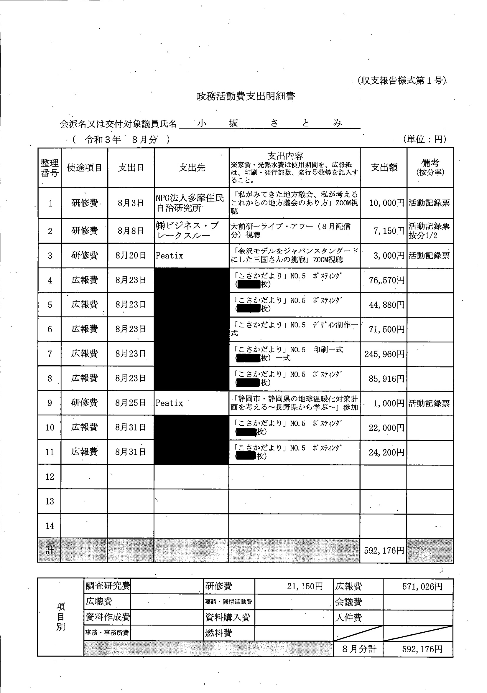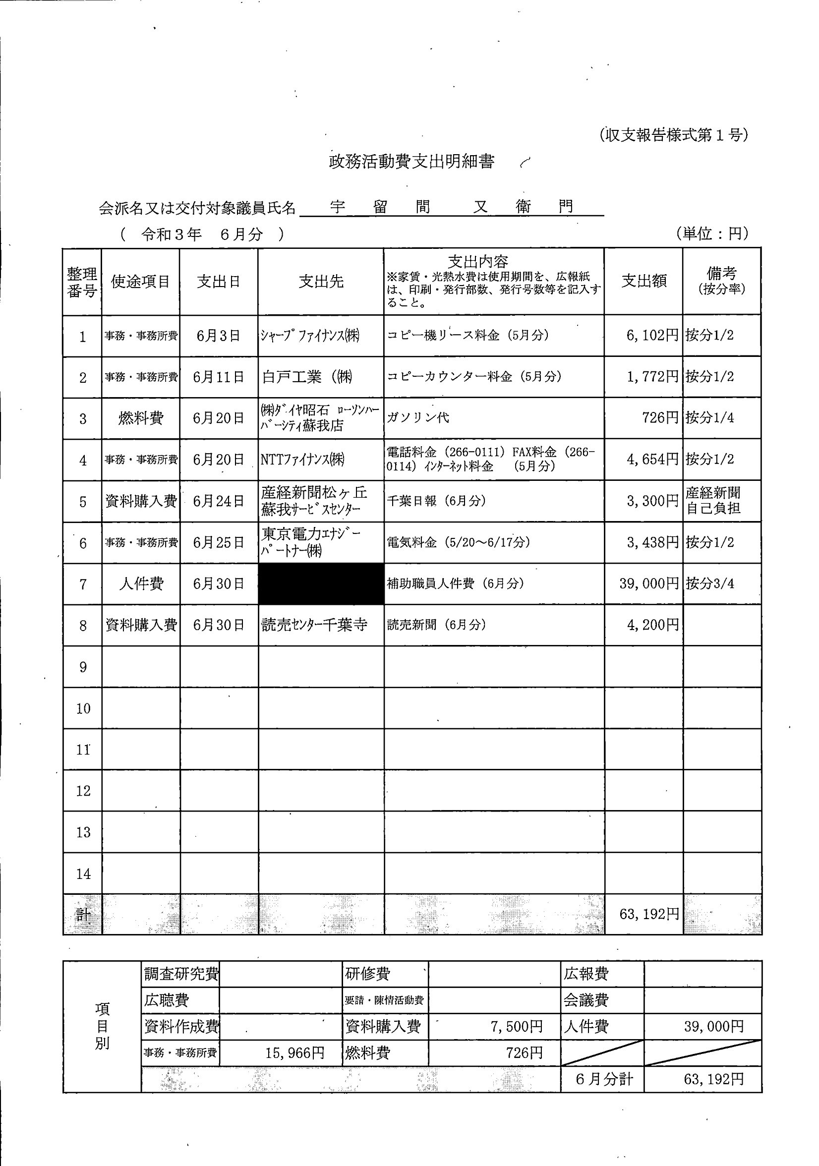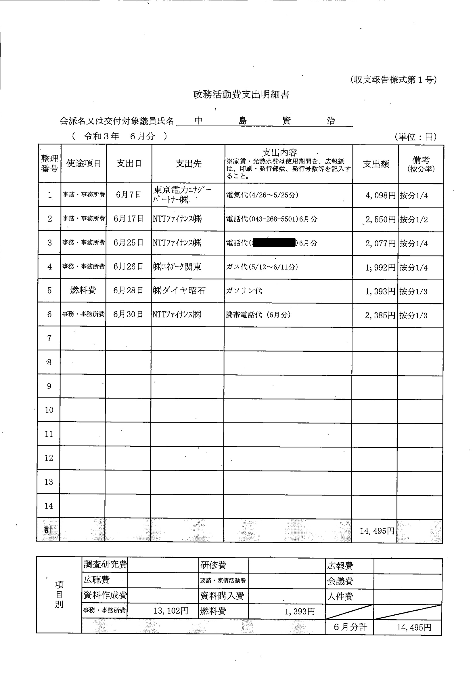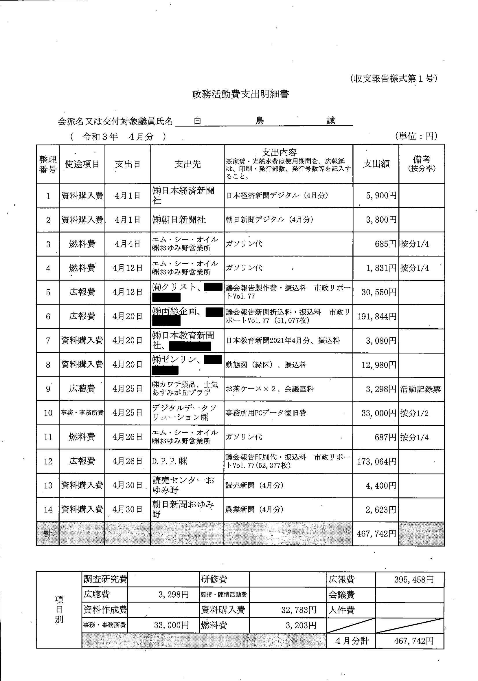 千葉市議会トップページ > 広報・情報公開 > 政務活動費 > 令和3年度交付分(政務活動費収支報告書)