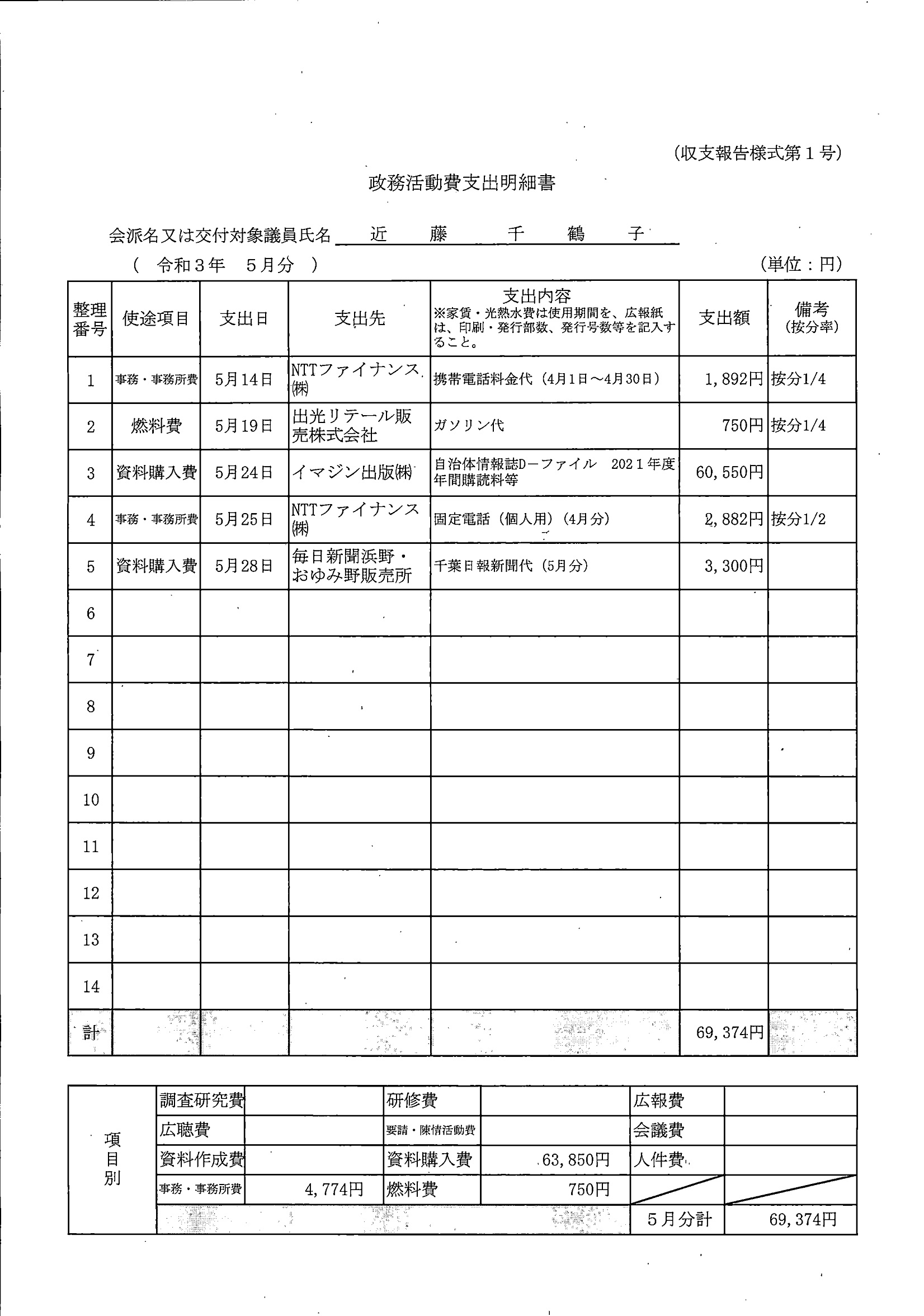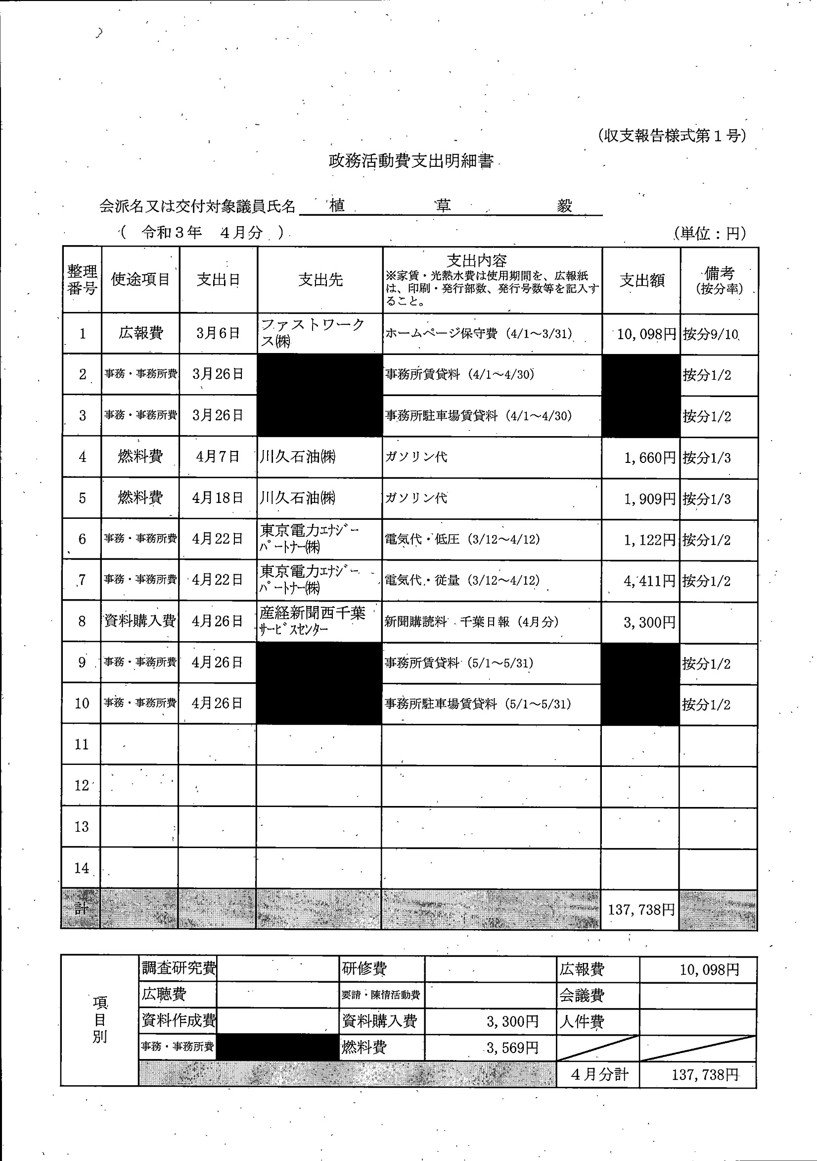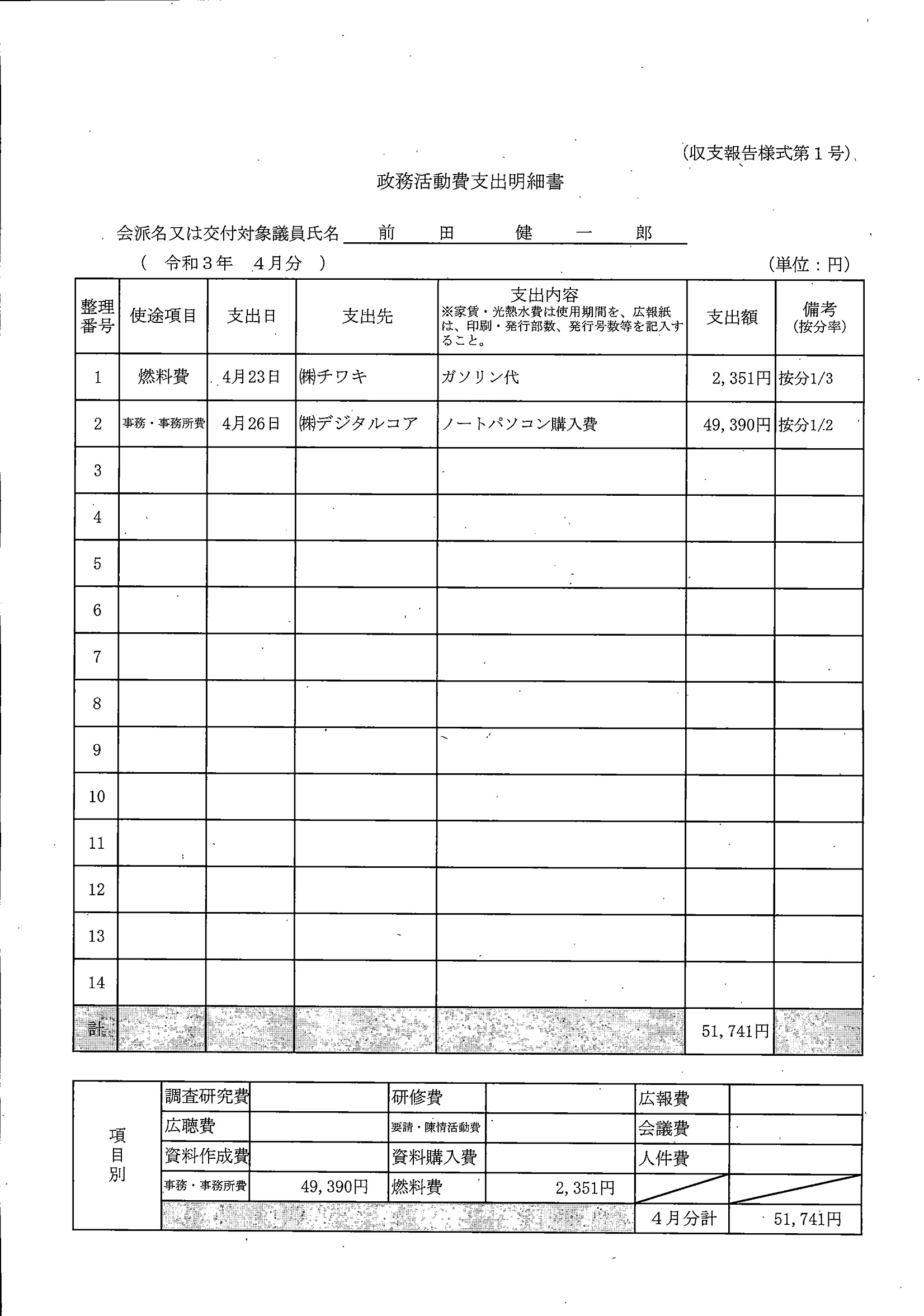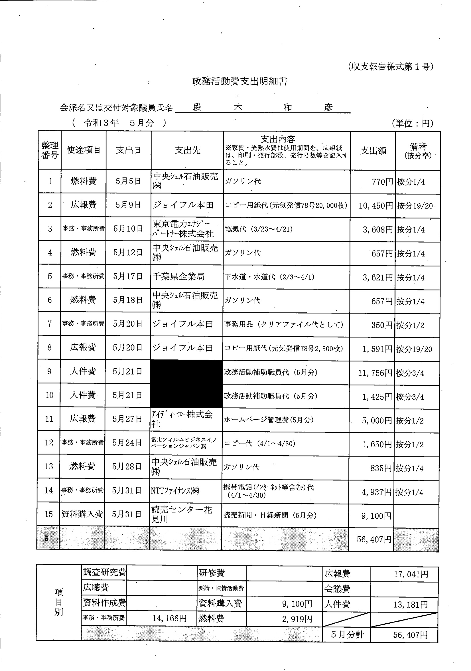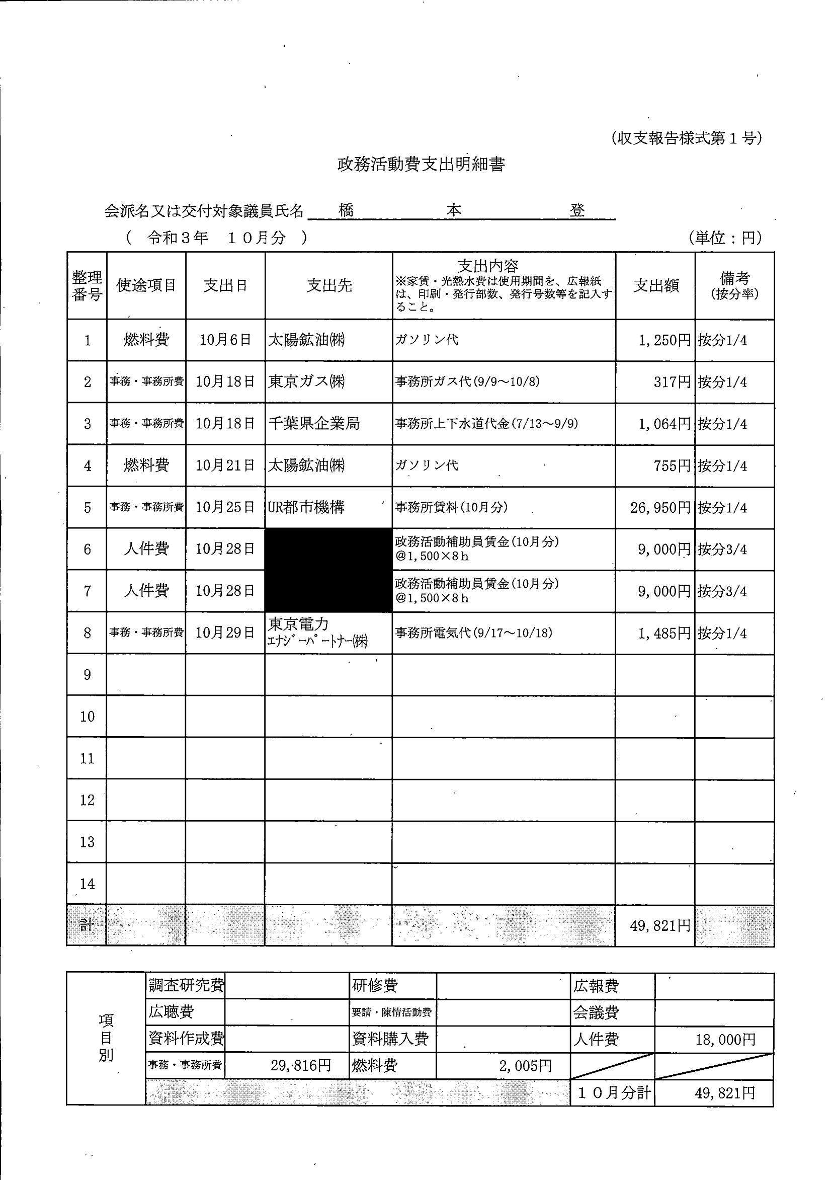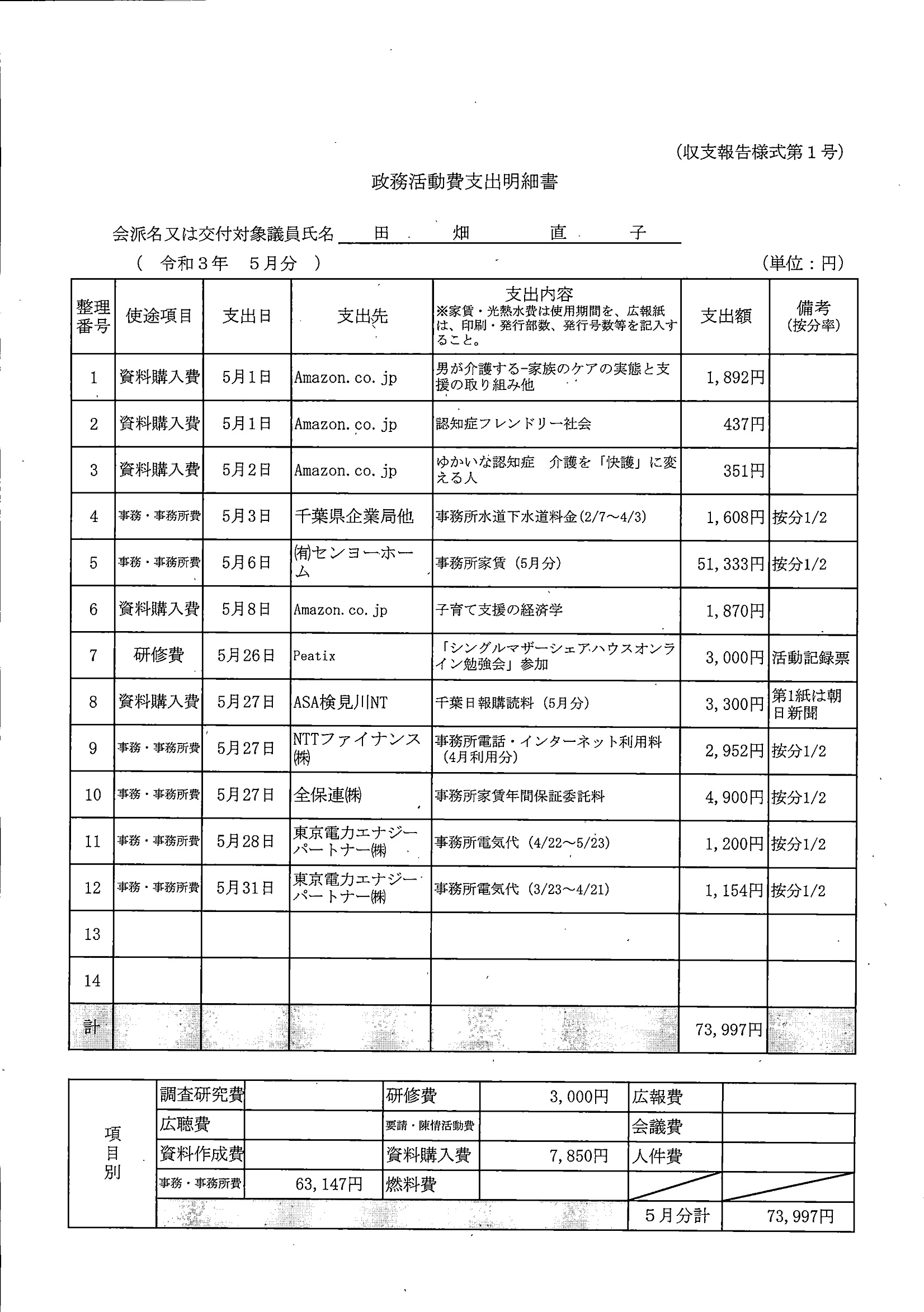 千葉市議会トップページ > 広報・情報公開 > 政務活動費 > 令和3年度交付分(政務活動費収支報告書)