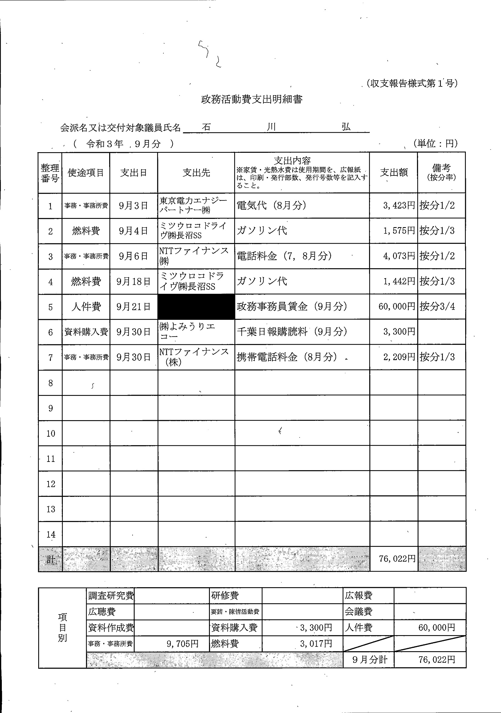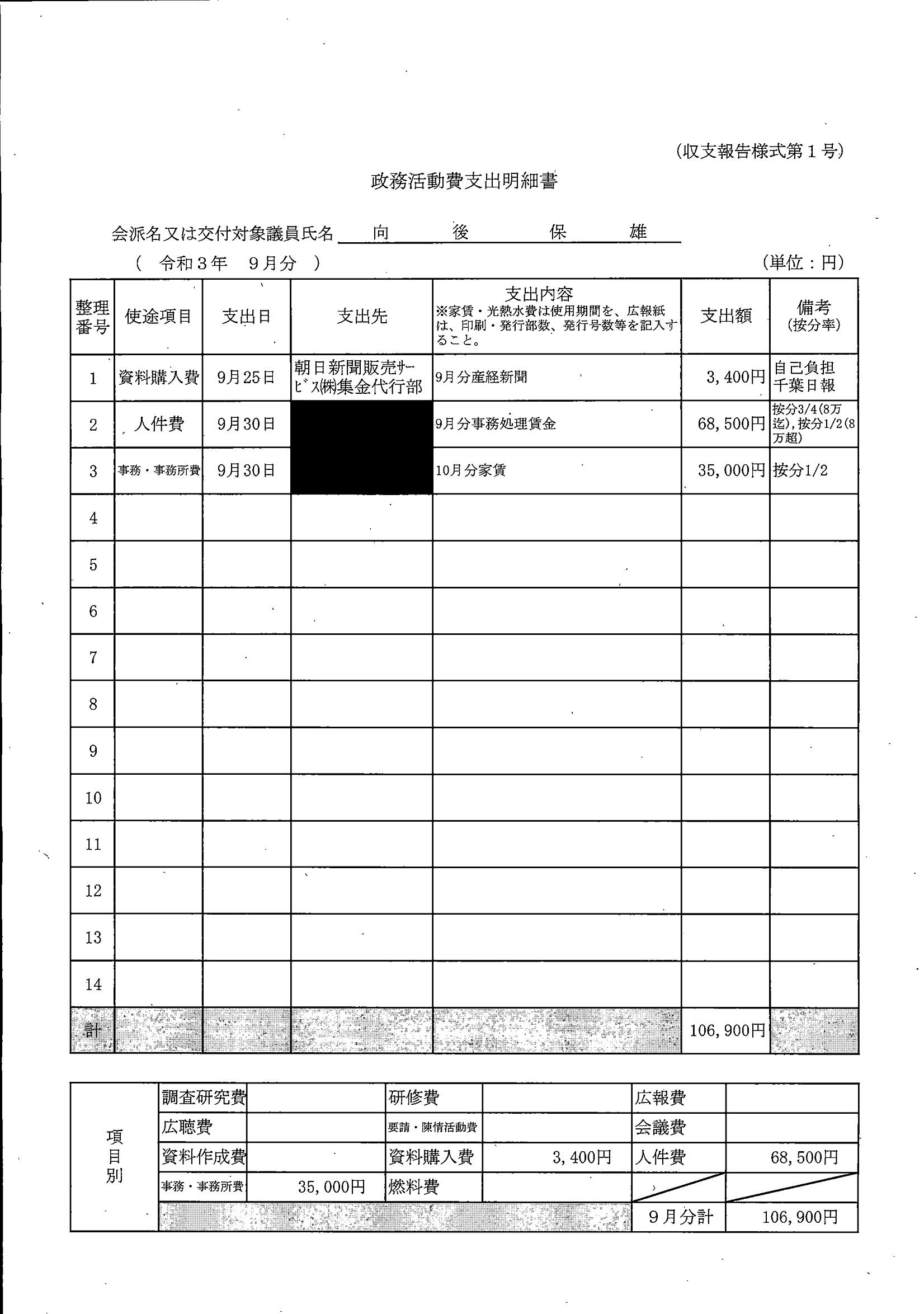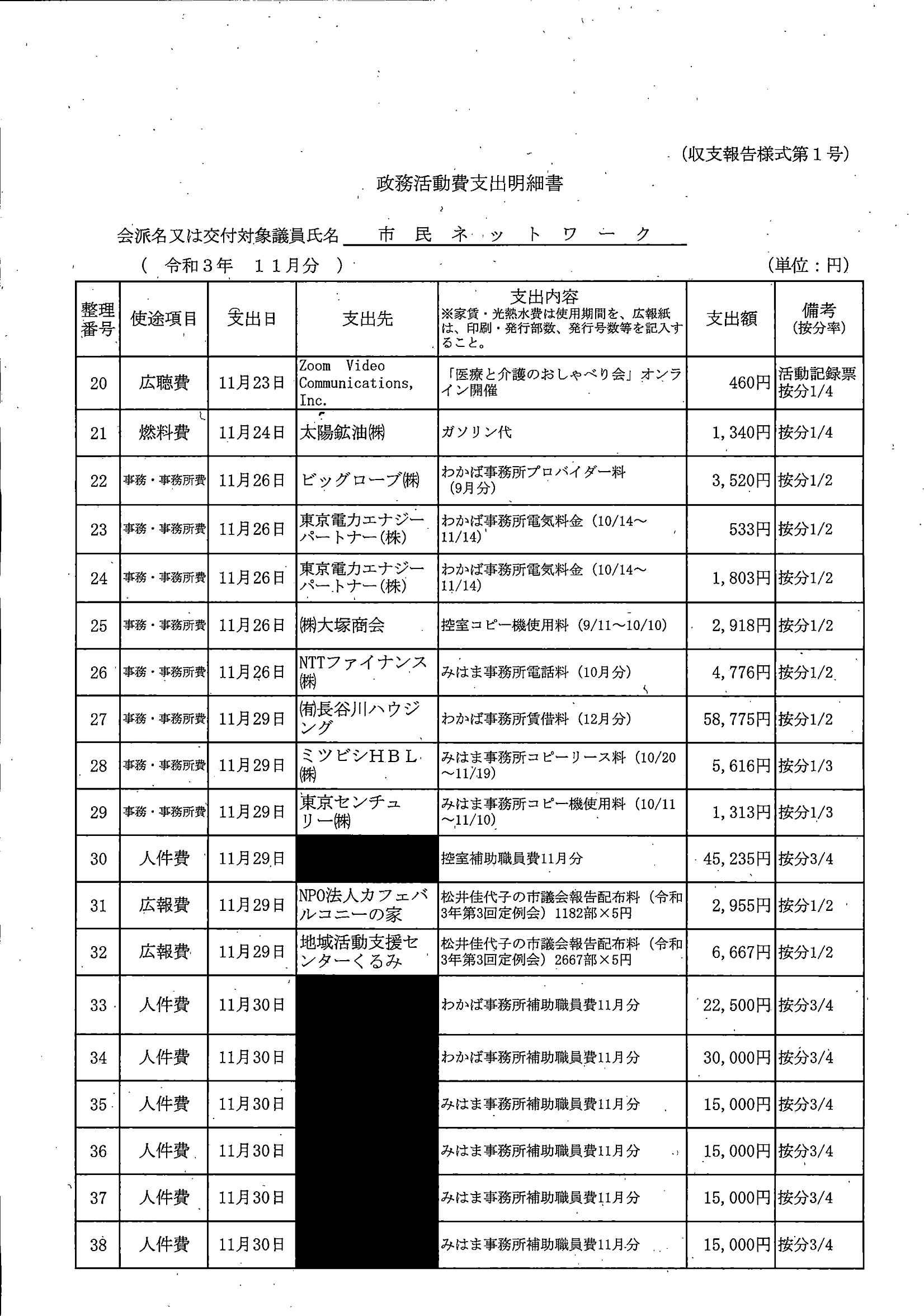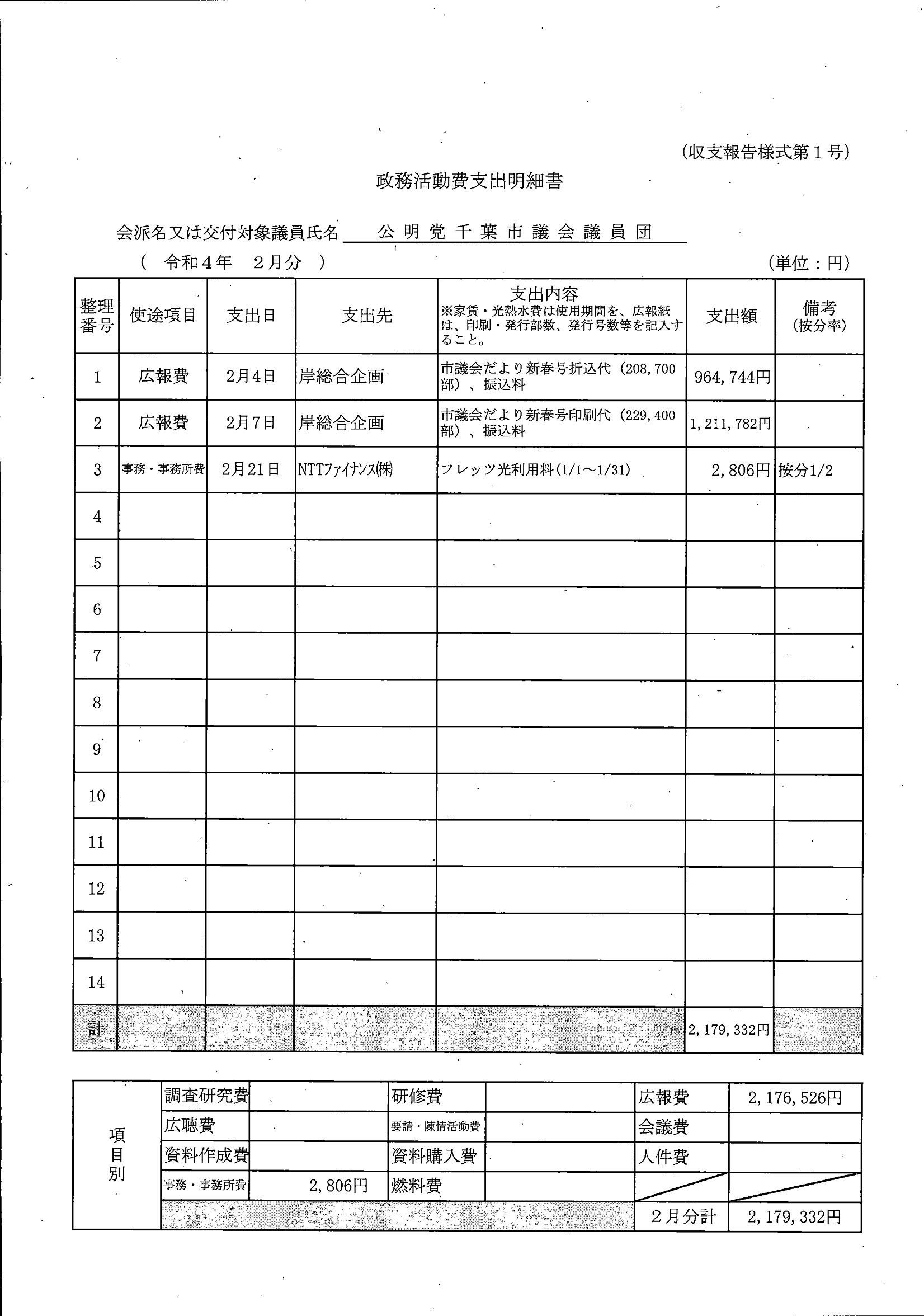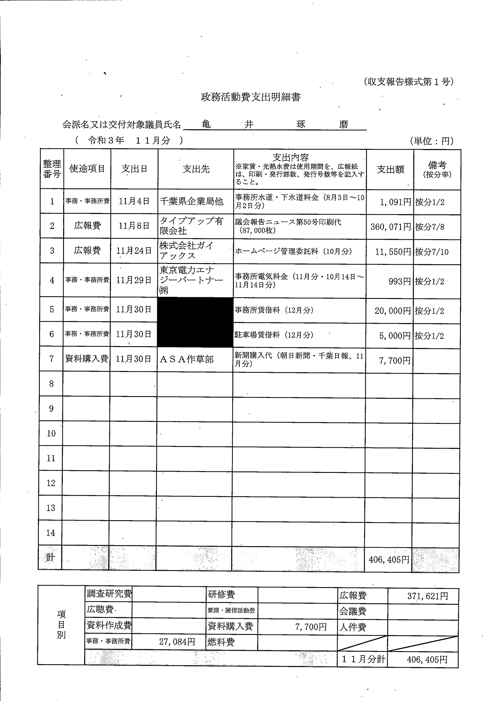 千葉市議会トップページ > 広報・情報公開 > 政務活動費 > 令和3年度交付分(政務活動費収支報告書)