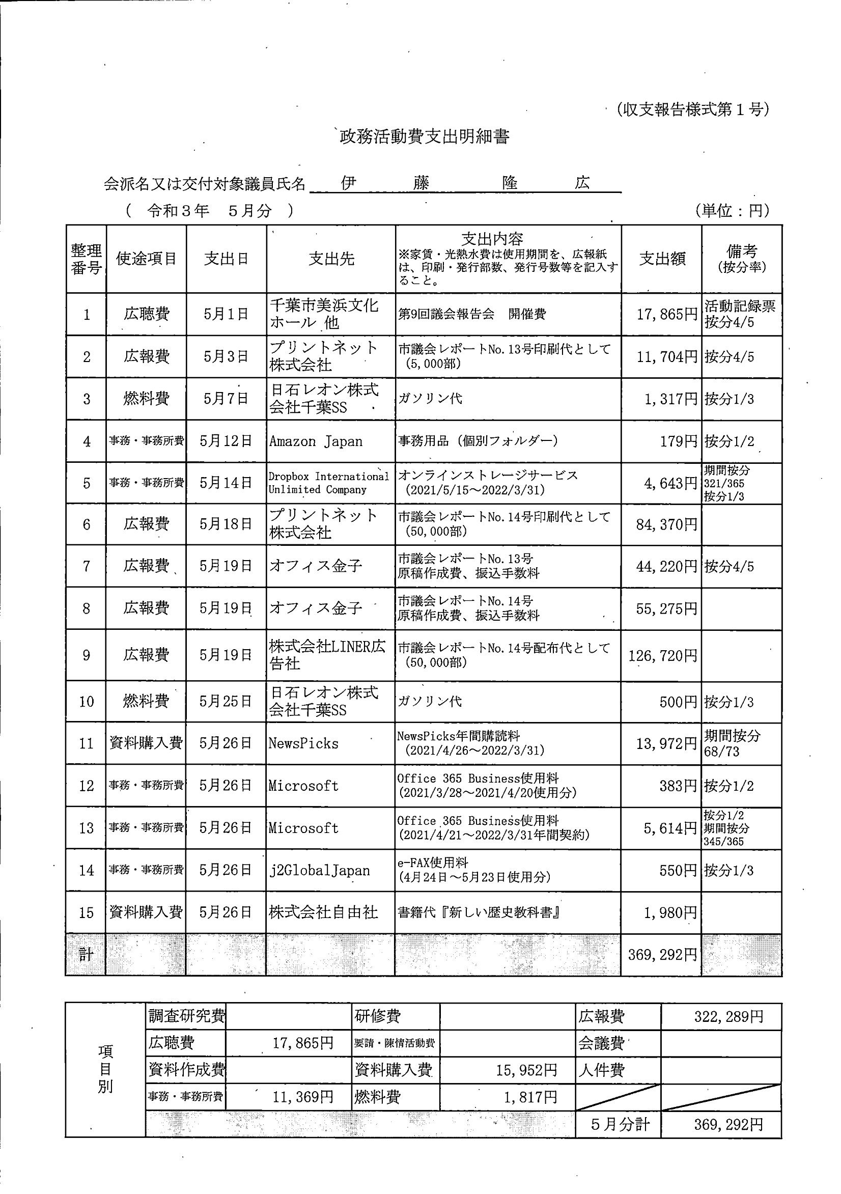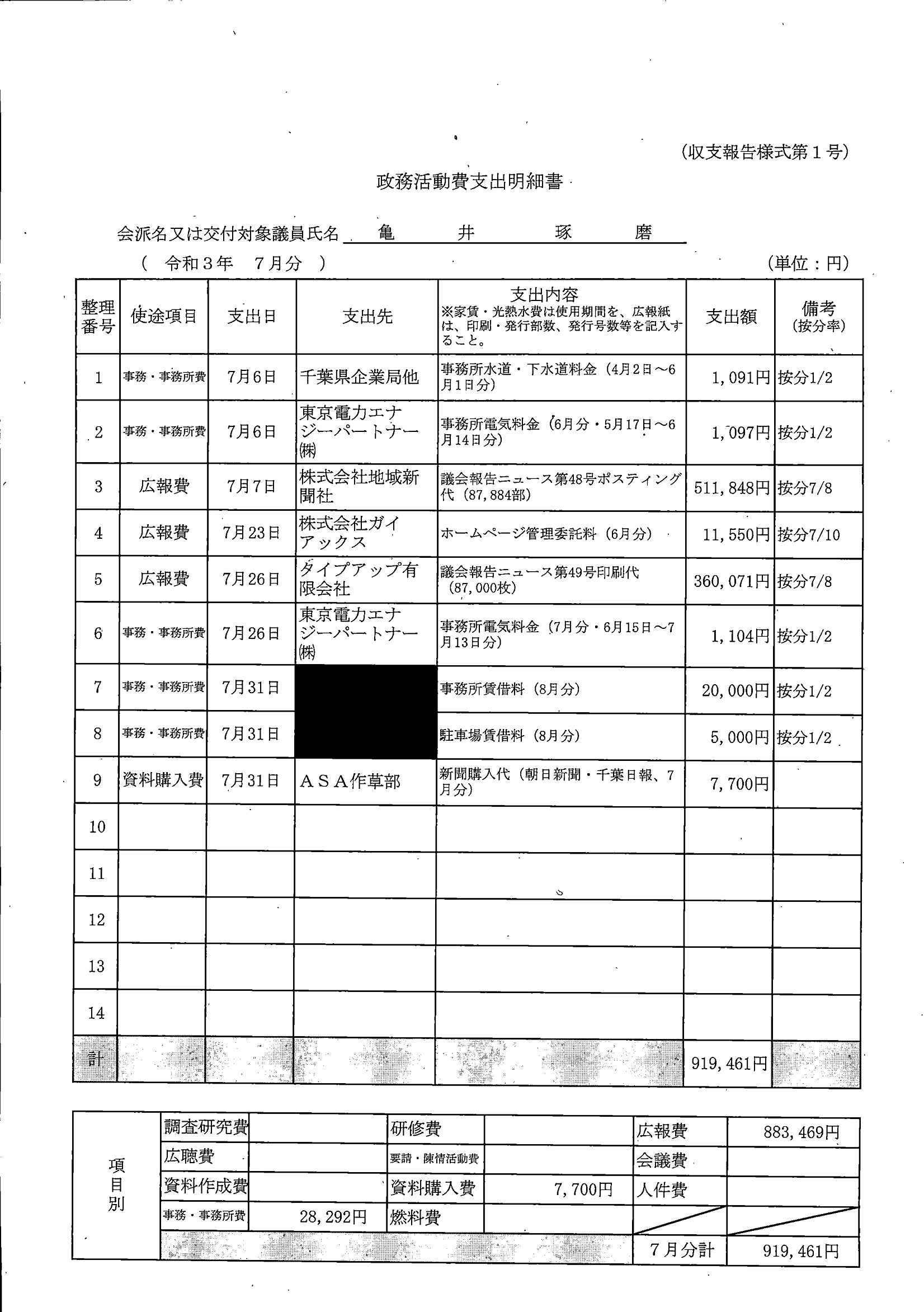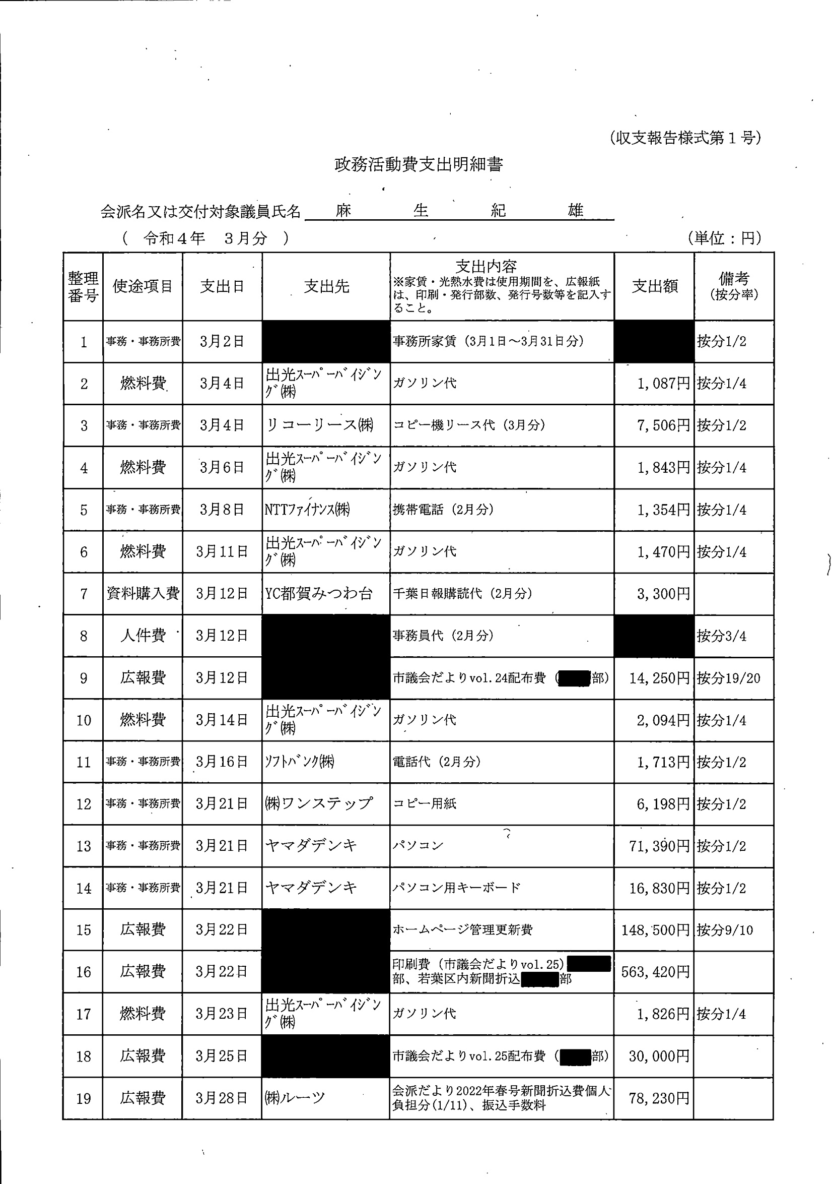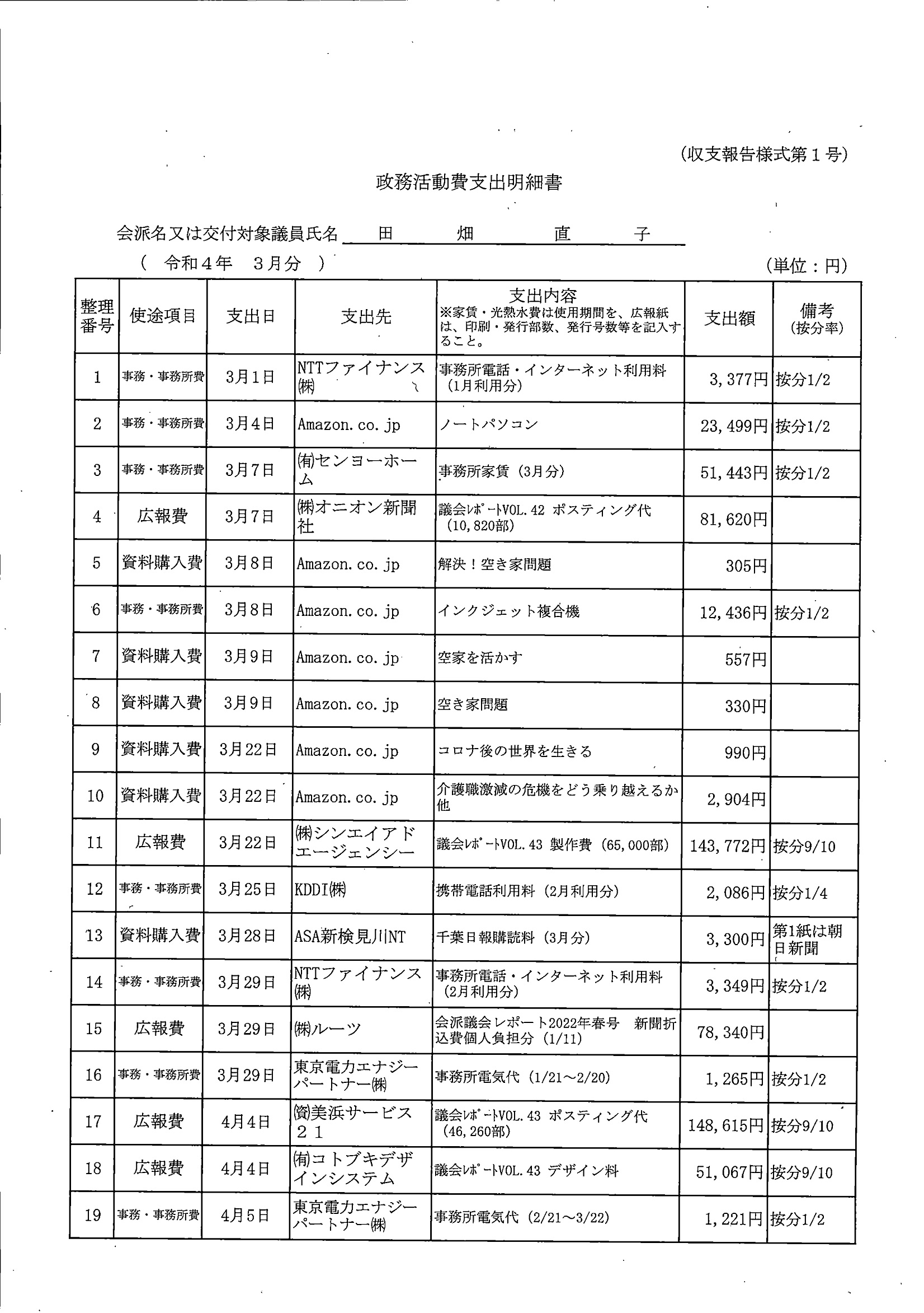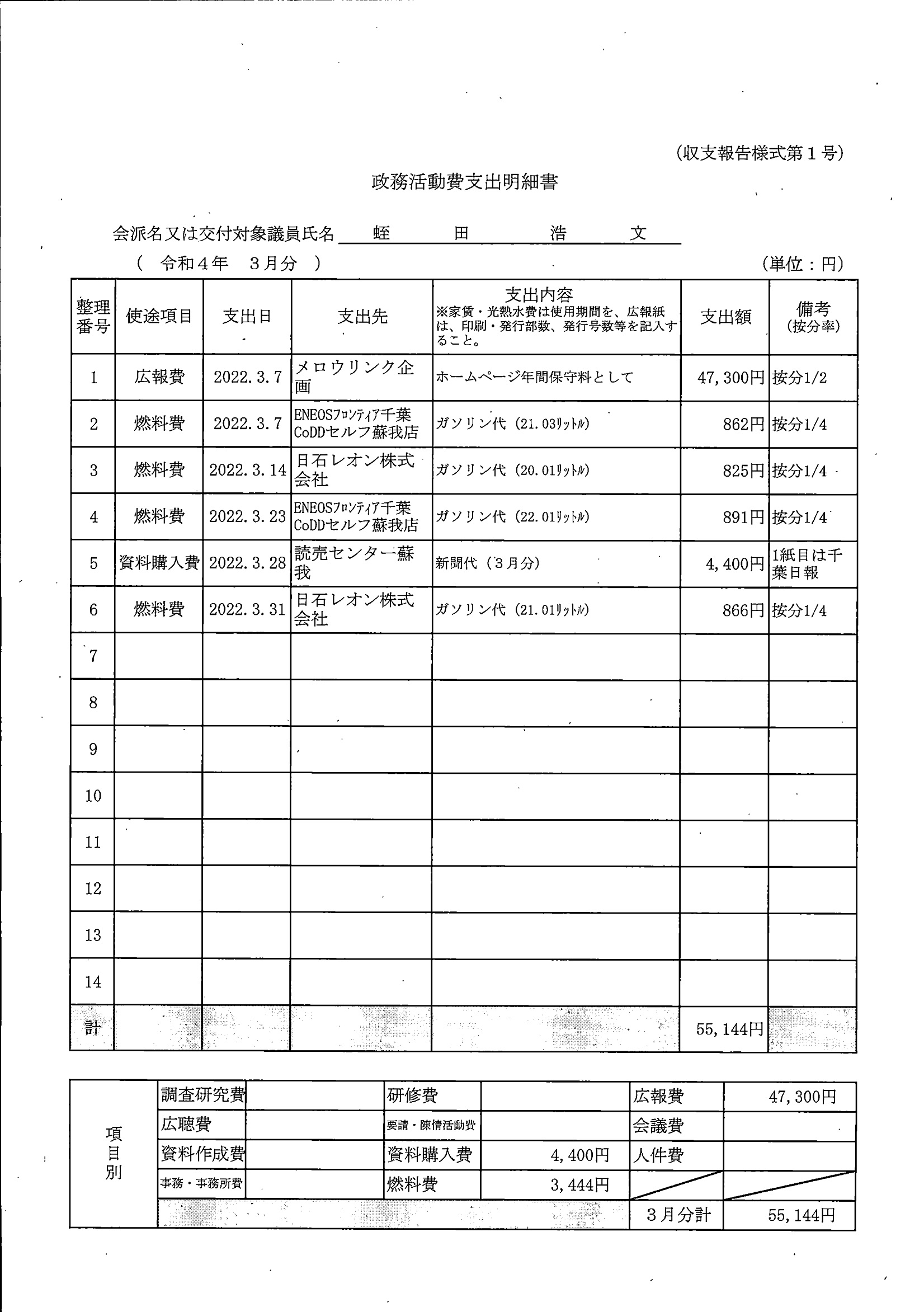 千葉市議会トップページ > 広報・情報公開 > 政務活動費 > 令和3年度交付分(政務活動費収支報告書)