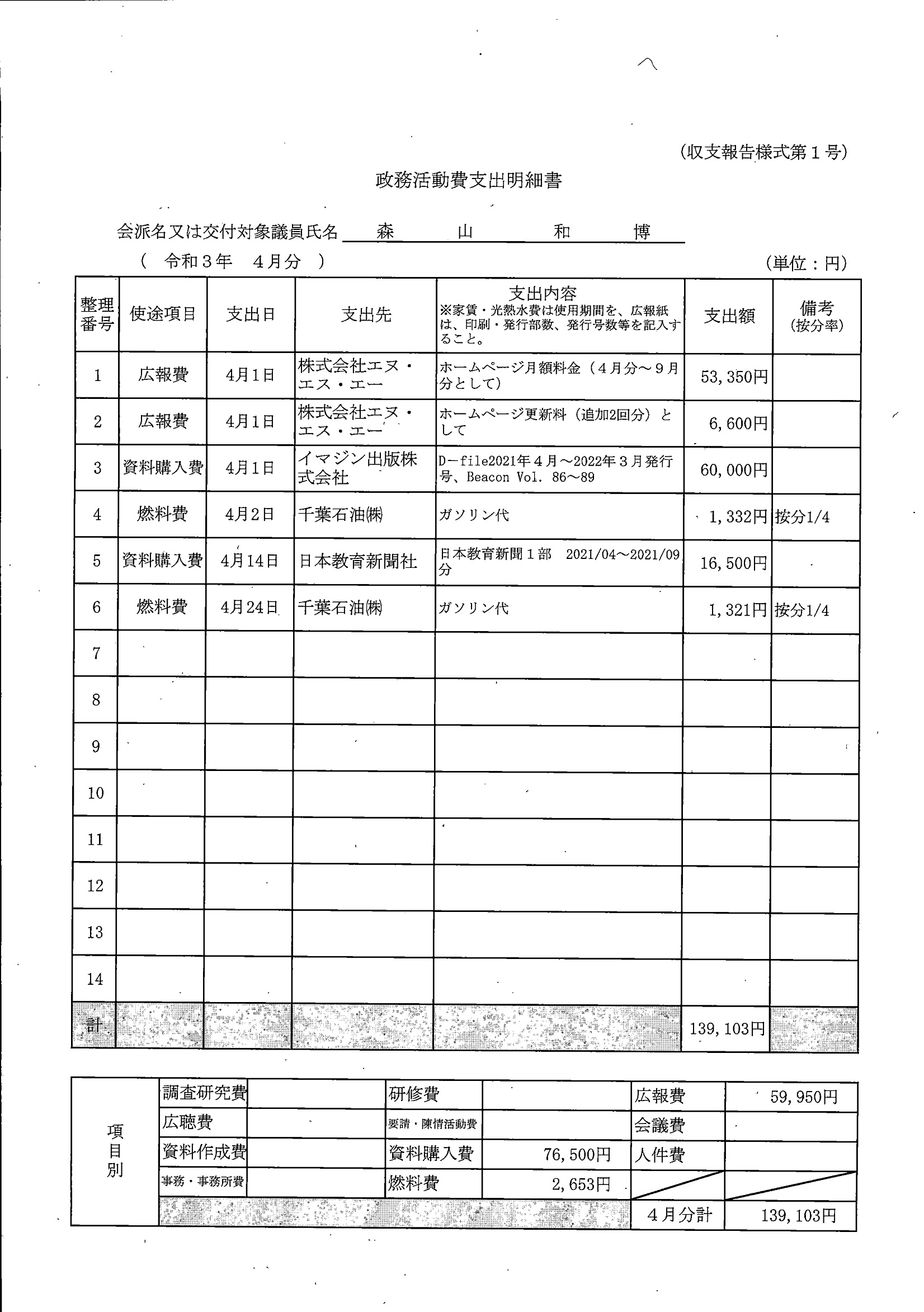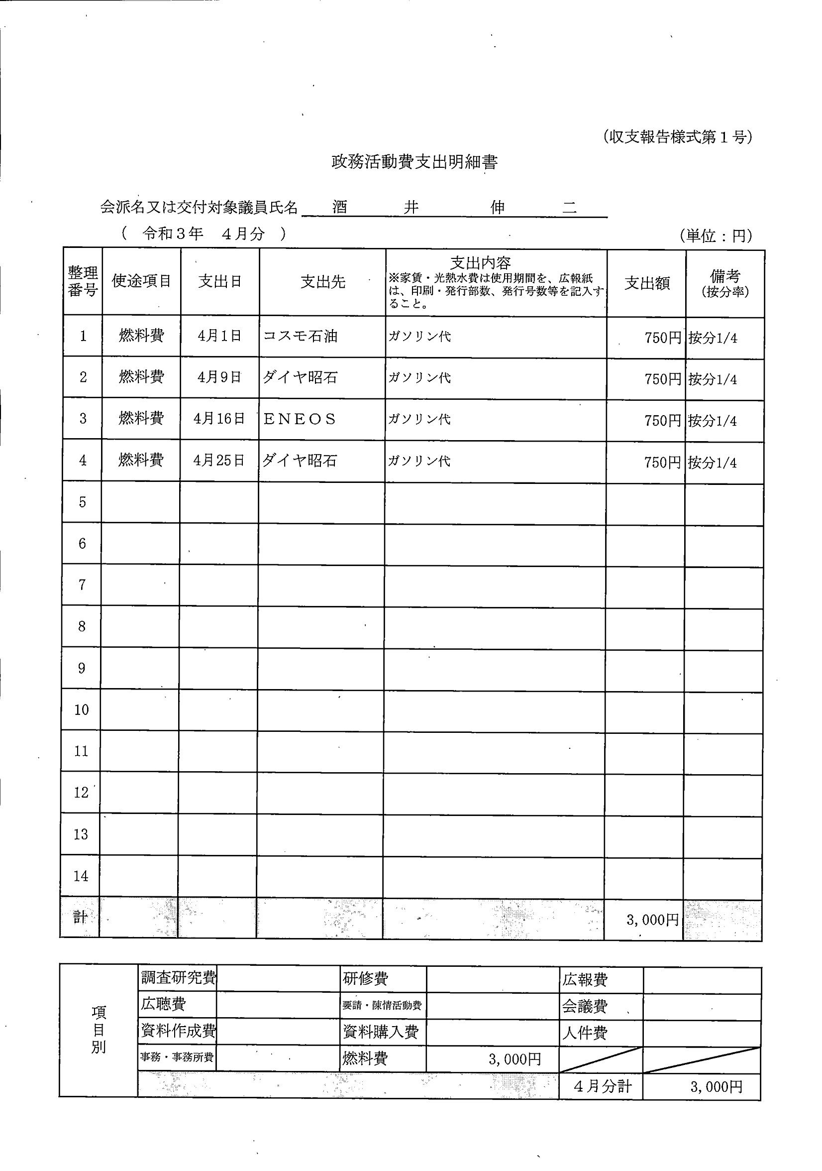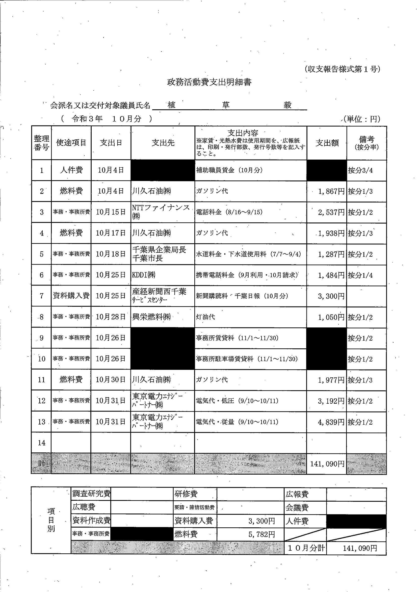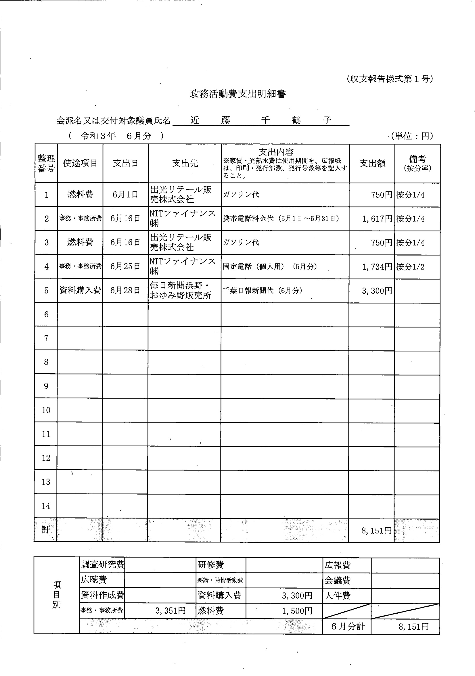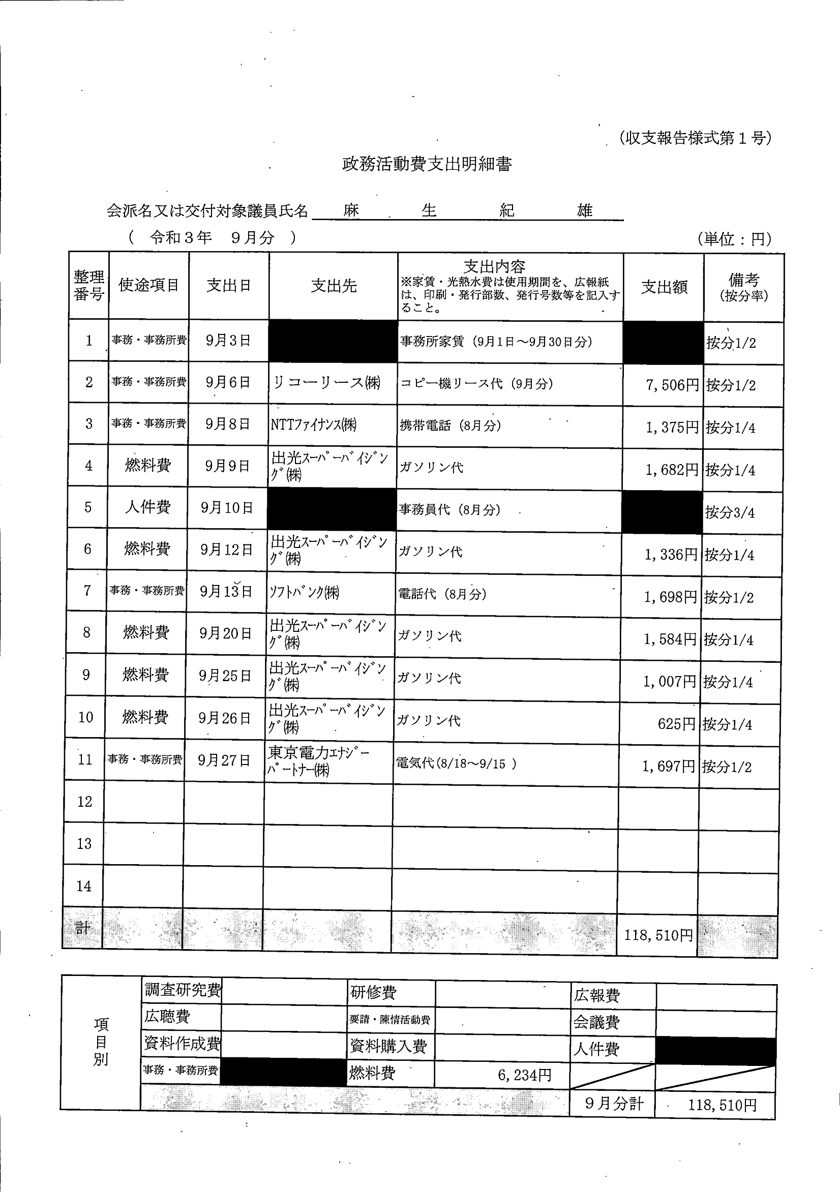 千葉市議会トップページ > 広報・情報公開 > 政務活動費 > 令和3年度交付分(政務活動費収支報告書)